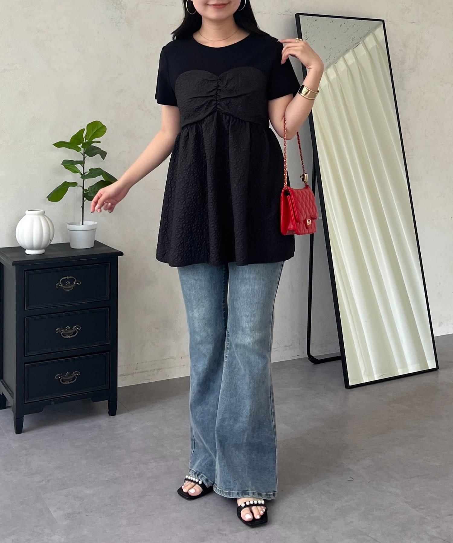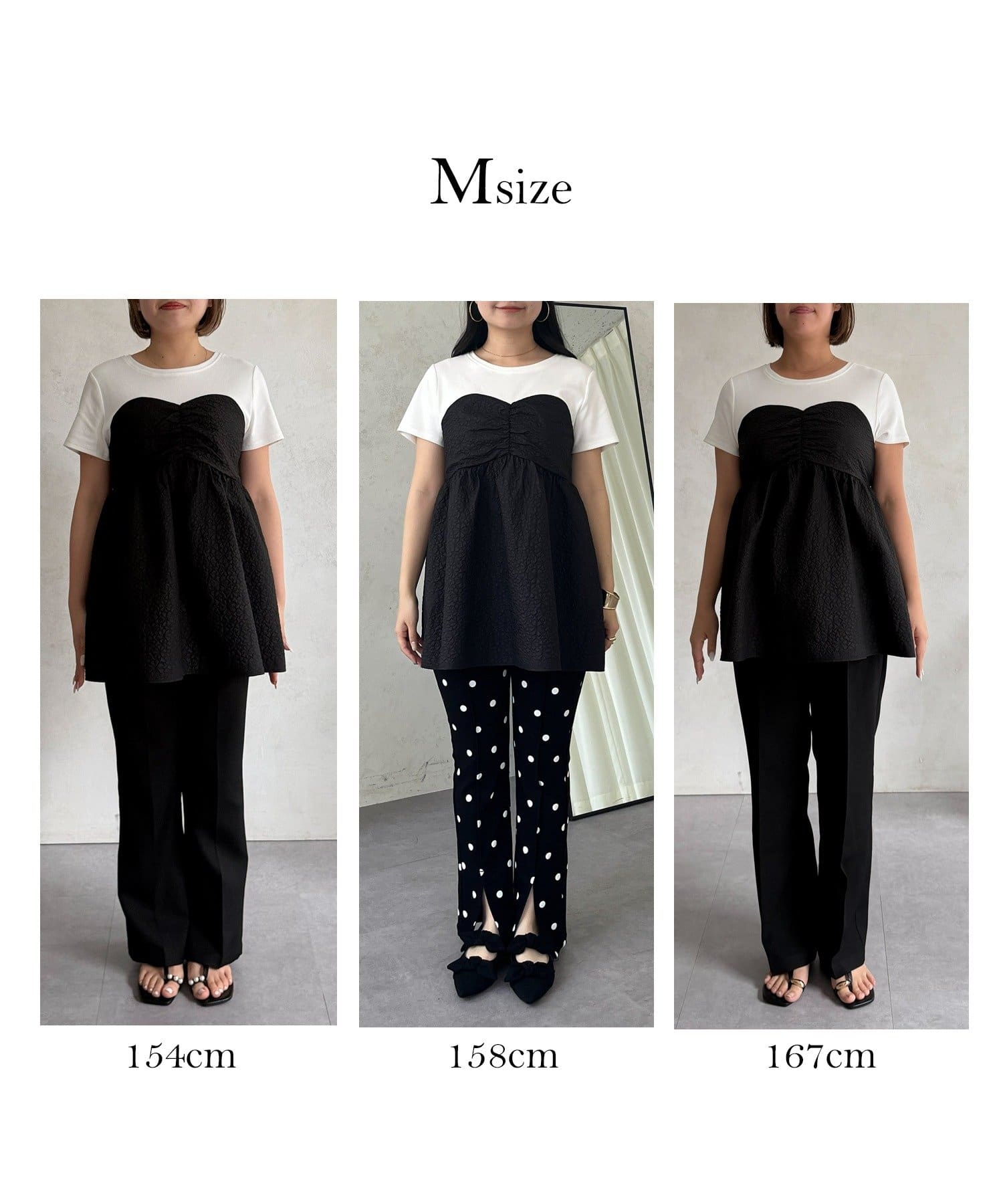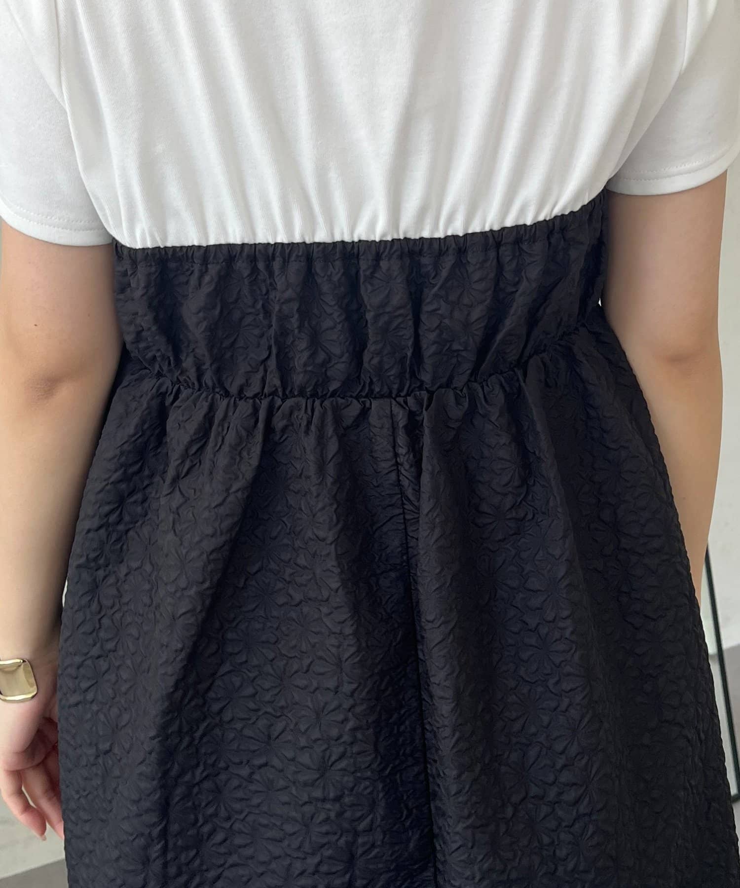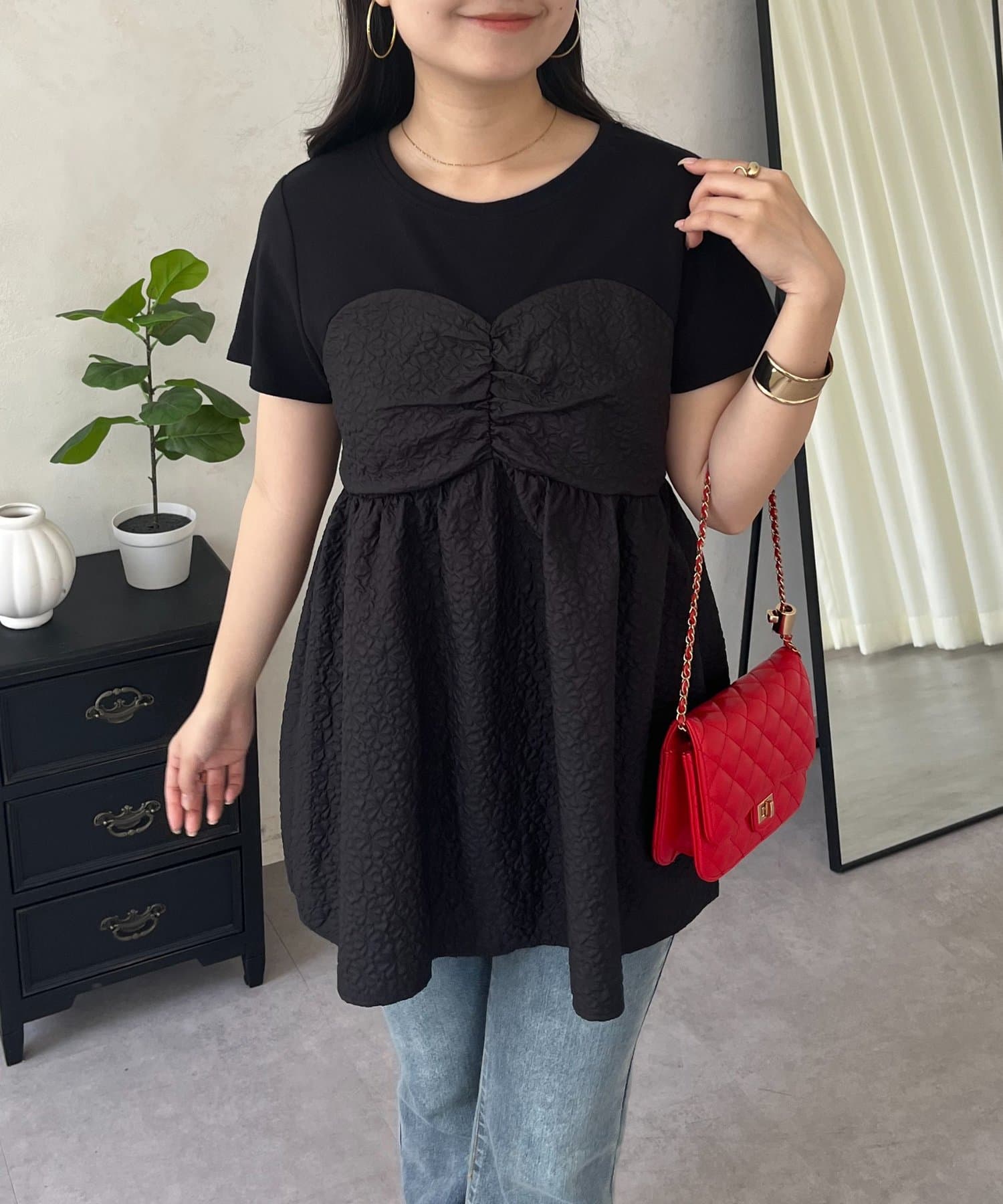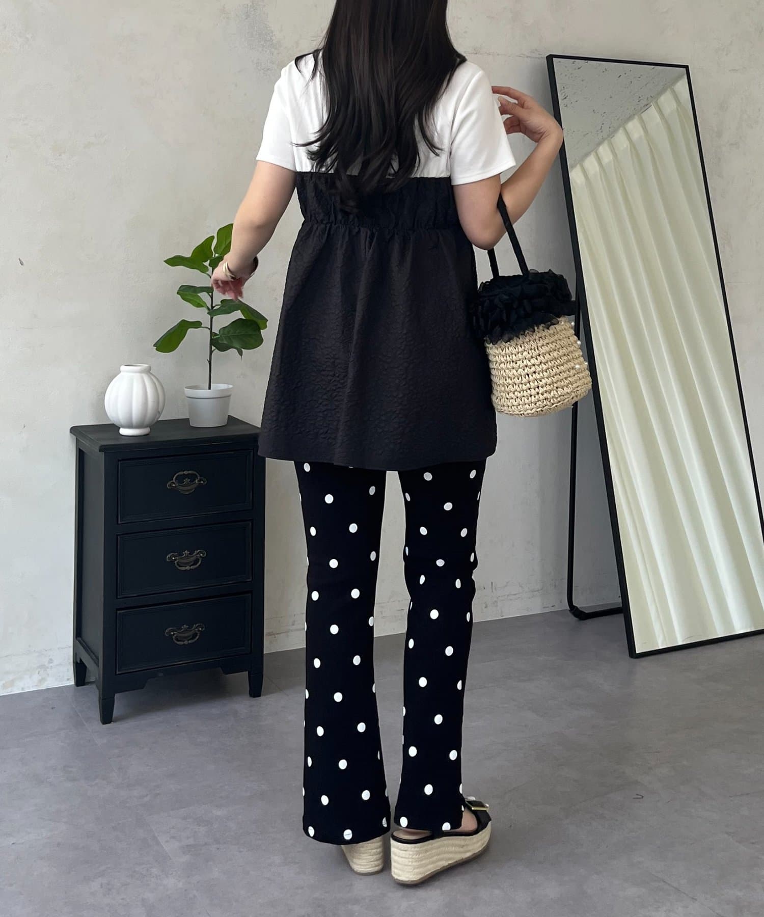 ●Tシャツに立体感のあるジャガードビスチェを重ねたようなドッキングデザインで、コーデに悩まずお洒落が完成