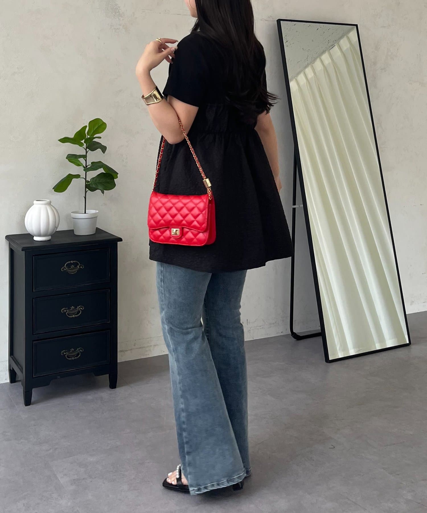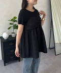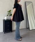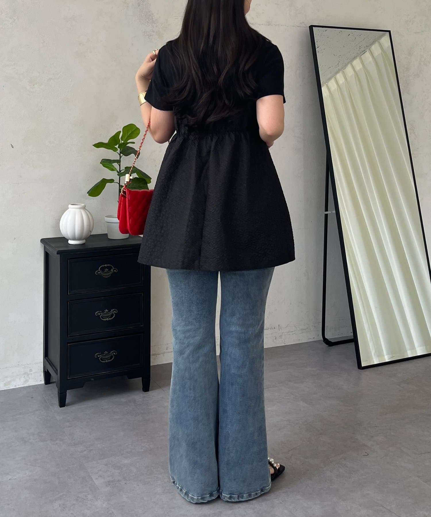 ●ウエストの高い位置からふんわり広がるペプラムシルエットが、気になる腰回りやお腹周りをさりげなくカバー
