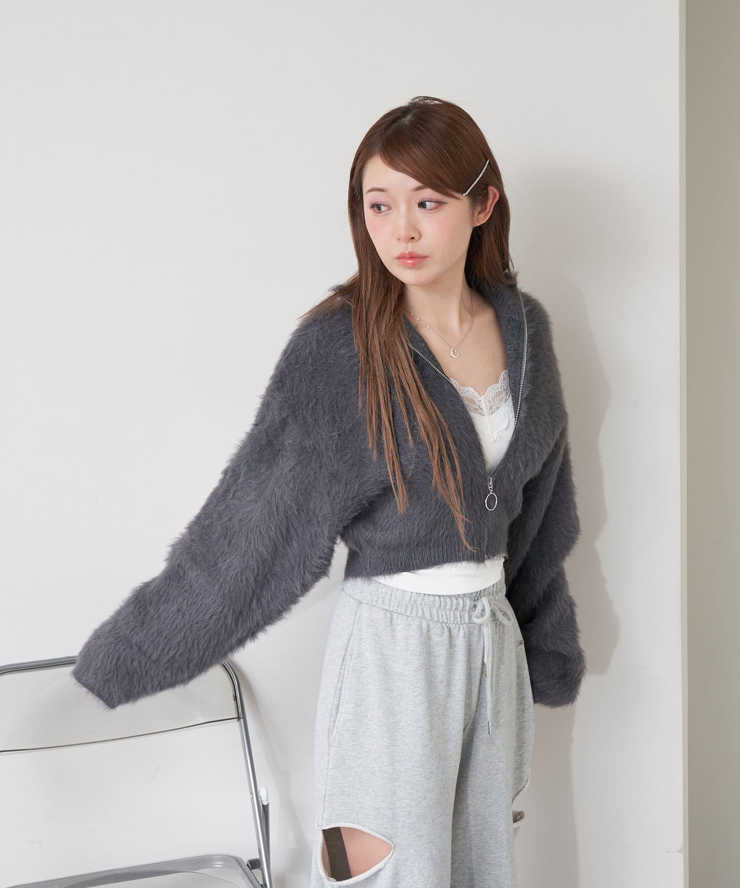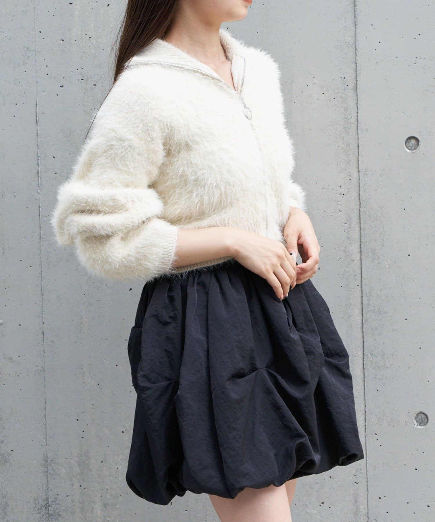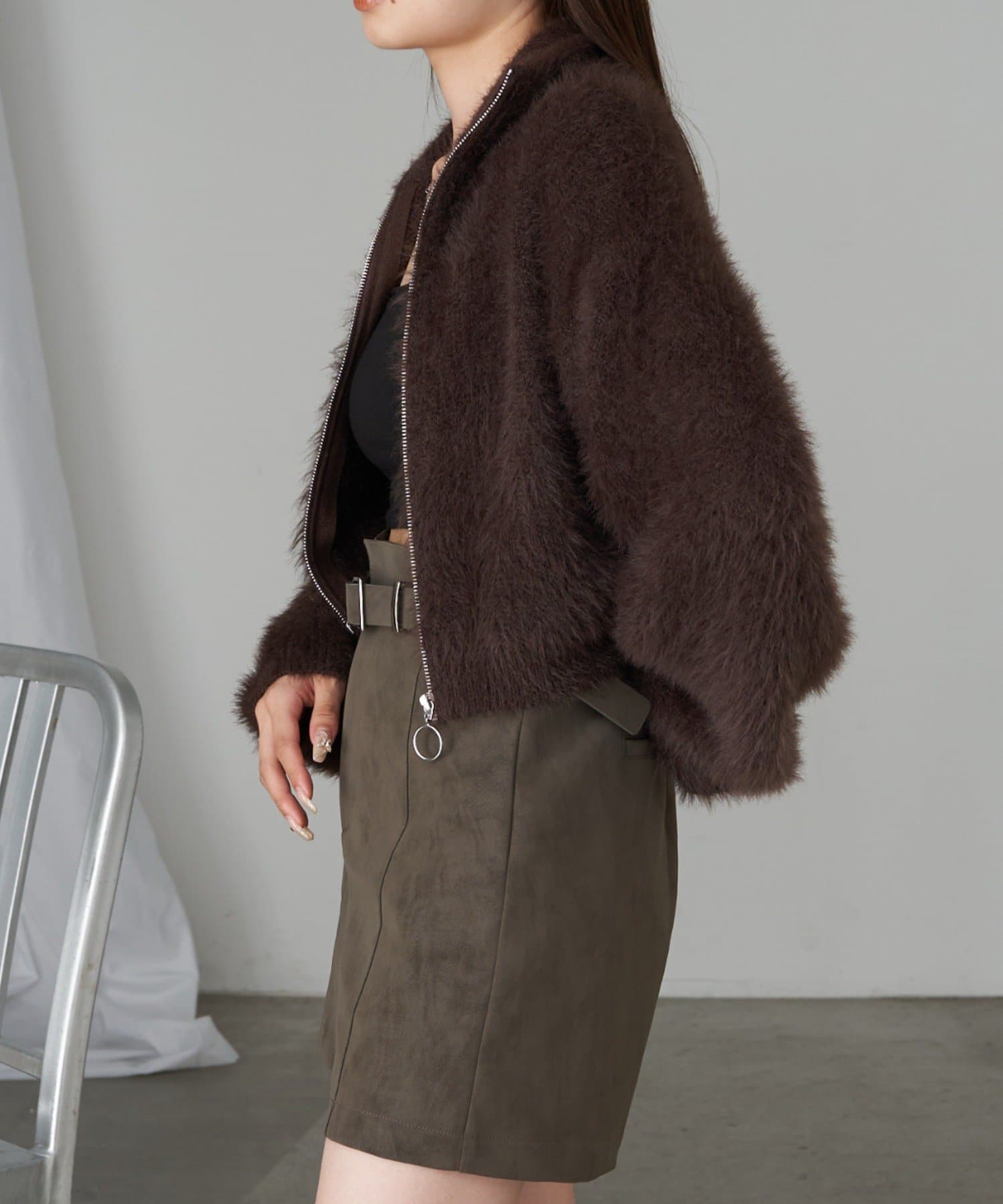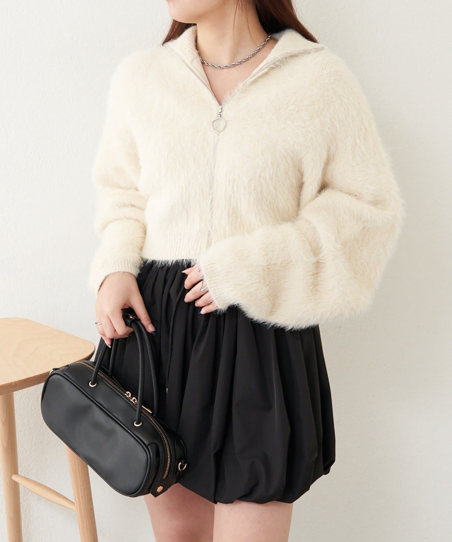 ・ジップデザインがカジュアル感を残しつつもシャギー素材が甘さをプラス