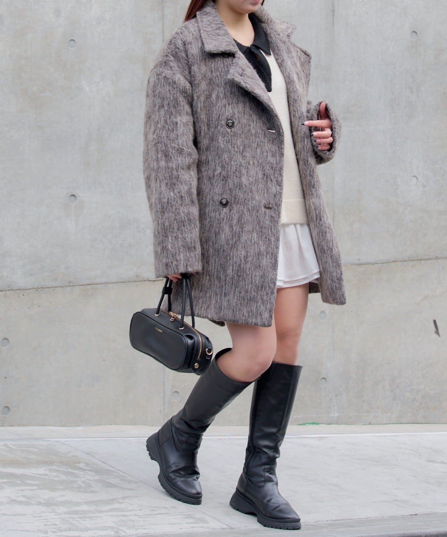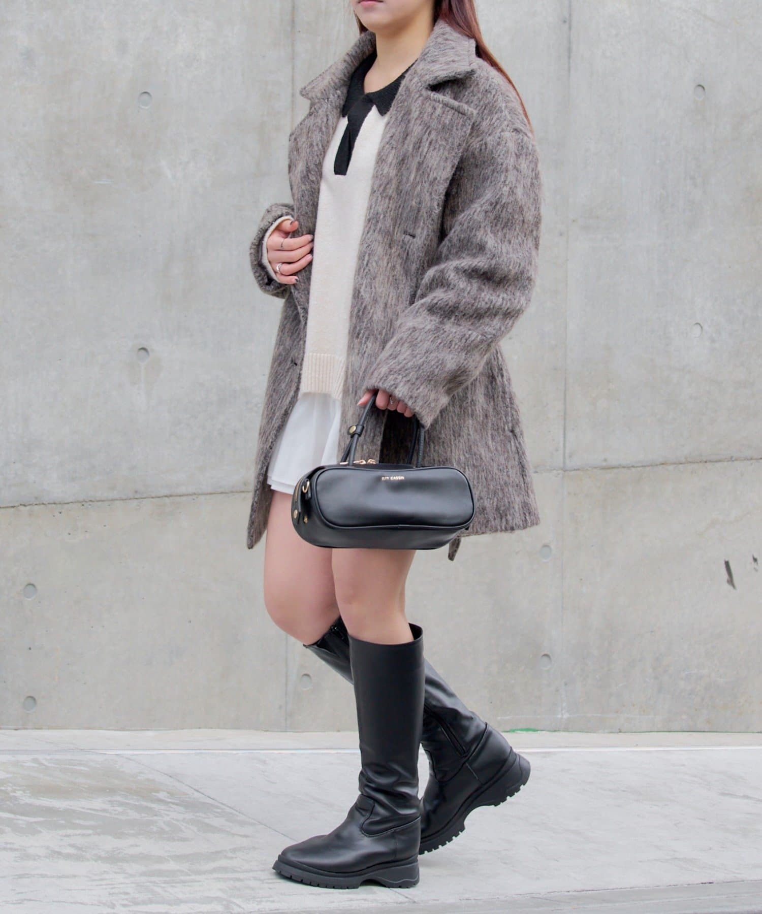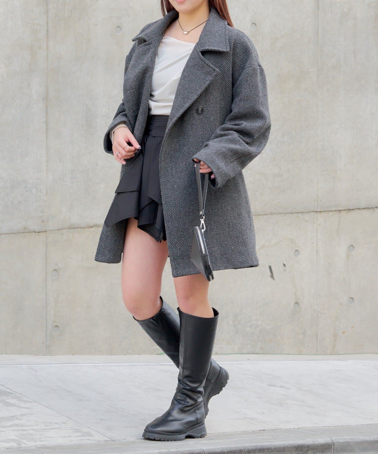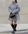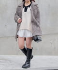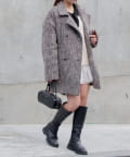 ・ミニ丈ボトムス×ロングブーツは王道トレントライクなスタイルに。