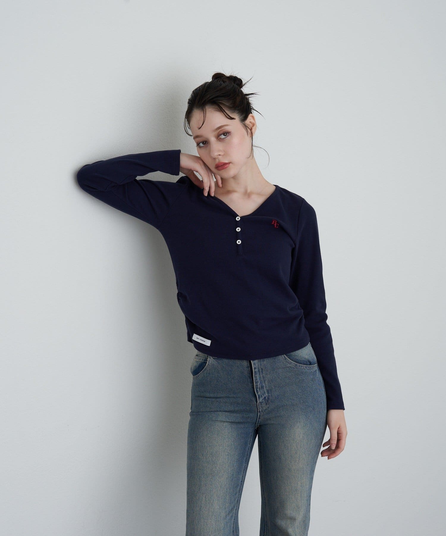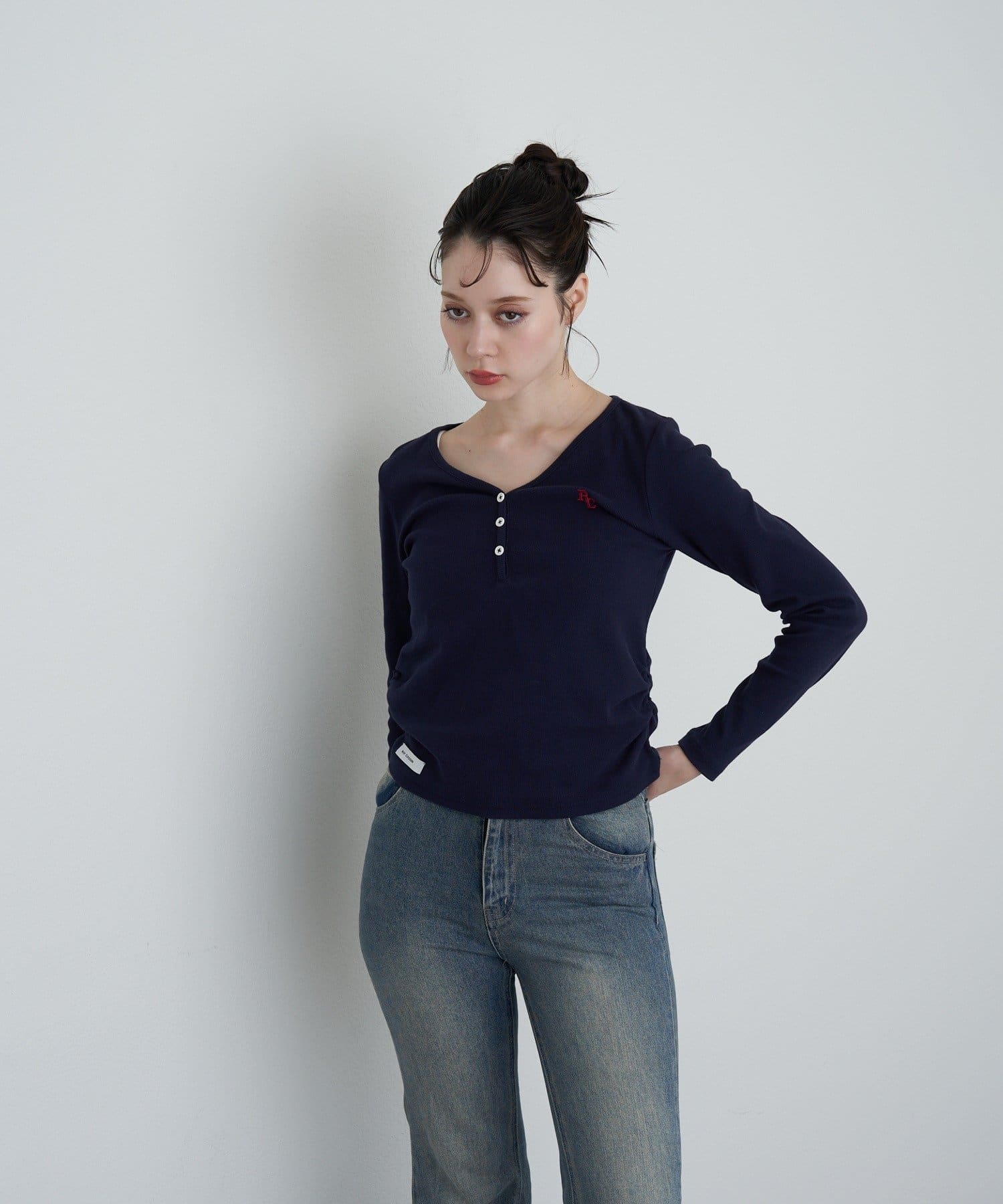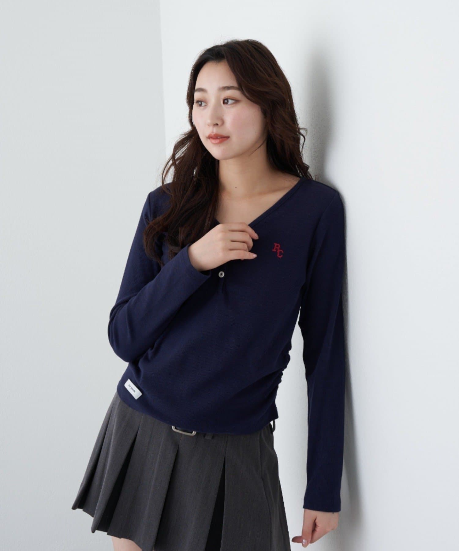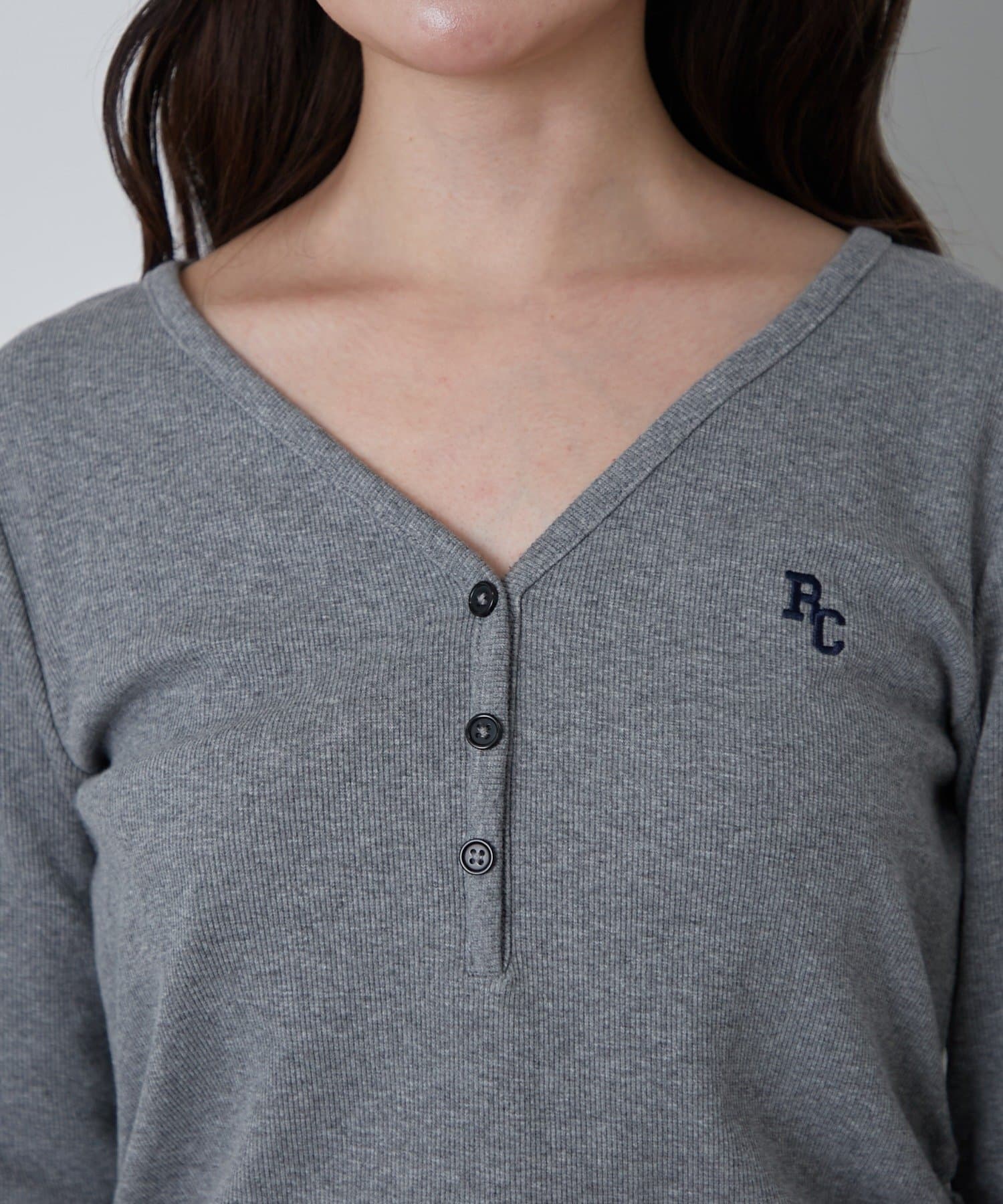 【華奢見えが叶う/追加生産決定】Vネックヘンリー胸刺繍ロングTシャツ