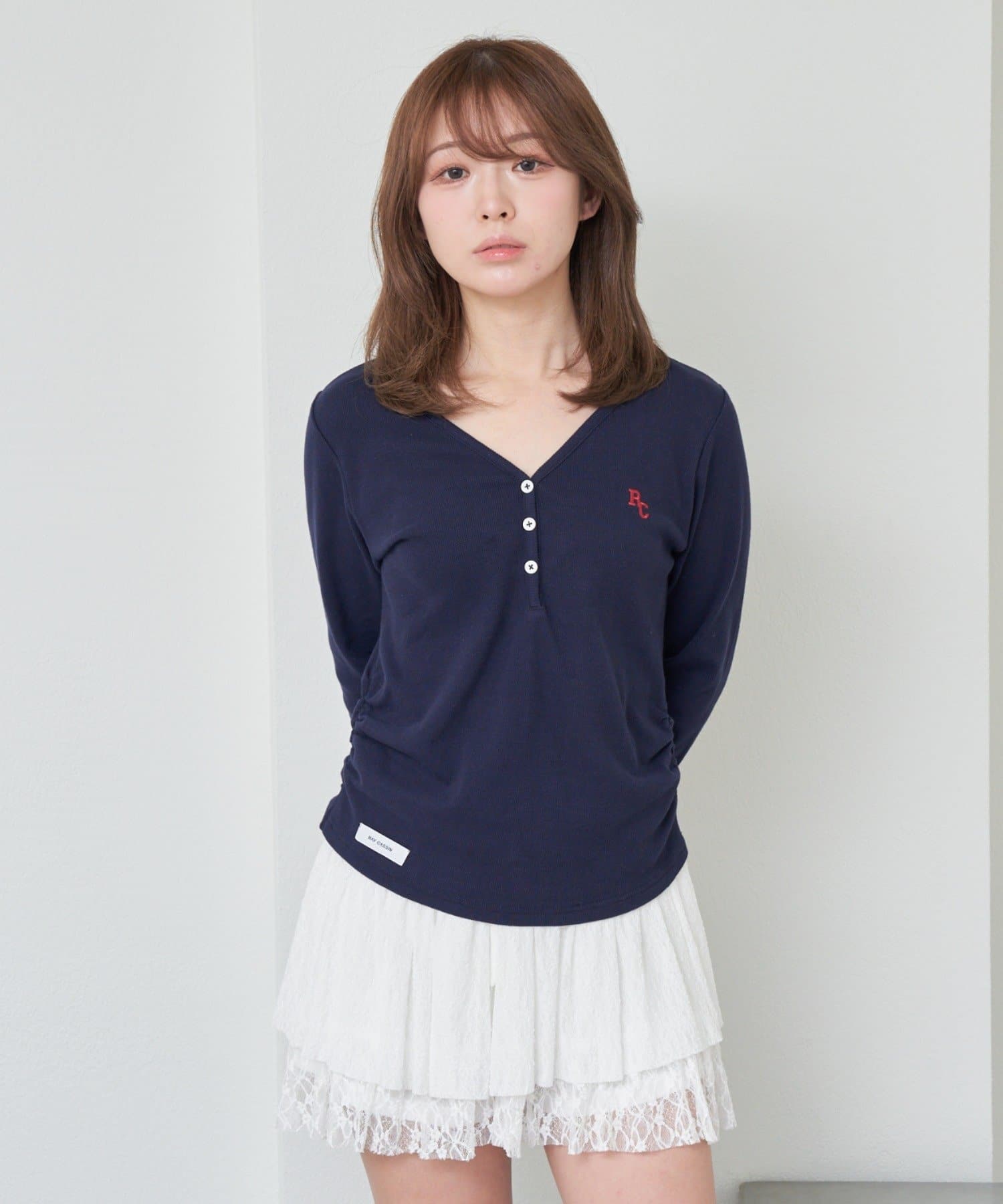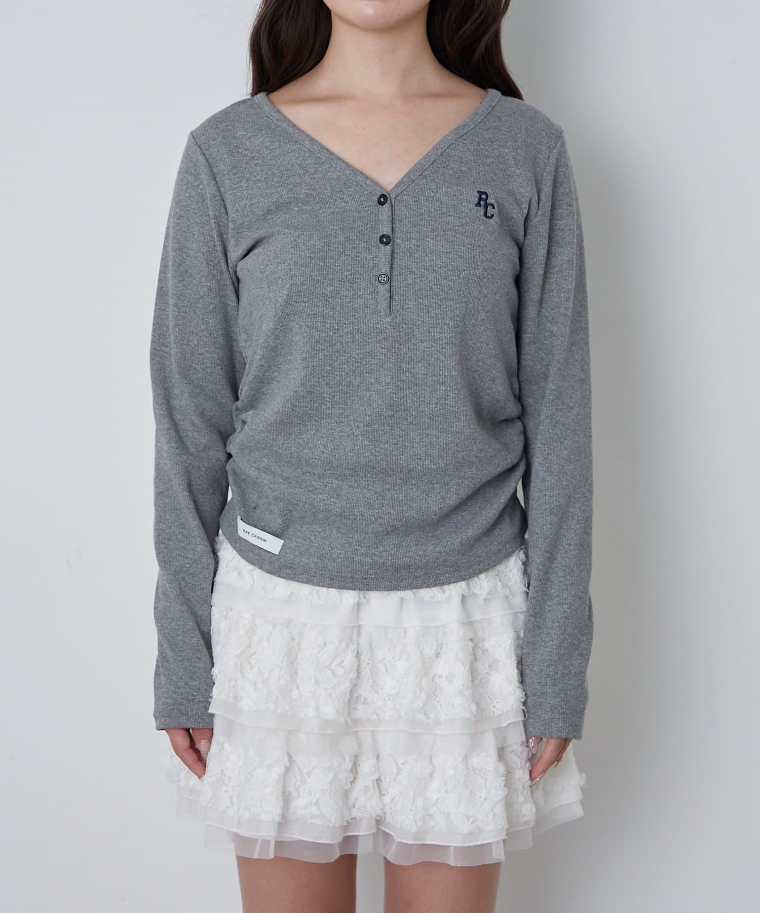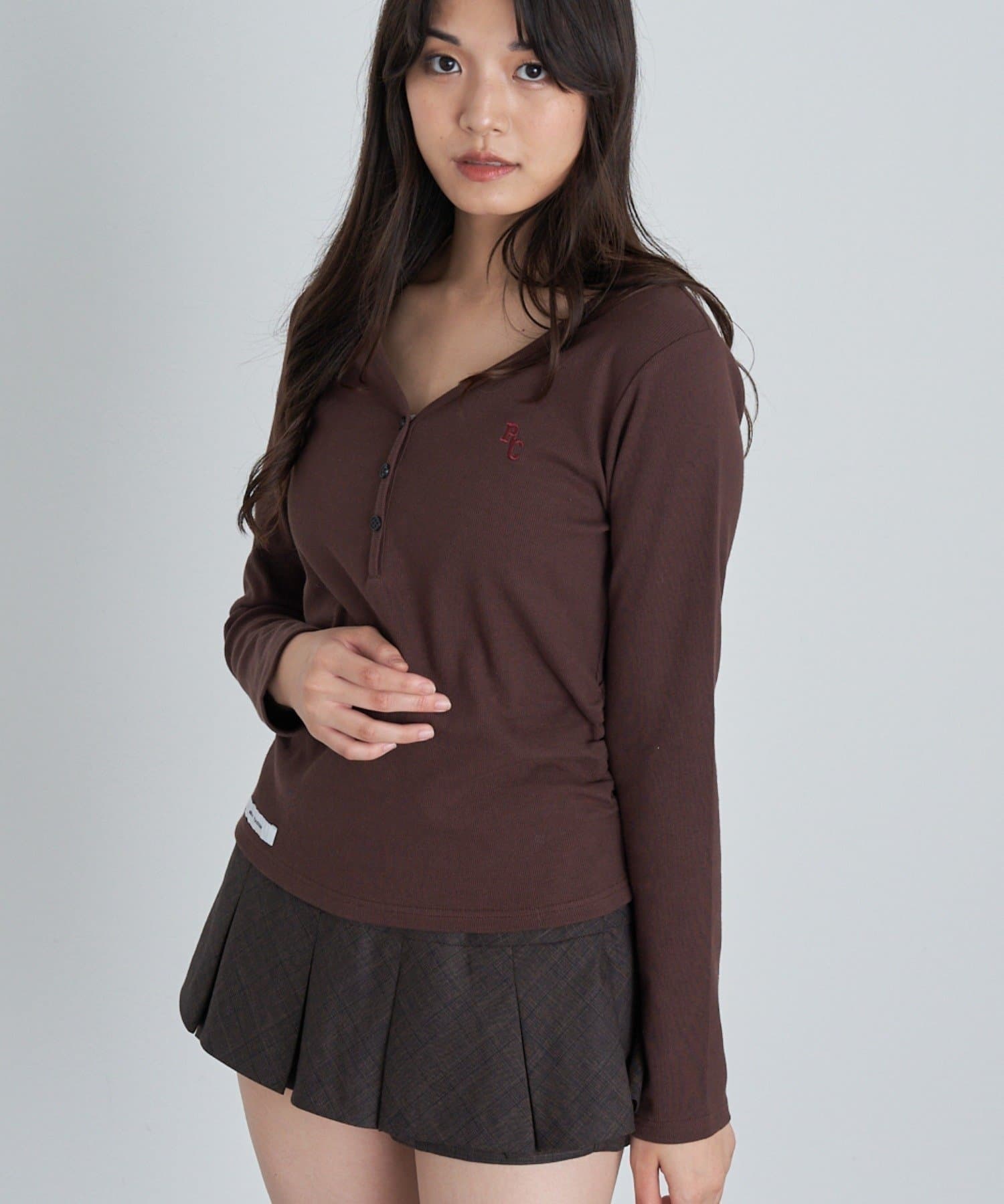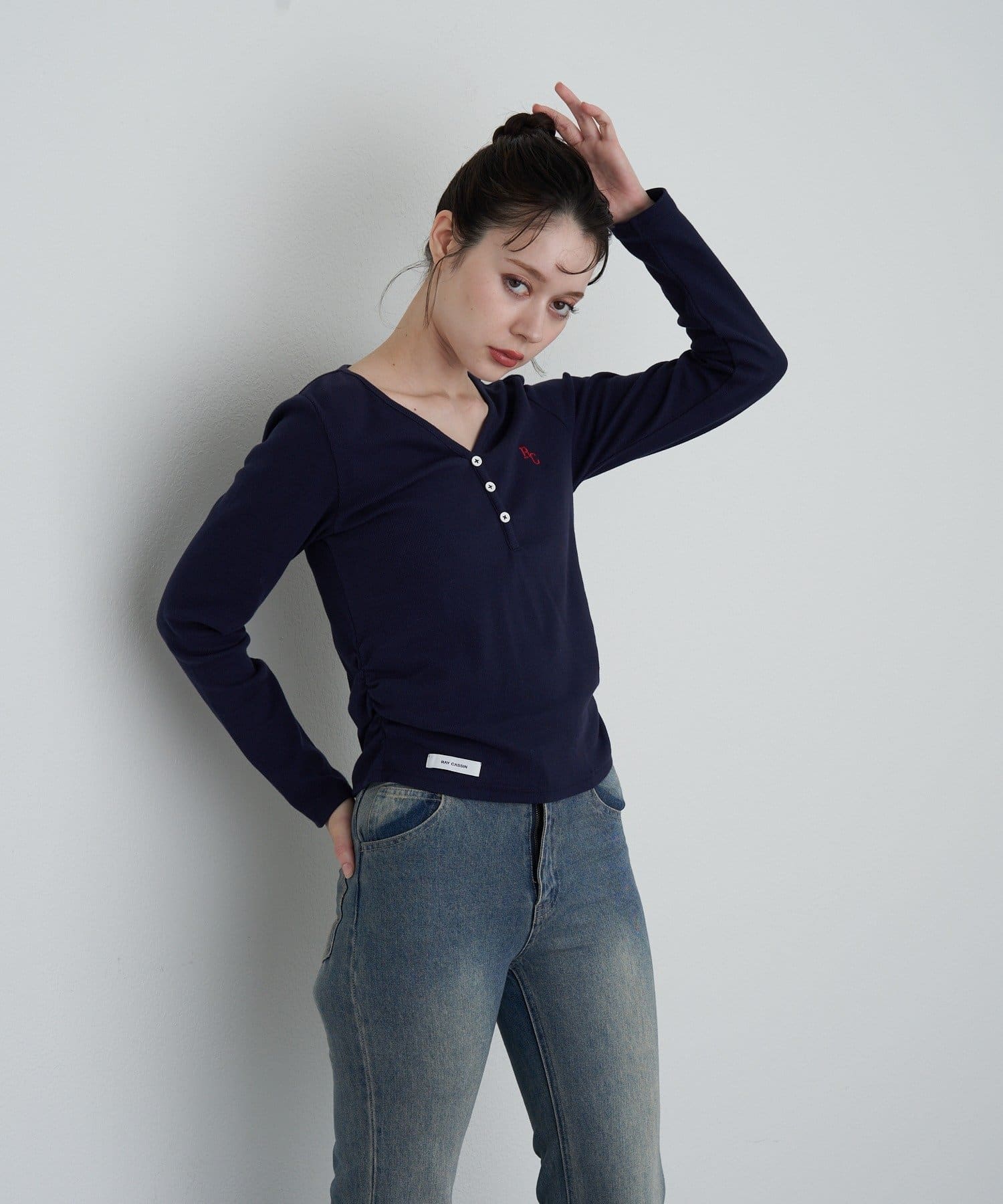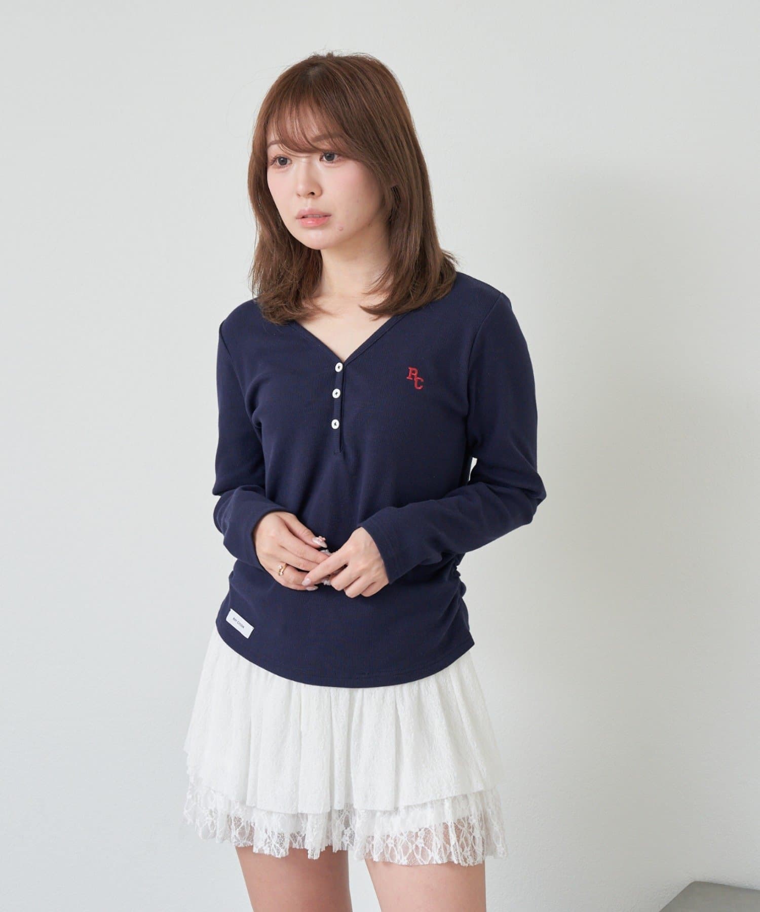 【華奢見えが叶う/追加生産決定】Vネックヘンリー胸刺繍ロングTシャツ