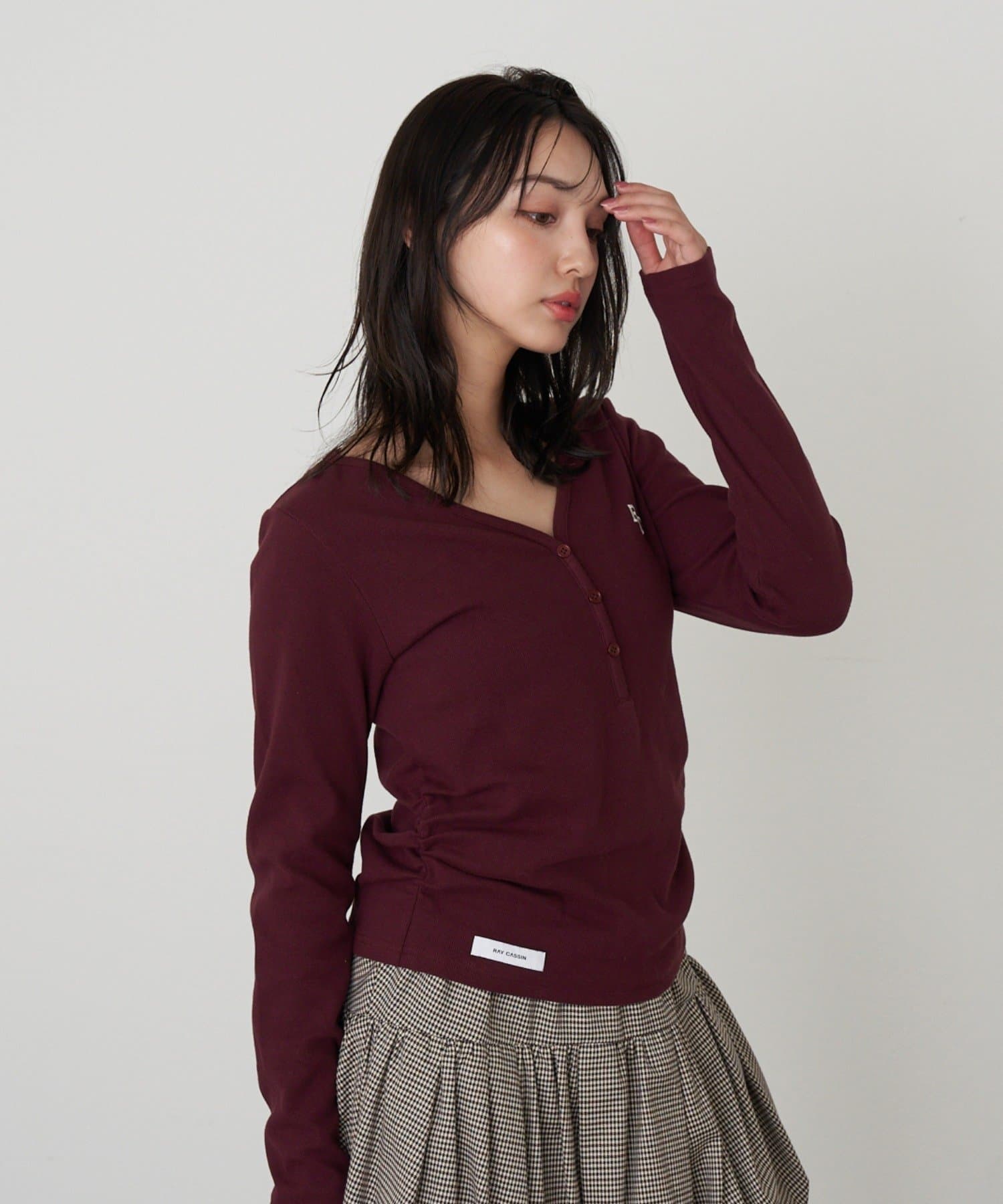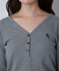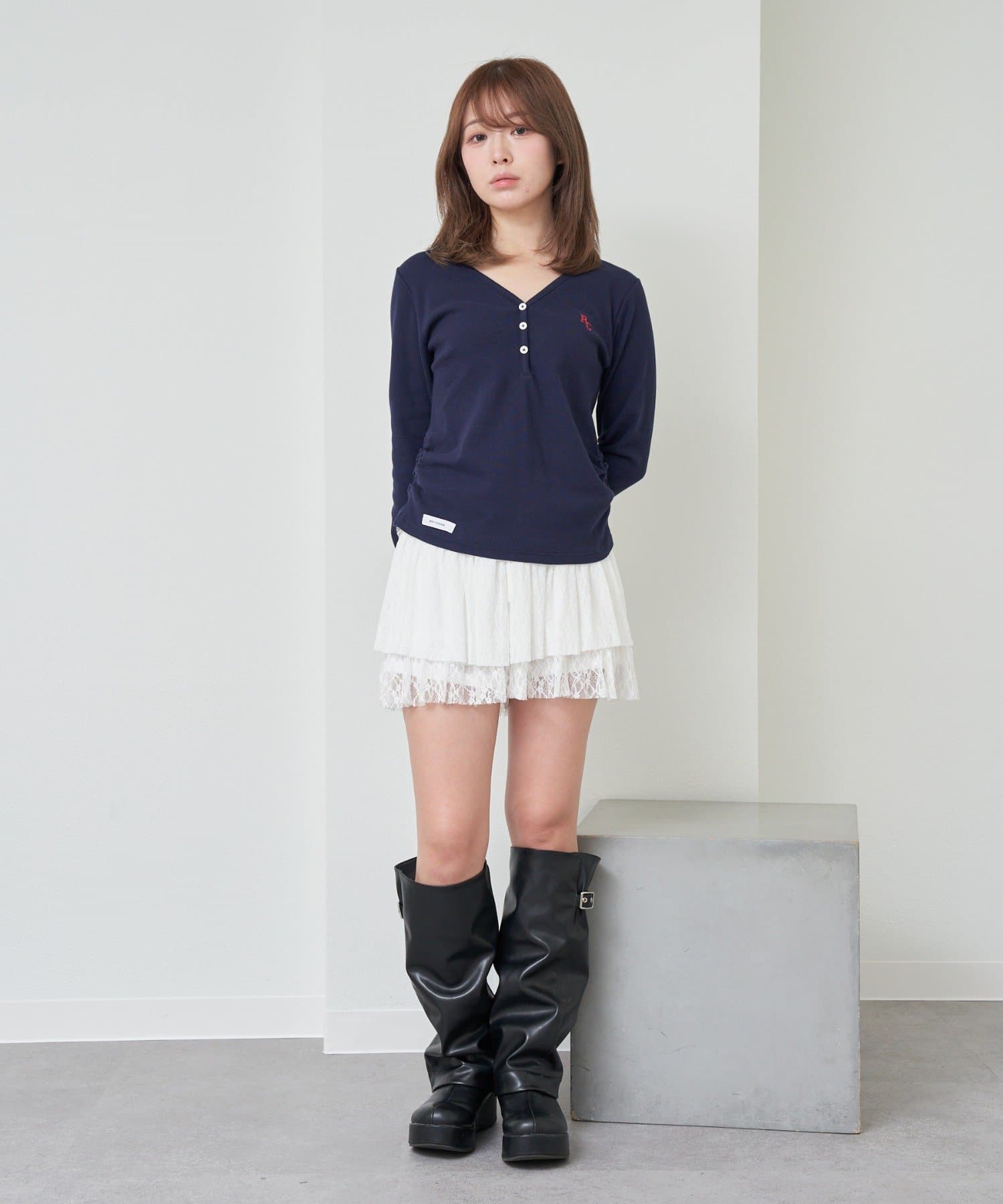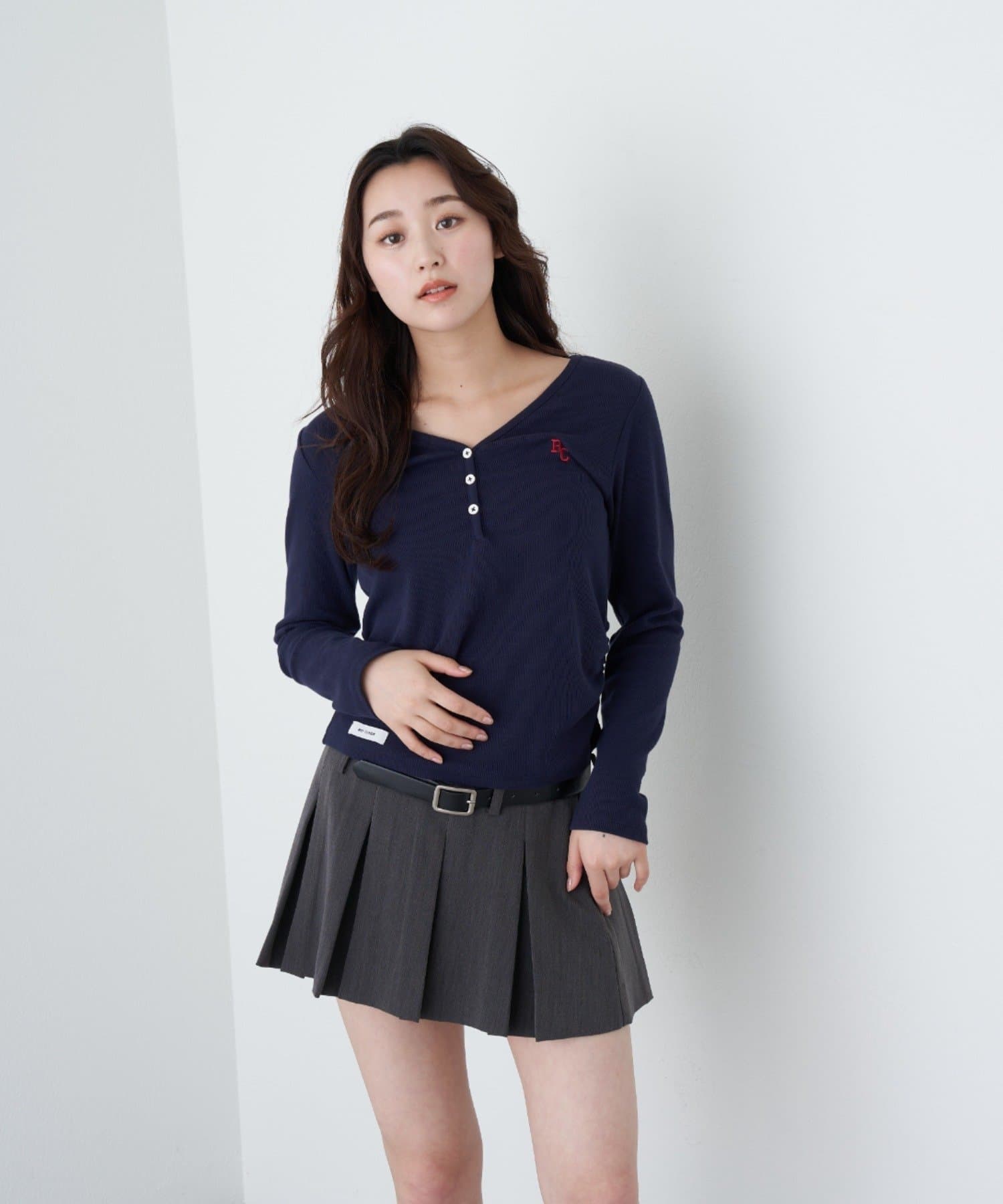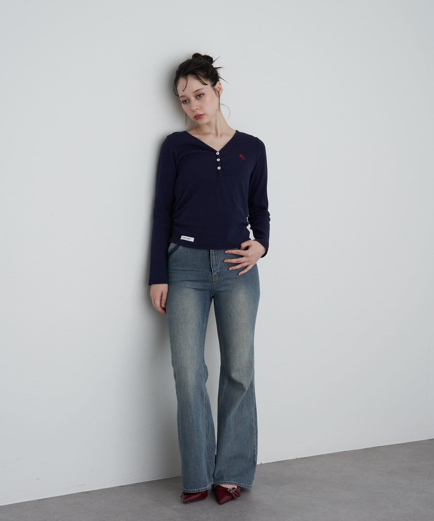 【華奢見えが叶う/追加生産決定】Vネックヘンリー胸刺繍ロングTシャツ
