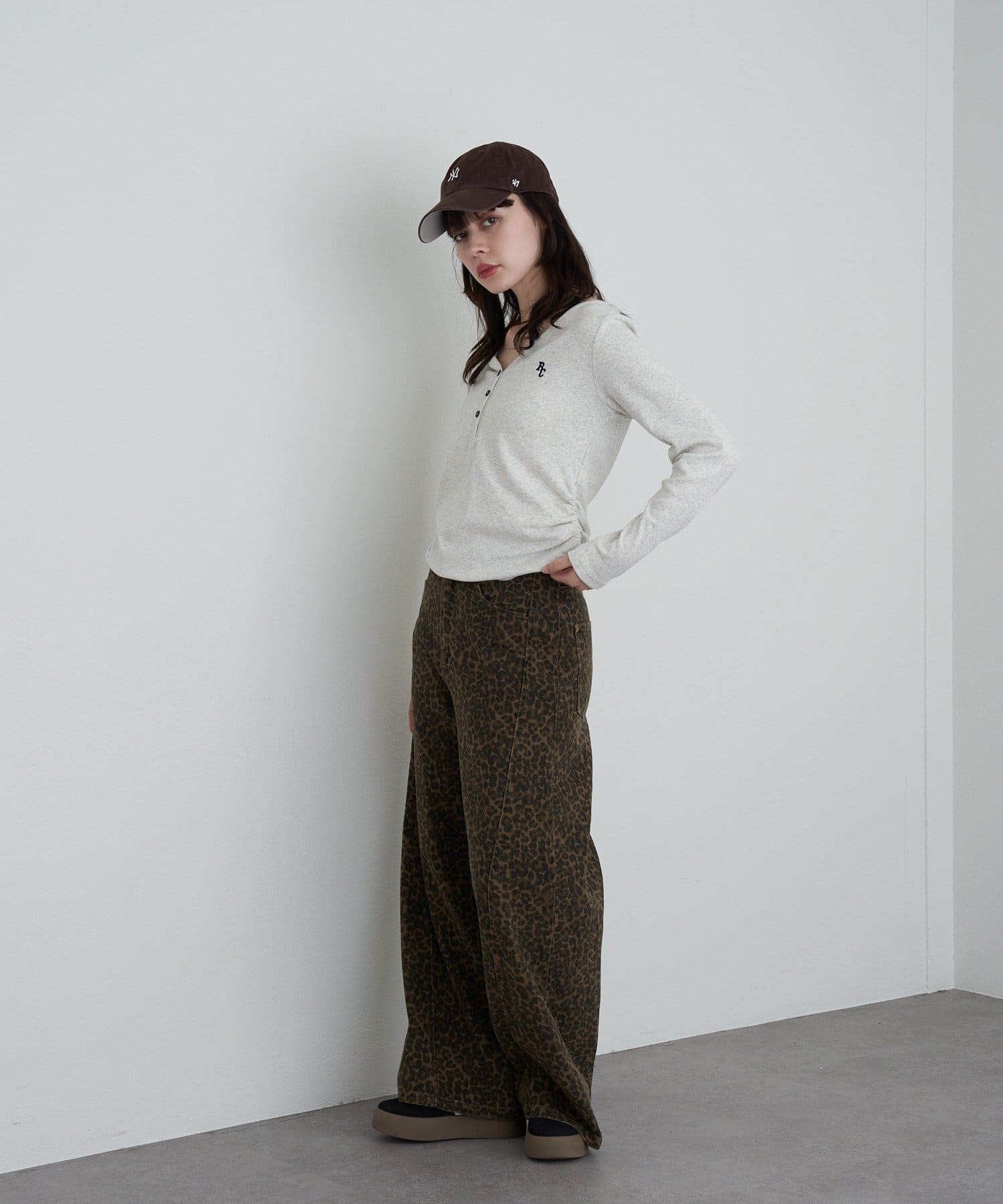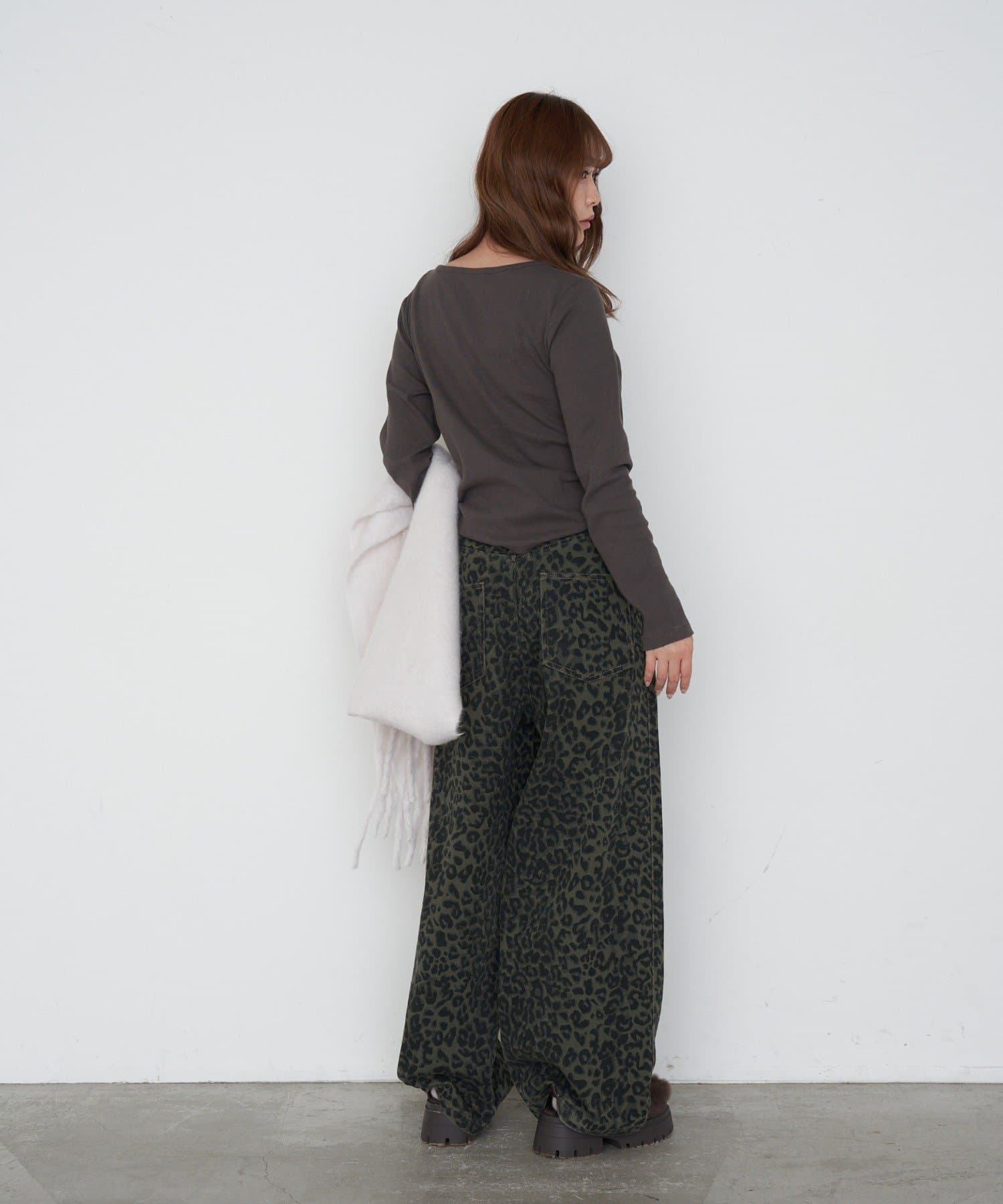 【-3kg見え/ウエスト調整可】ヒョウ柄サイド切替デニムワイドパンツ