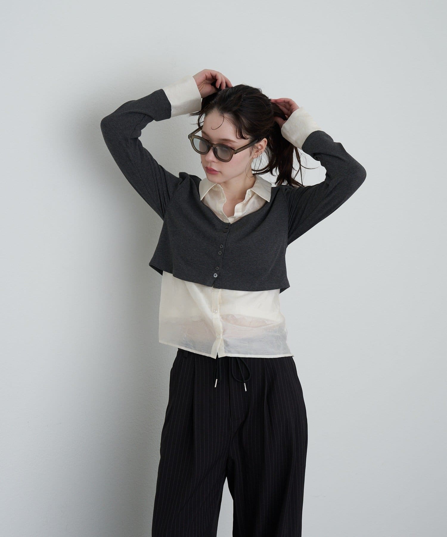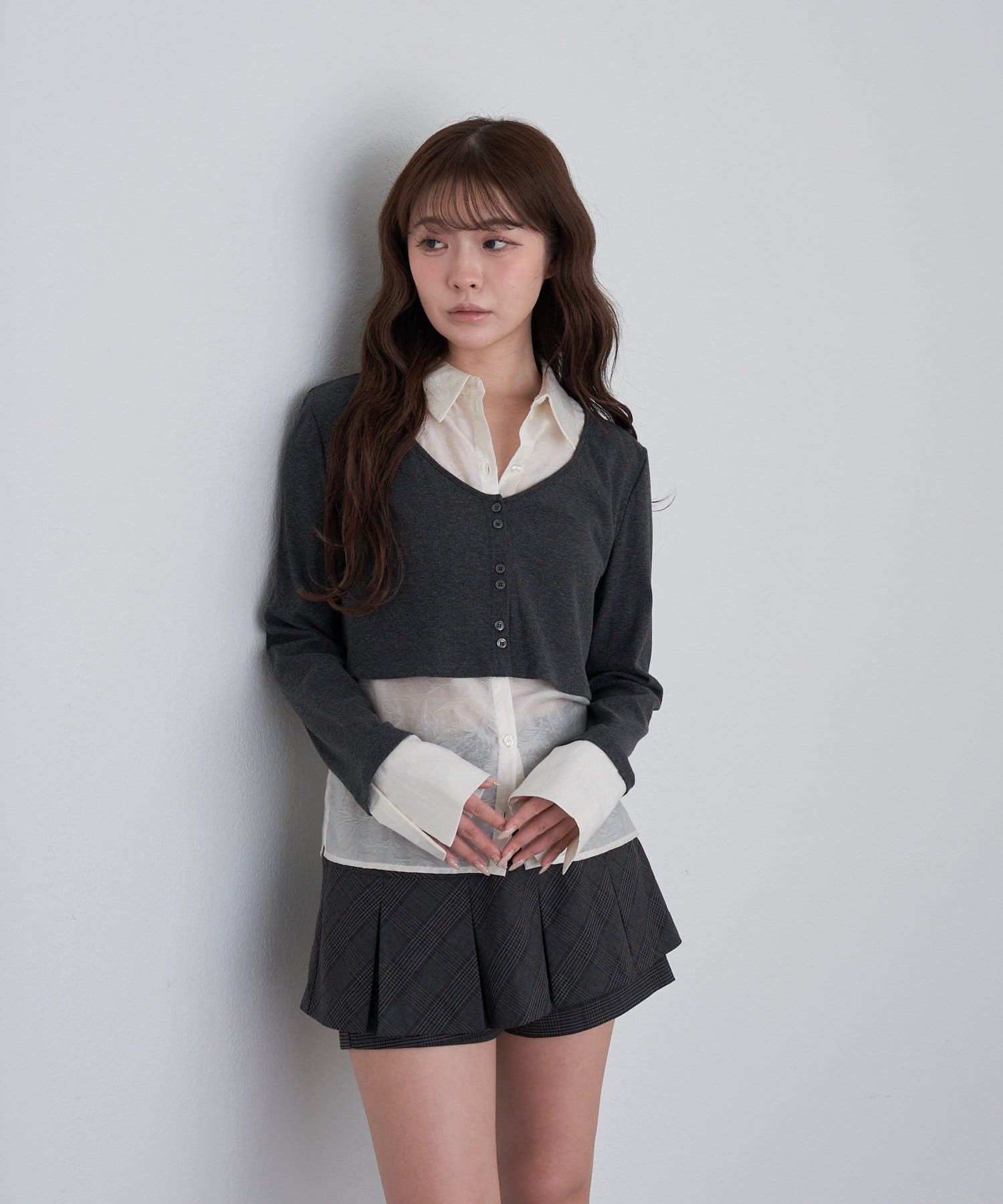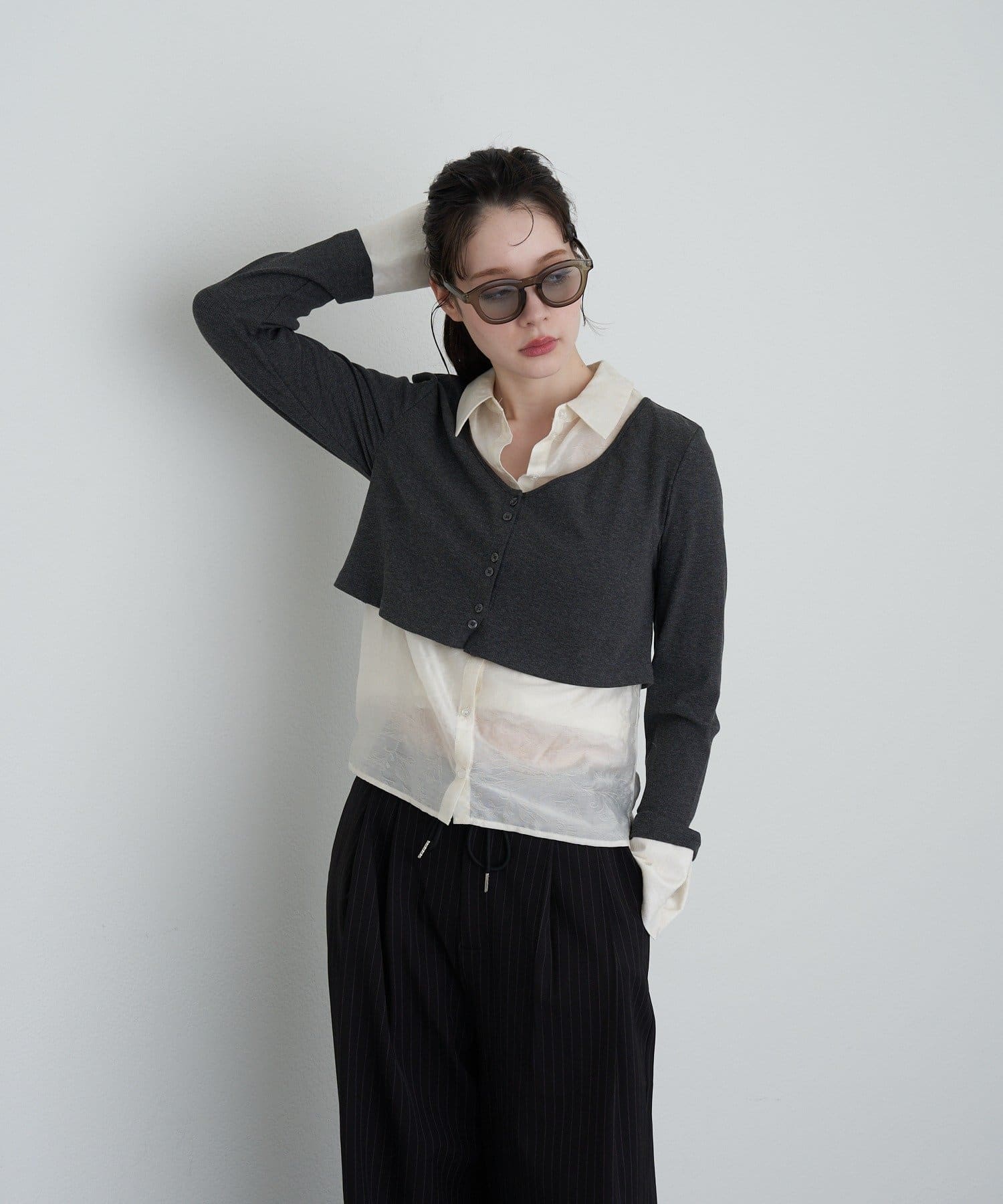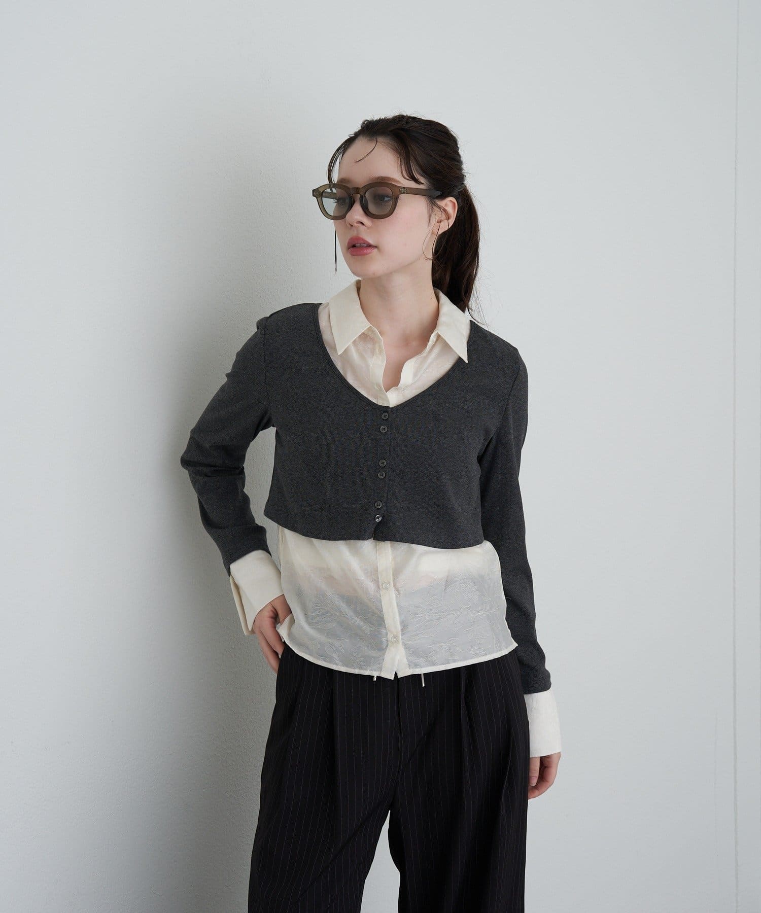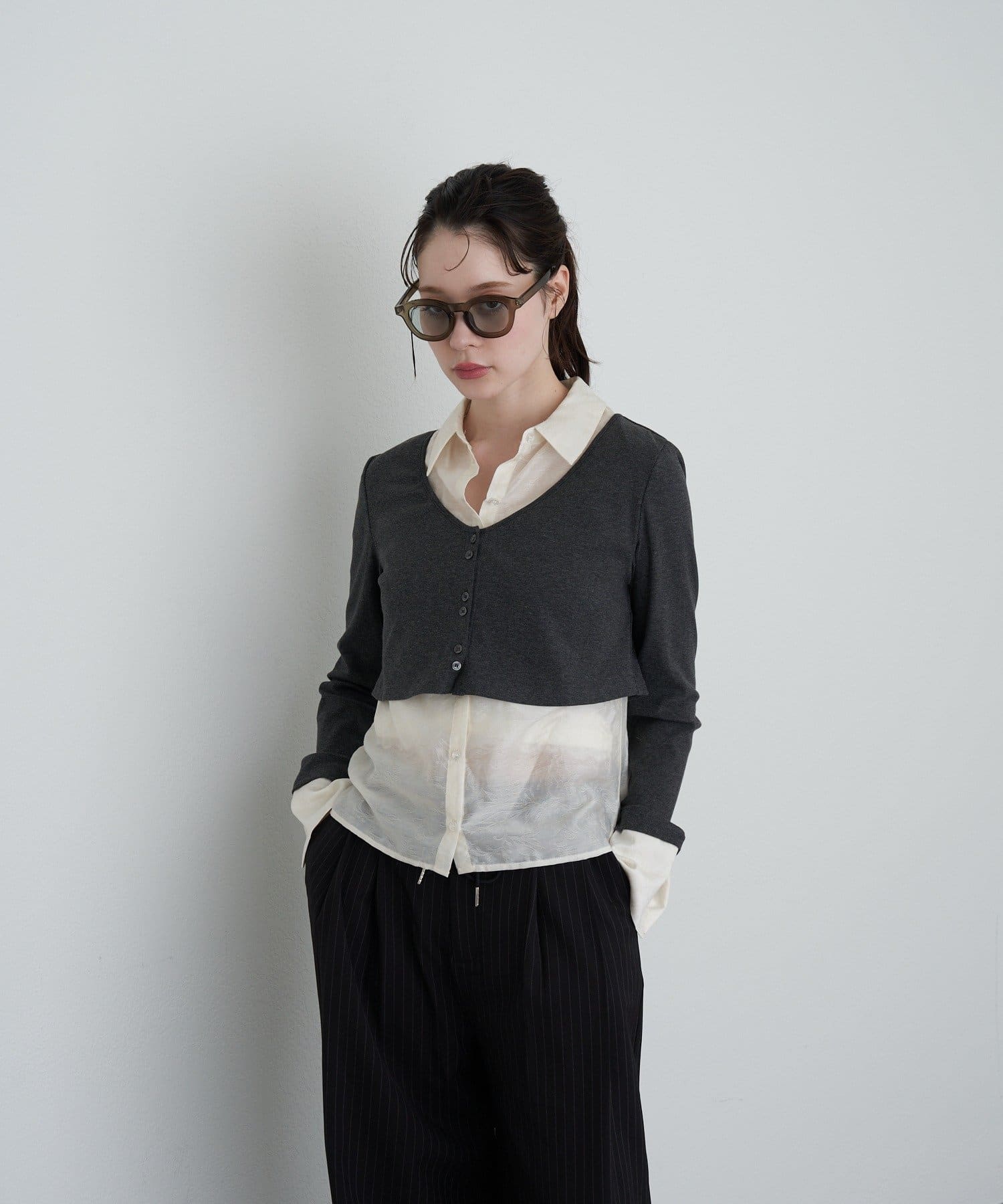 ・シャツとカーデの2枚重ねデザインになっており、ボタンを開けると羽織りとしても着用いただけます。