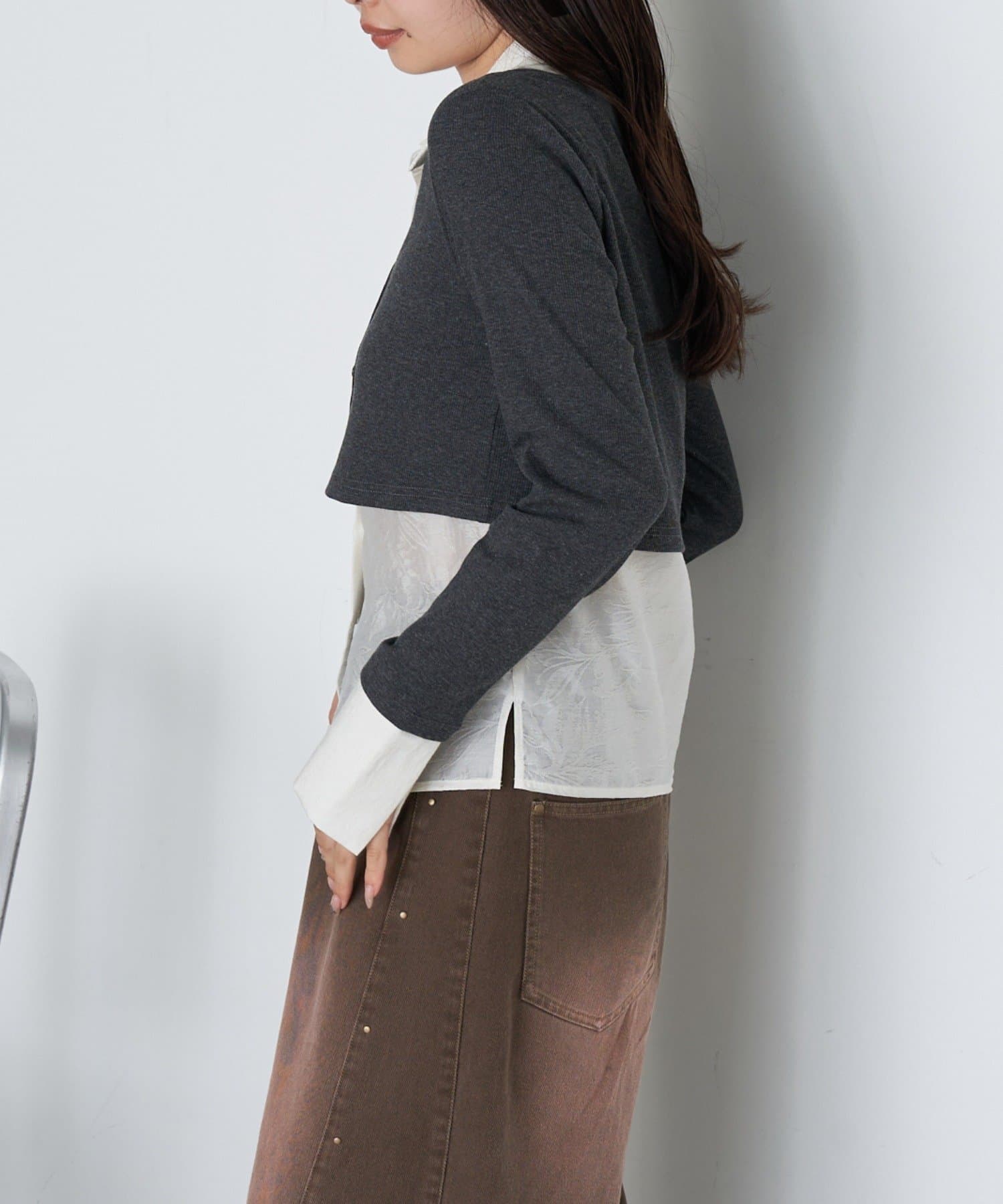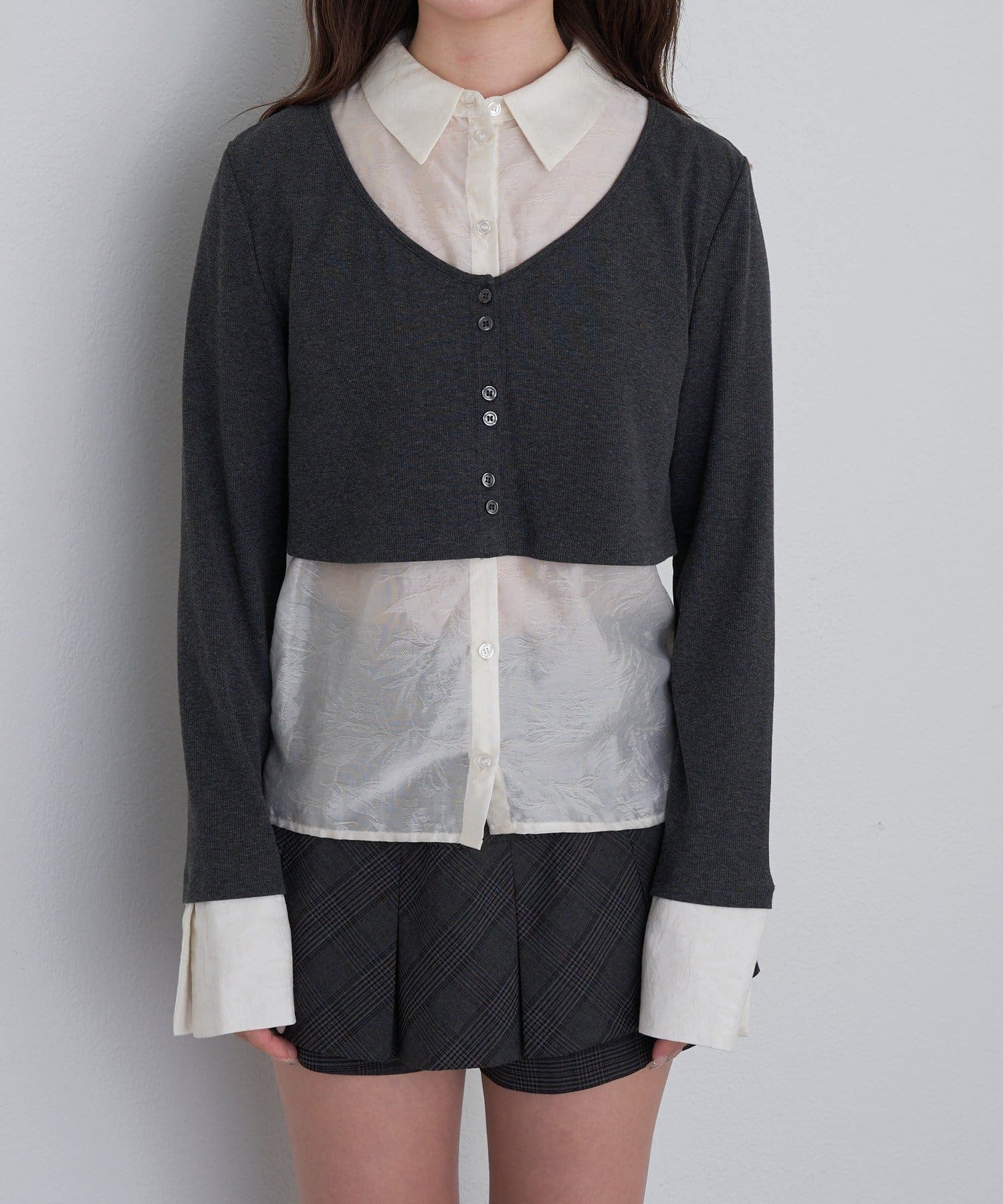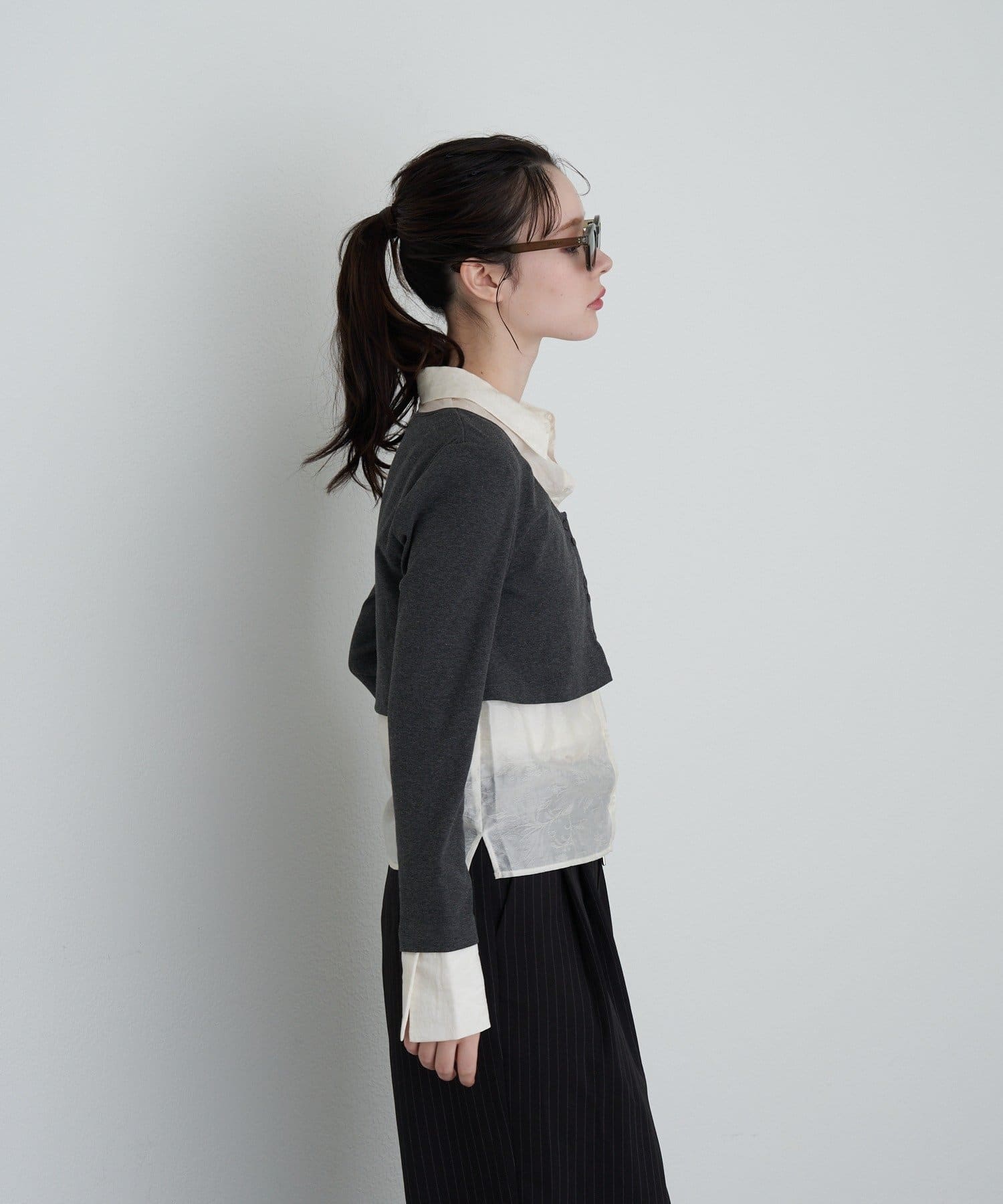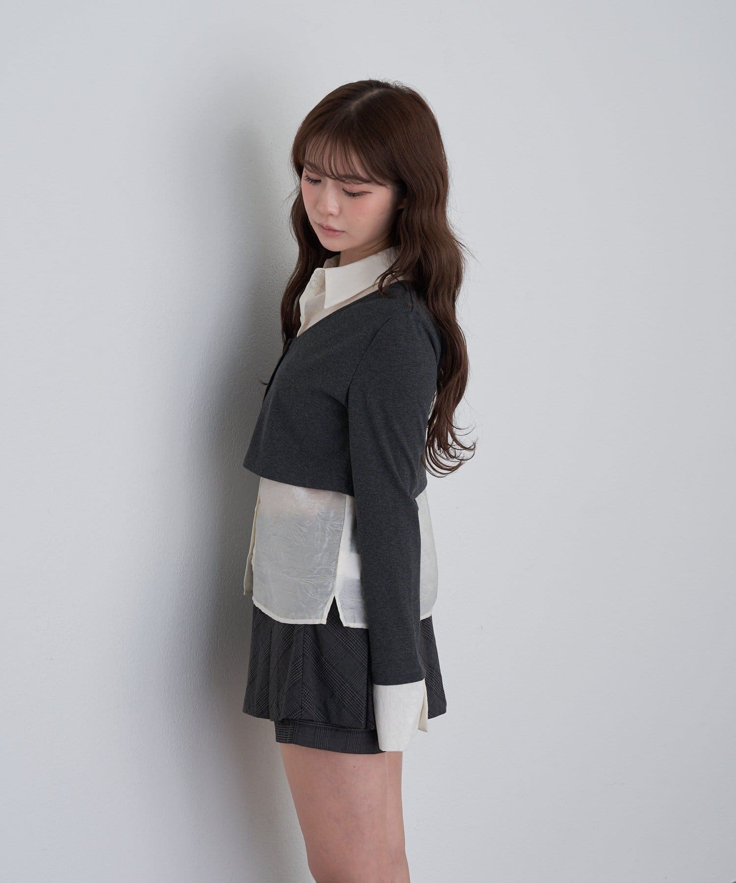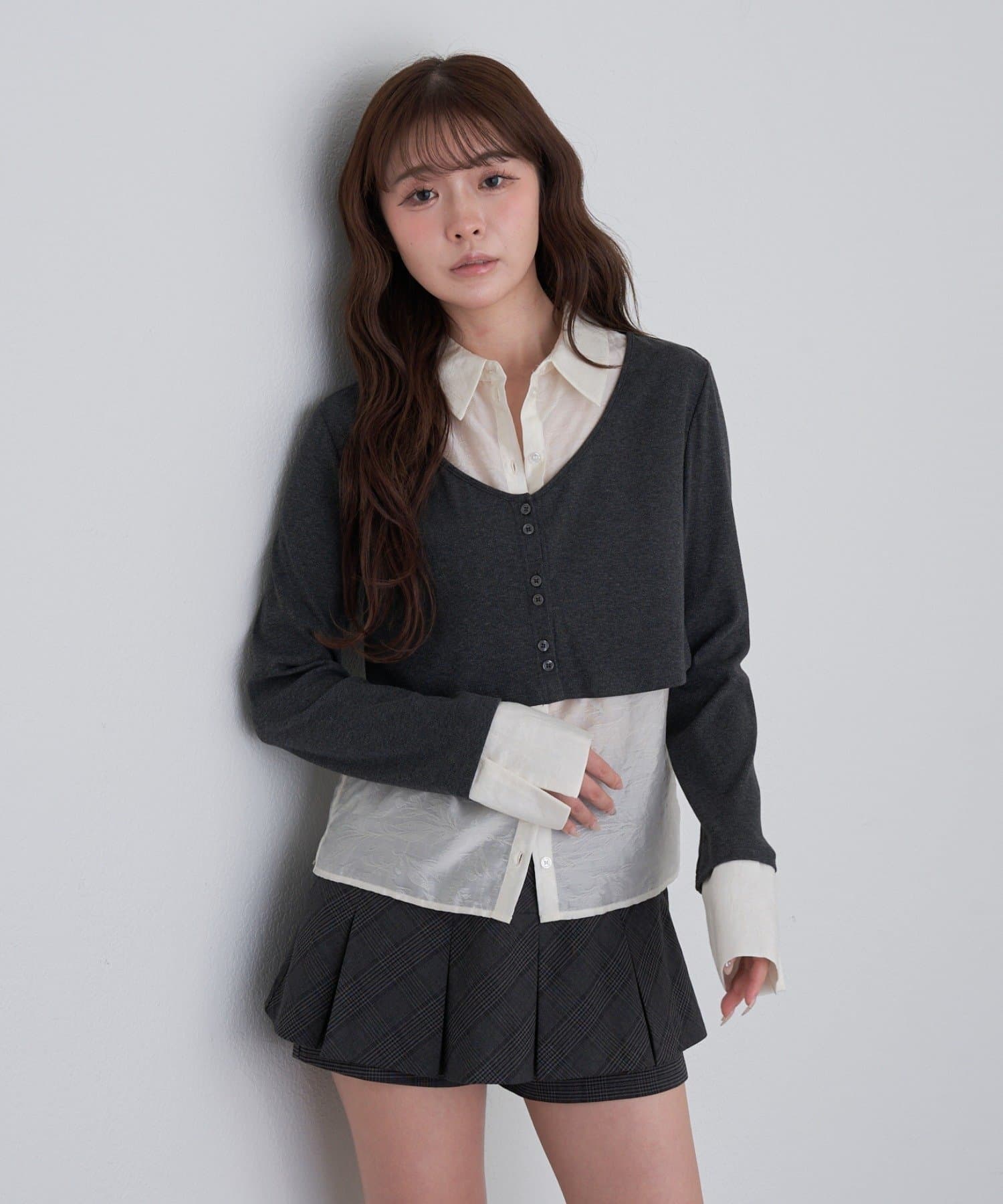・シャツとカーデの2枚重ねデザインになっており、ボタンを開けると羽織りとしても着用いただけます。
