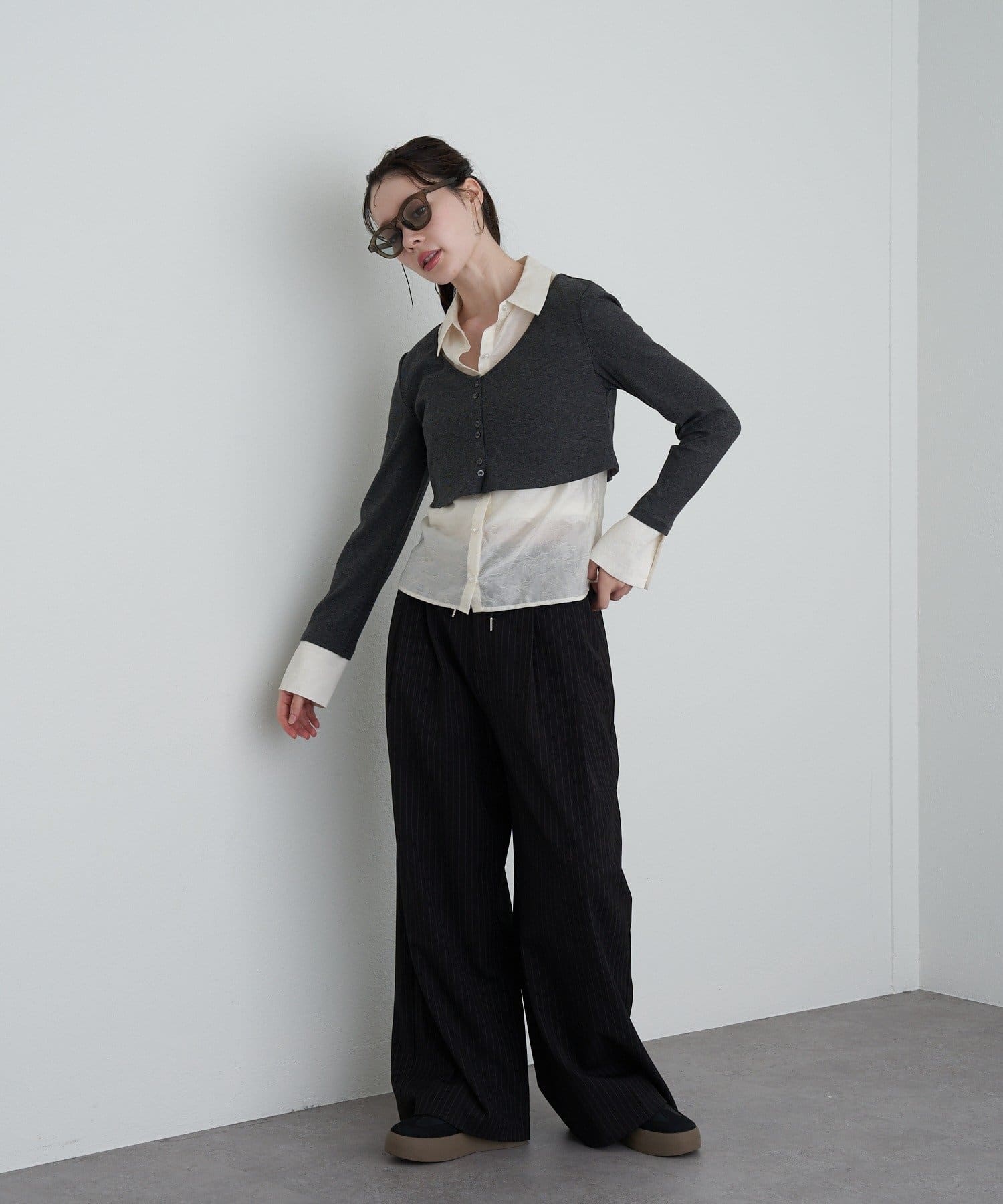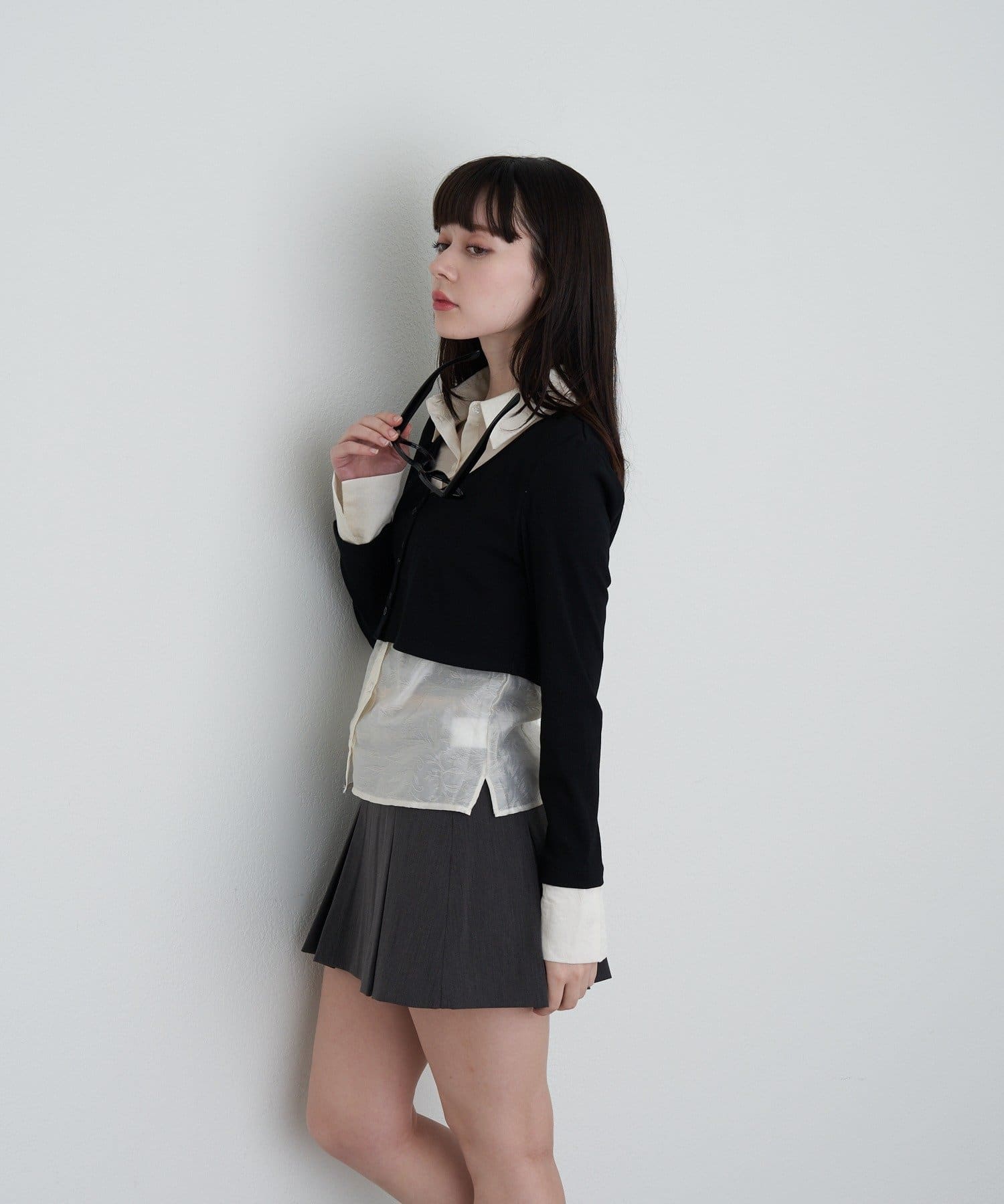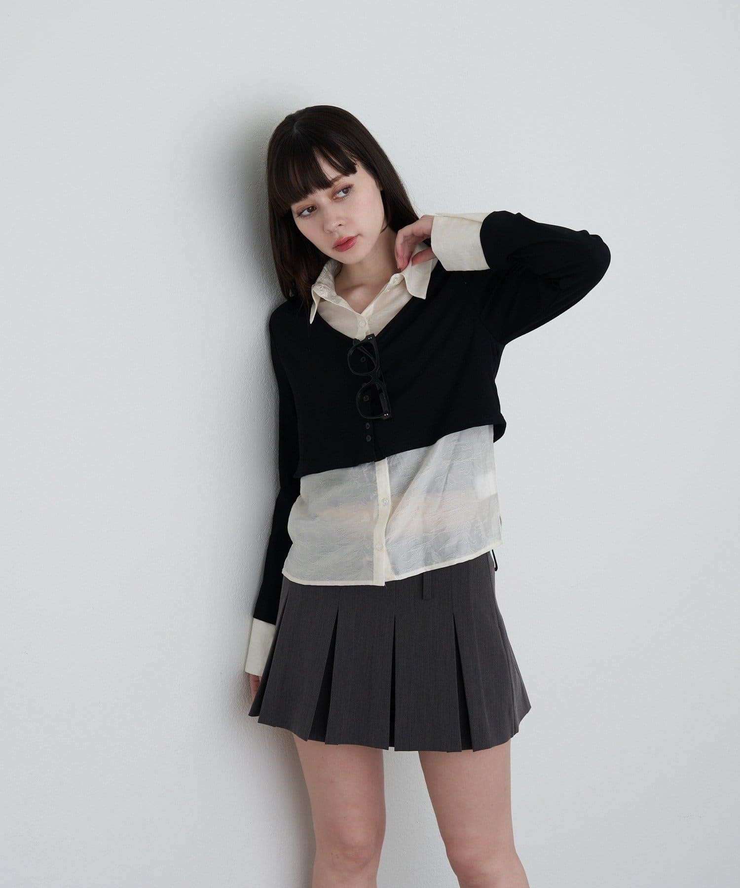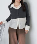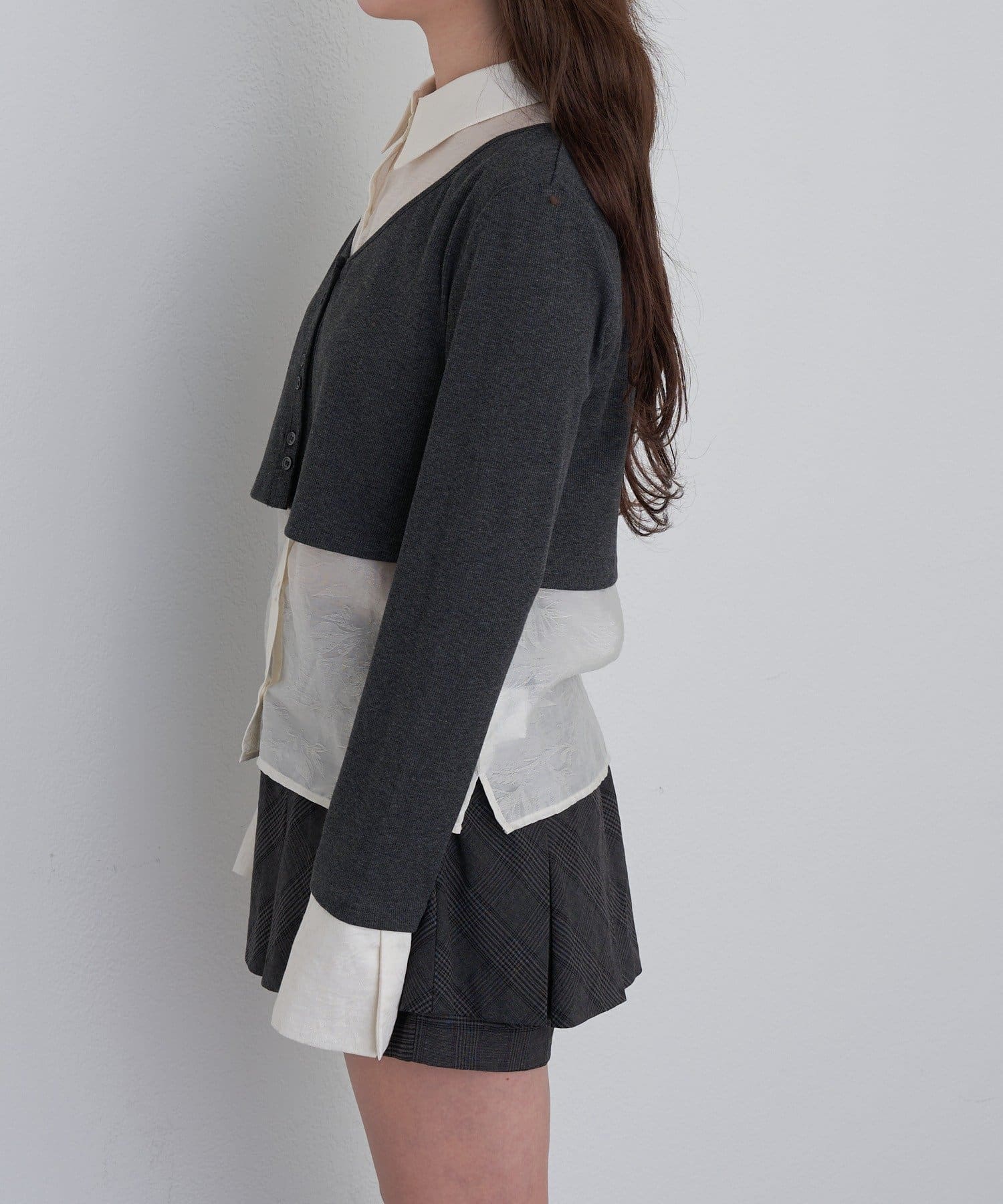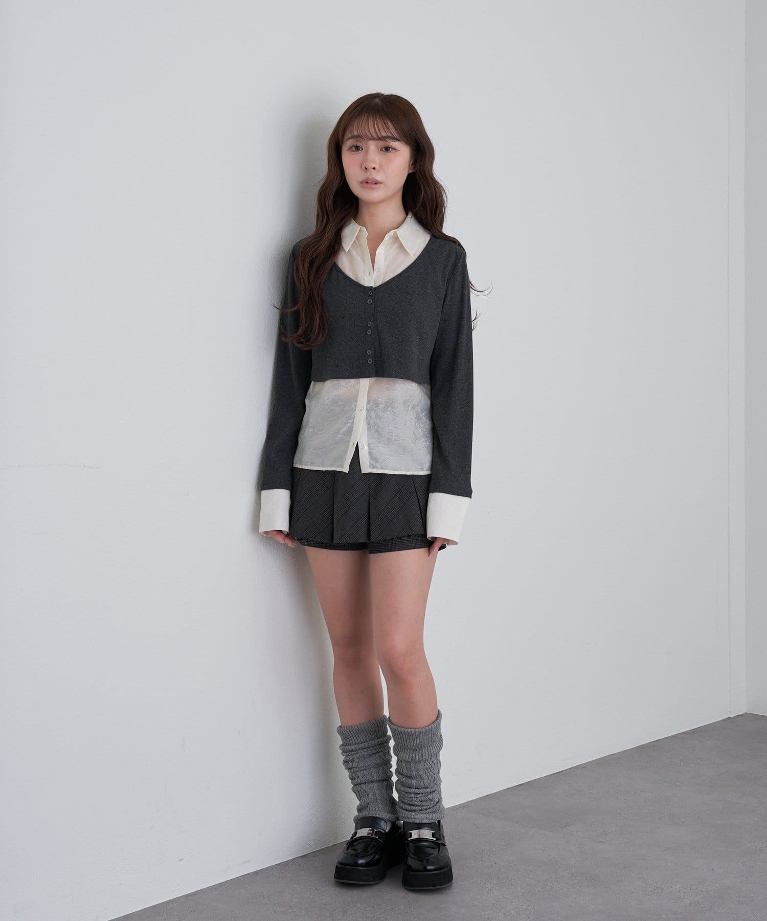 ・シャツとカーデの2枚重ねデザインになっており、ボタンを開けると羽織りとしても着用いただけます。