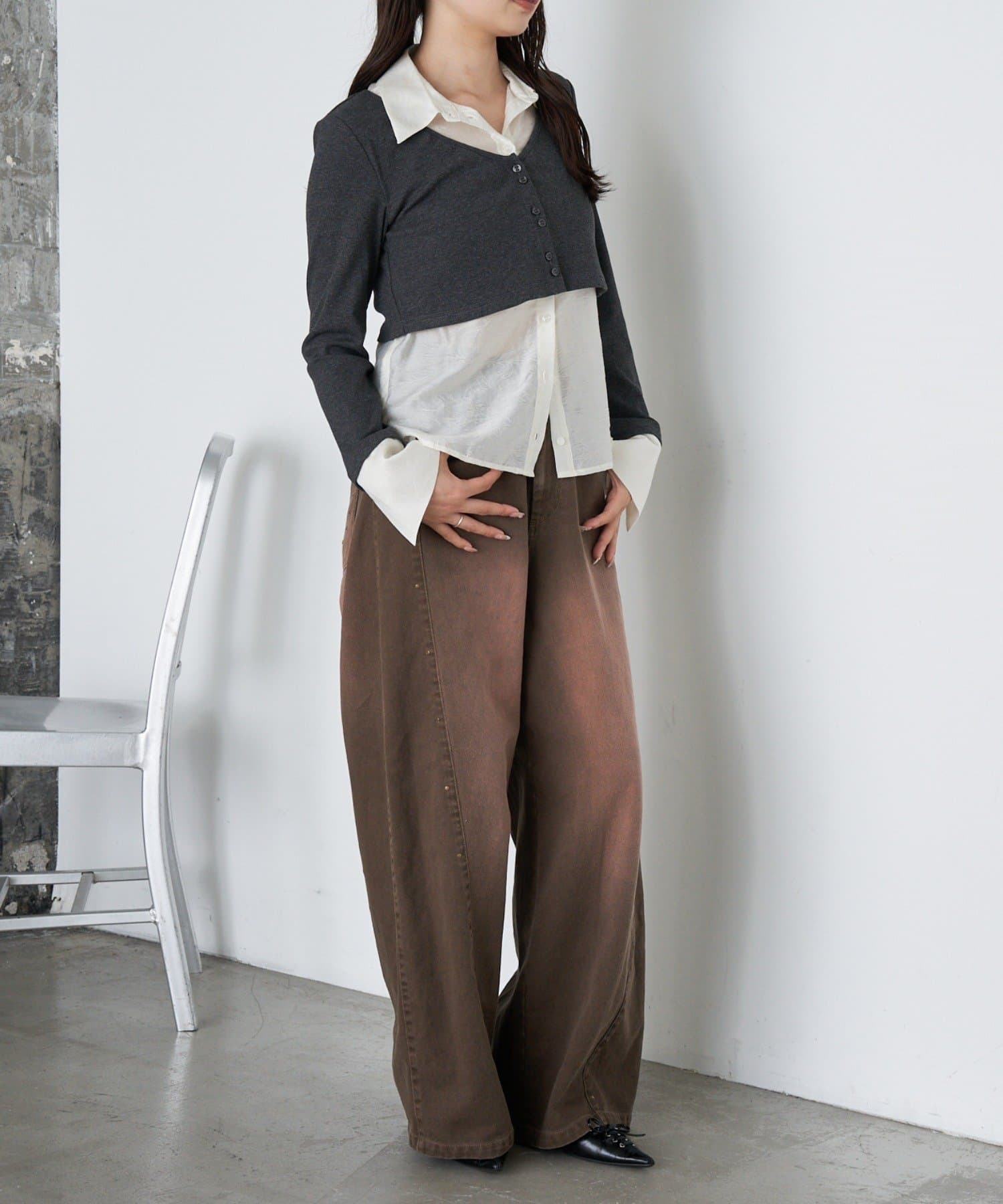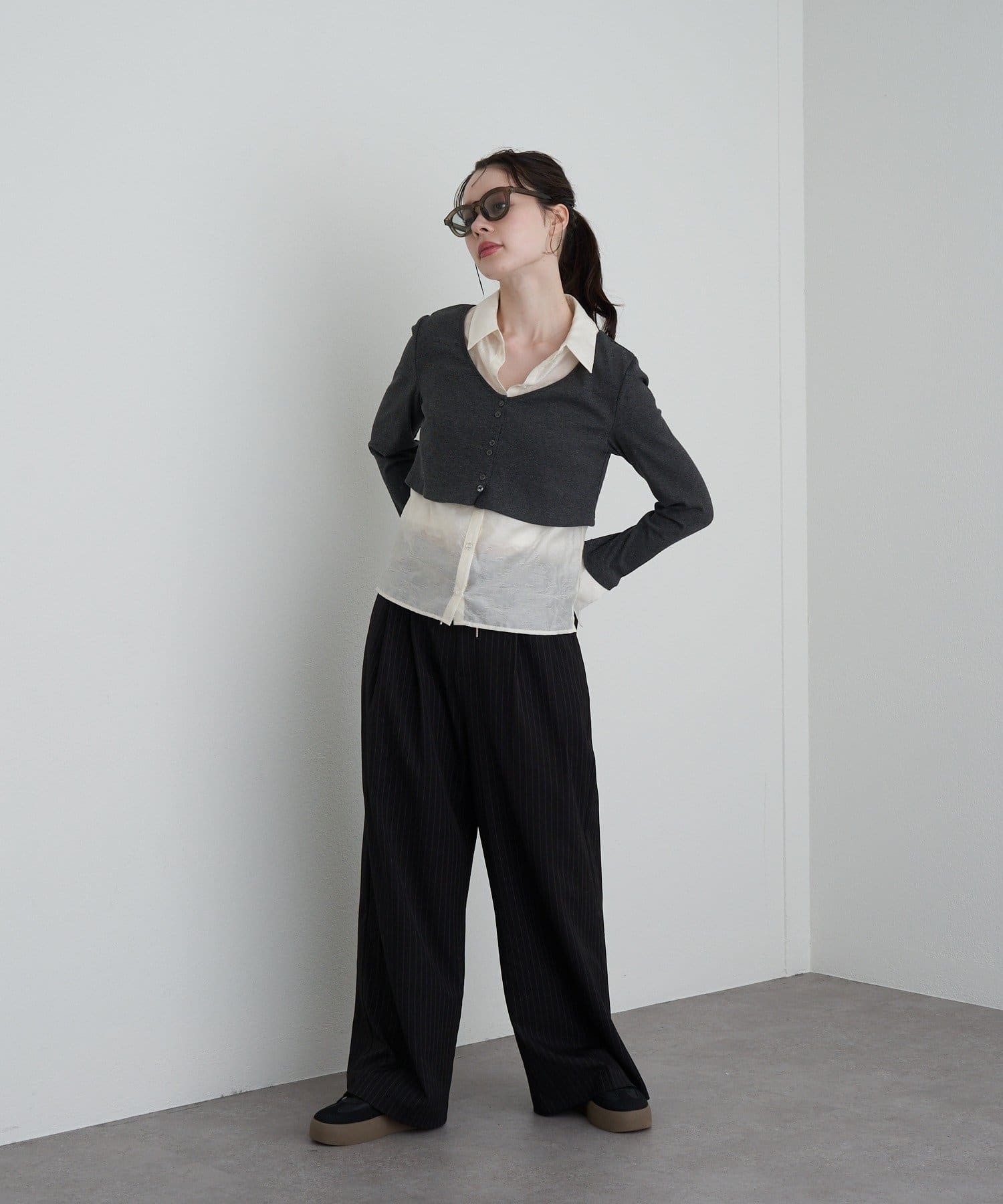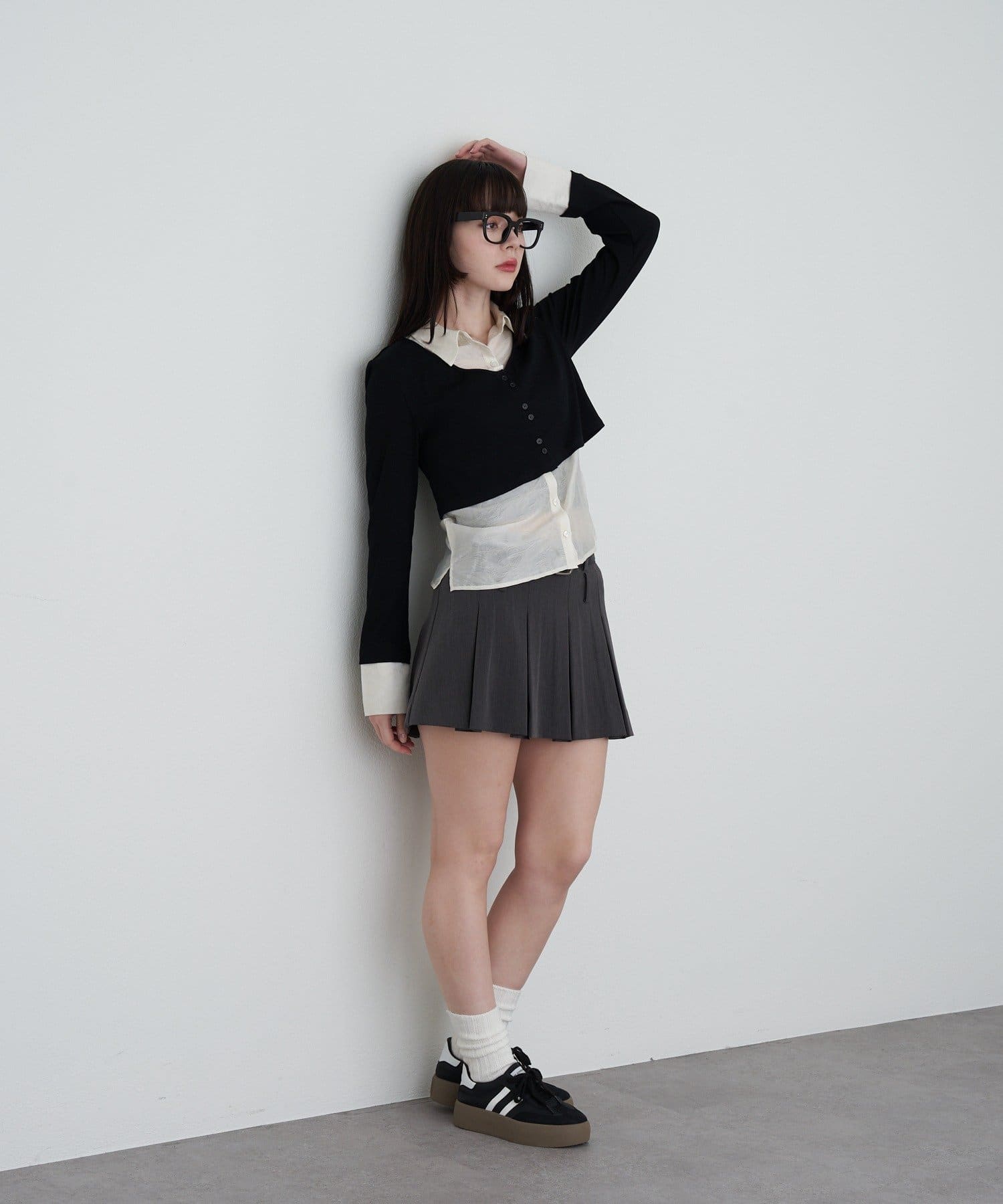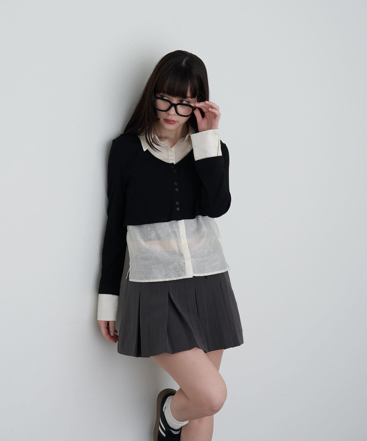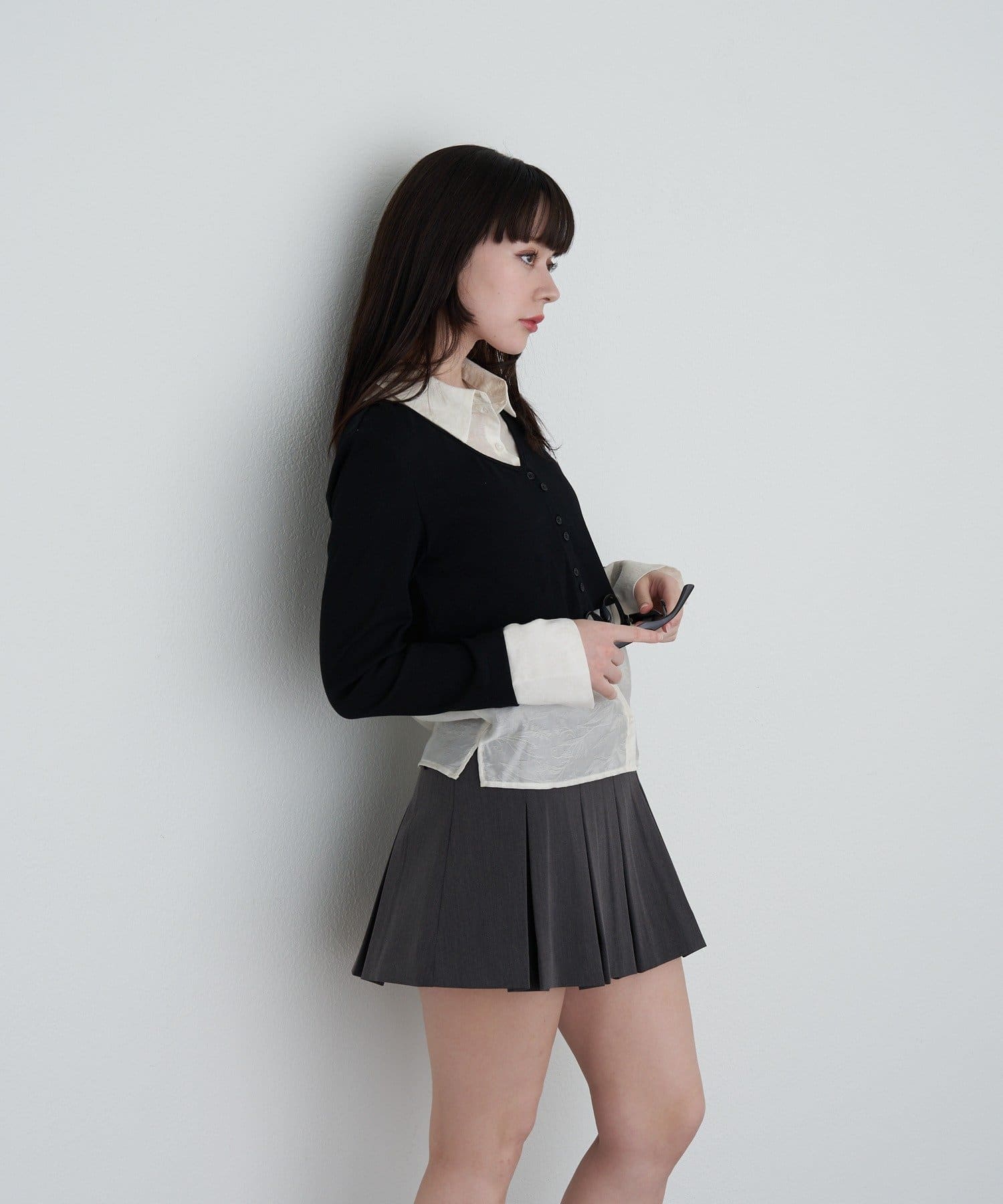 ・シャツとカーデの2枚重ねデザインになっており、ボタンを開けると羽織りとしても着用いただけます。