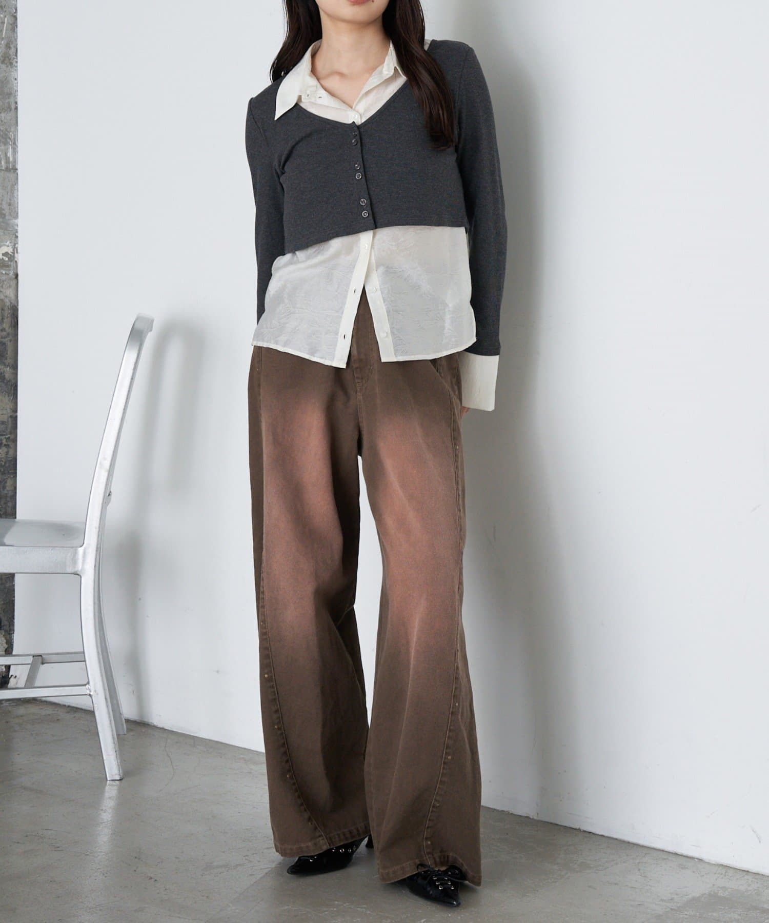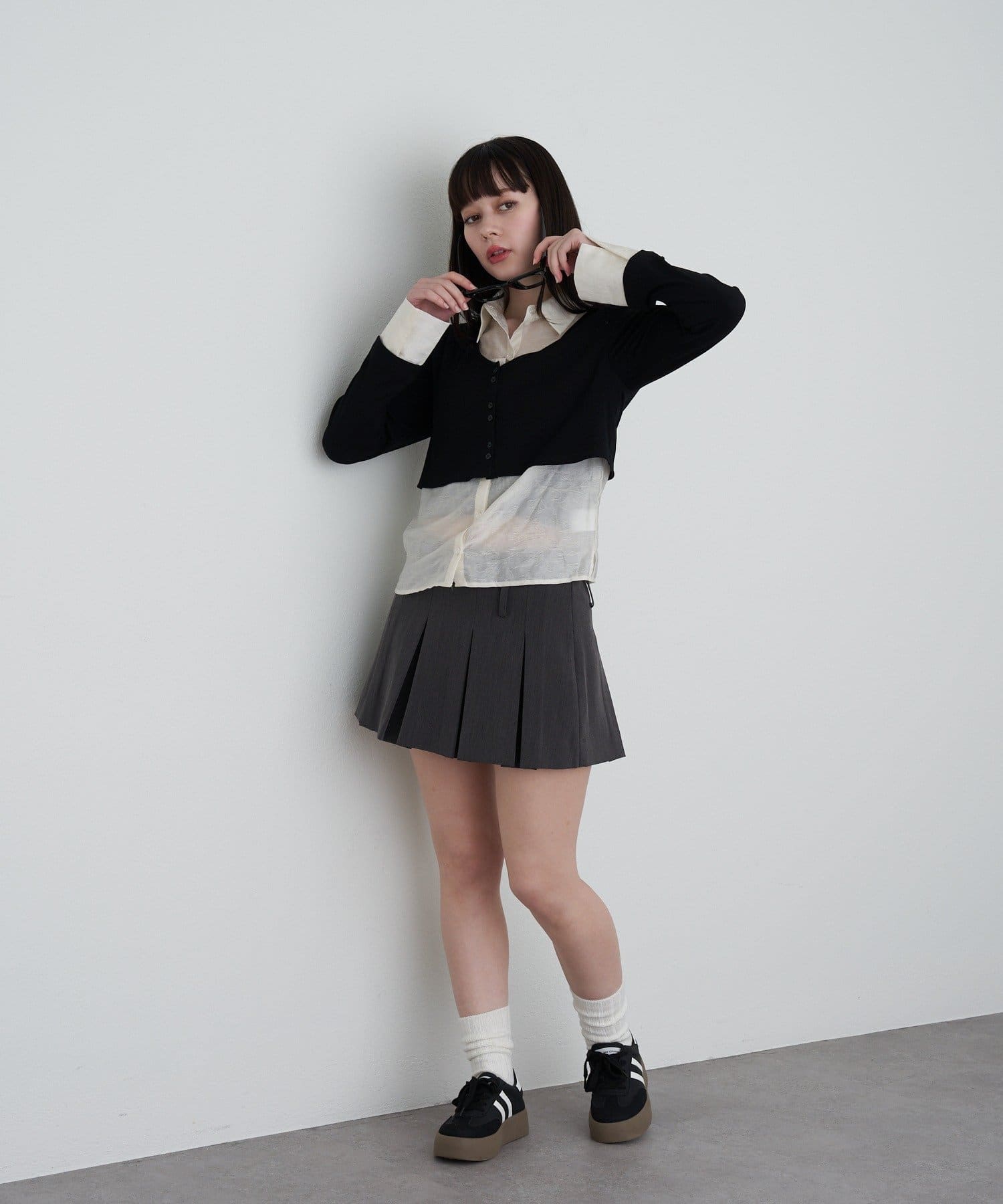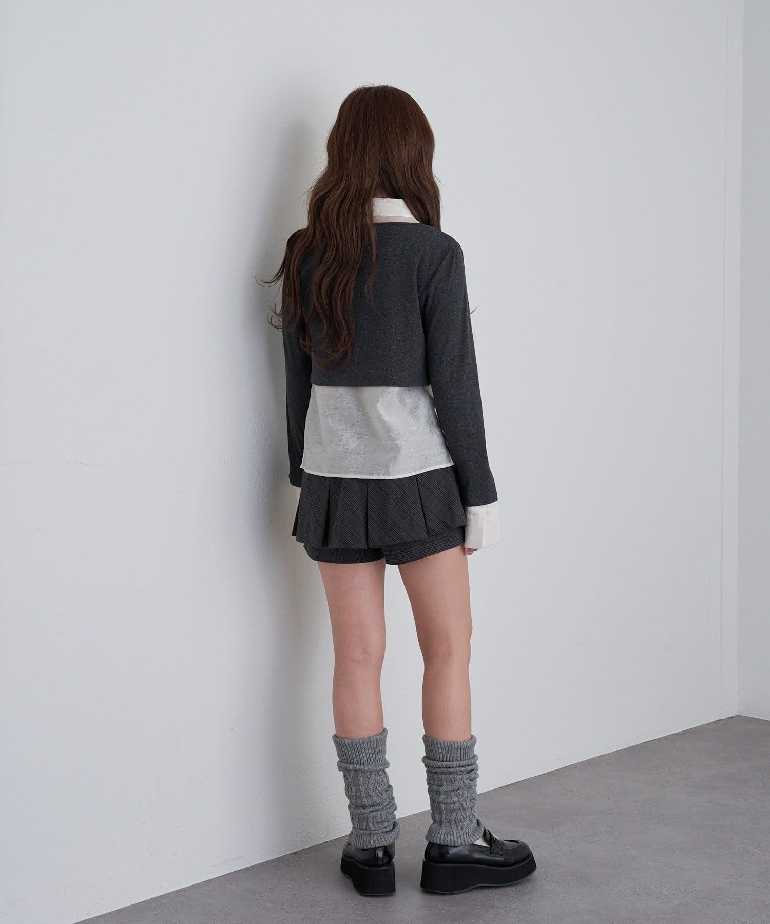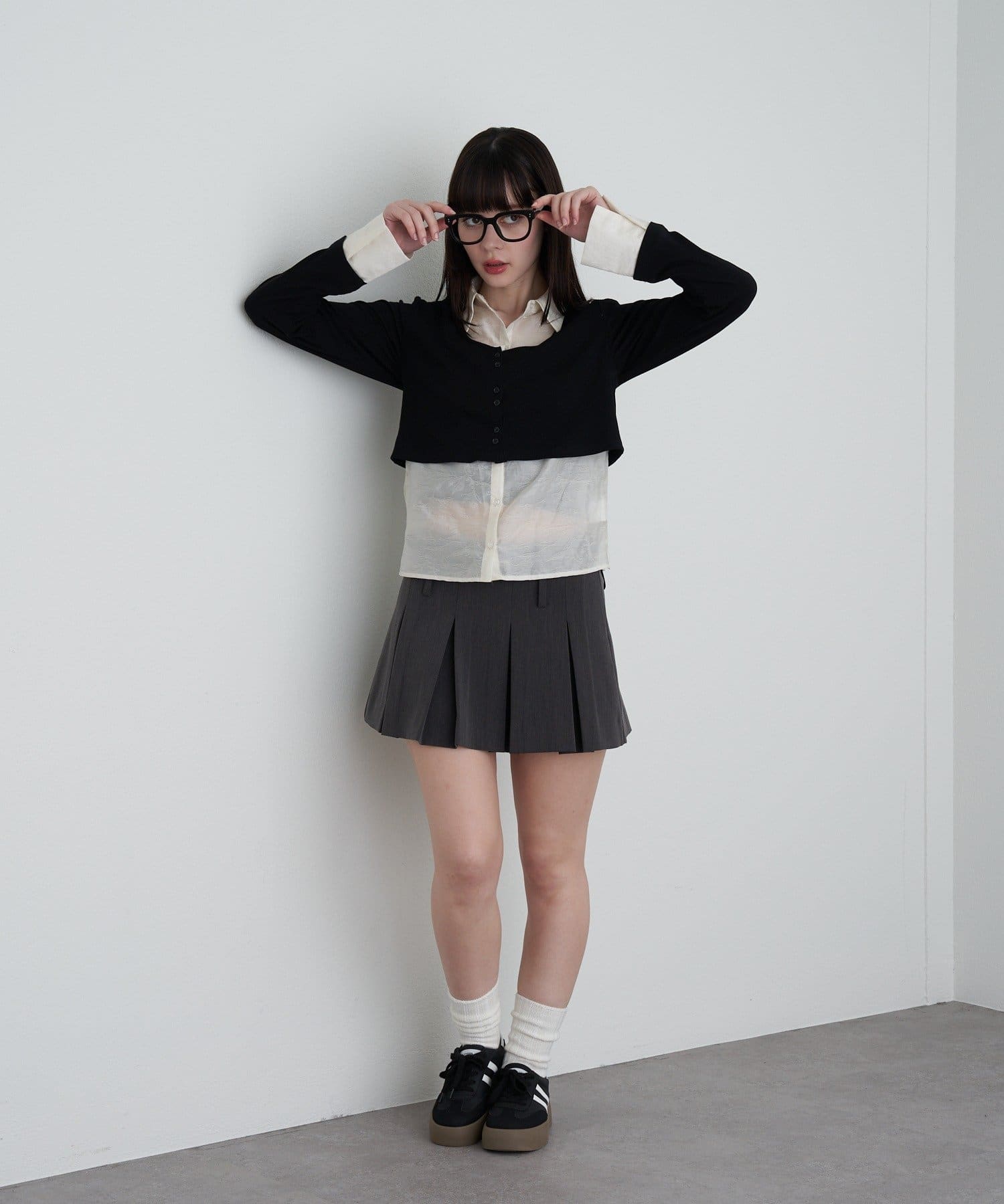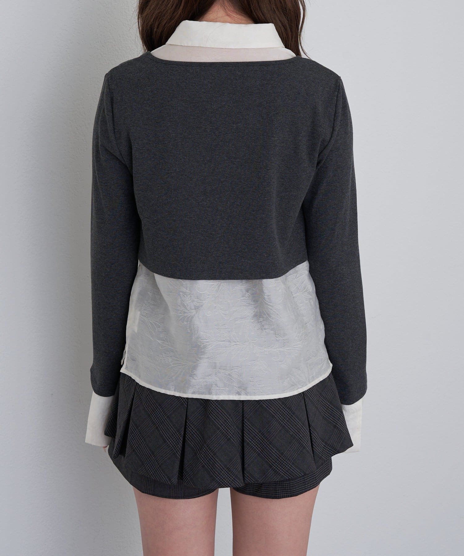 ・シャツとカーデの2枚重ねデザインになっており、ボタンを開けると羽織りとしても着用いただけます。