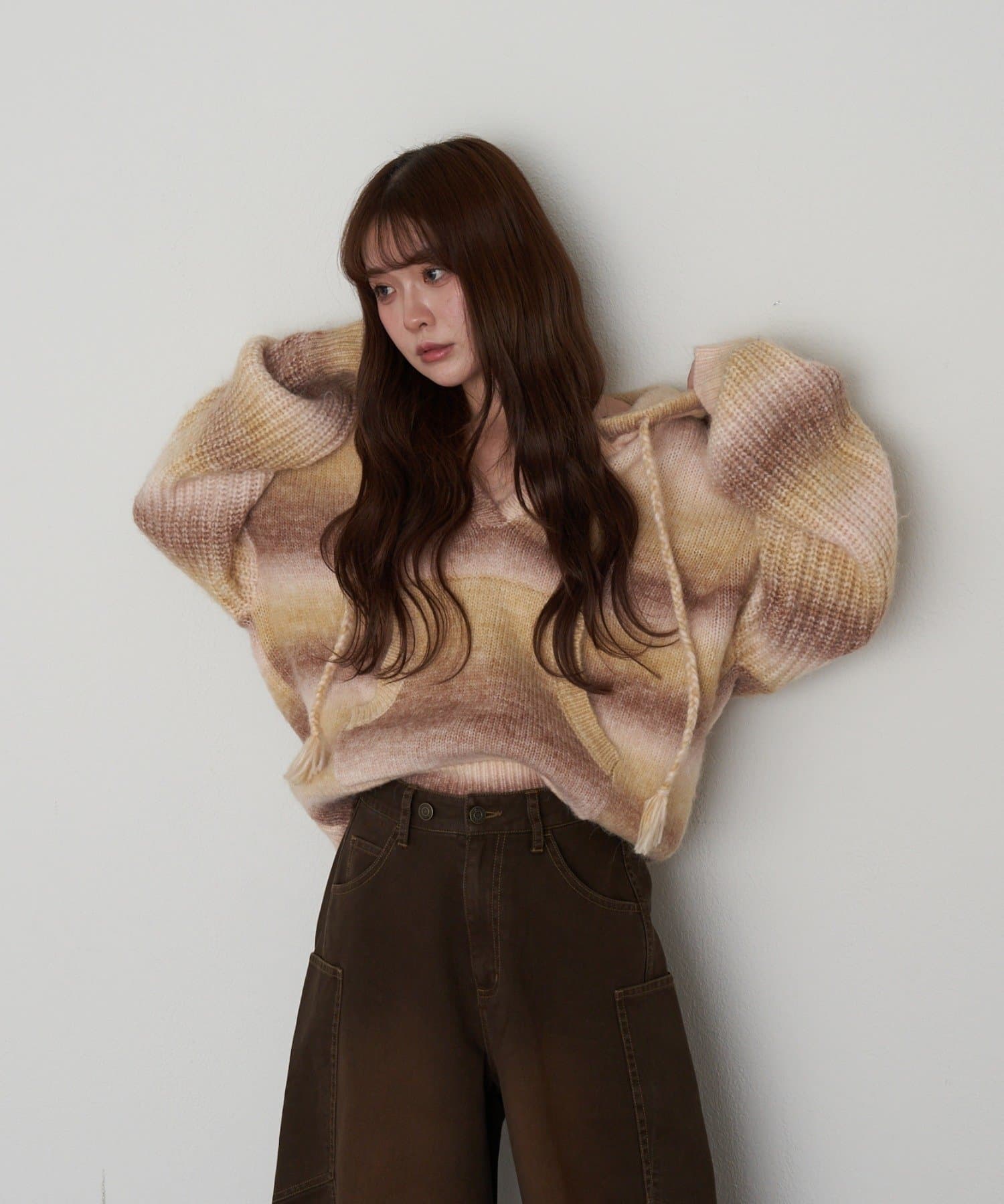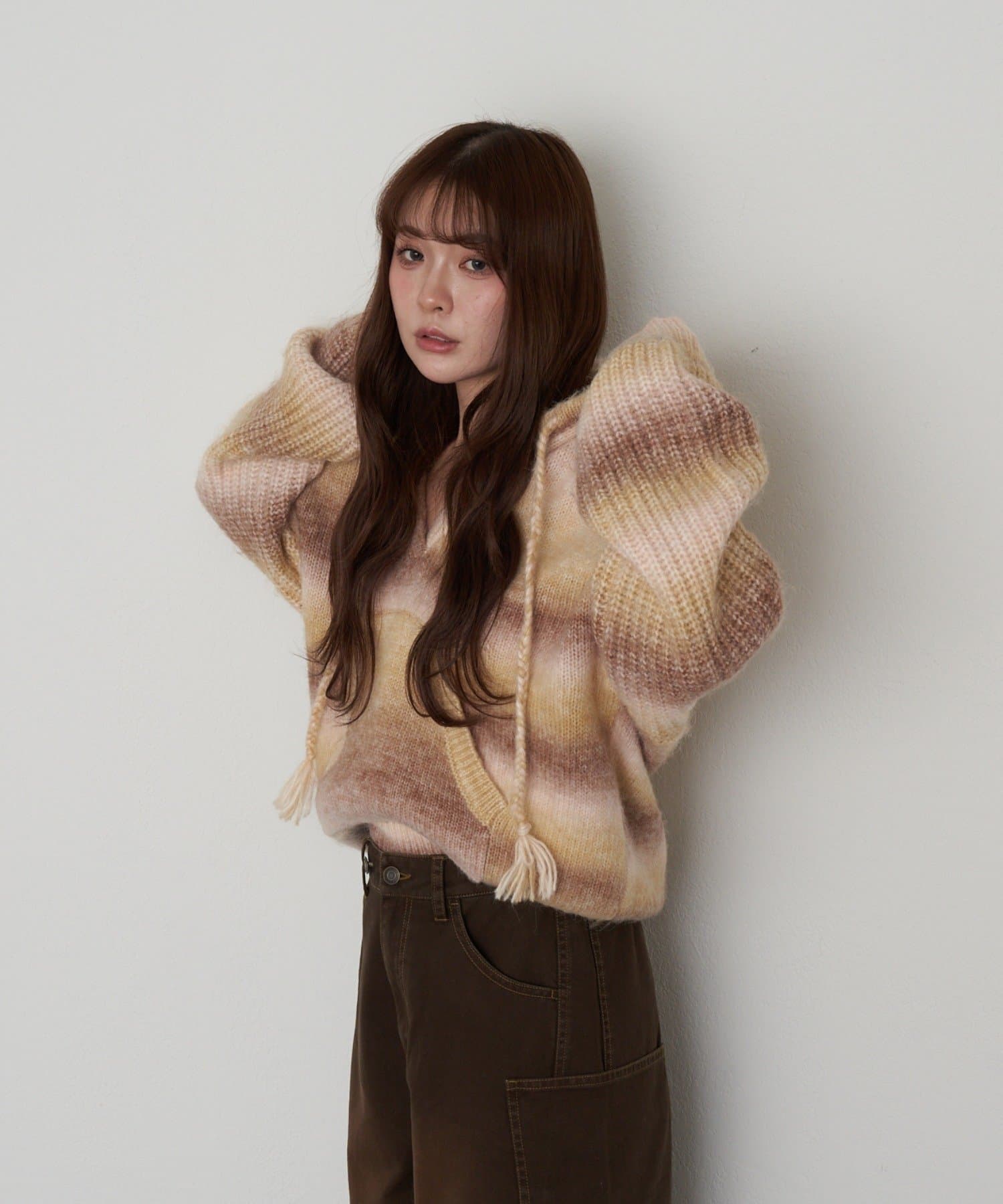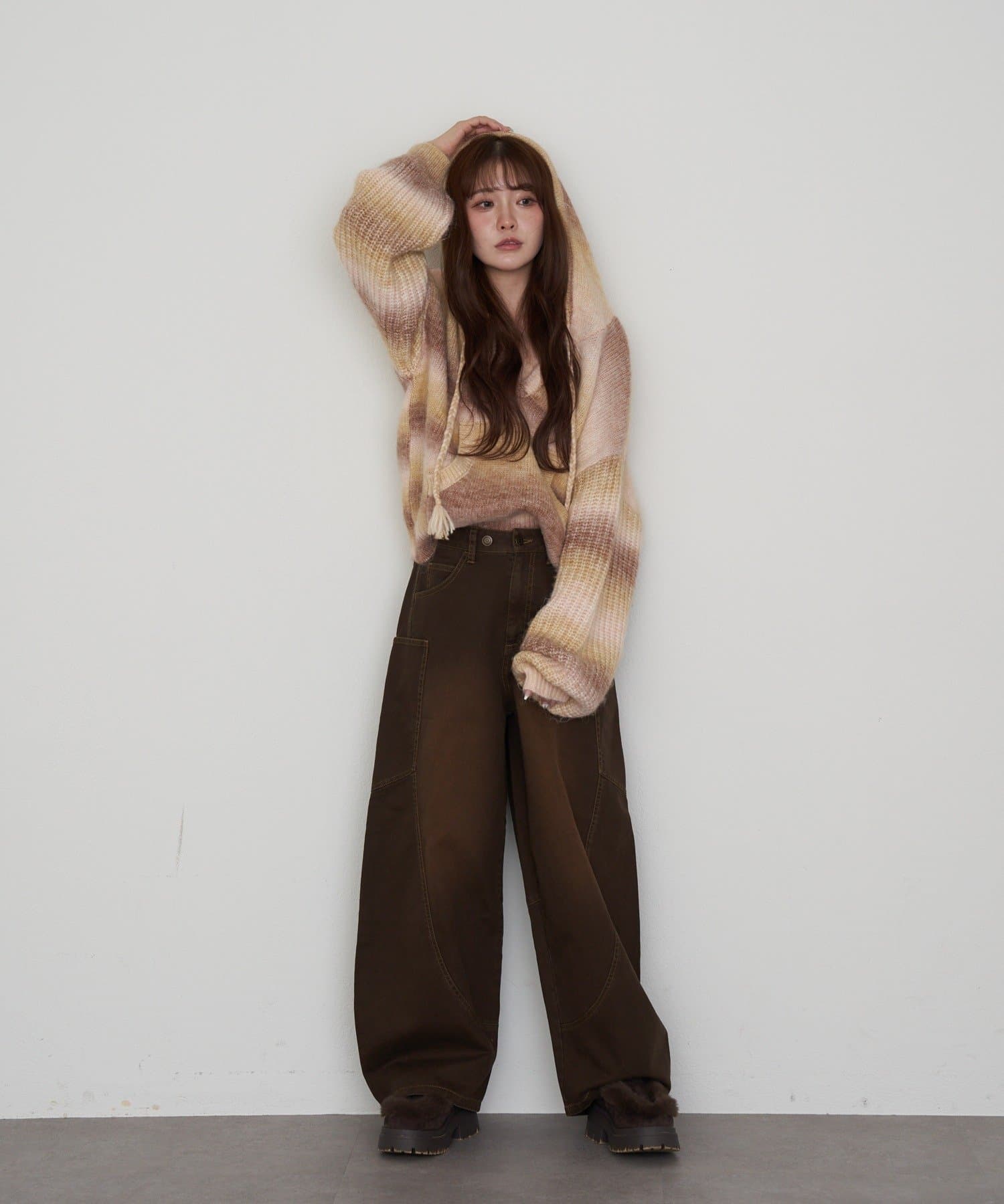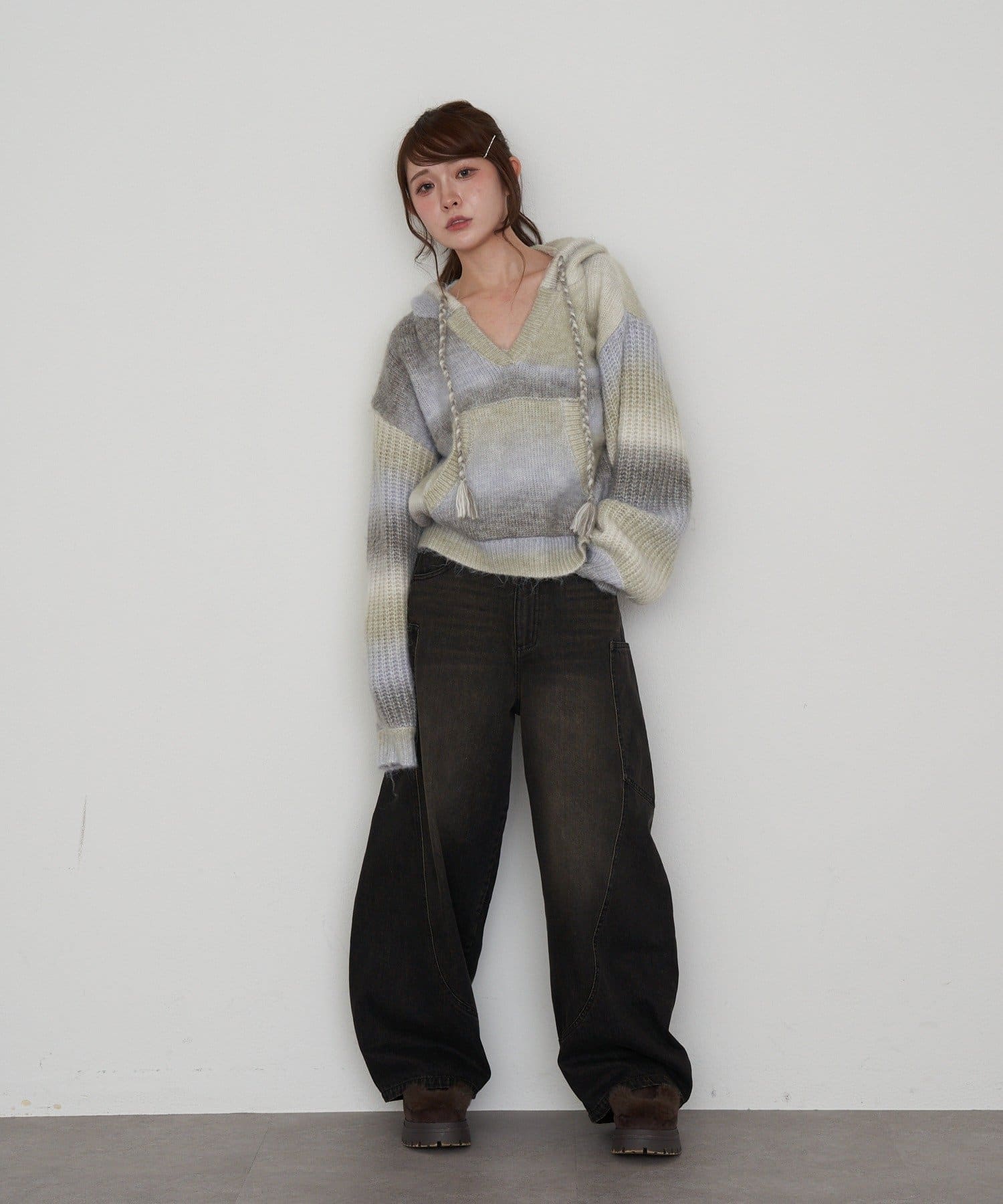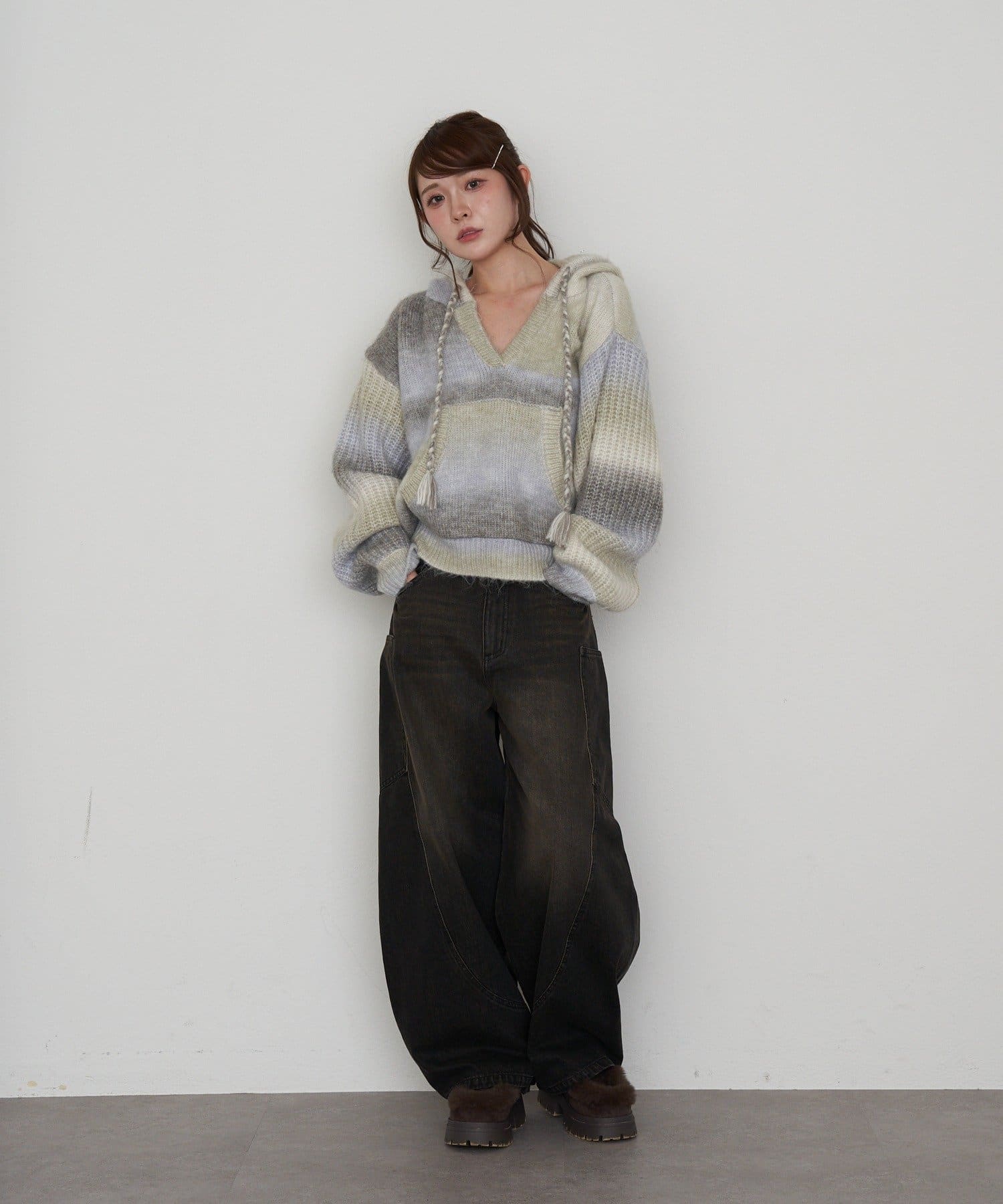 ・フード付きのニットが、マンネリ化しがちな冬コーデに新鮮さを与えてくれます。