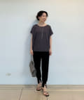 シンプルなTシャツに合わせてもカジュアル過ぎず、大人な雰囲気に。フェミニンなブラウスで女性らしさも演出できます。
