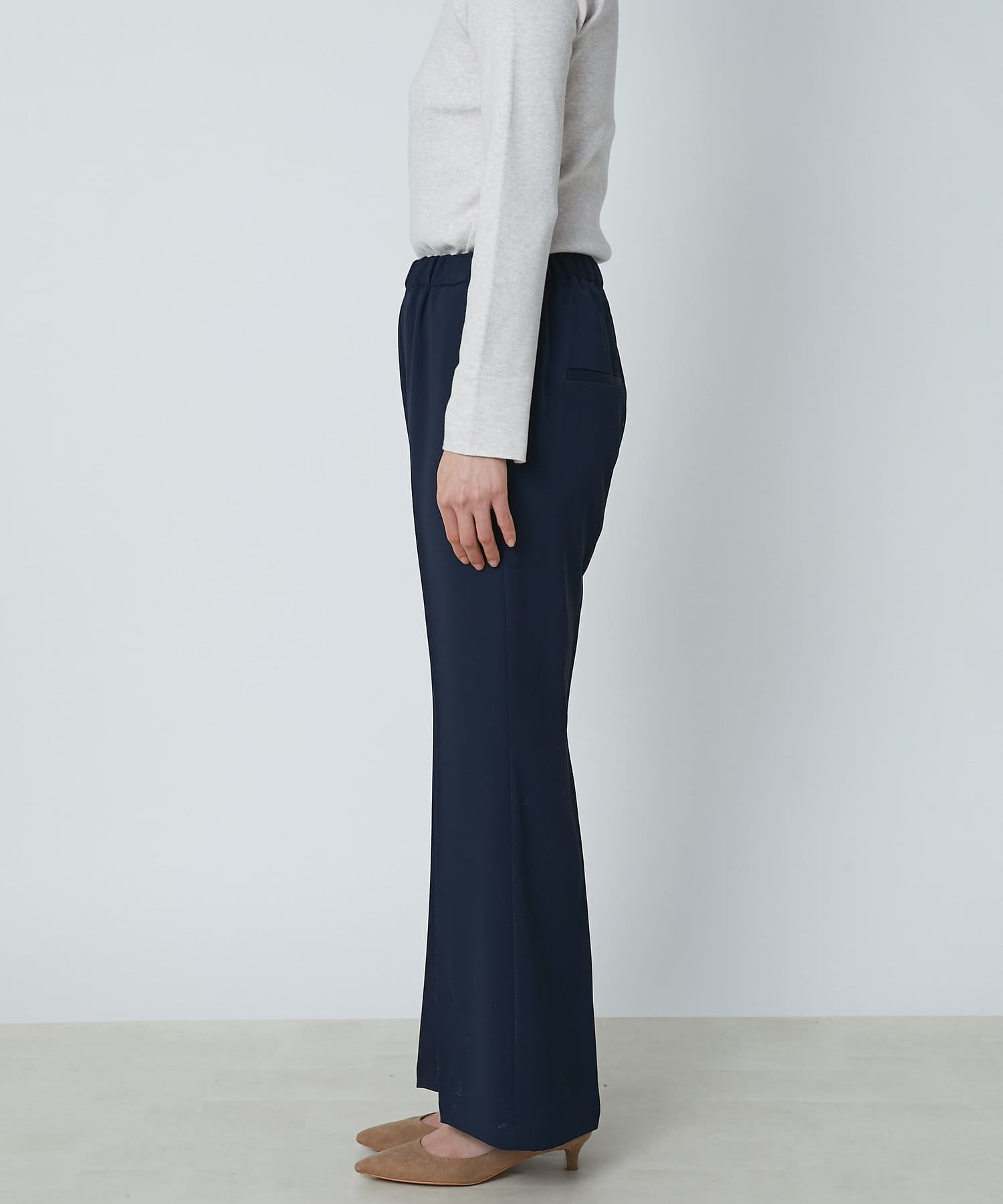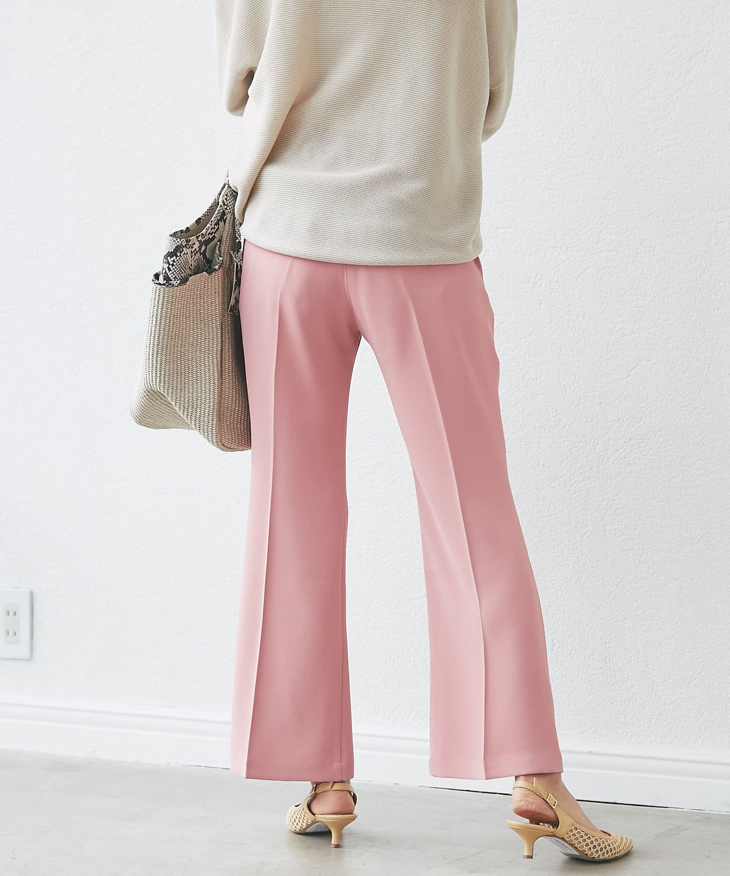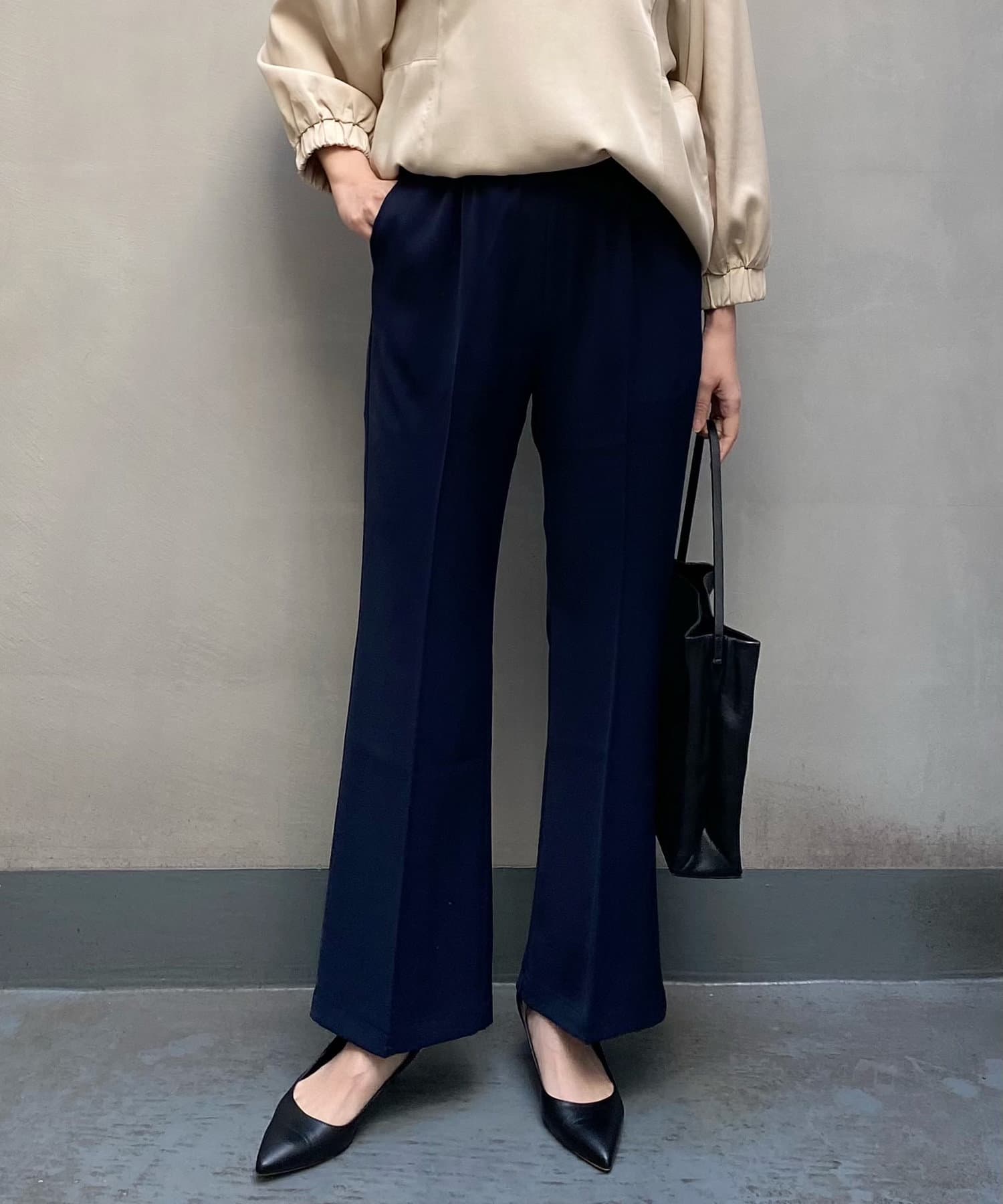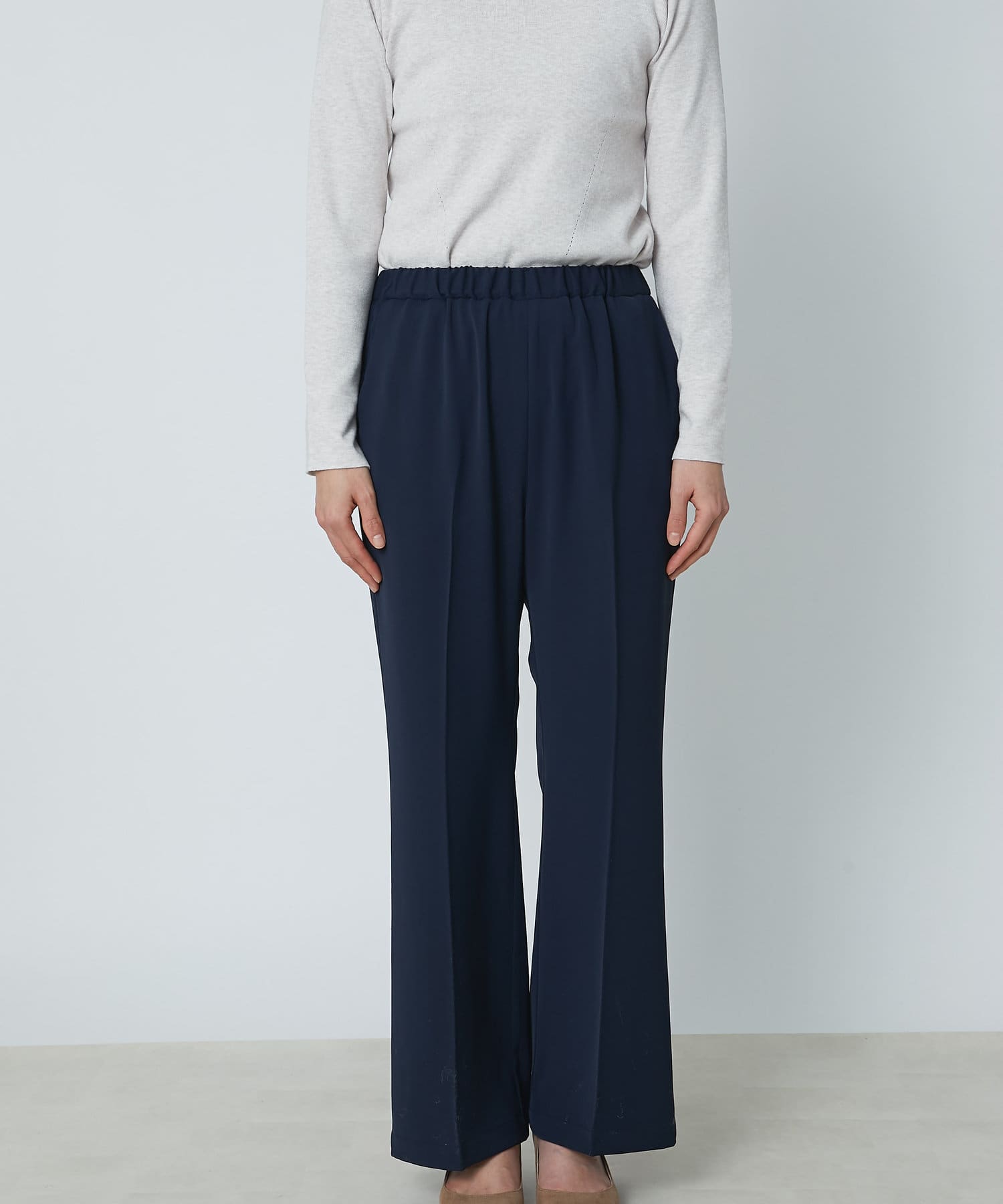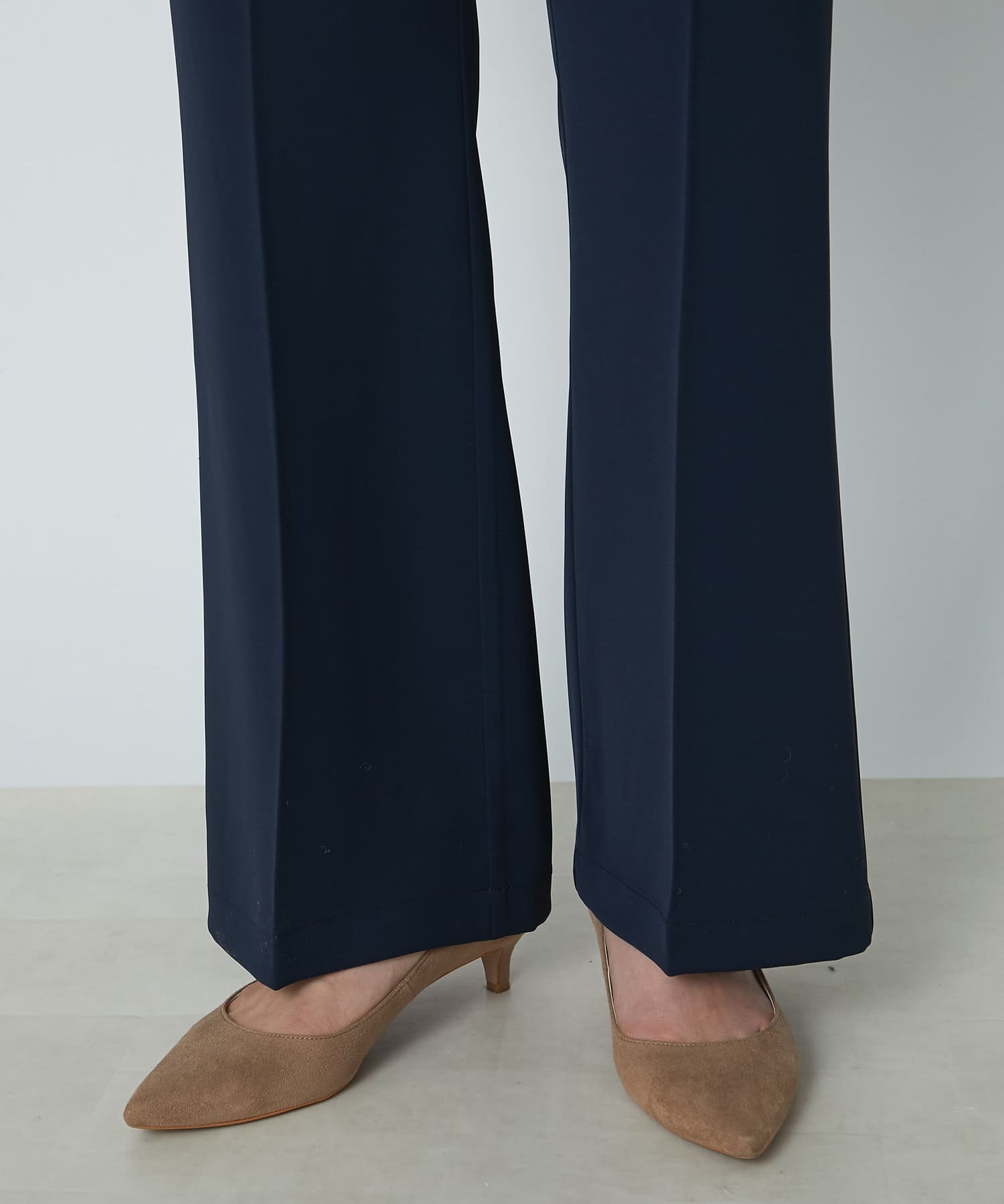弾力と落ち感のあるポリエステル素材はすっきり見えて着心地もよくおすすめです◎センタープレスがスタイルUP効果をプラスしてくれます。裾に向かって広がっていくシルエットで美脚効果とトレンドを演出。