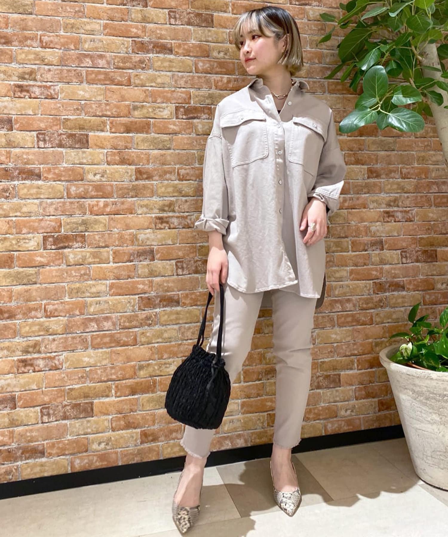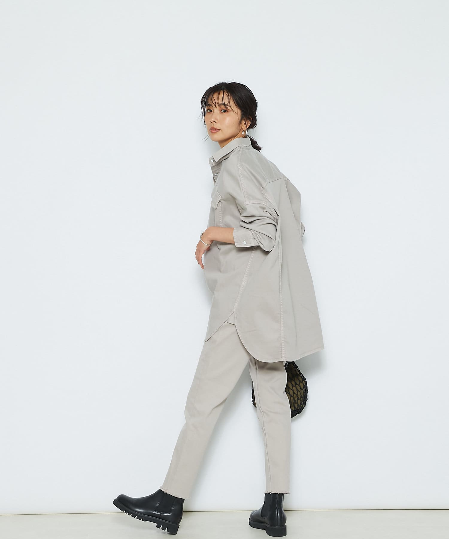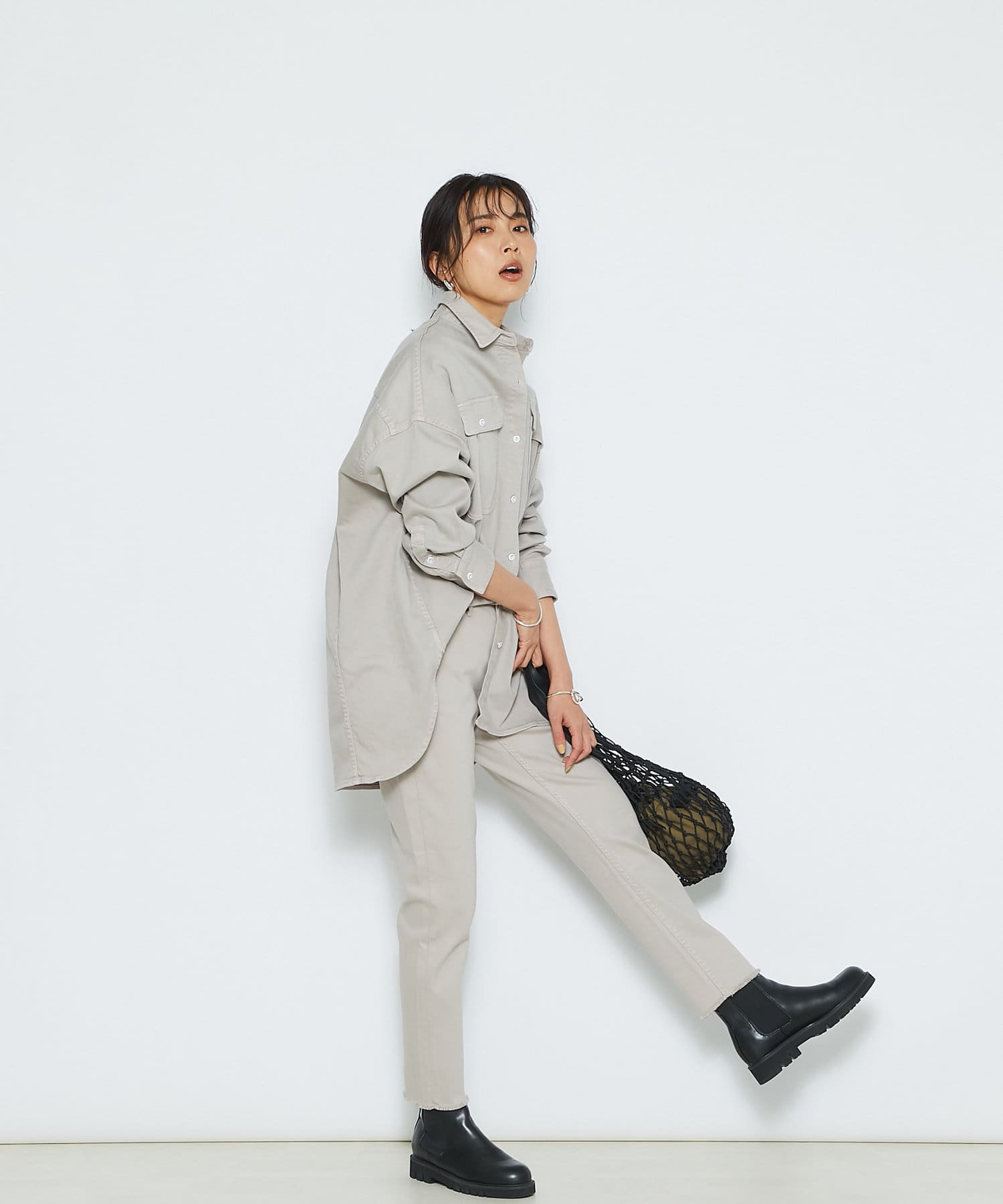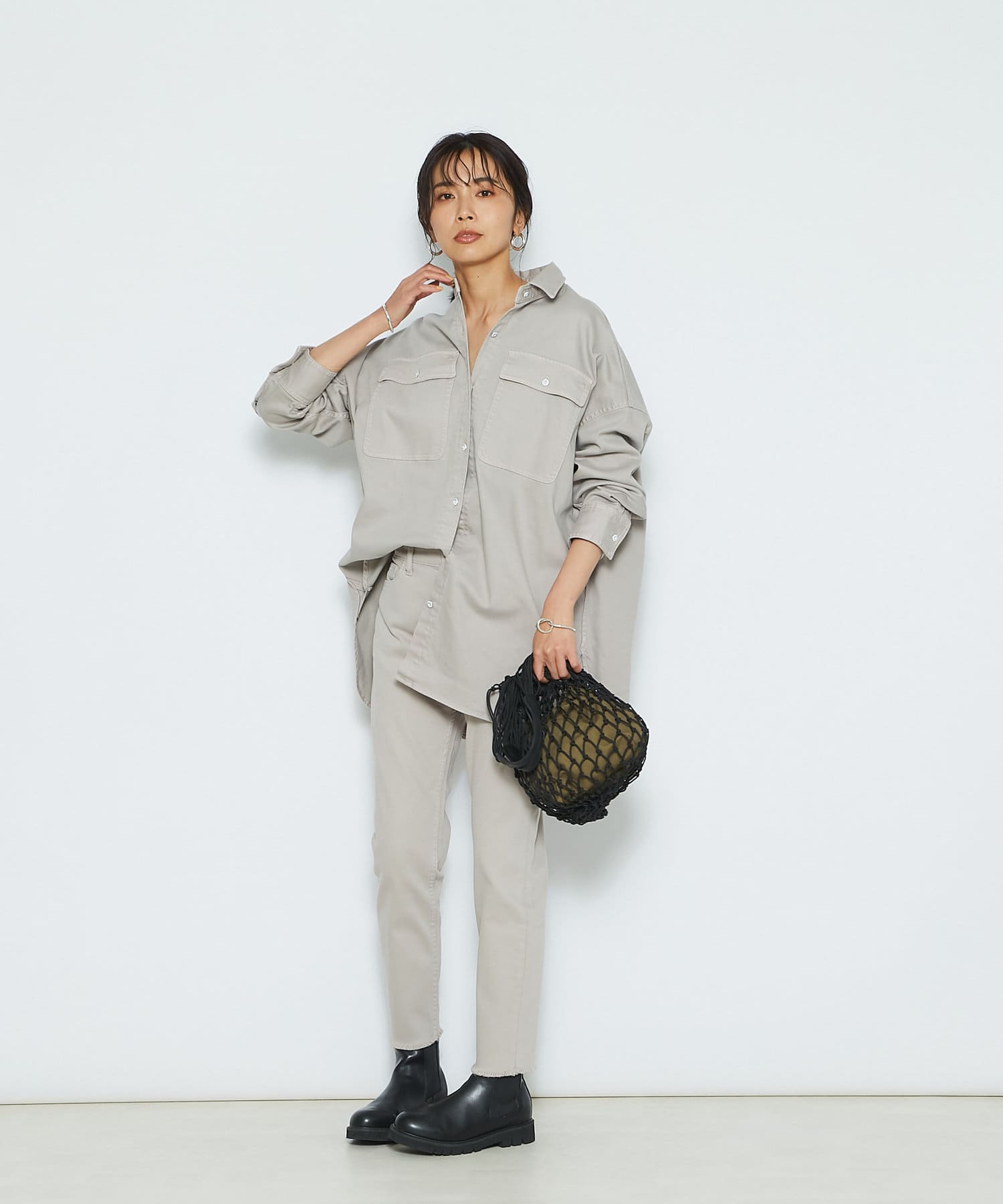 また前裾を片方ボトムにタックインして着ることで、トレンドライクな着こなしも叶います。