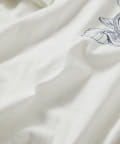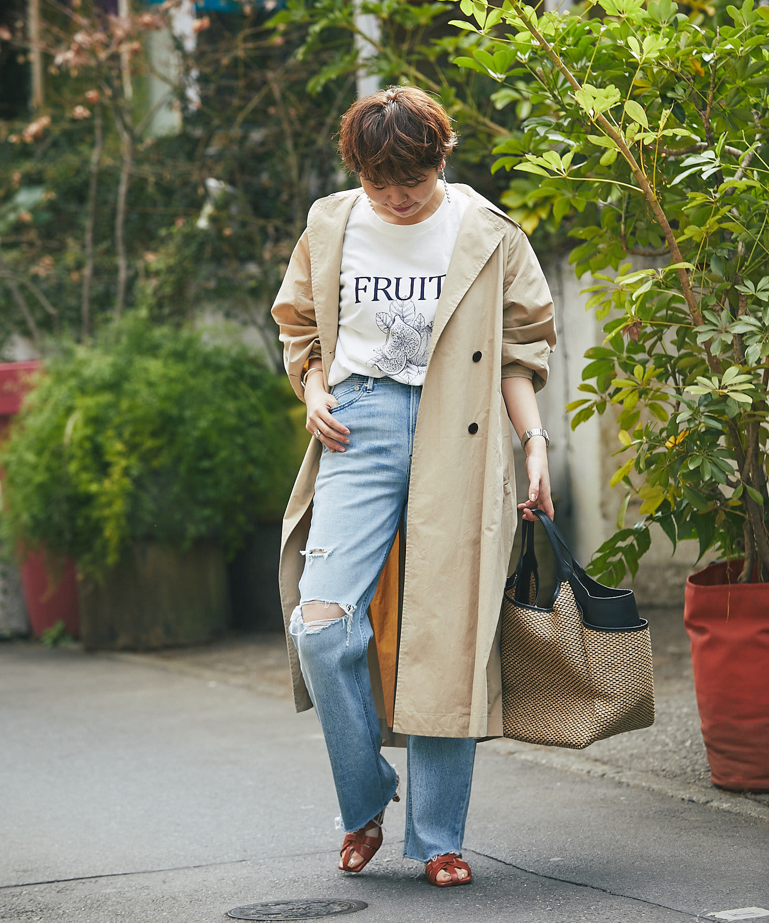 WEB限定の半袖Tシャツ。フルーツ柄でカジュアルなデザインですが、ネイビーにすることで大人な印象に。キレイめアイテムとの相性も良く、着回しが効く一枚です。