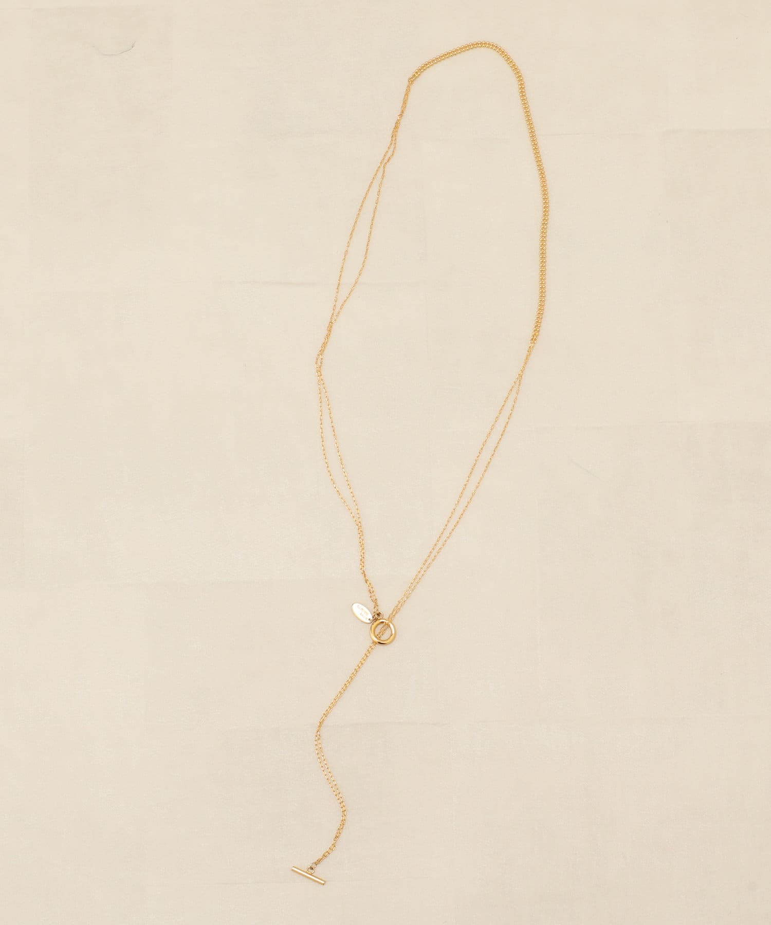 留め具部分はマンテルの仕様になっているので、留め具を前に持ってきて、スライドさせてアレンジいただくのもおすすめです。シンプルなコーデこそ、ネックレスでコーディネートをアップデート。カジュアルなアイテムとも相性◎