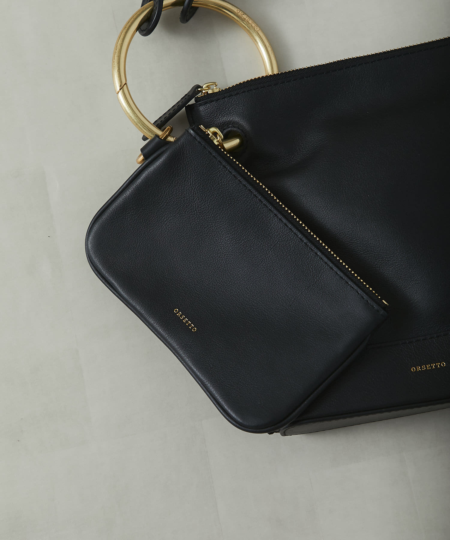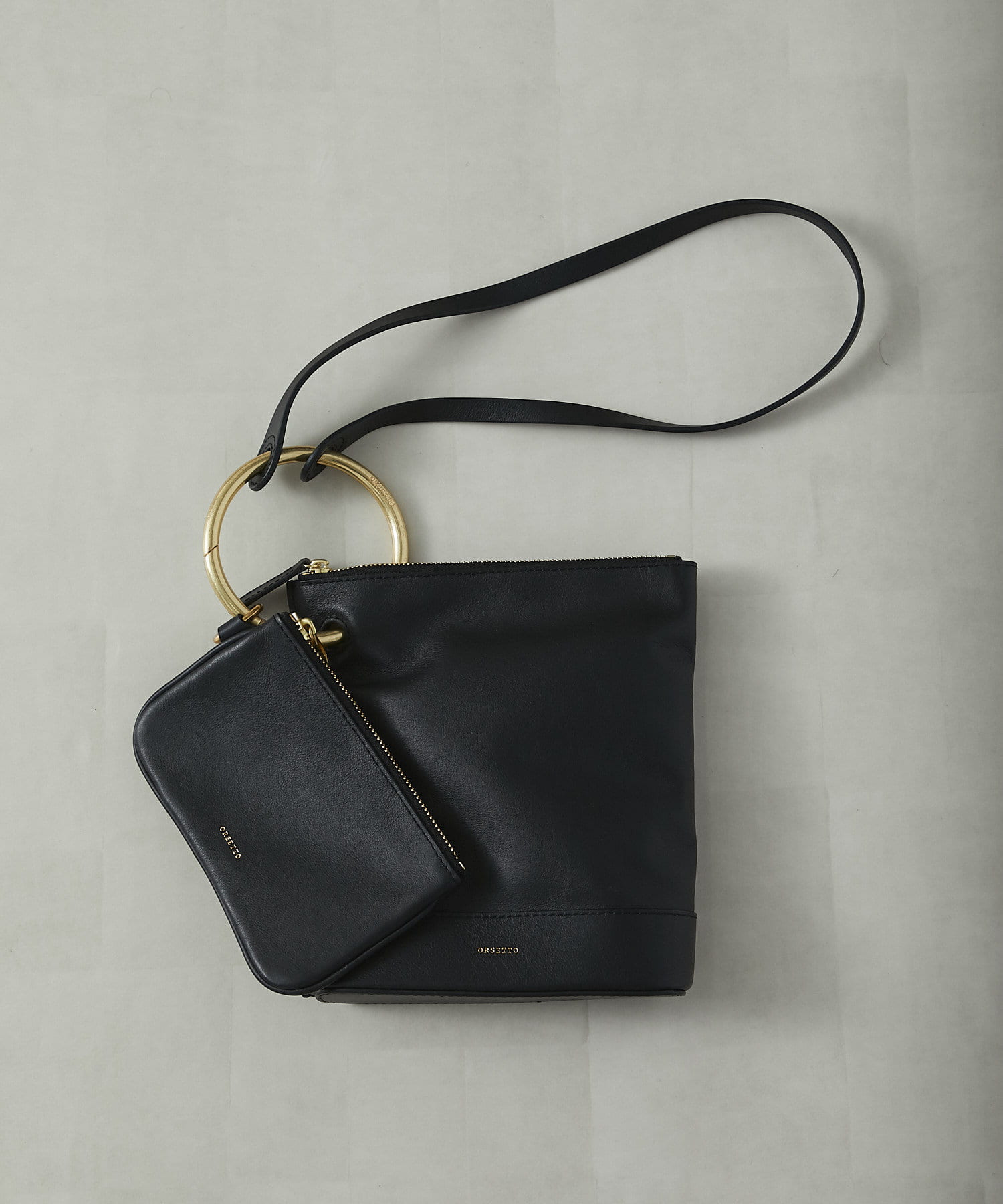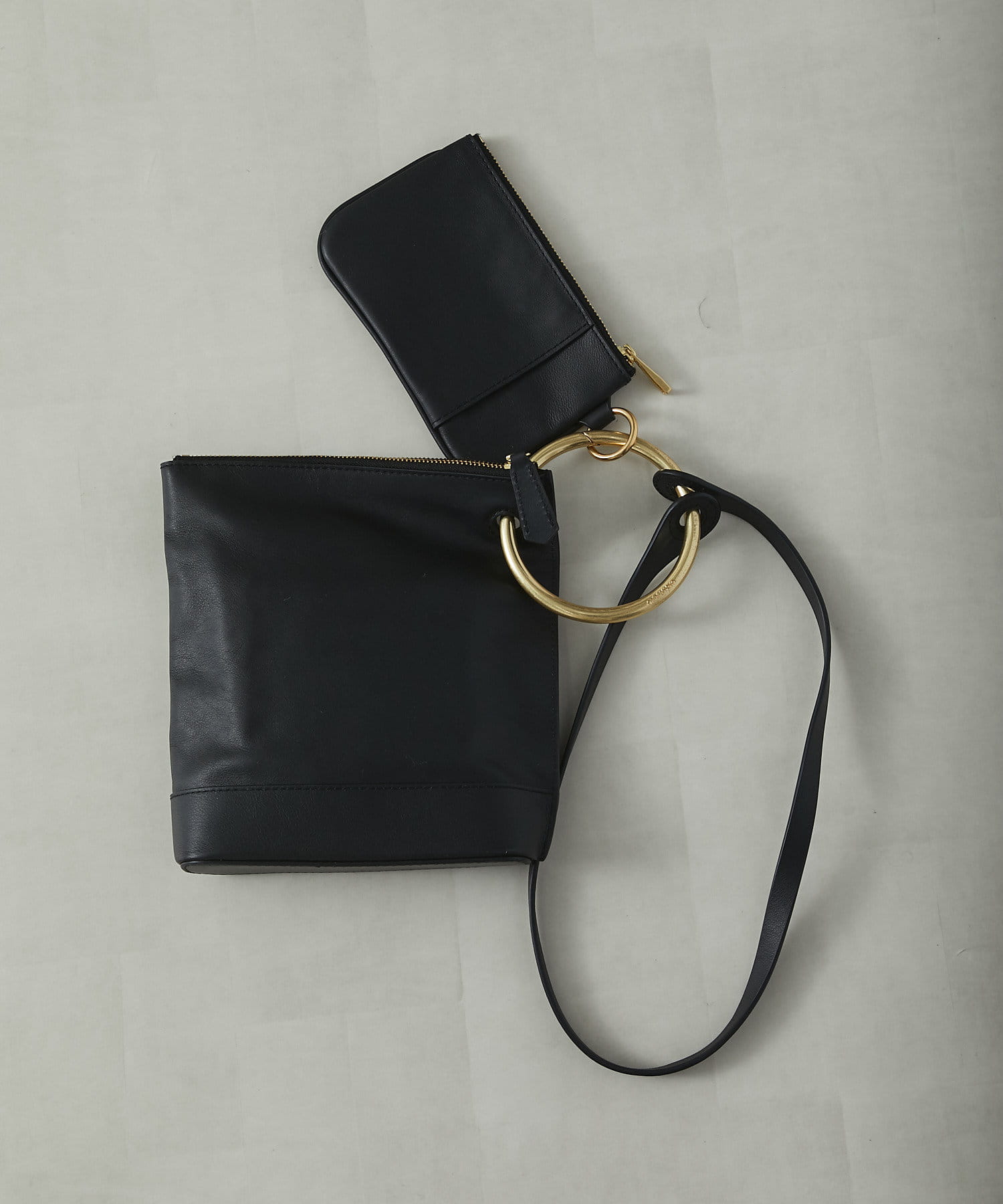上質なレザーで作られた、大小ふたつのポーチとショルダーをセットにしたワンハンドルバッグ。