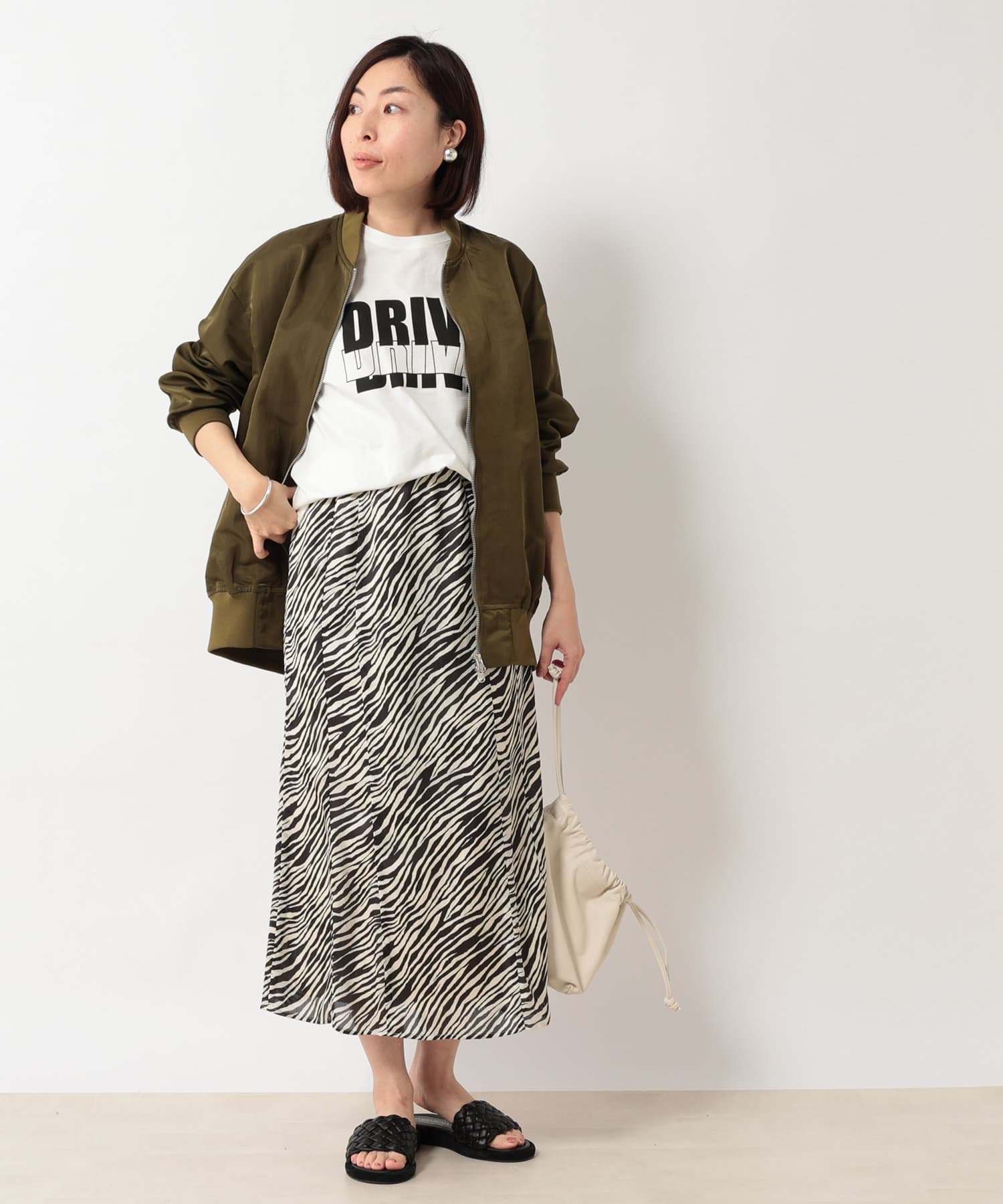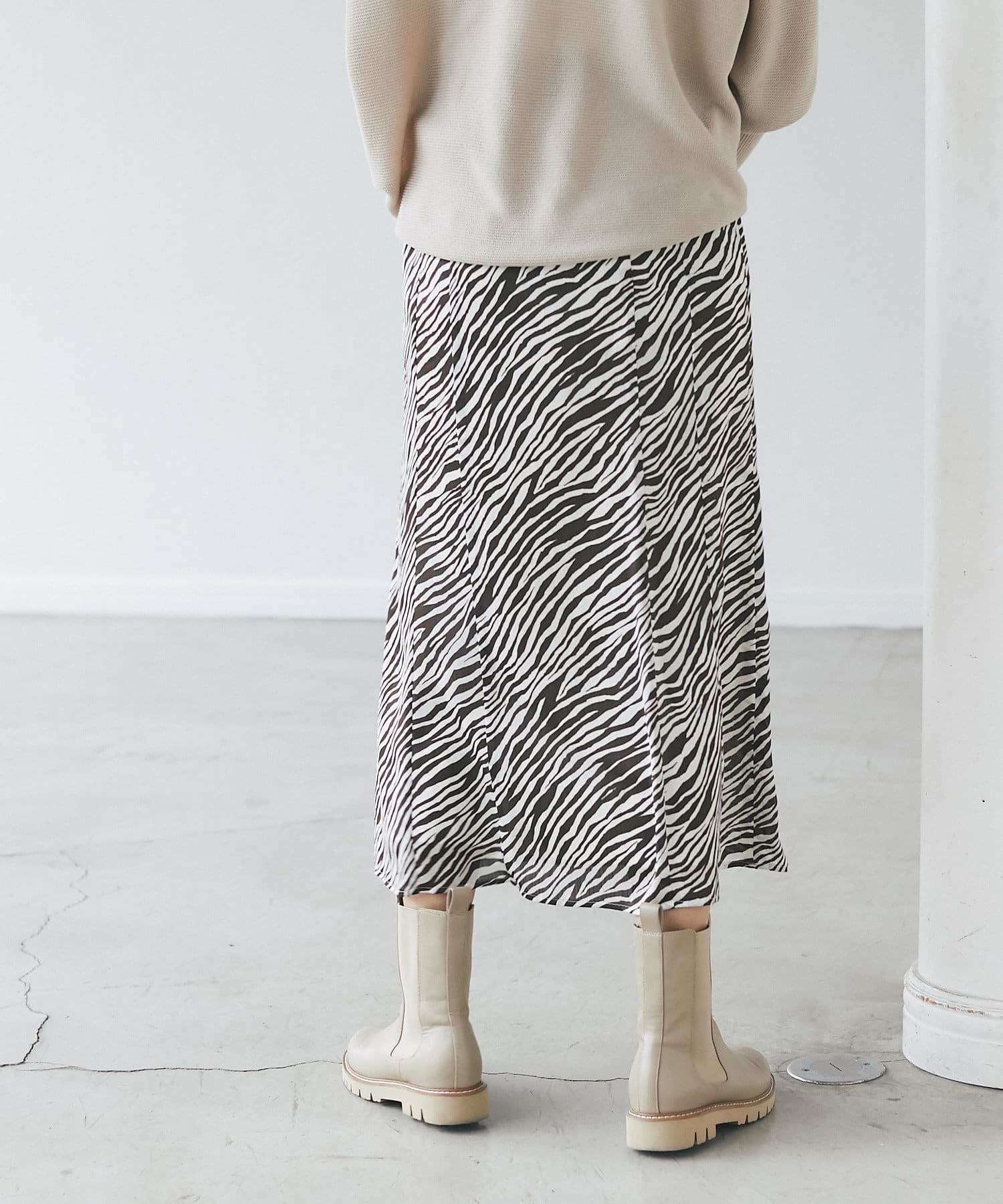 コーディネートに映えること間違いなしのゼブラ柄スカート。タイトながら動きのあるシルエットで長すぎない丈感のため、移動の多い日も気負わずにおしゃれを楽しめます。柄の程よい大きさもコーデにとりいれやすく、また鋭く見えがちなゼブラ柄を透け感のあるサテン楊柳にプリントすることで繊細な印象にしています。