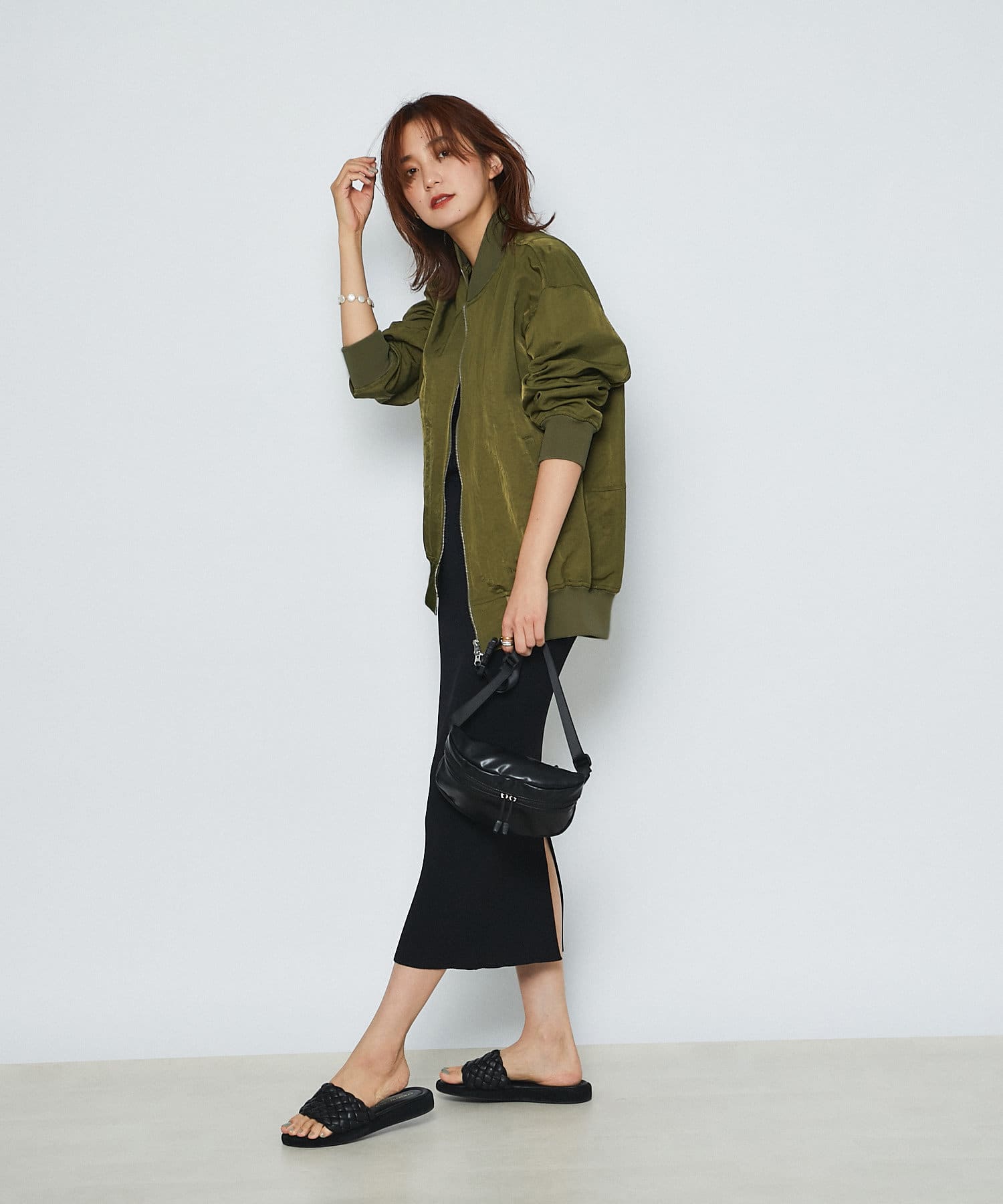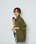 ミリタリーアイテムらしい本格的なディテールは残しながらも、腰まわりが隠れる長めの着丈で旬のムードに。カラーも落ち着いたカーキで、品のある雰囲気に♪