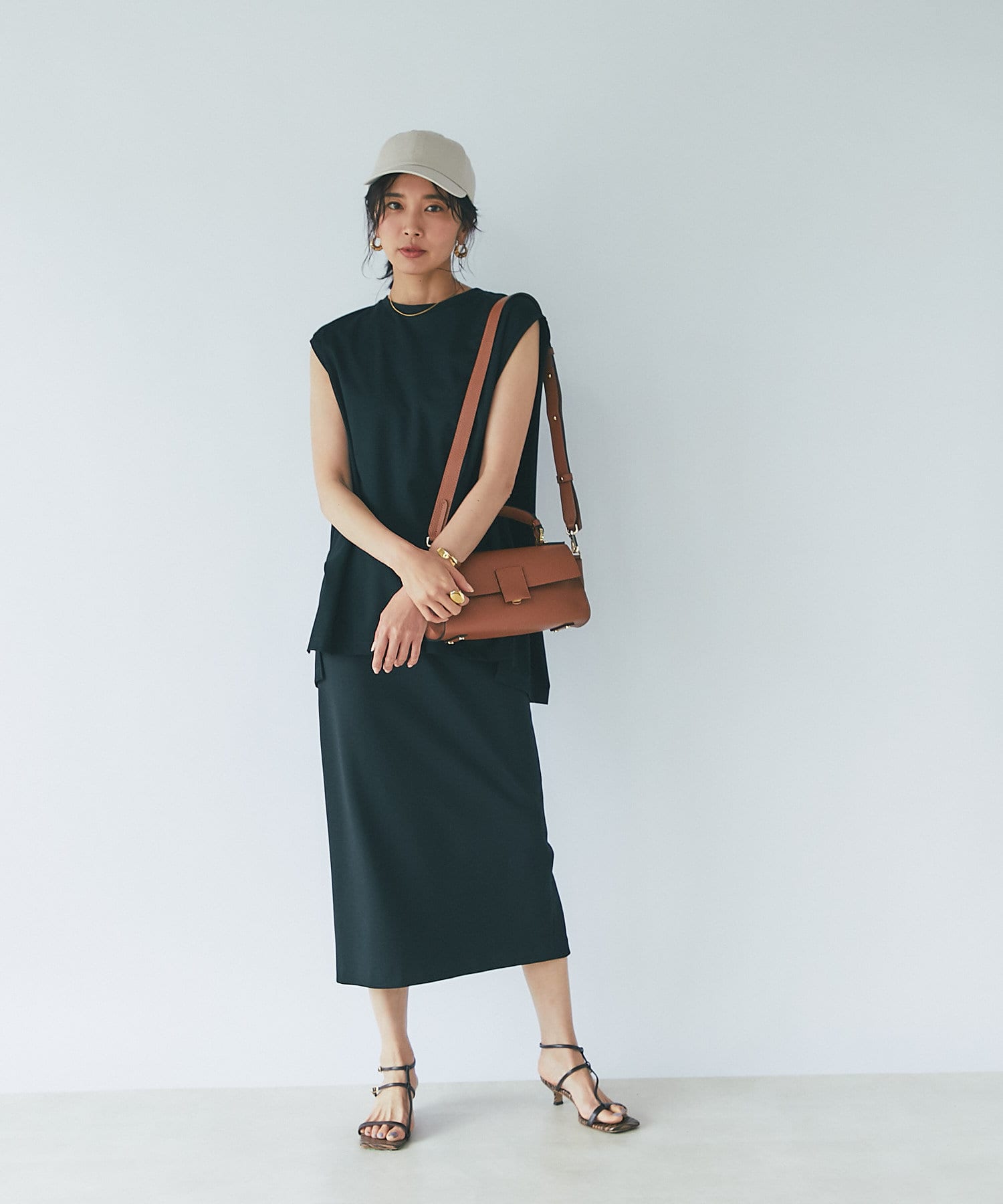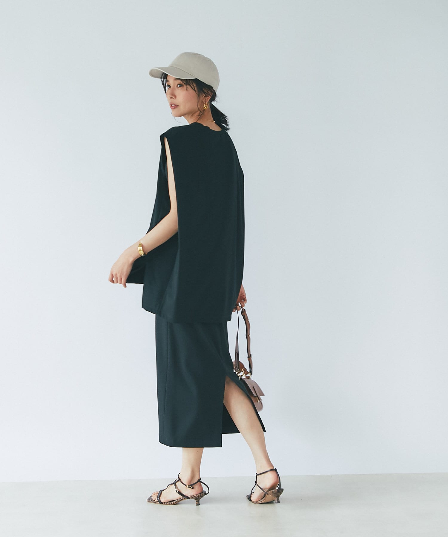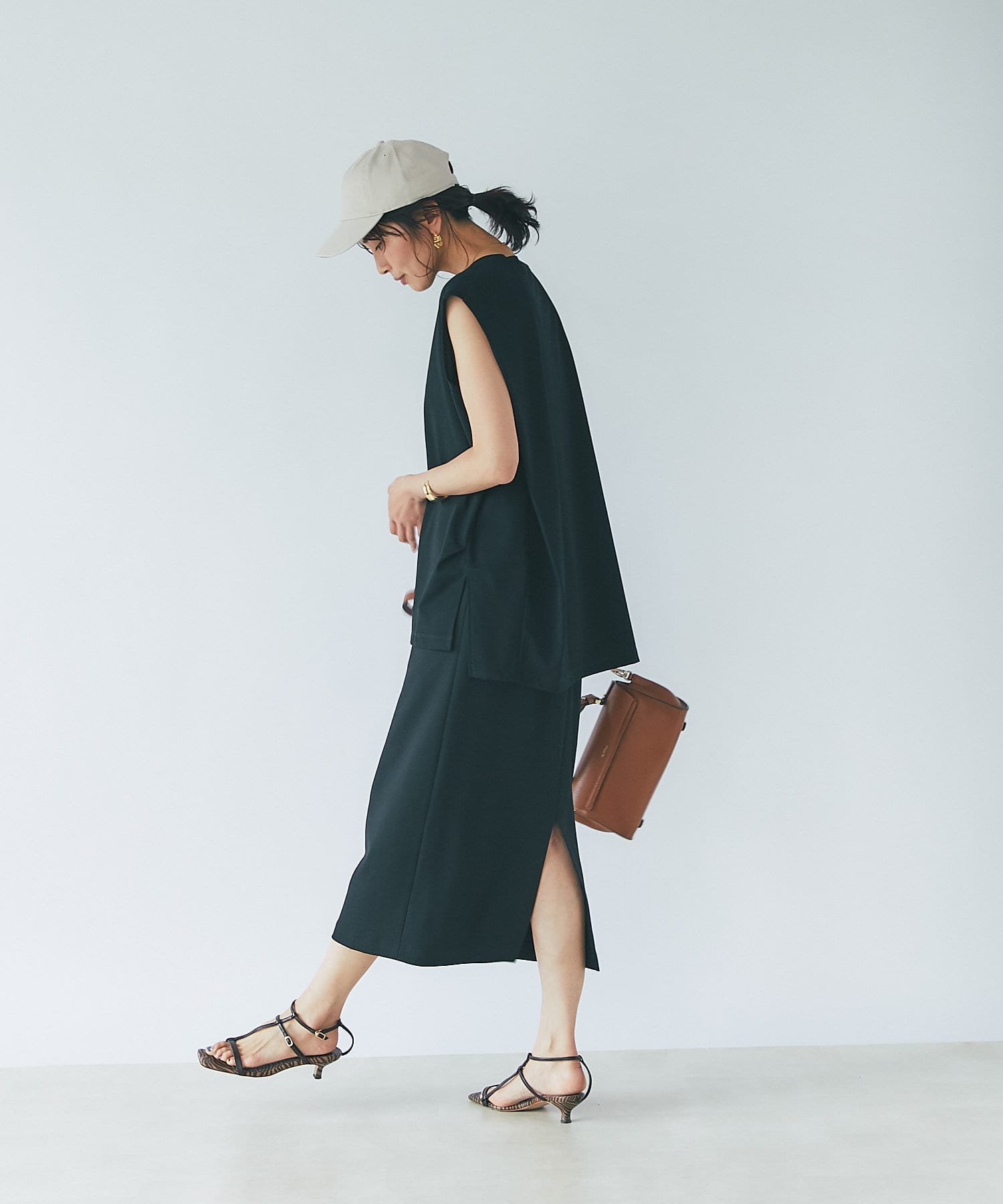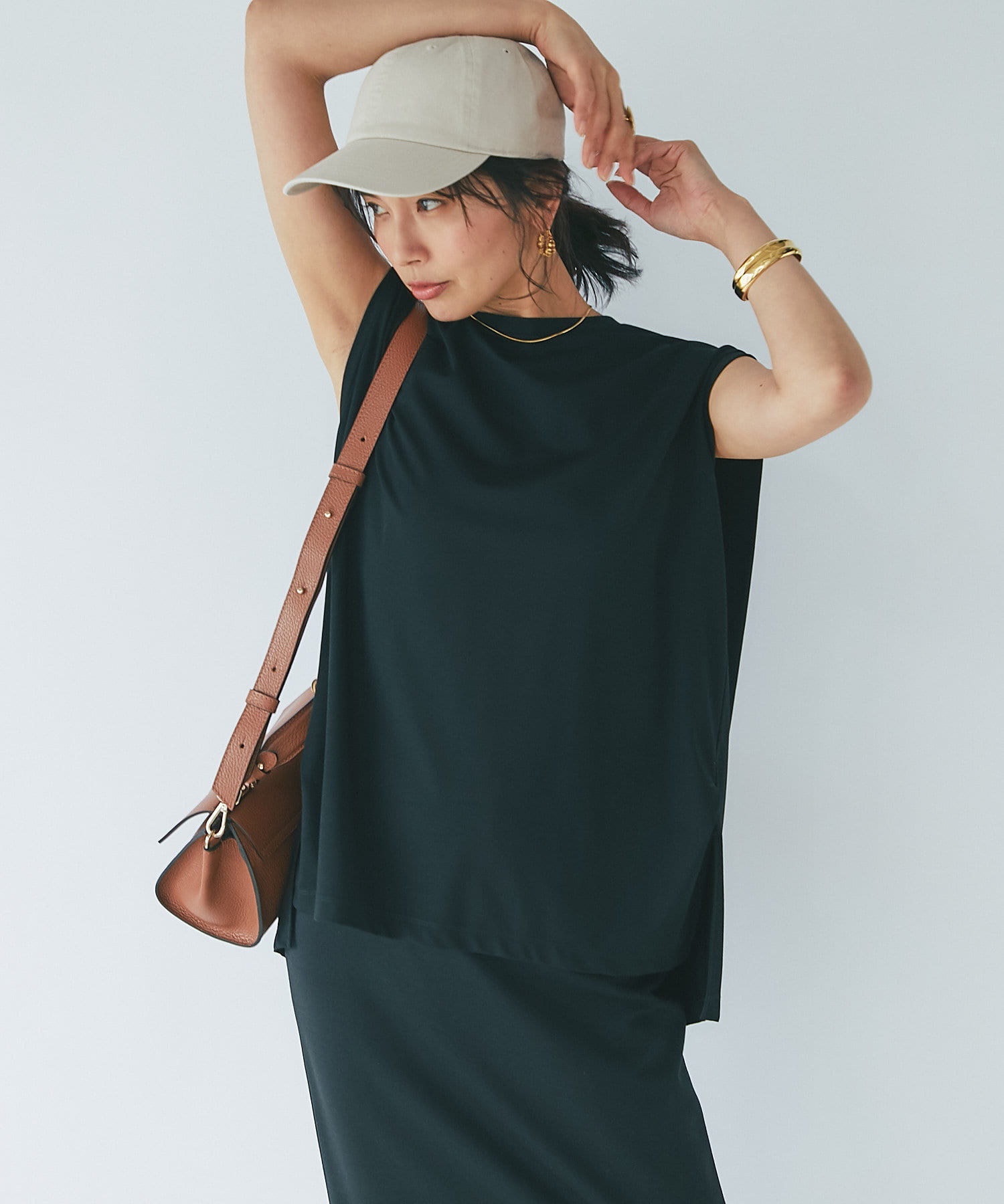 ノースリーブながらカジュアルになり過ぎず1枚でシンプルに着ても決まります。