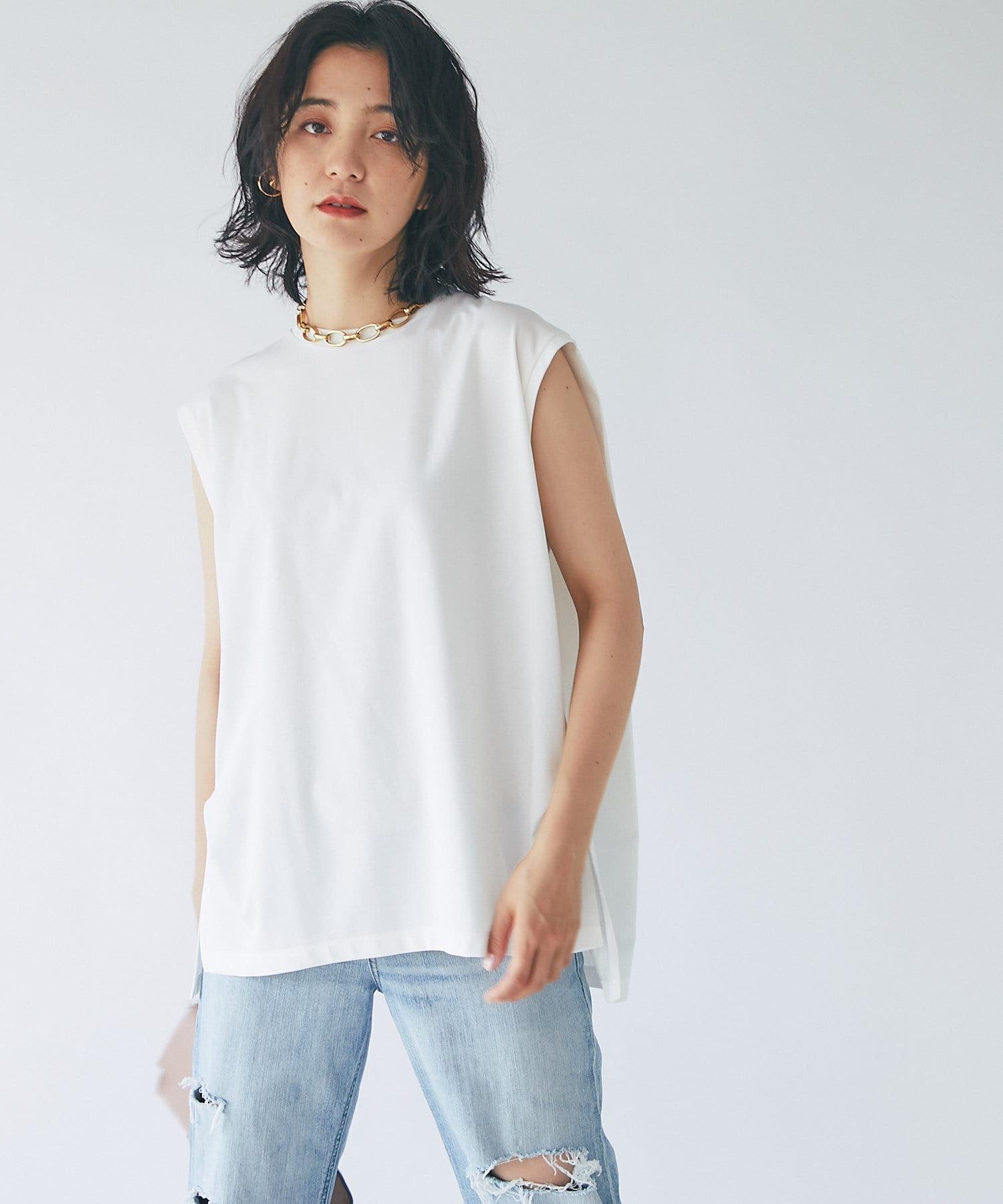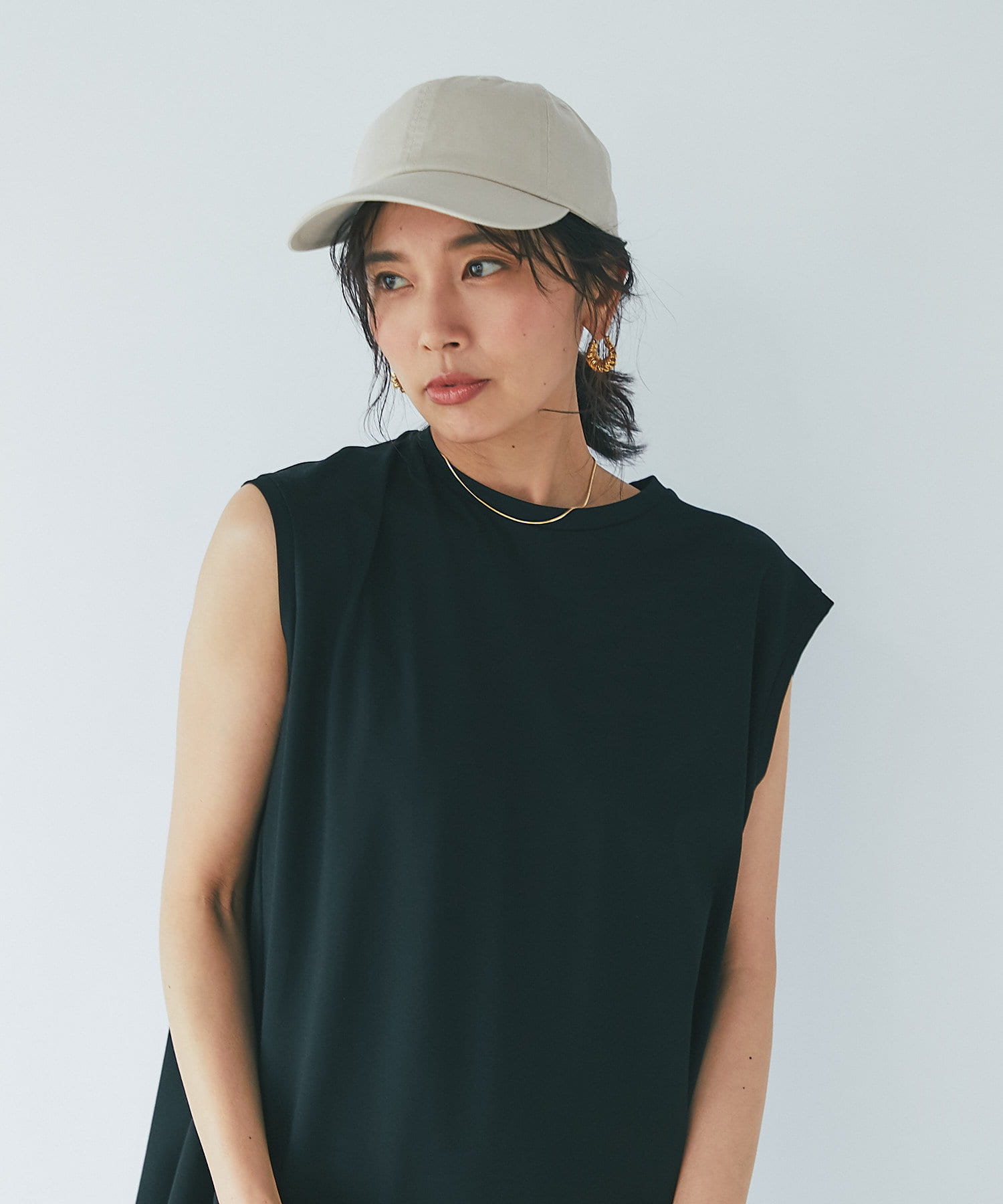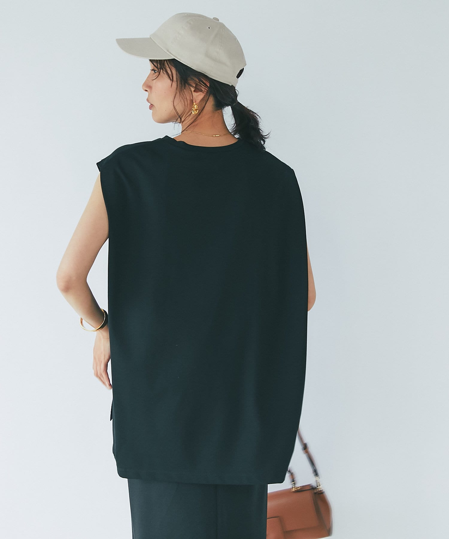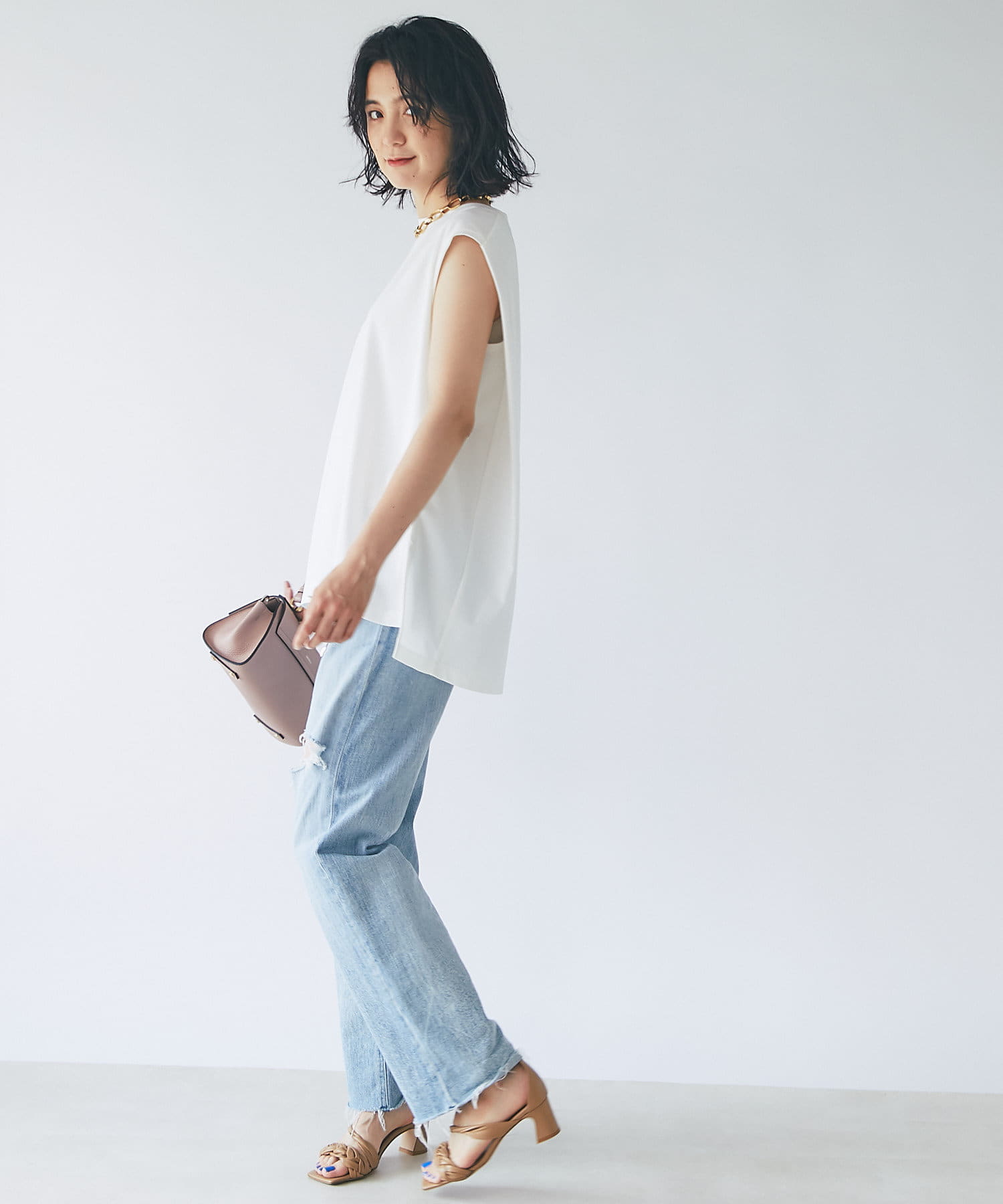 ノースリーブながらカジュアルになり過ぎず1枚でシンプルに着ても決まります。