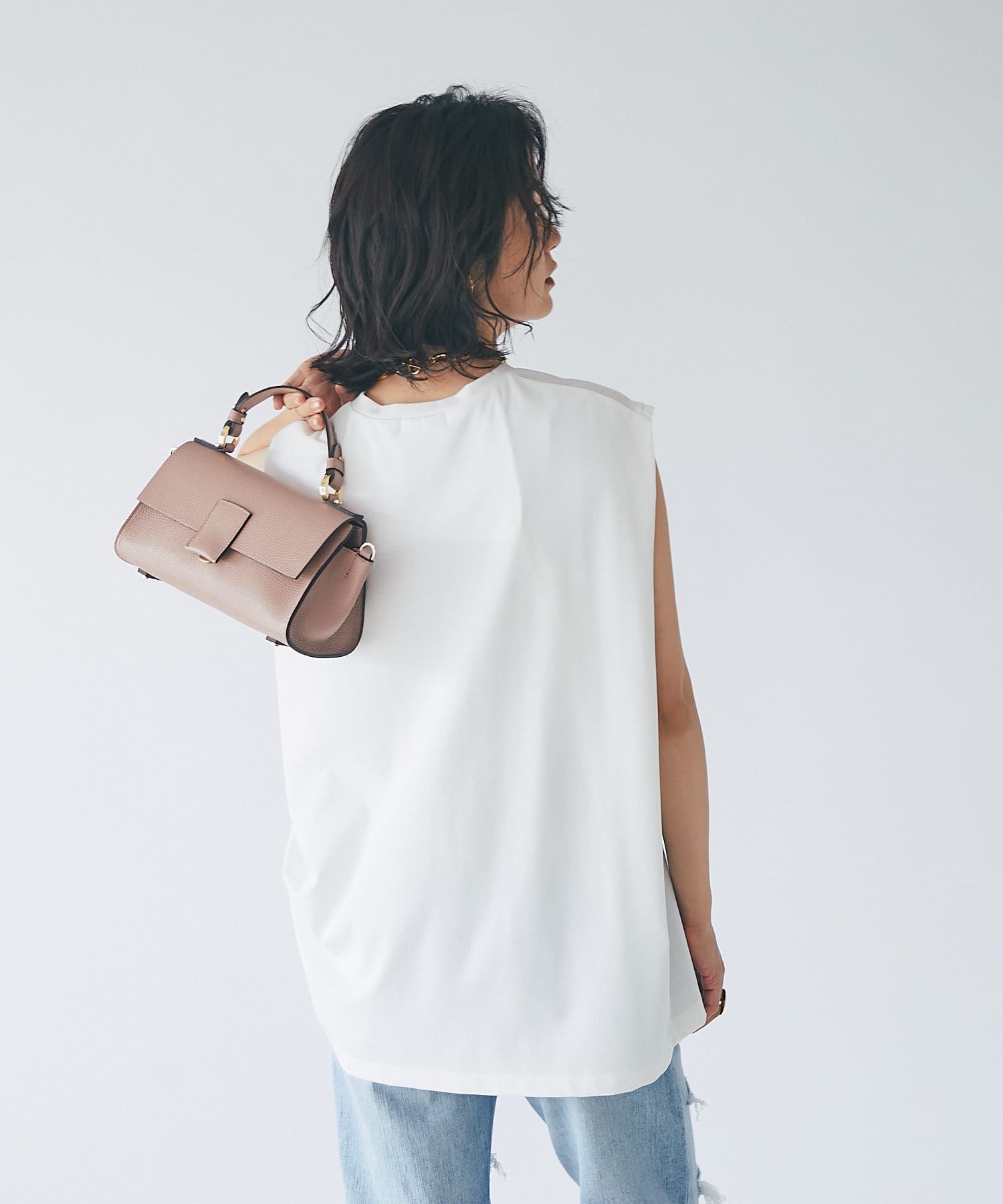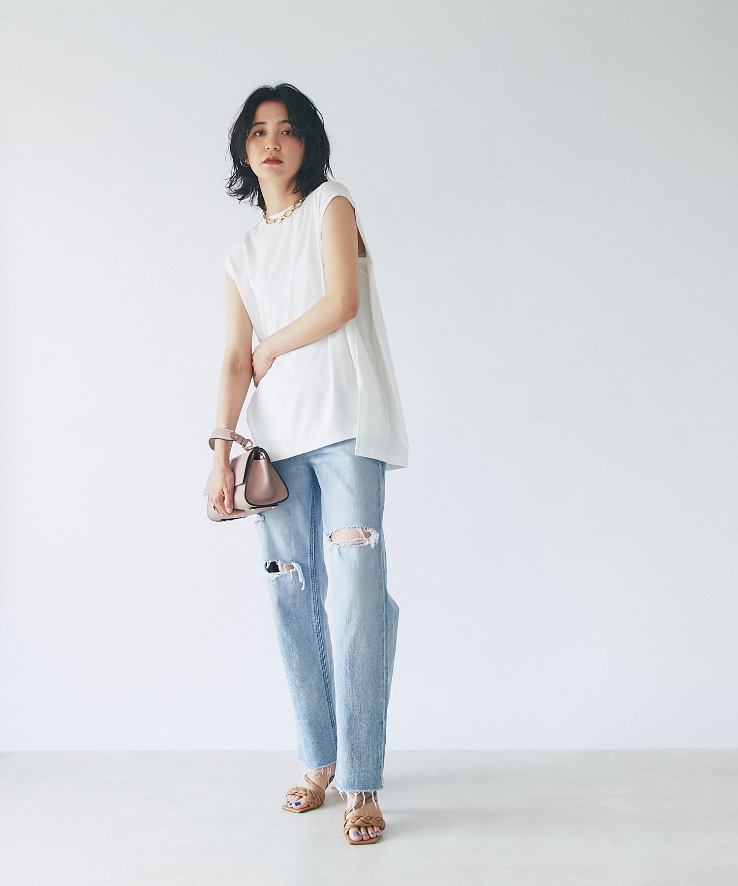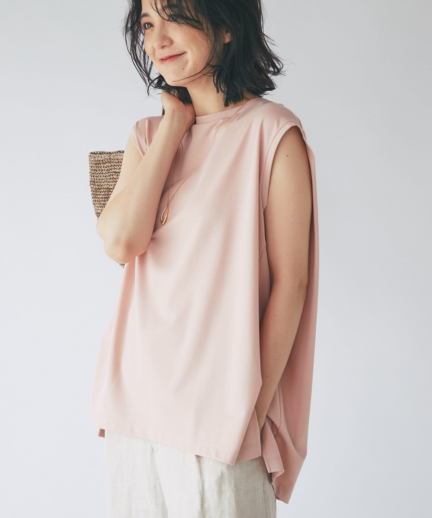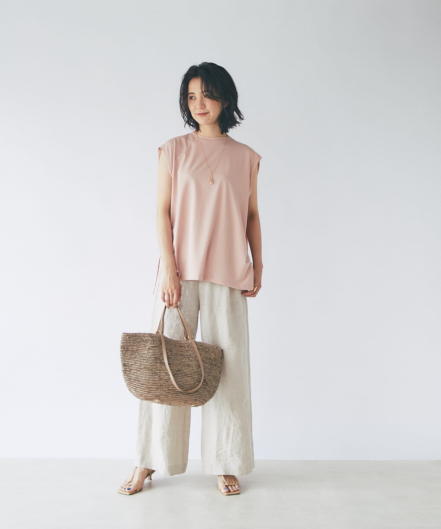 ノースリーブながらカジュアルになり過ぎず1枚でシンプルに着ても決まります。