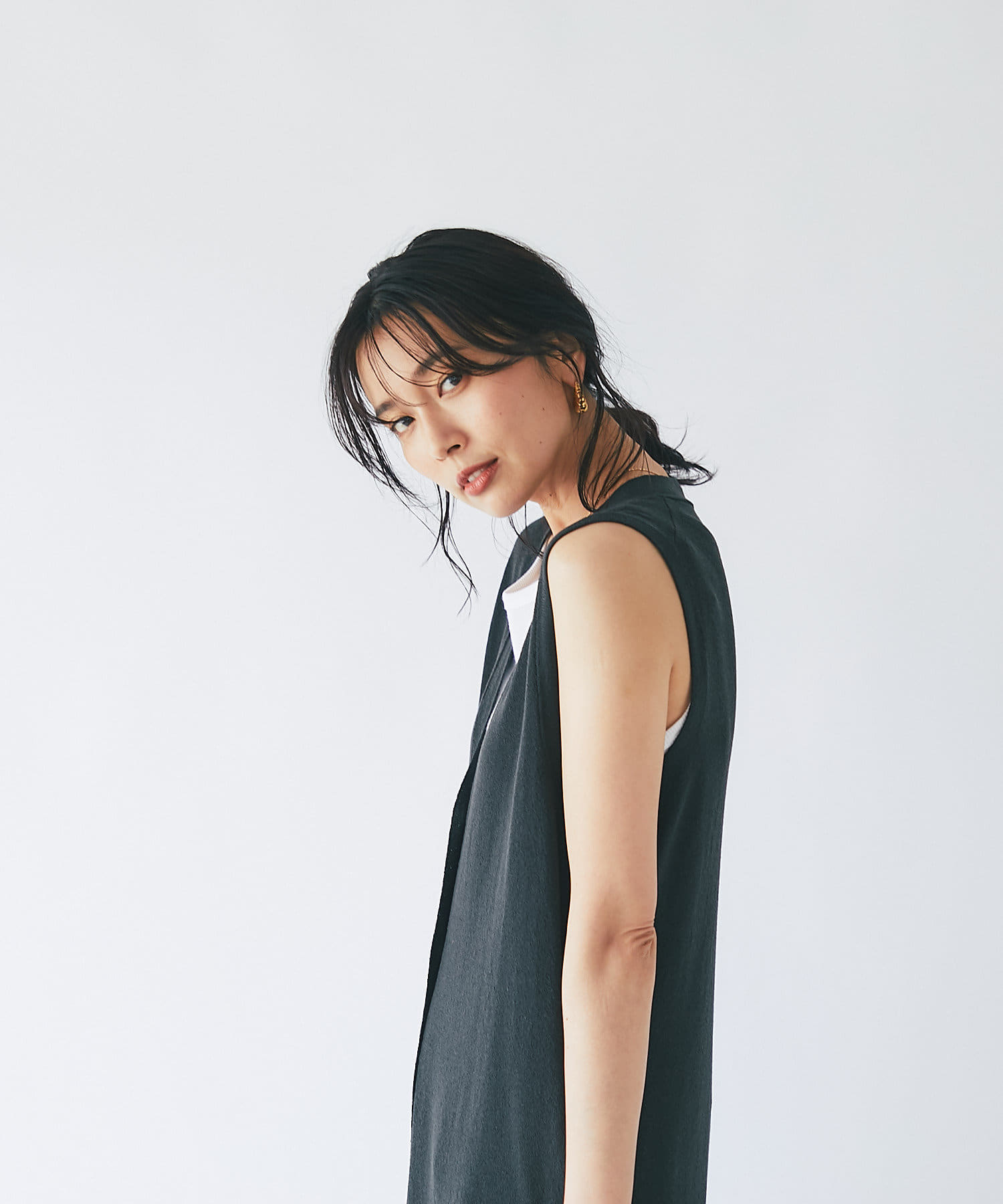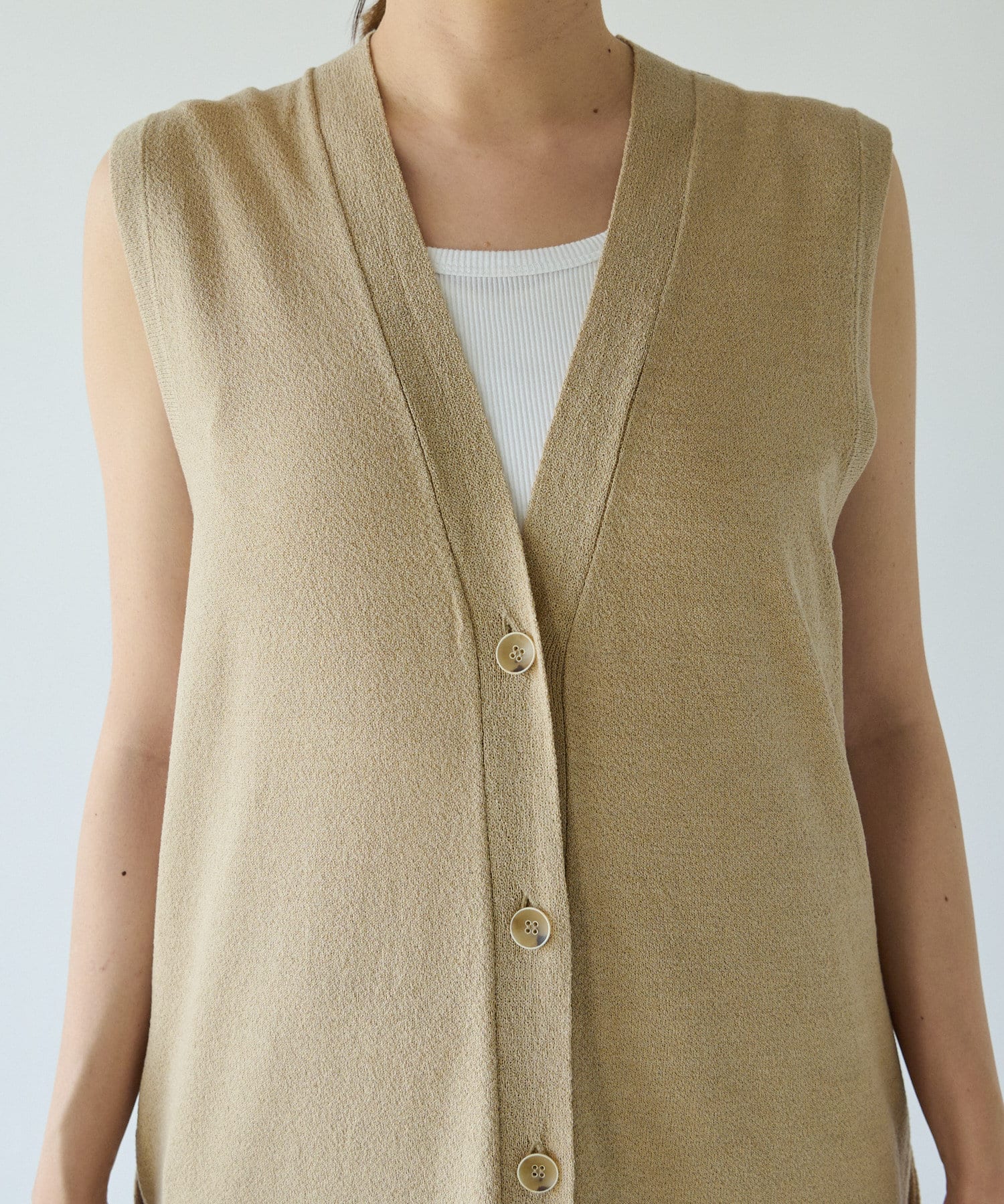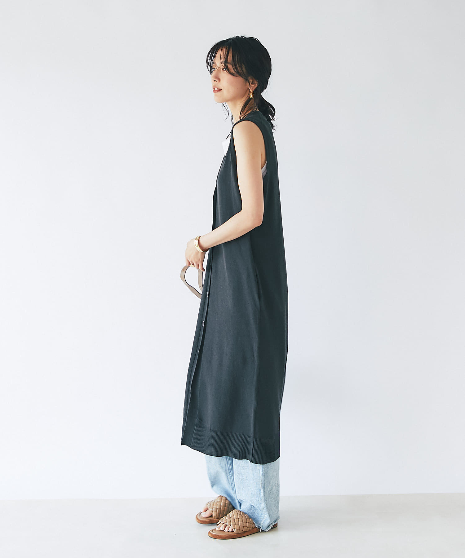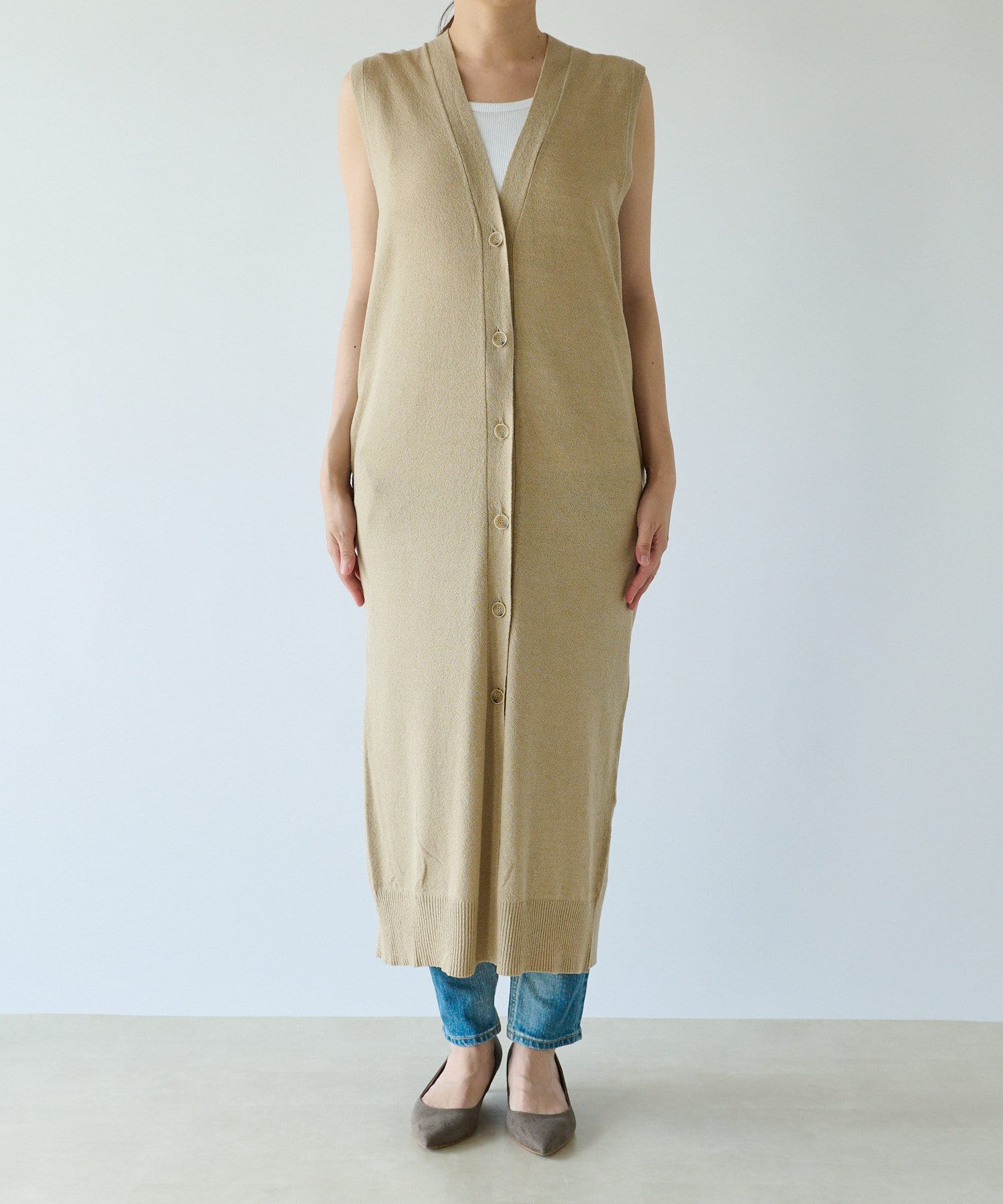 Vネックですっきり見えするロングジレ