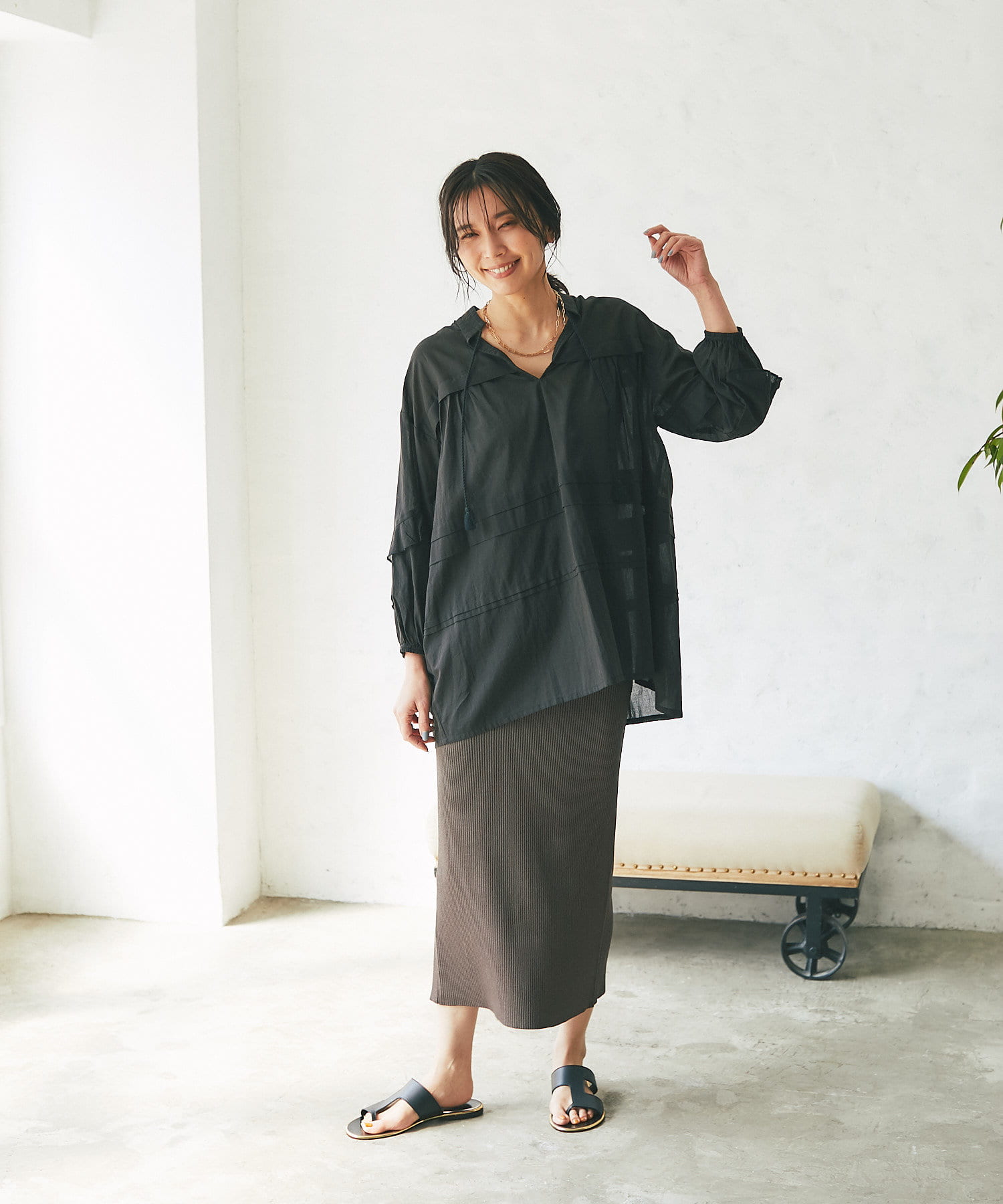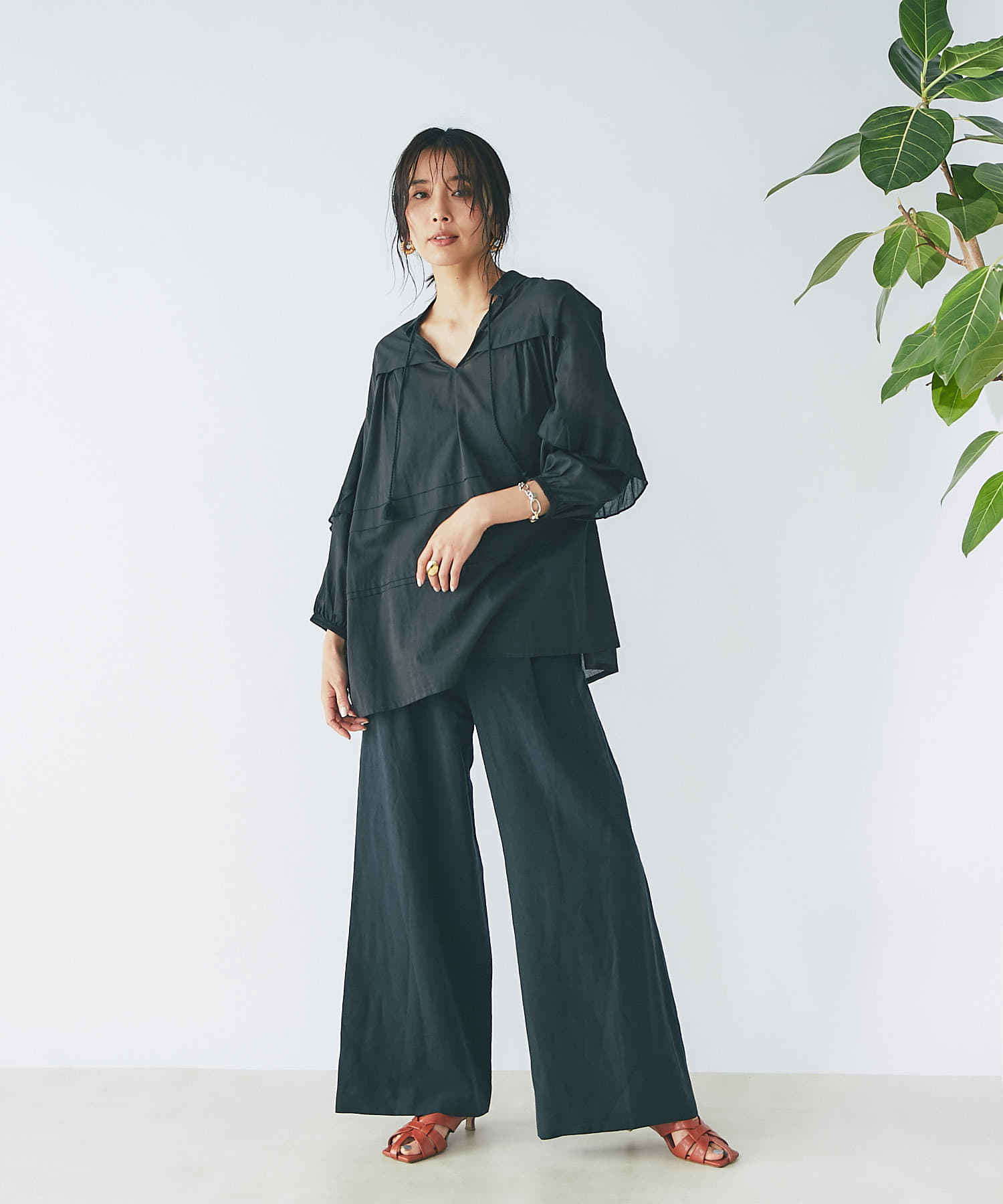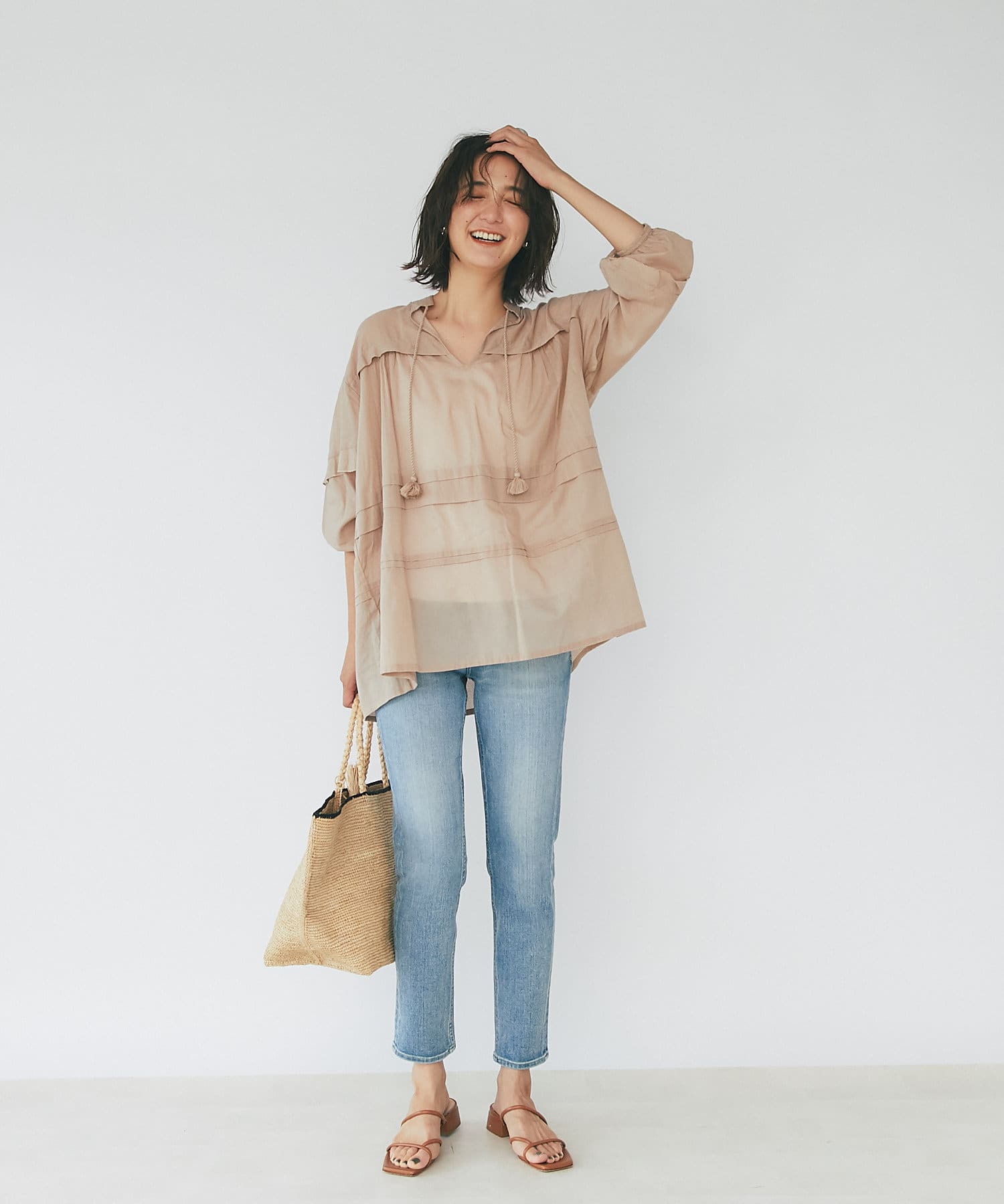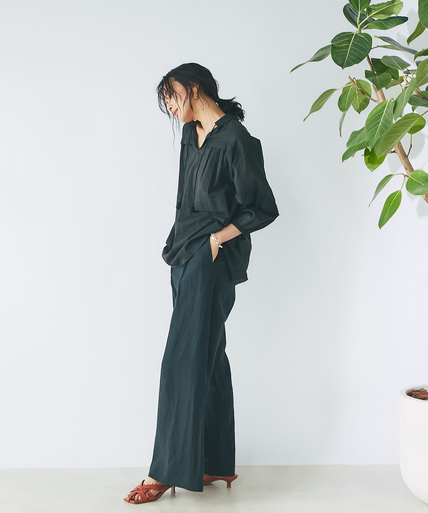 ブラウスを主役にできる細身のパンツとの合わればバランス良く着ていただけます。