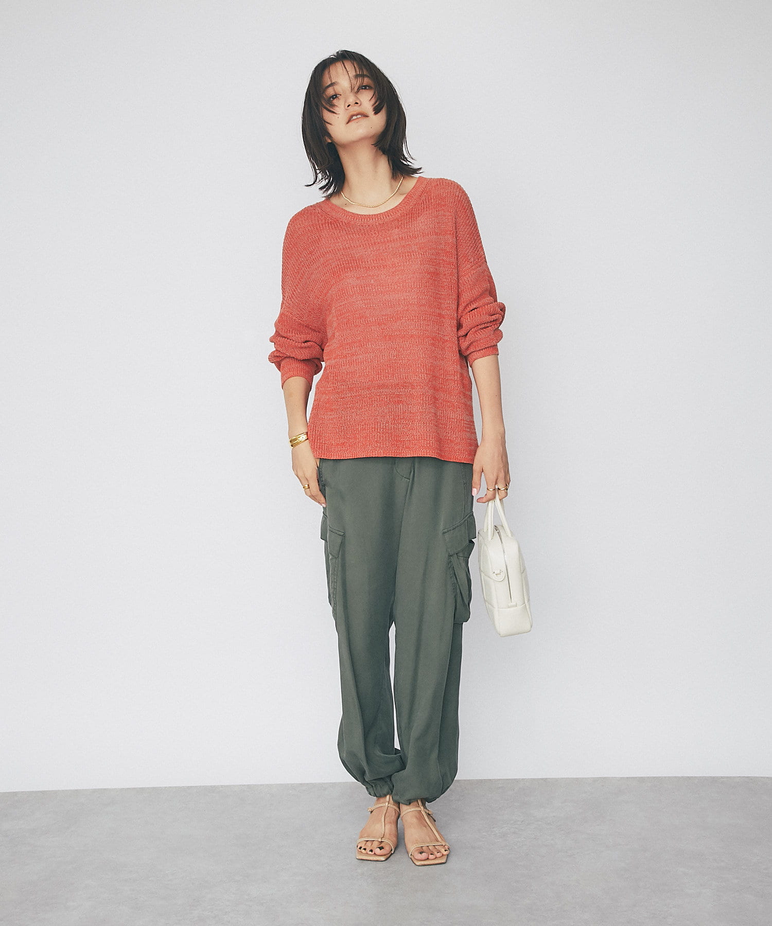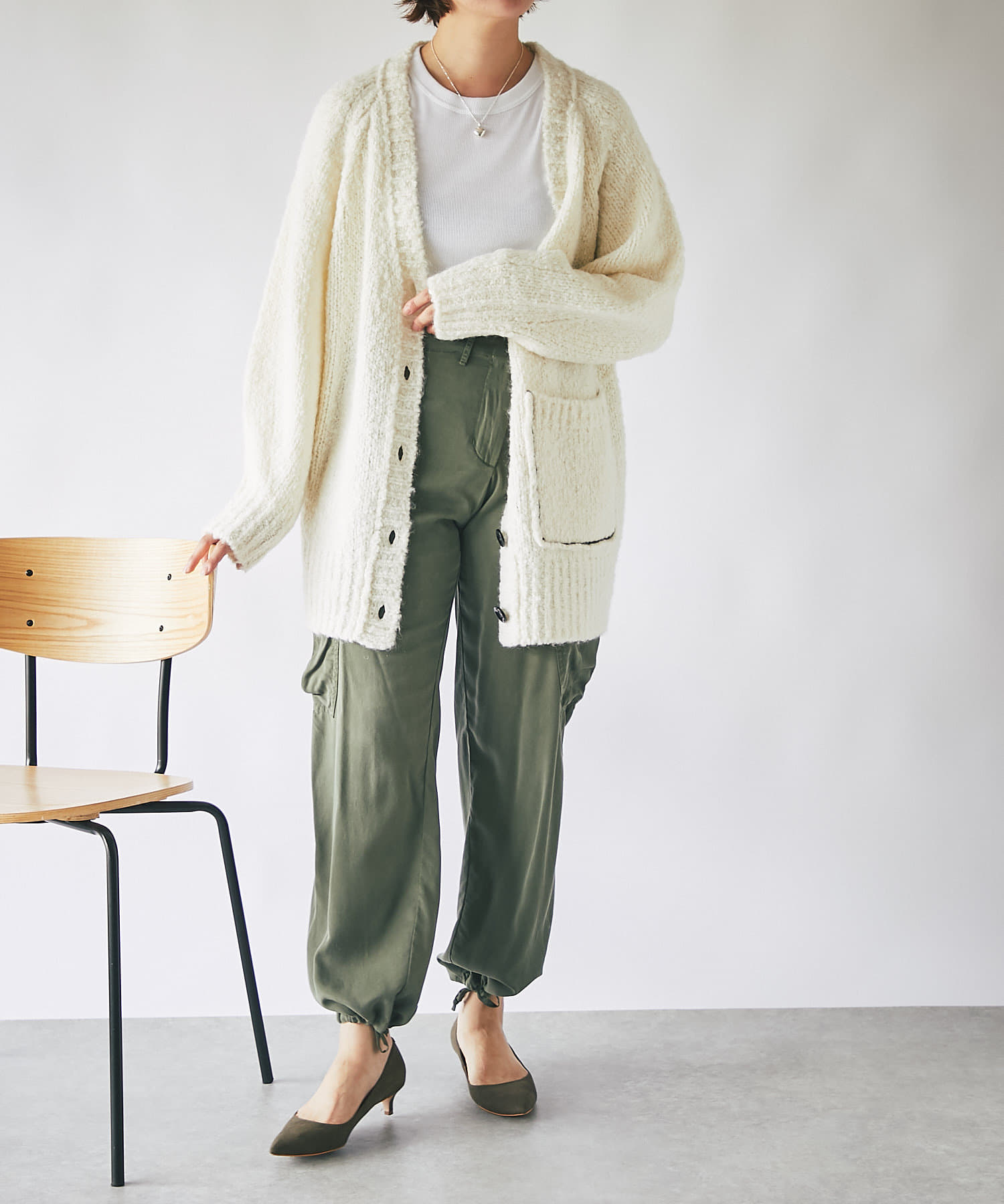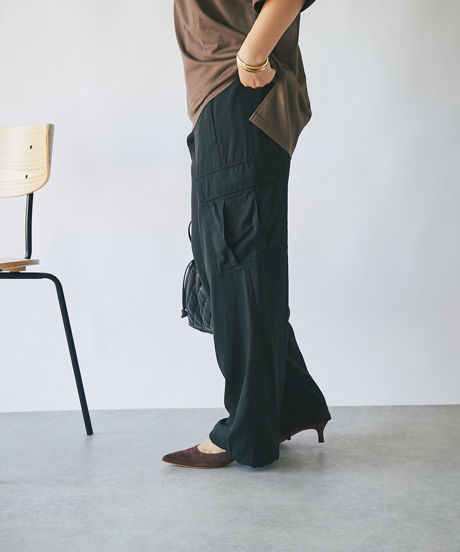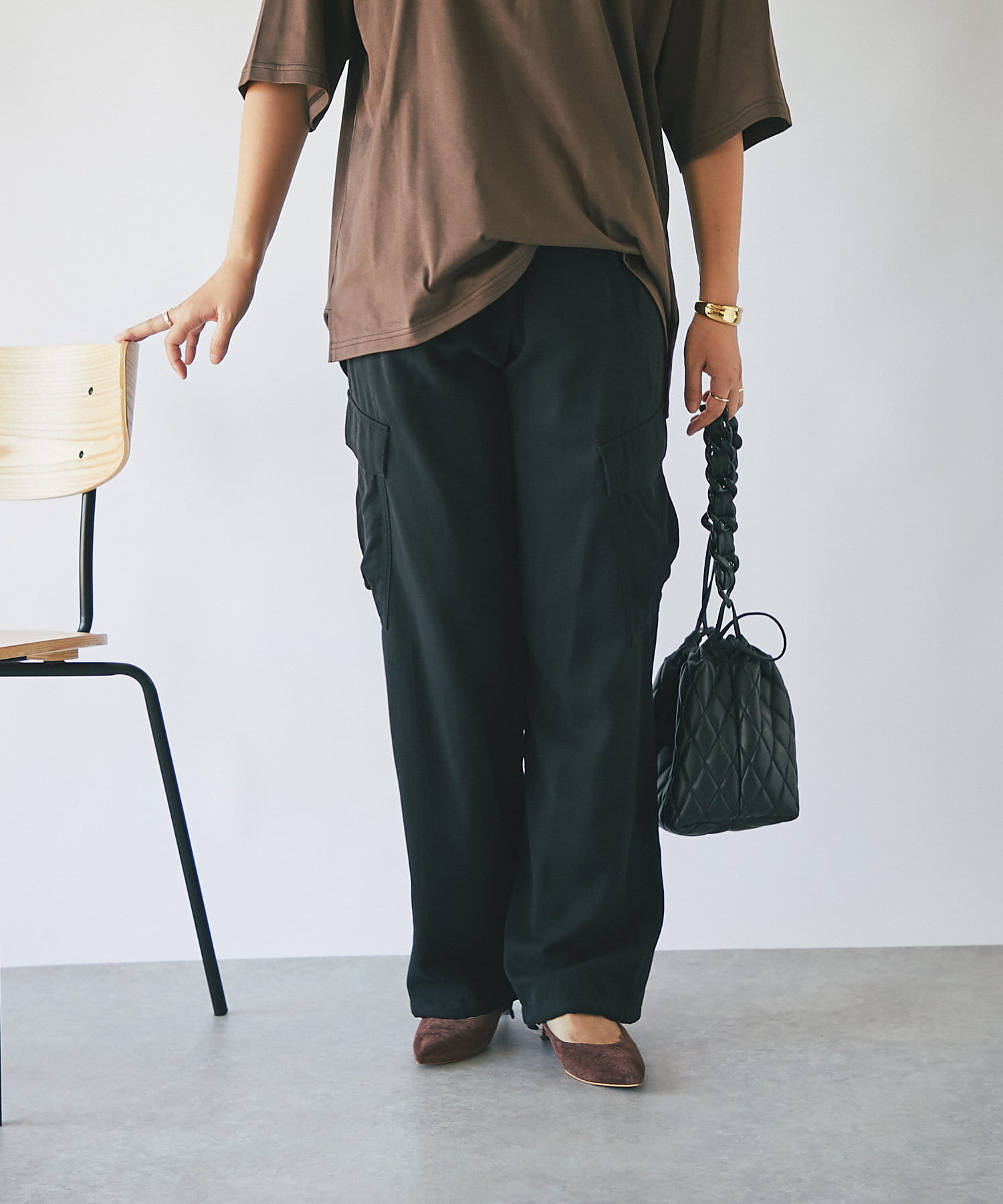 生地に落ち感があり、カジュアルになりがちなカーゴパンツを女性らしく着こなせます。