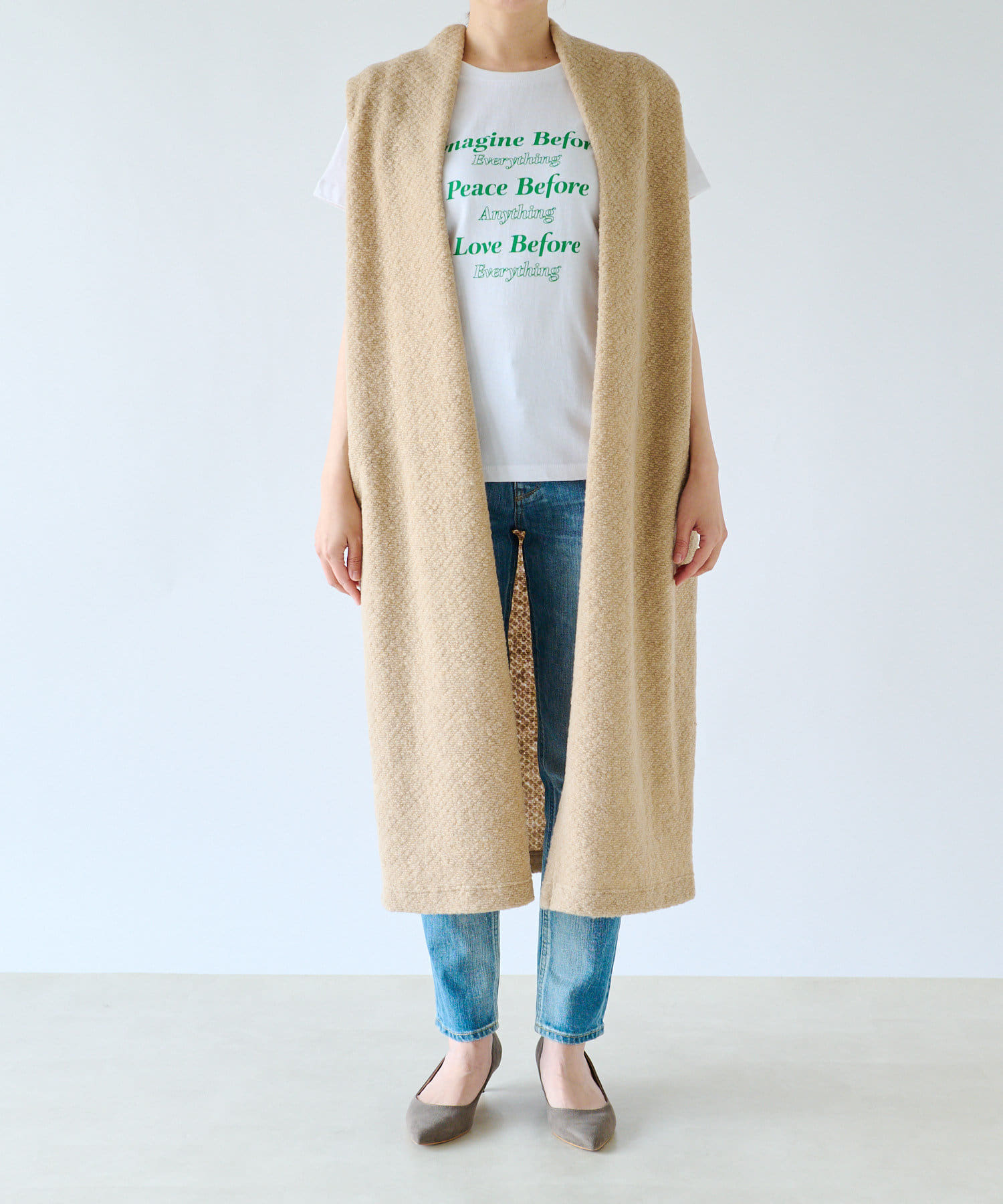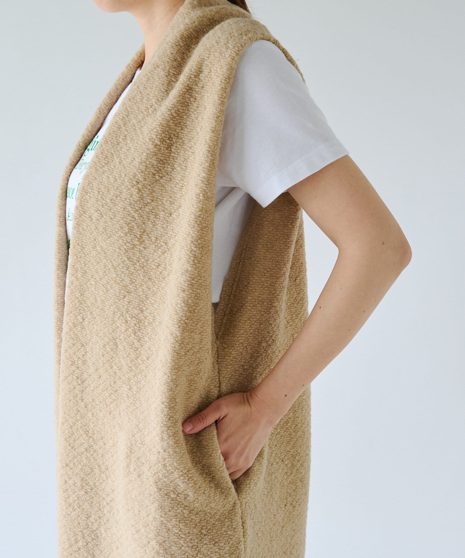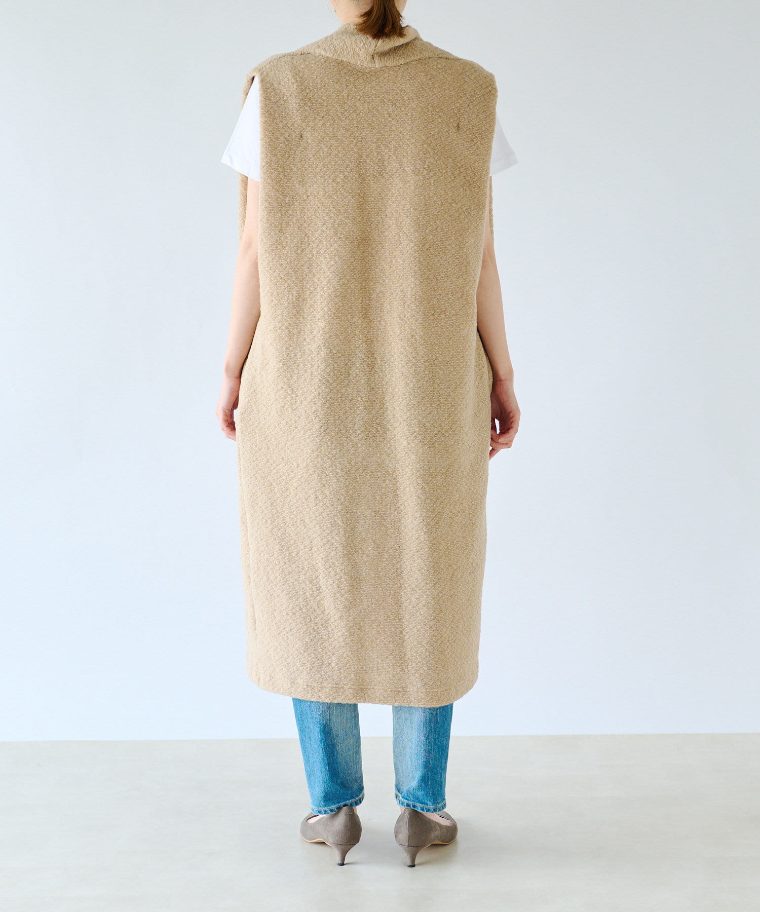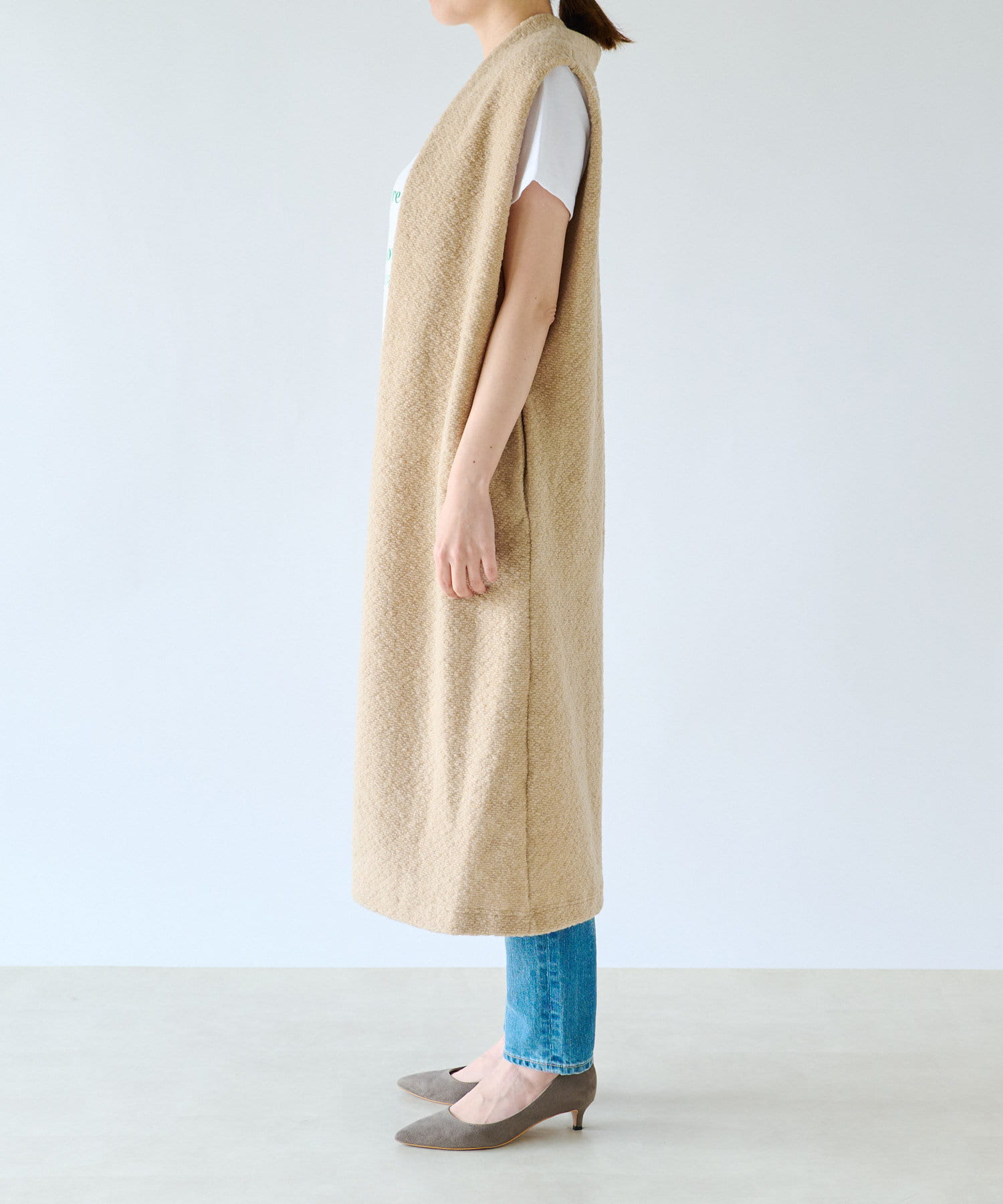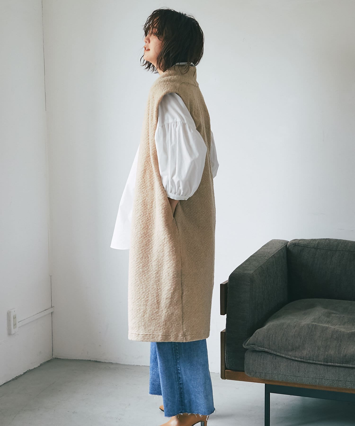 袖なしのため、裏地なしのコートにレイヤードしても素敵に着用していただけます。