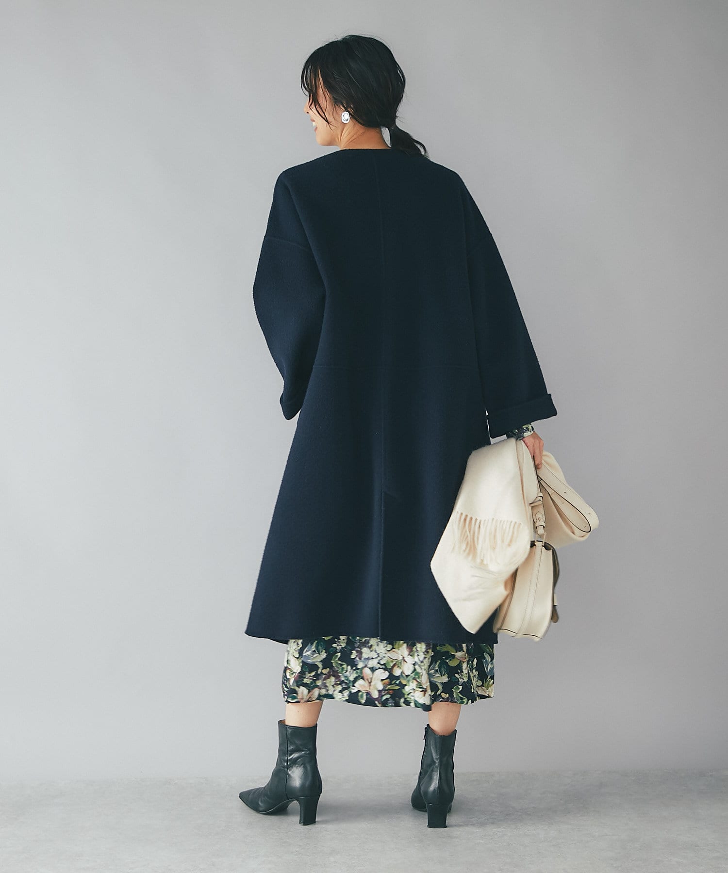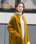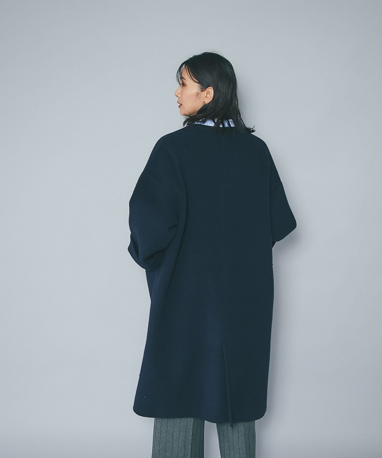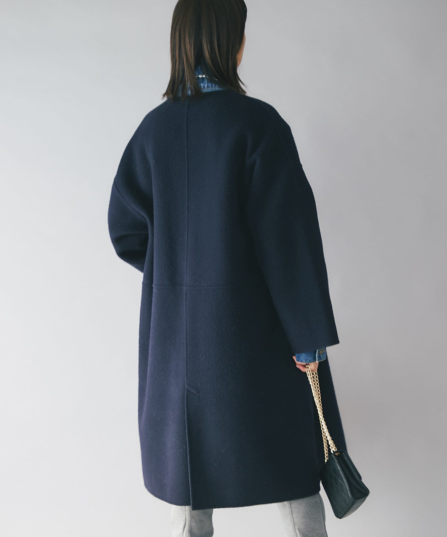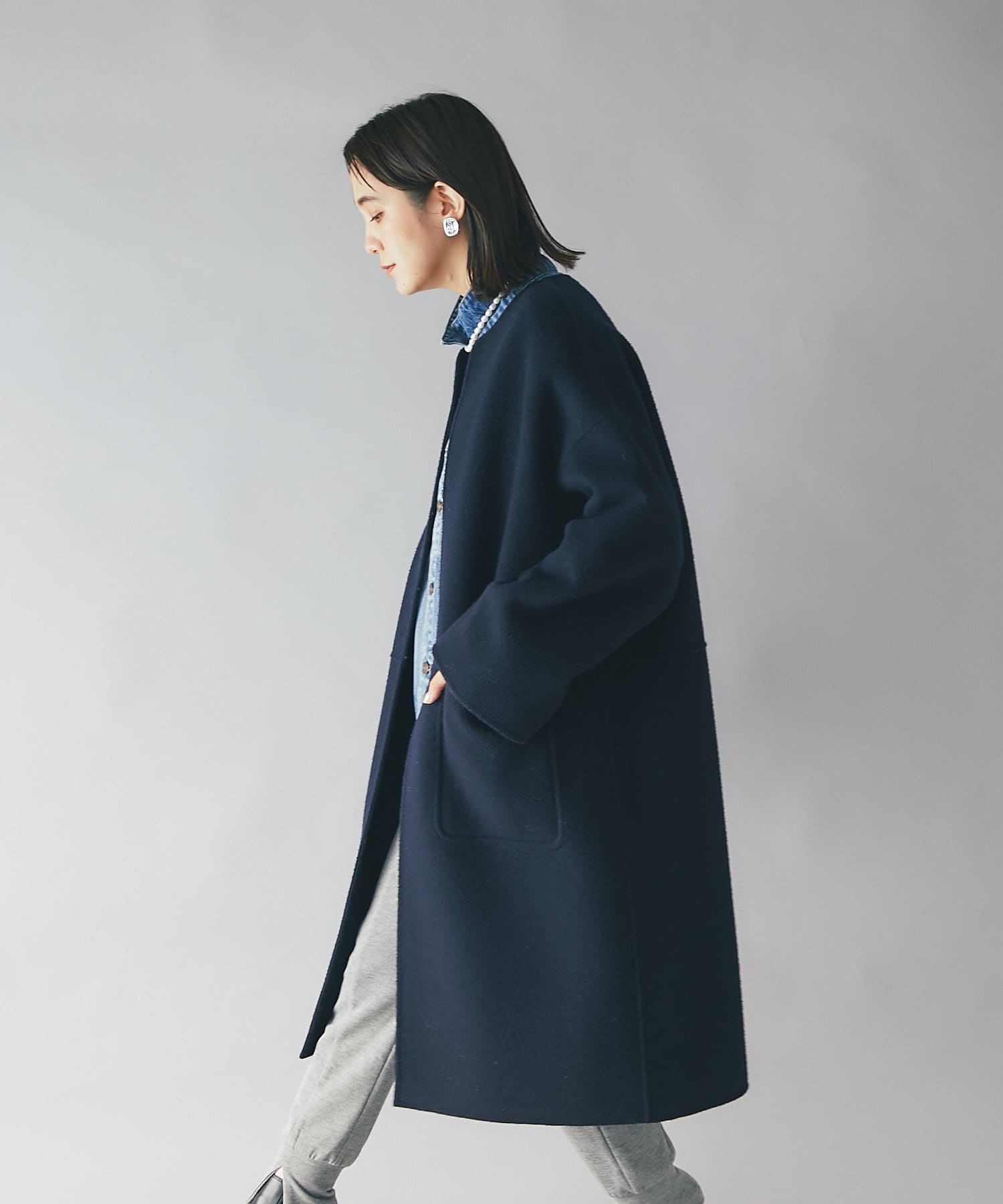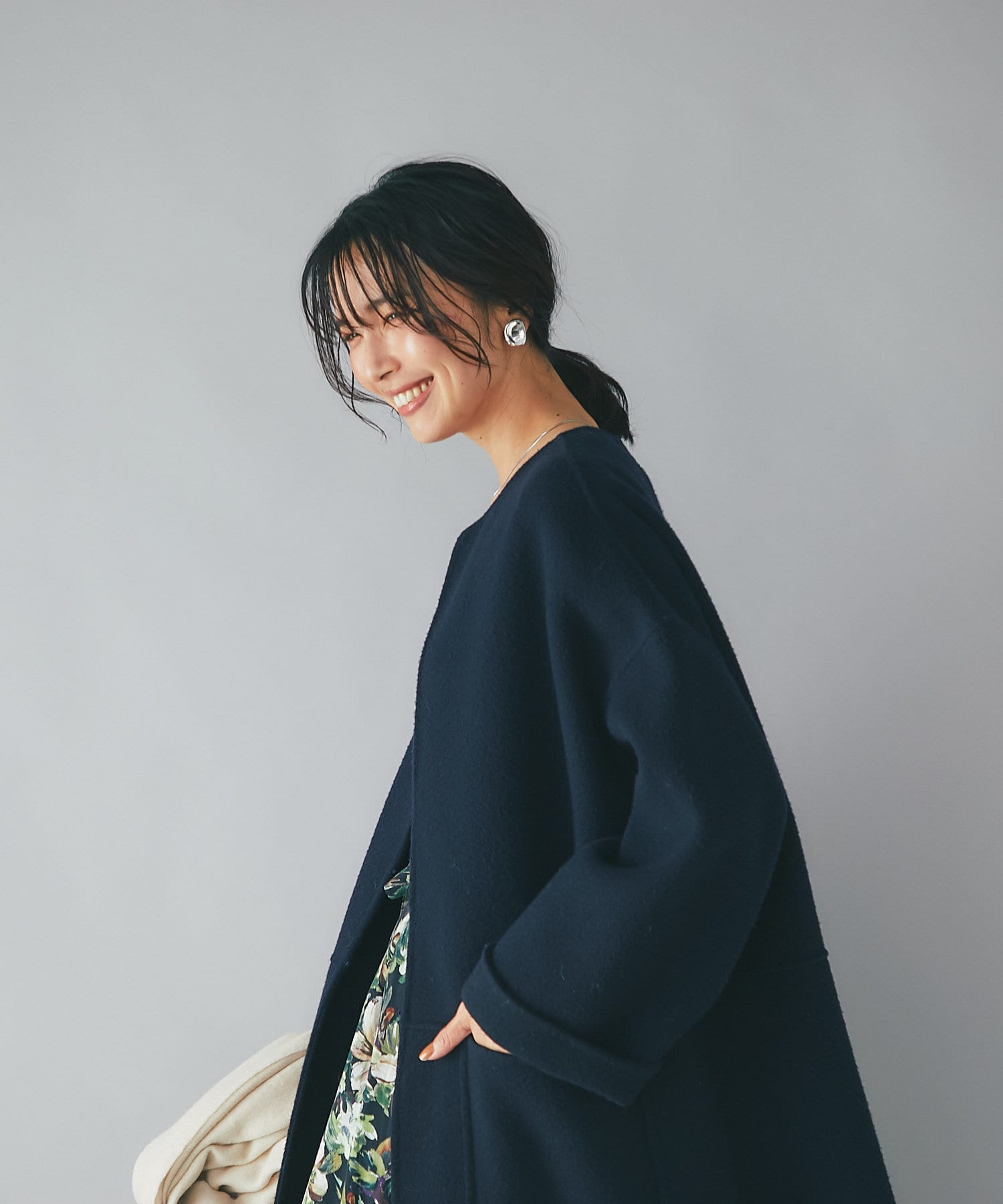 たっぷりした身幅は厚手のニットやインナーダウンと重ねても着膨れしにくく、シーズンを通してマルチに活用していただけます。                                                                      スタンダードなノーカラーデザインはインナーを選ばず、小物アレンジで印象を変えて着用できるところもポイント。                                                                             キレイめからカジュアルまで幅広く着用していただけます。
