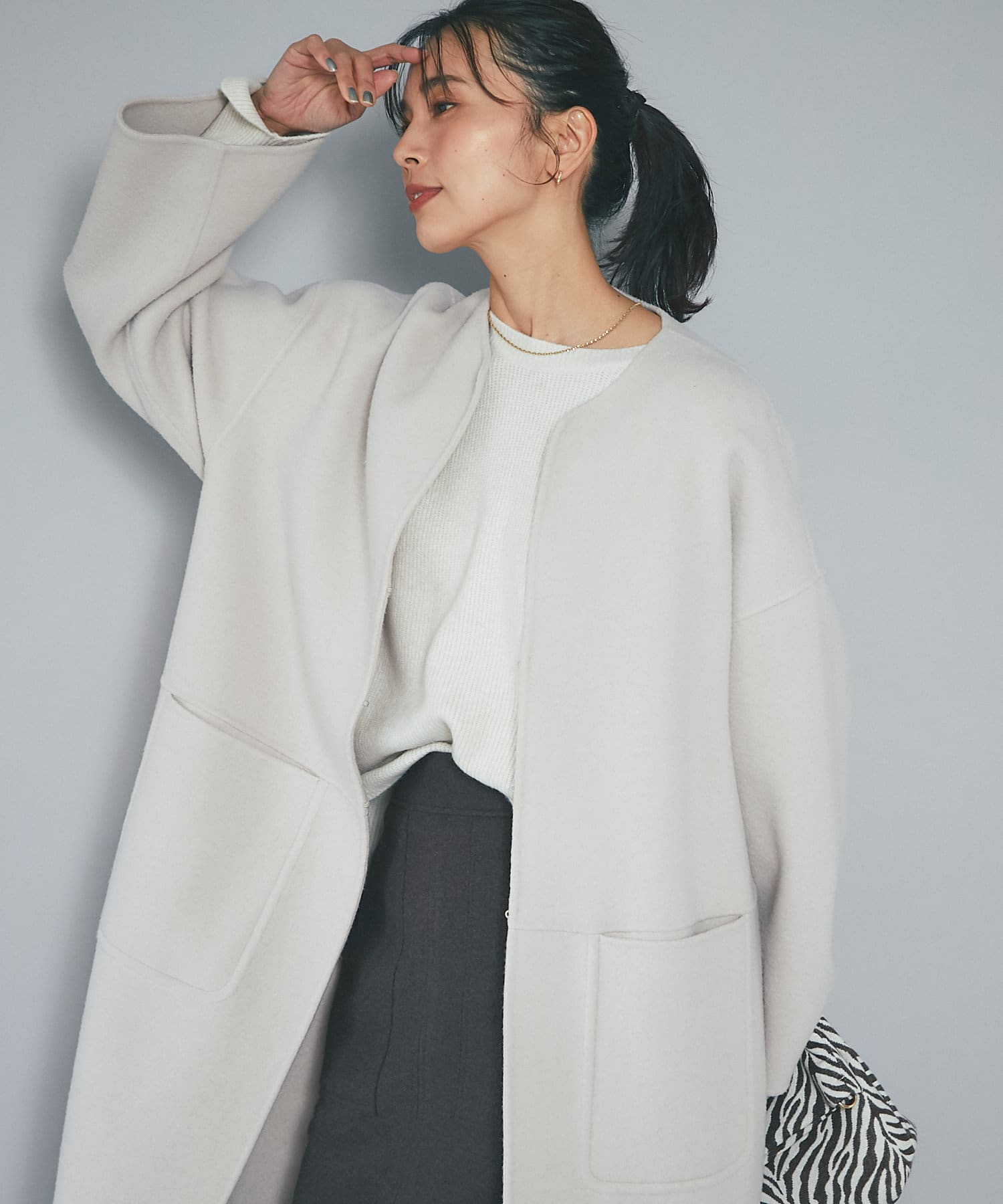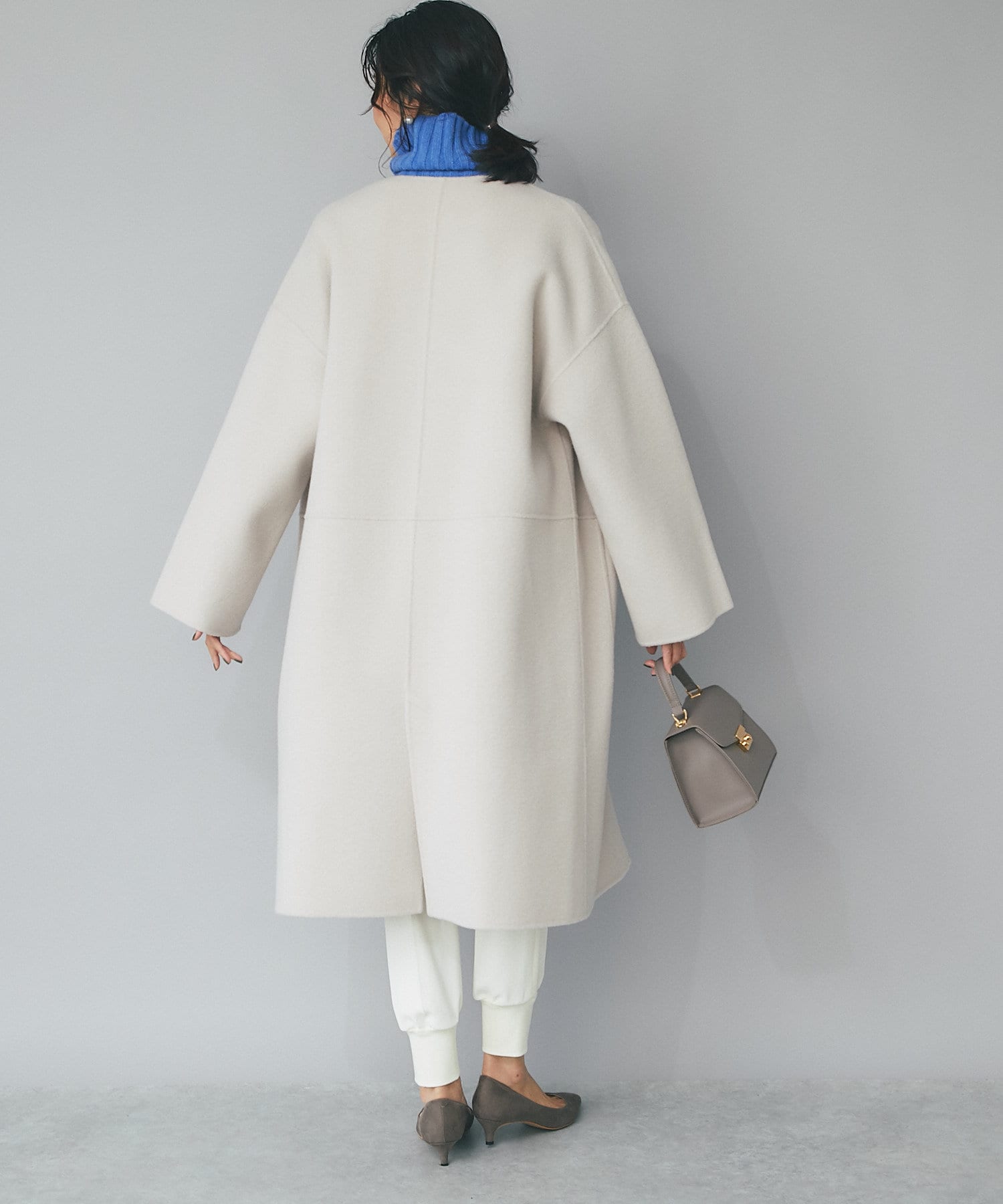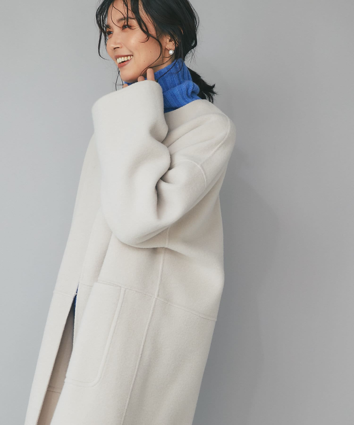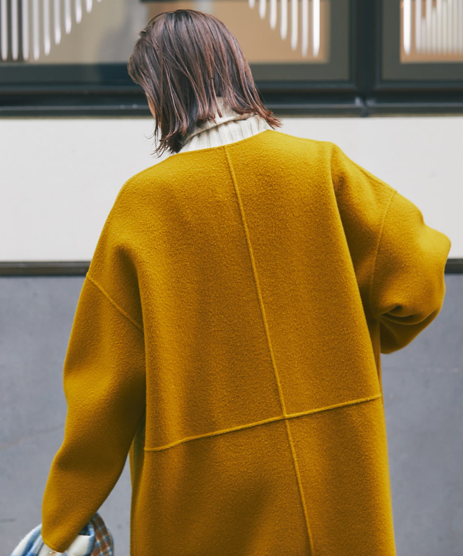 たっぷりした身幅は厚手のニットやインナーダウンと重ねても着膨れしにくく、シーズンを通してマルチに活用していただけます。                                                                      スタンダードなノーカラーデザインはインナーを選ばず、小物アレンジで印象を変えて着用できるところもポイント。                                                                             キレイめからカジュアルまで幅広く着用していただけます。