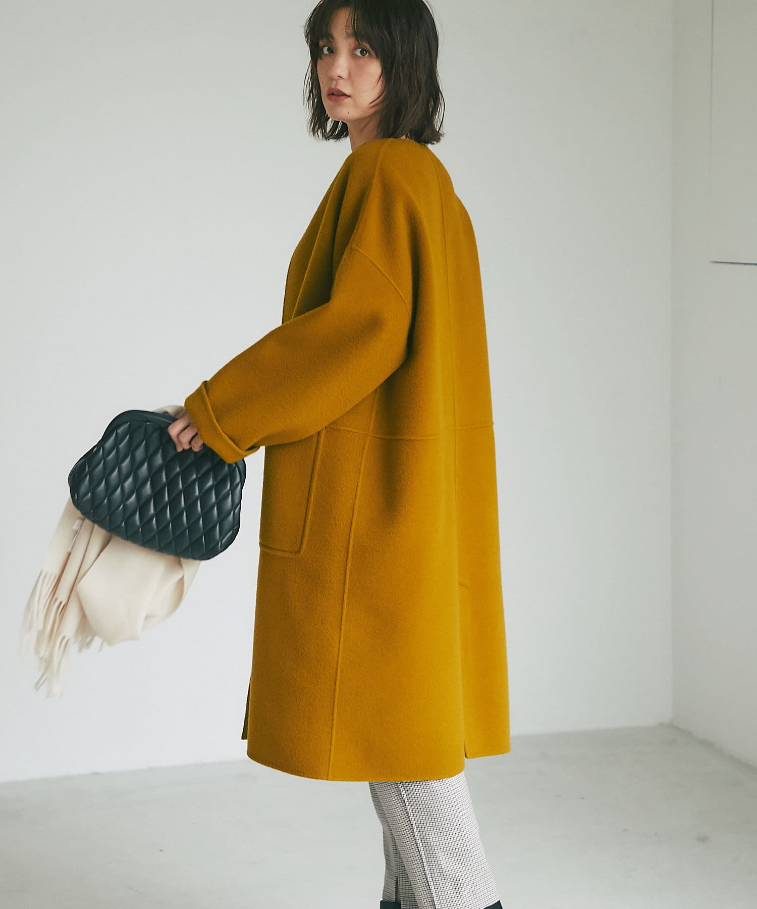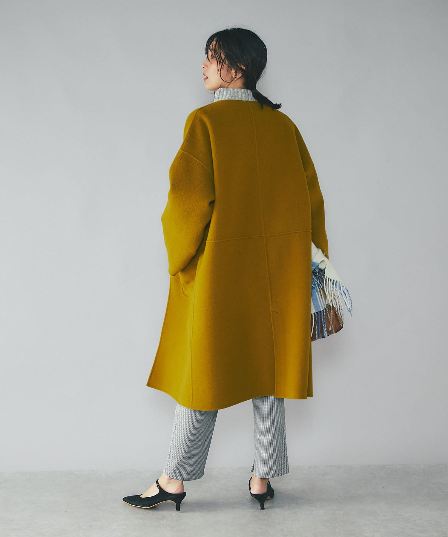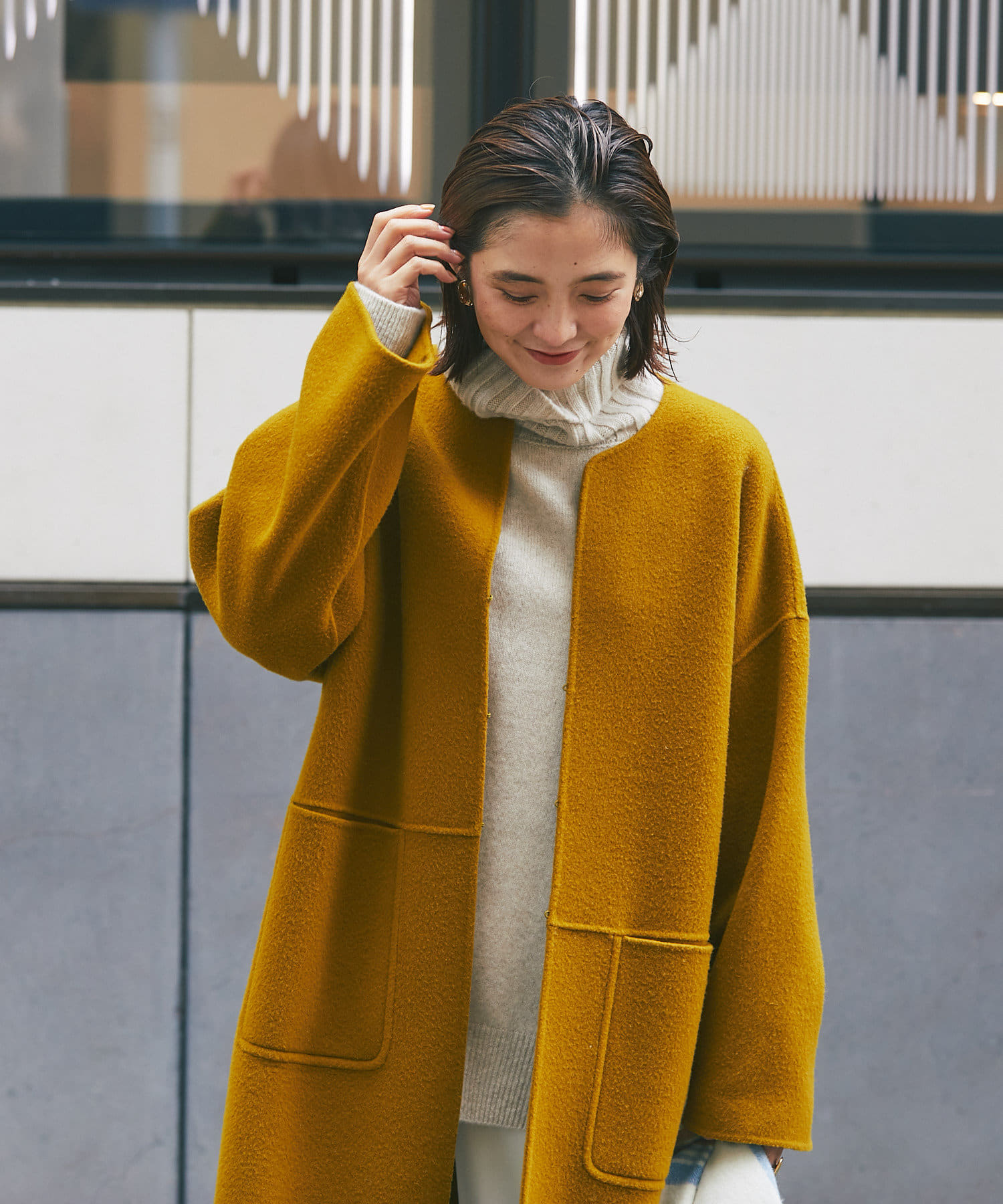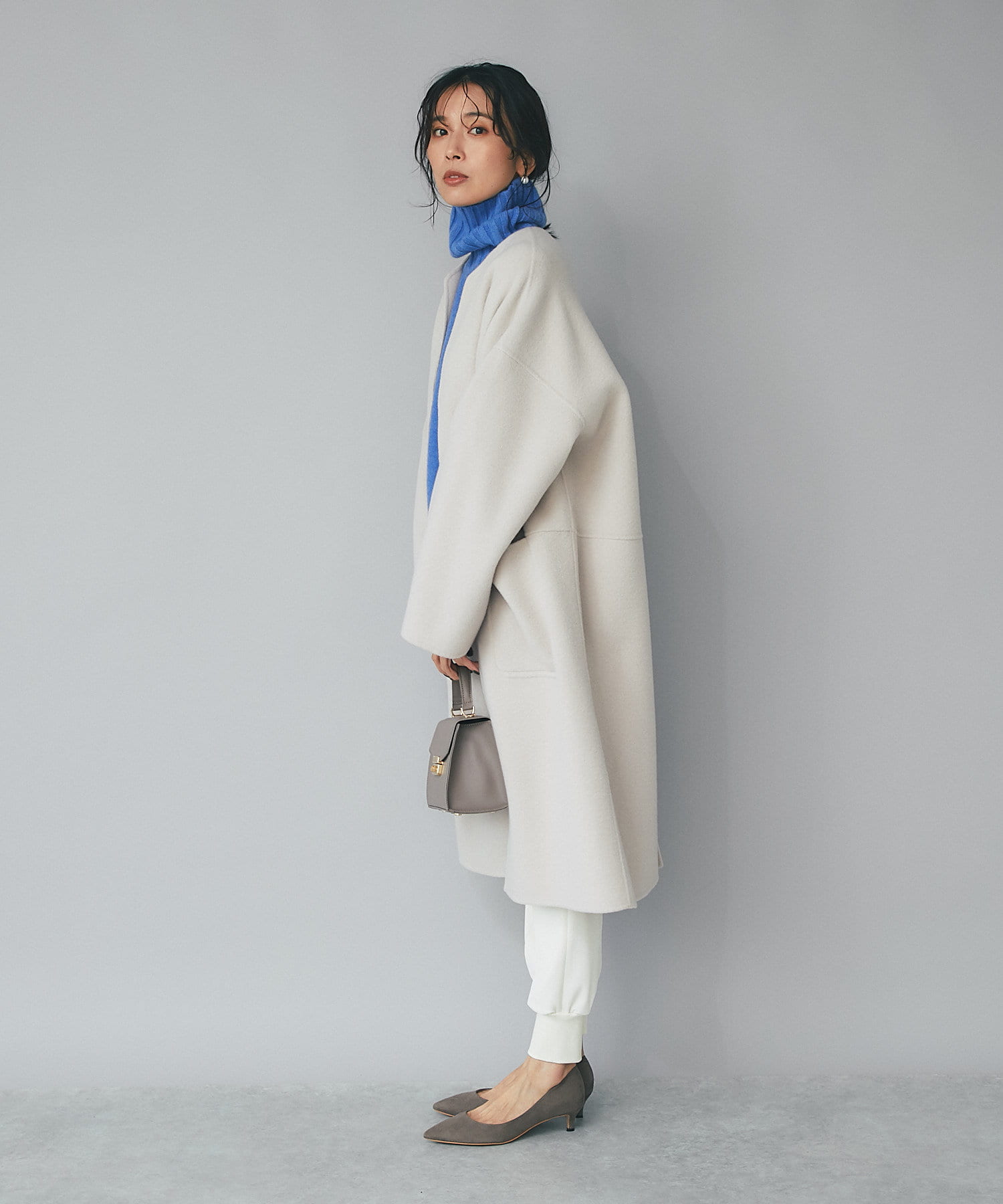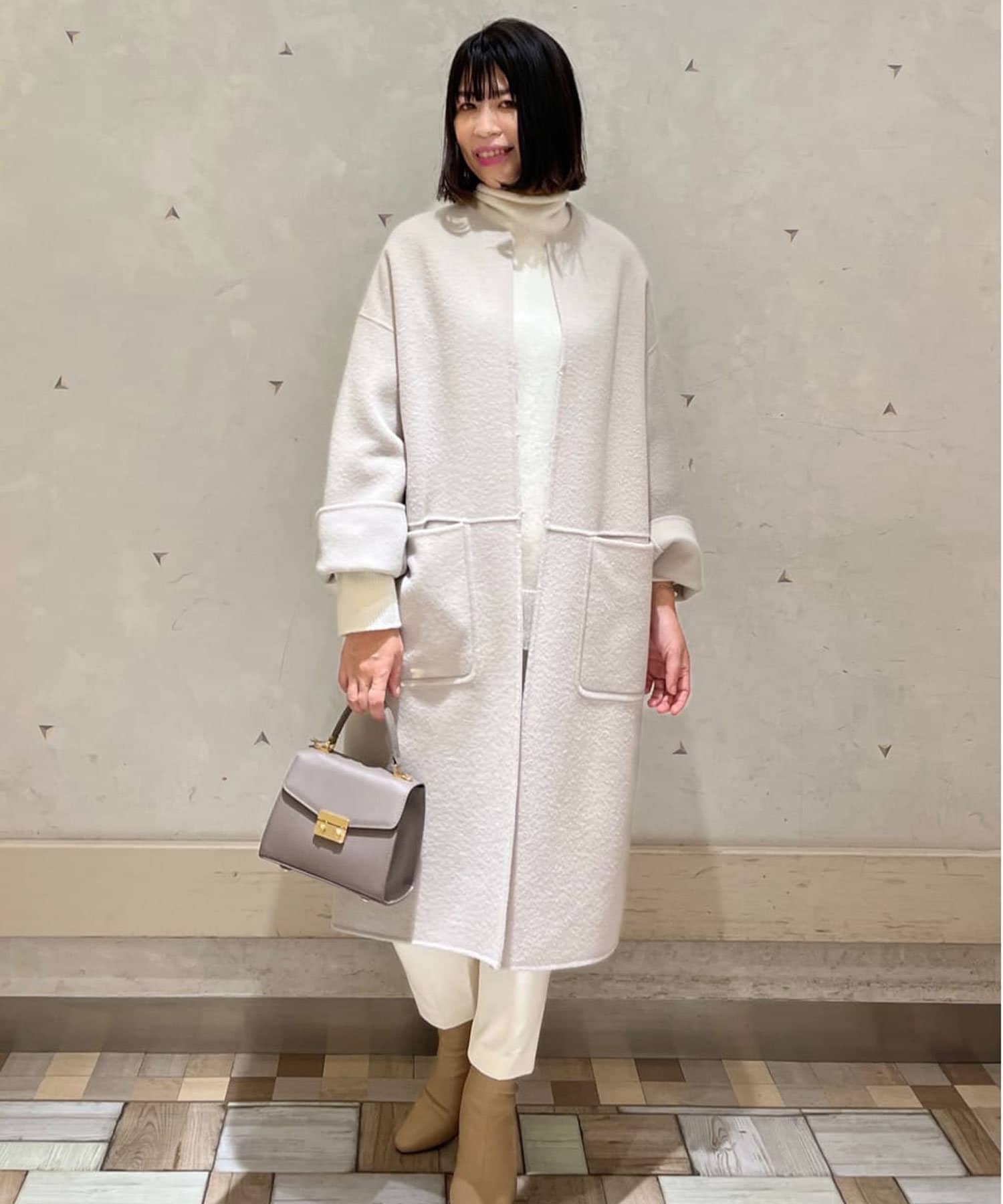 たっぷりした身幅は厚手のニットやインナーダウンと重ねても着膨れしにくく、シーズンを通してマルチに活用していただけます。                                                                      スタンダードなノーカラーデザインはインナーを選ばず、小物アレンジで印象を変えて着用できるところもポイント。                                                                             キレイめからカジュアルまで幅広く着用していただけます。
