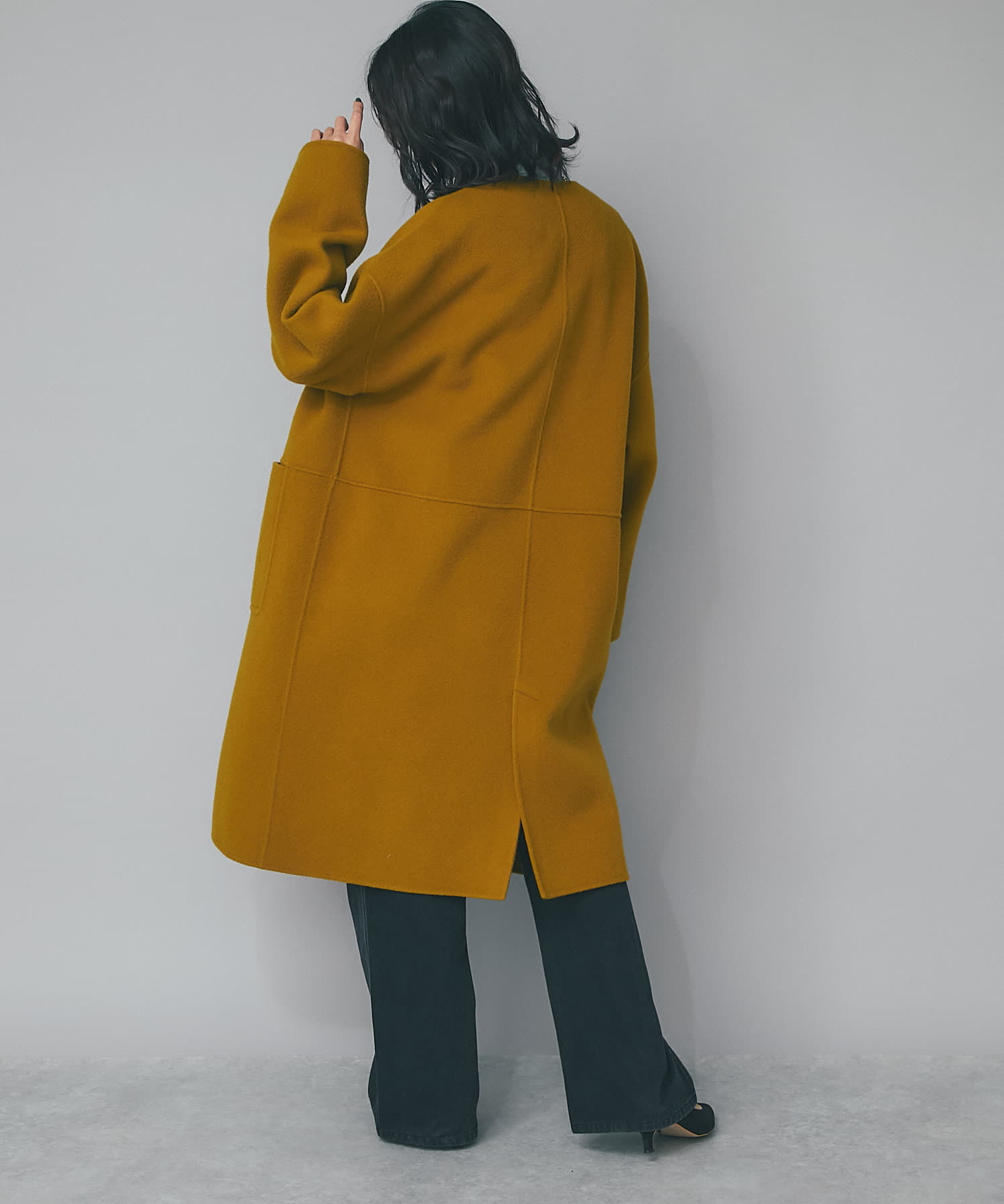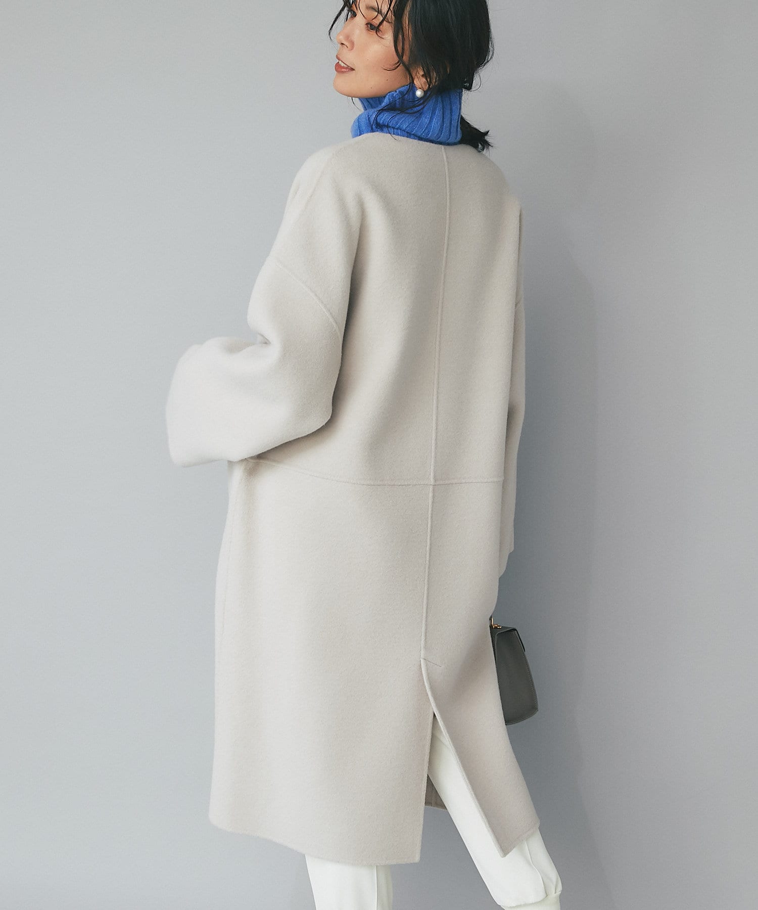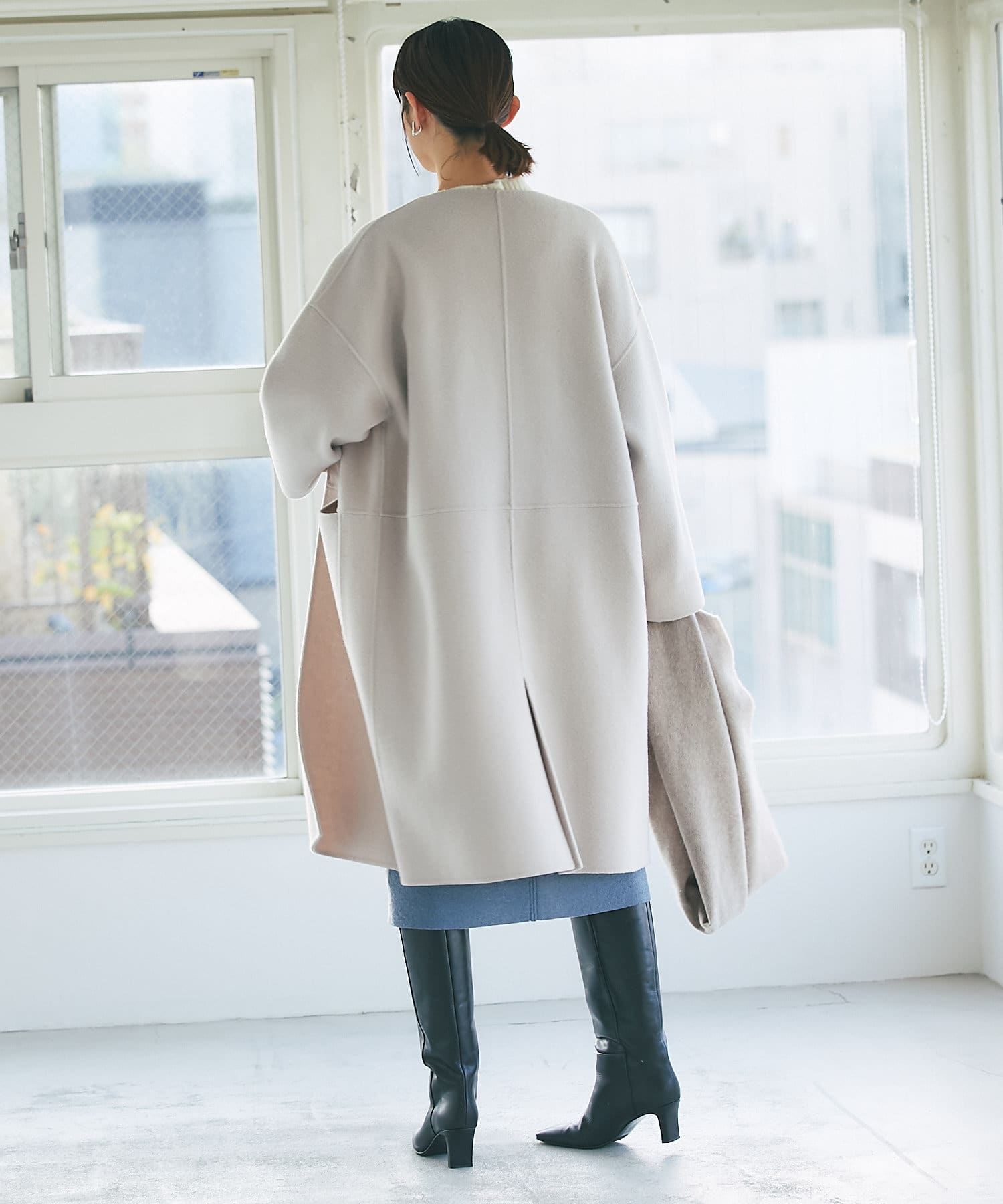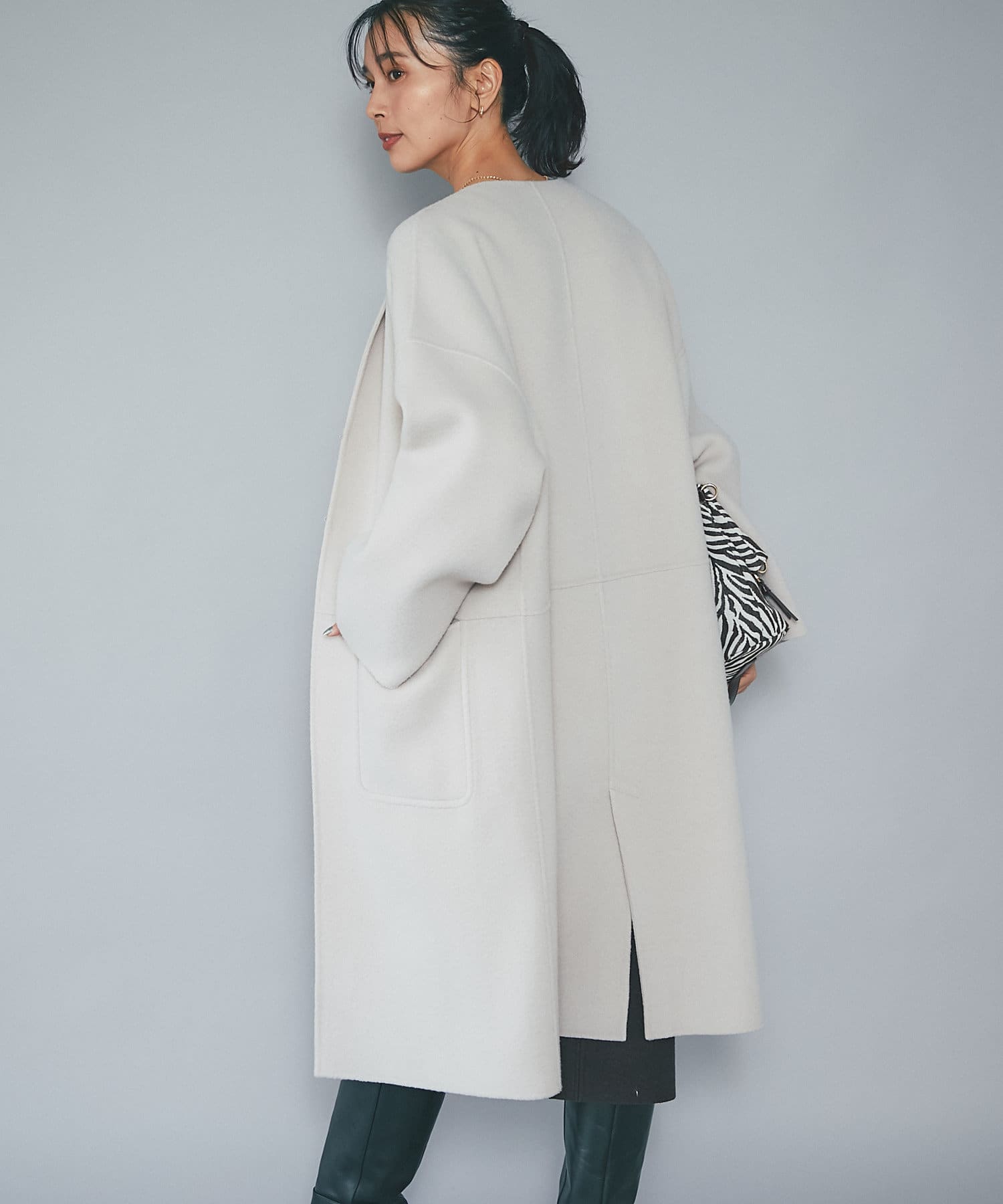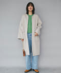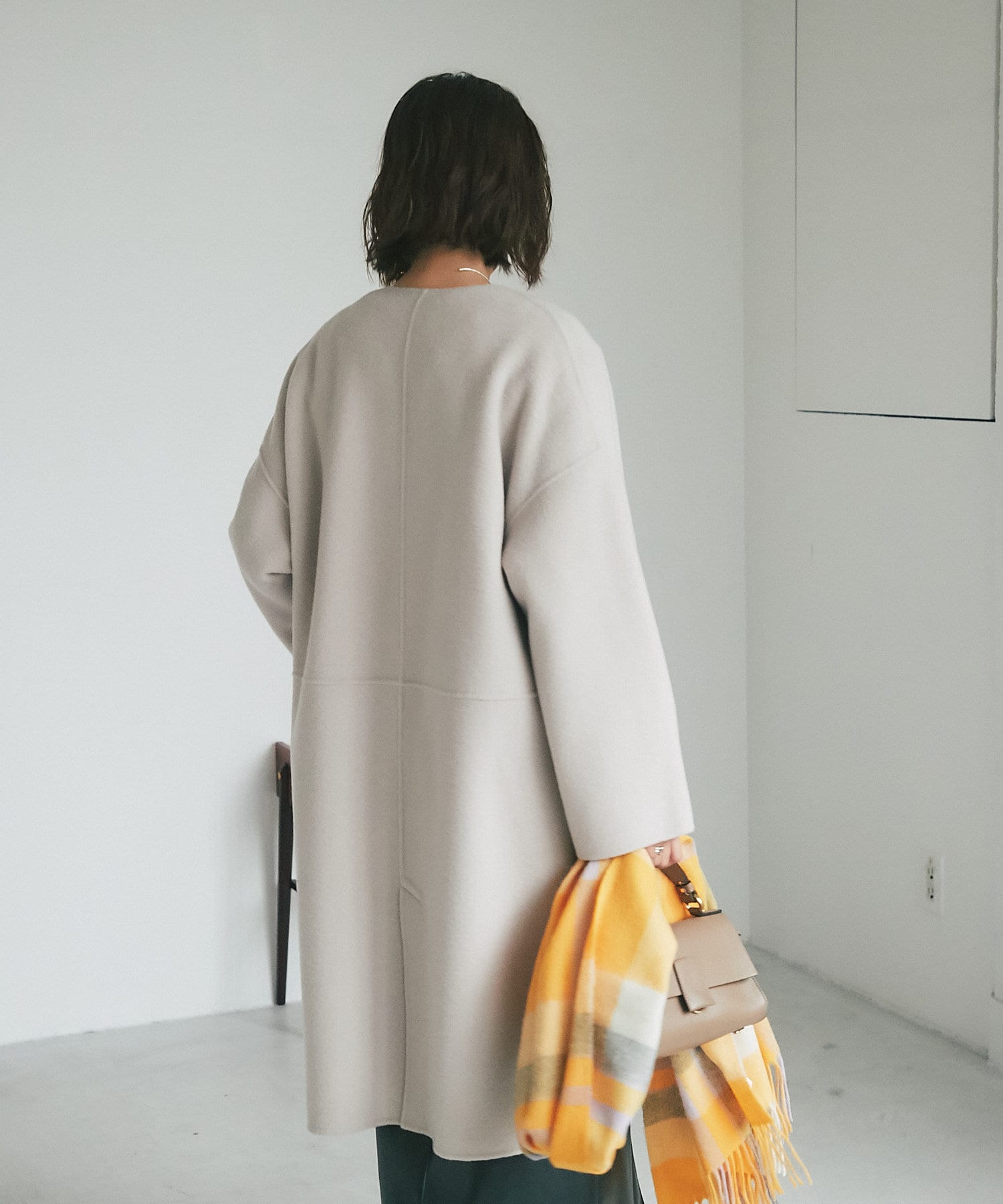 たっぷりした身幅は厚手のニットやインナーダウンと重ねても着膨れしにくく、シーズンを通してマルチに活用していただけます。                                                                      スタンダードなノーカラーデザインはインナーを選ばず、小物アレンジで印象を変えて着用できるところもポイント。                                                                             キレイめからカジュアルまで幅広く着用していただけます。