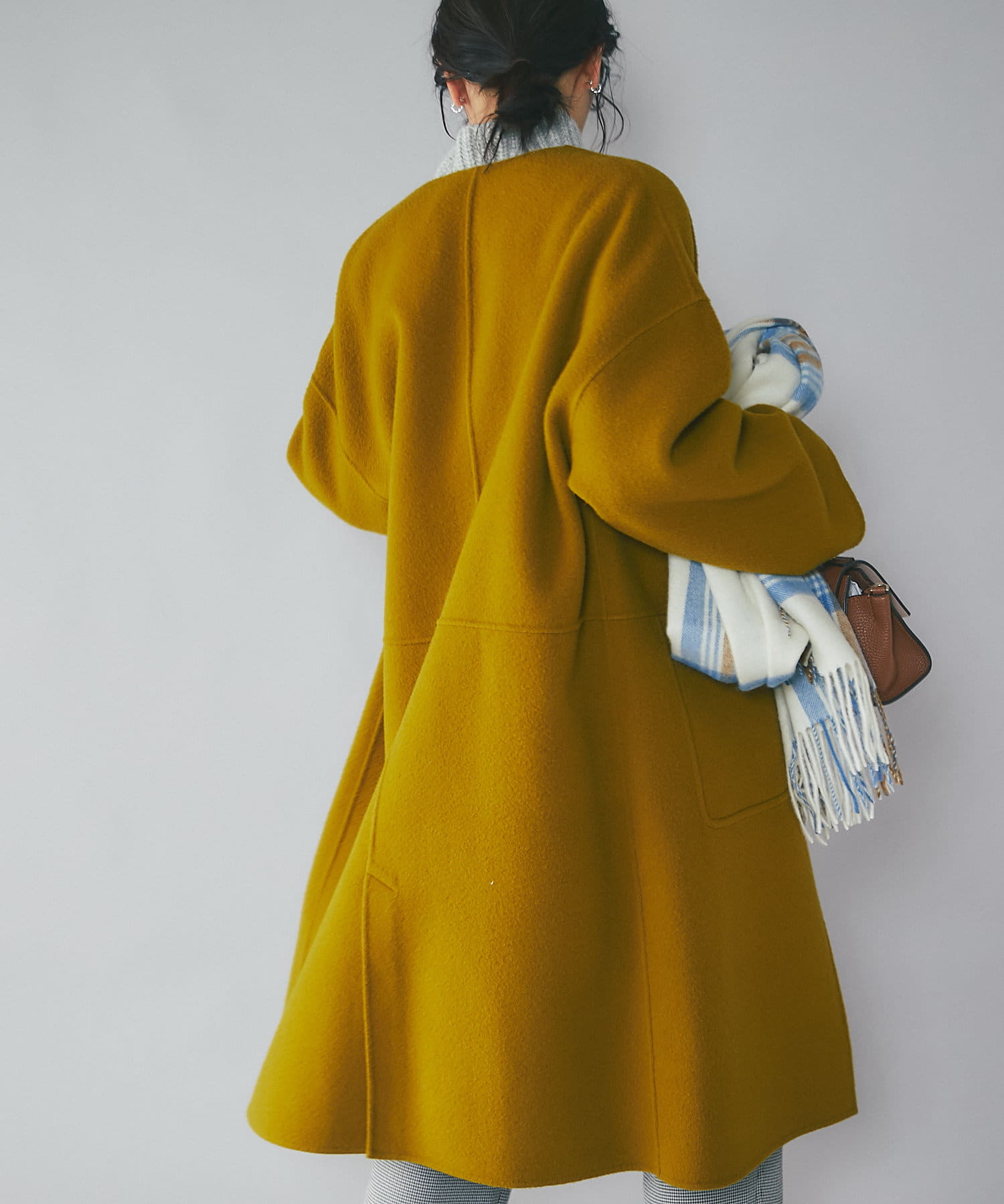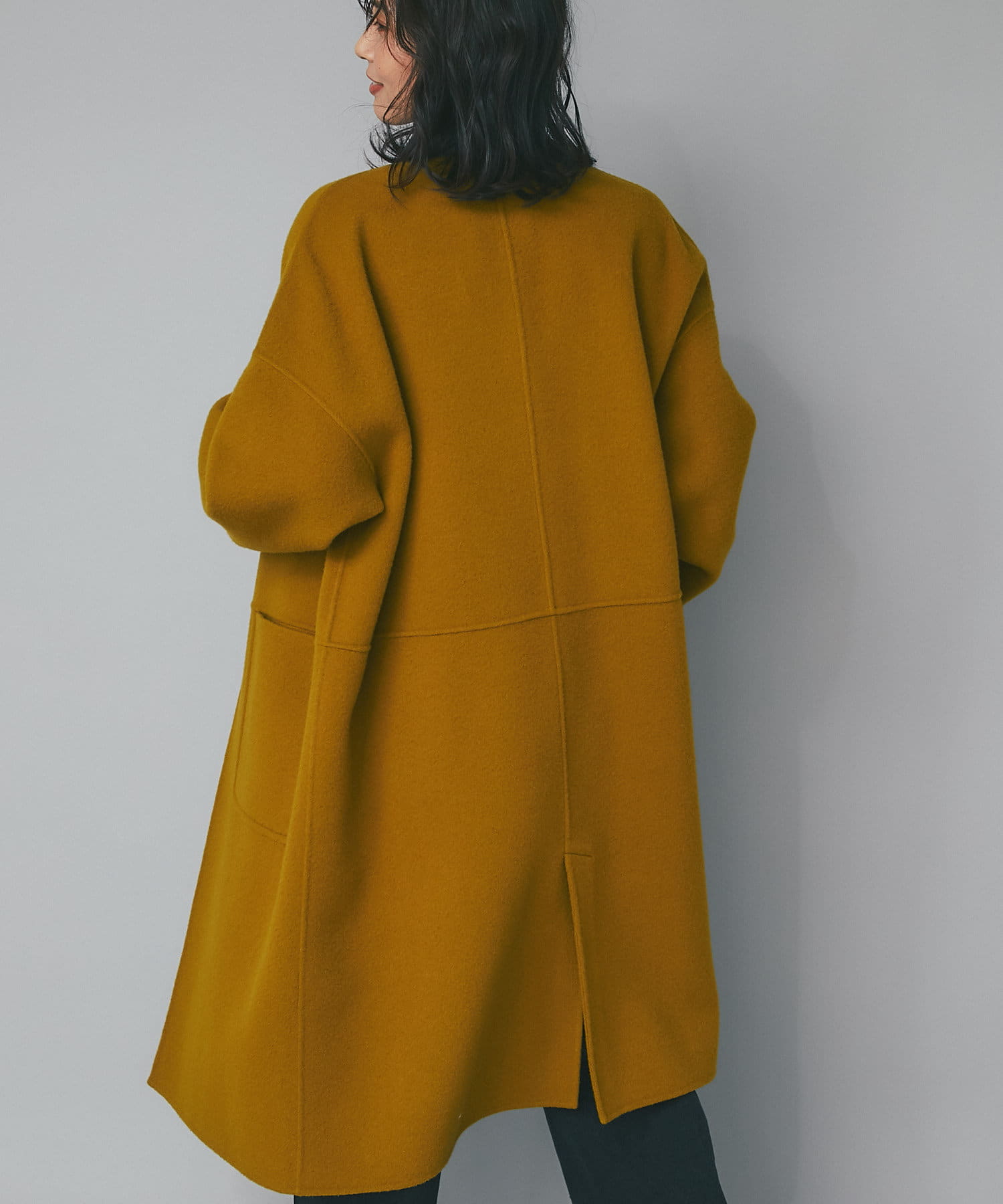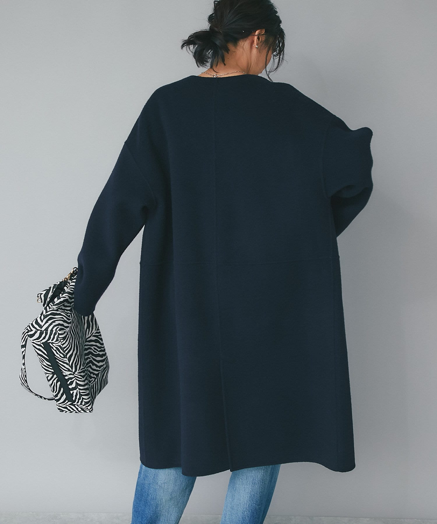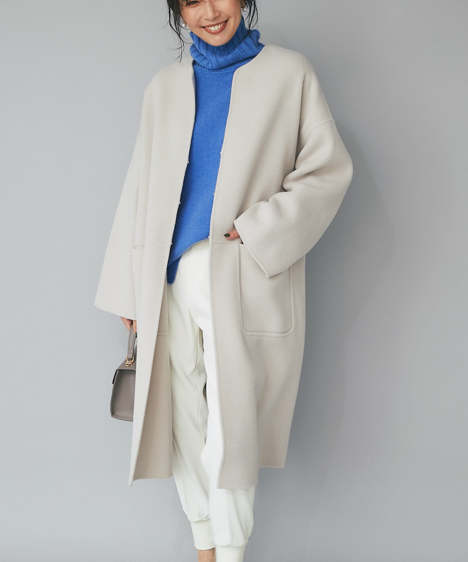たっぷりした身幅は厚手のニットやインナーダウンと重ねても着膨れしにくく、シーズンを通してマルチに活用していただけます。                                                                      スタンダードなノーカラーデザインはインナーを選ばず、小物アレンジで印象を変えて着用できるところもポイント。                                                                             キレイめからカジュアルまで幅広く着用していただけます。