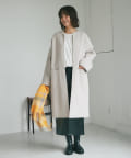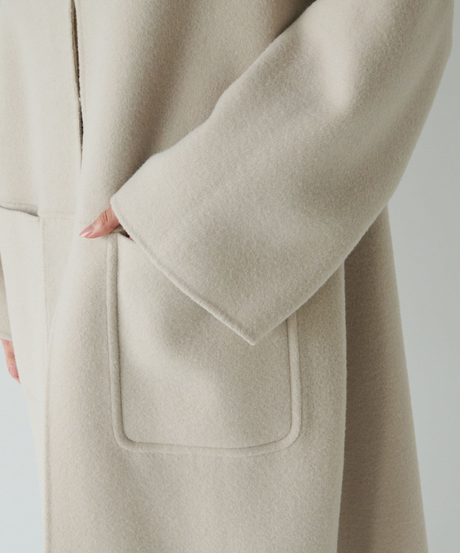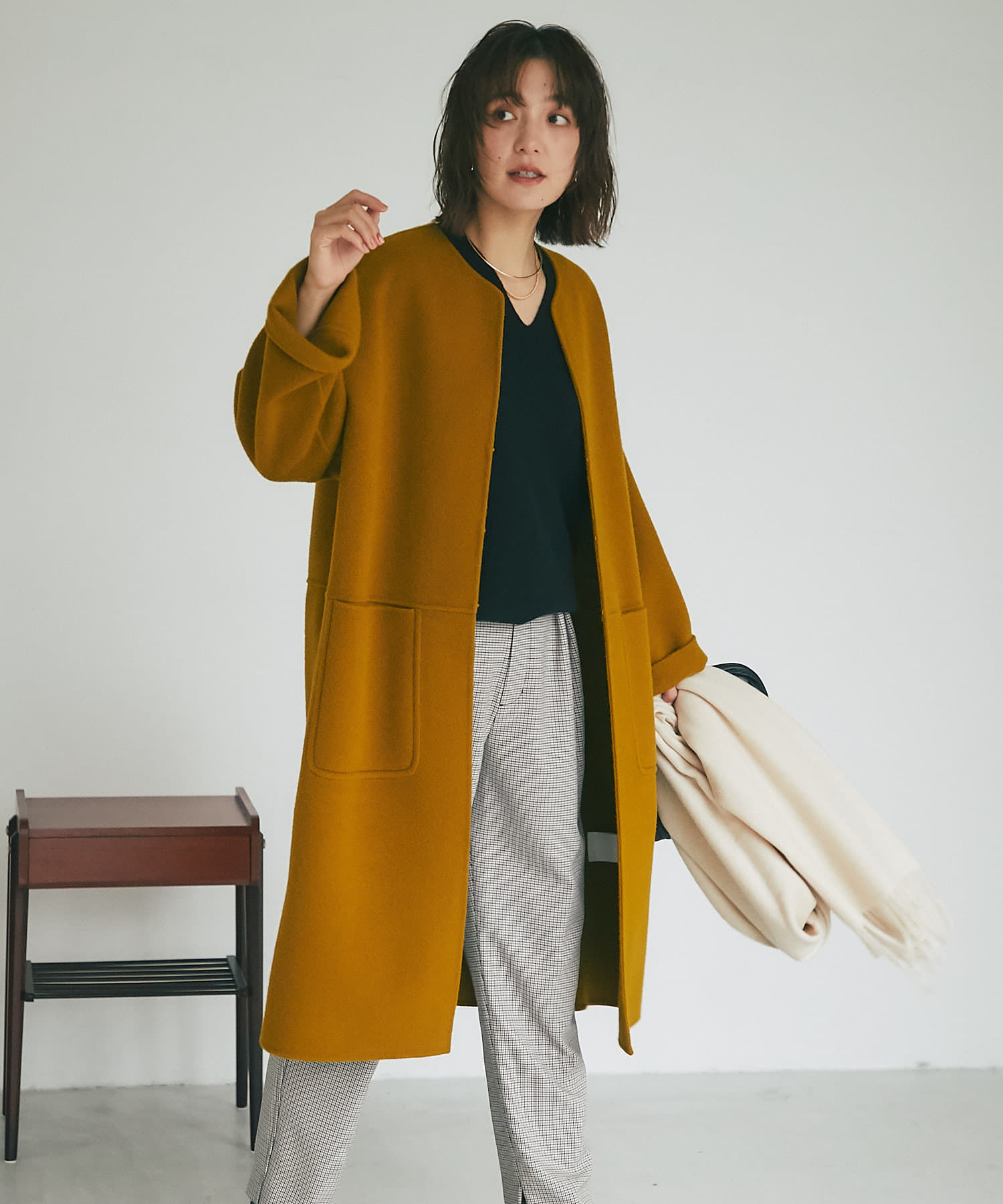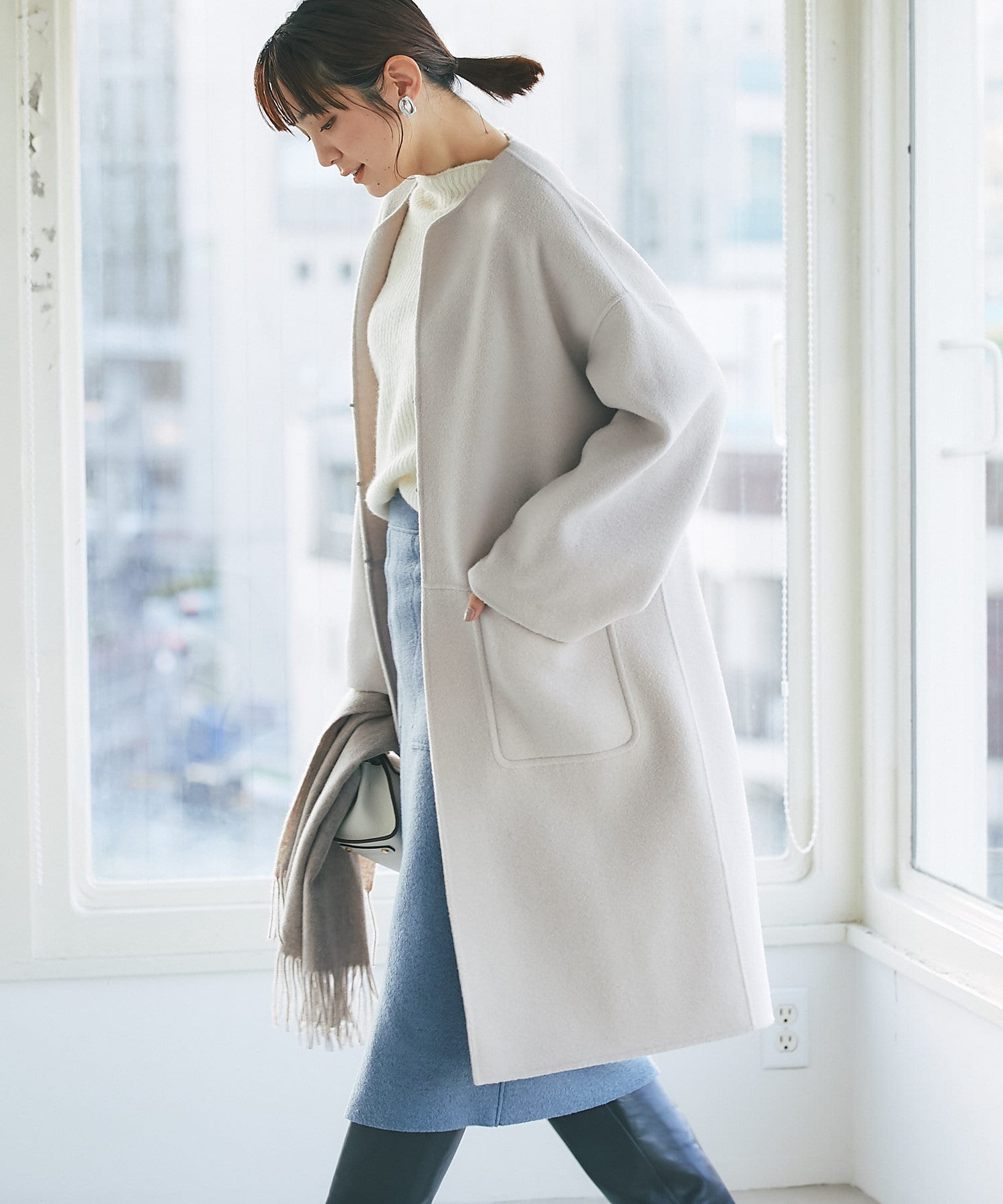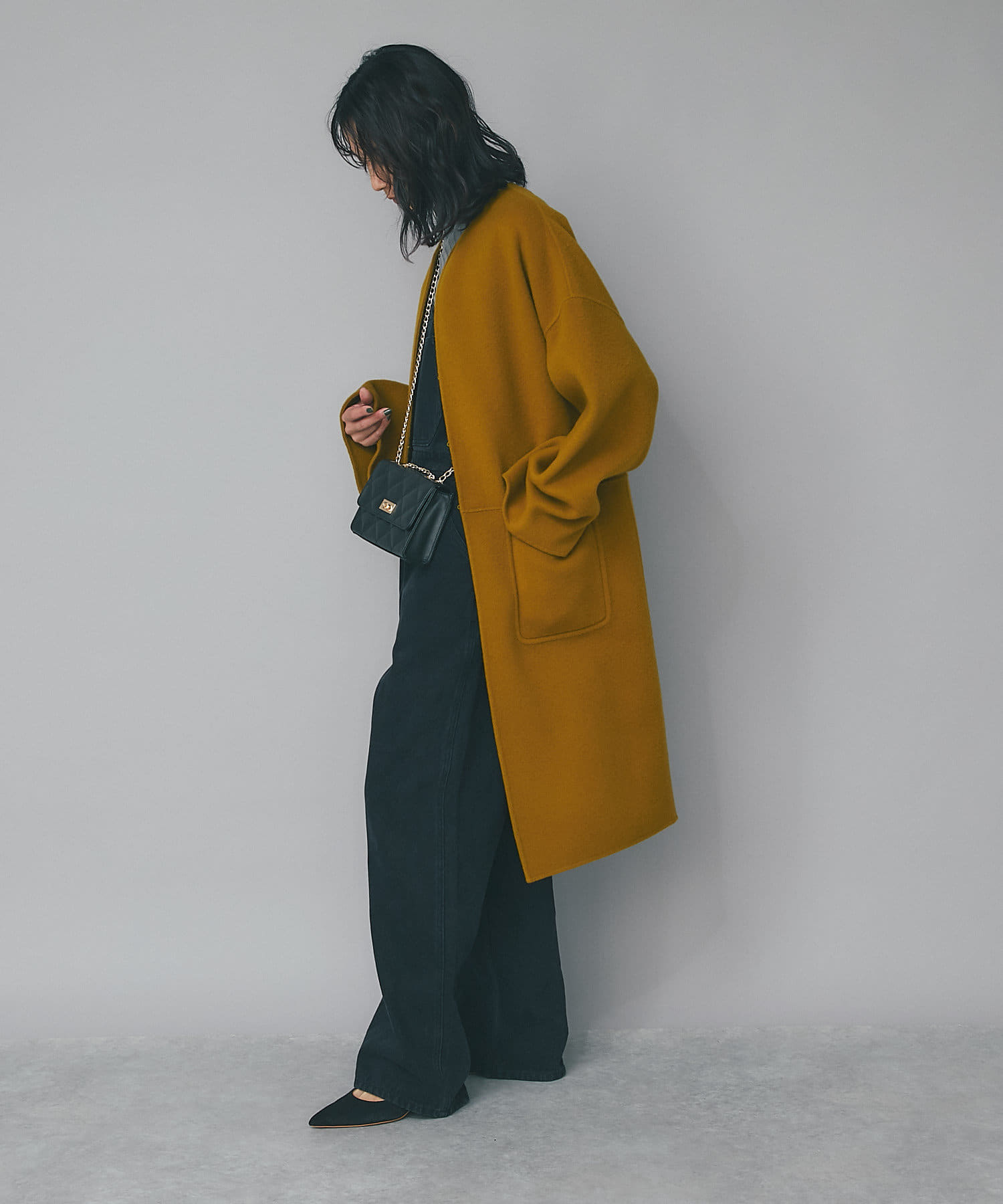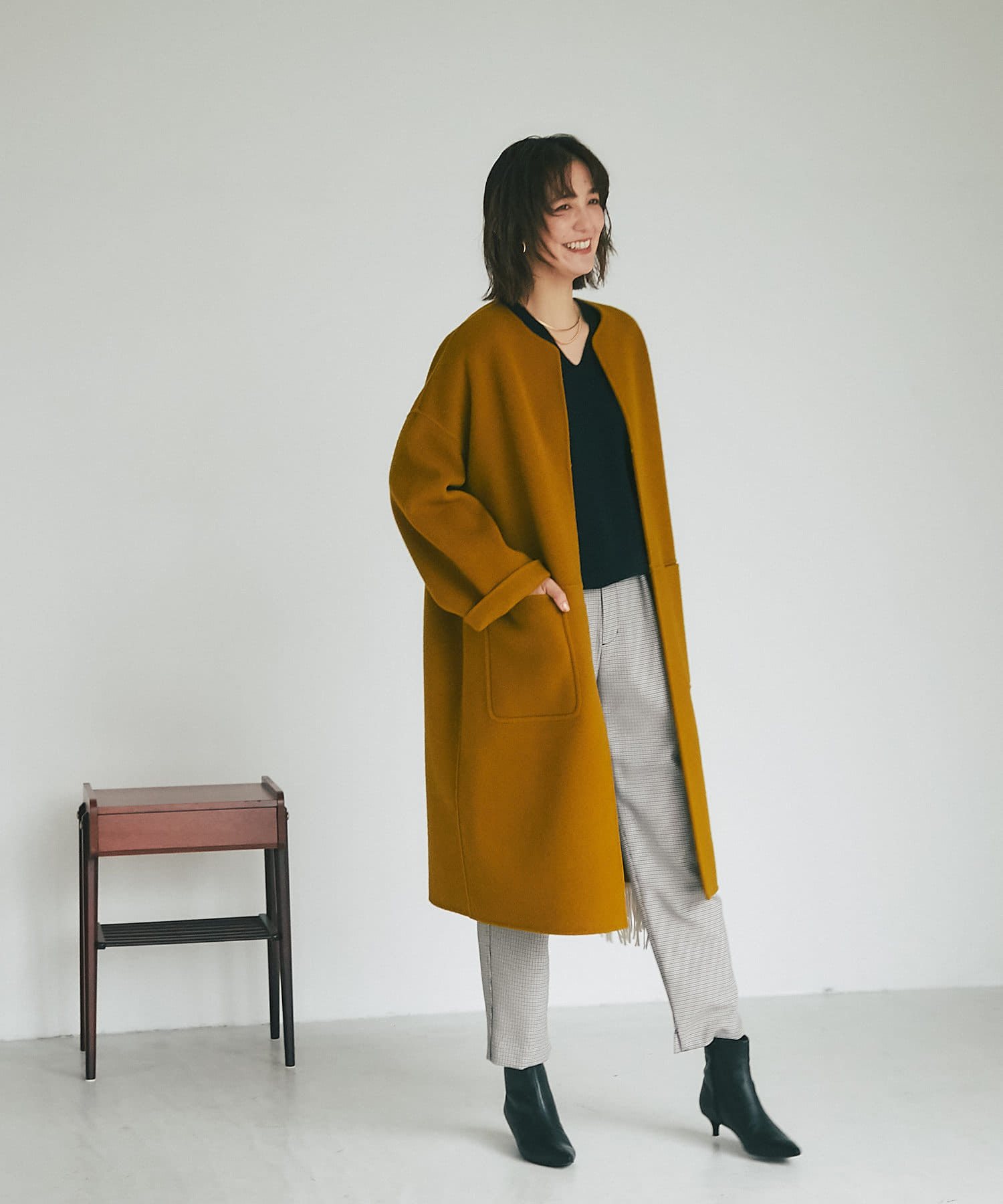 たっぷりした身幅は厚手のニットやインナーダウンと重ねても着膨れしにくく、シーズンを通してマルチに活用していただけます。                                                                      スタンダードなノーカラーデザインはインナーを選ばず、小物アレンジで印象を変えて着用できるところもポイント。                                                                             キレイめからカジュアルまで幅広く着用していただけます。