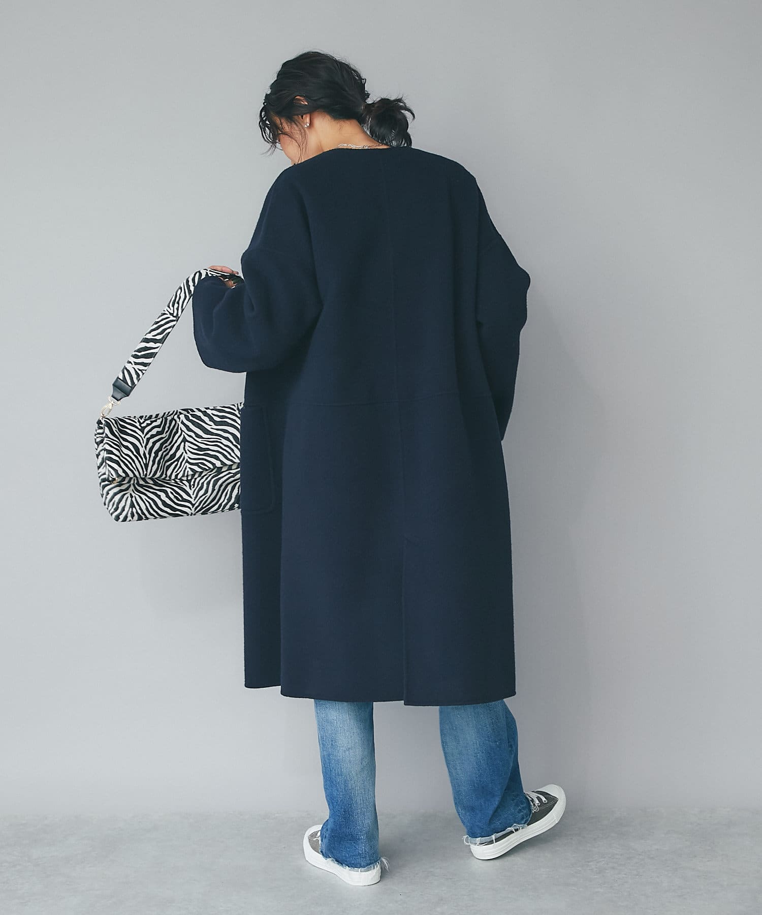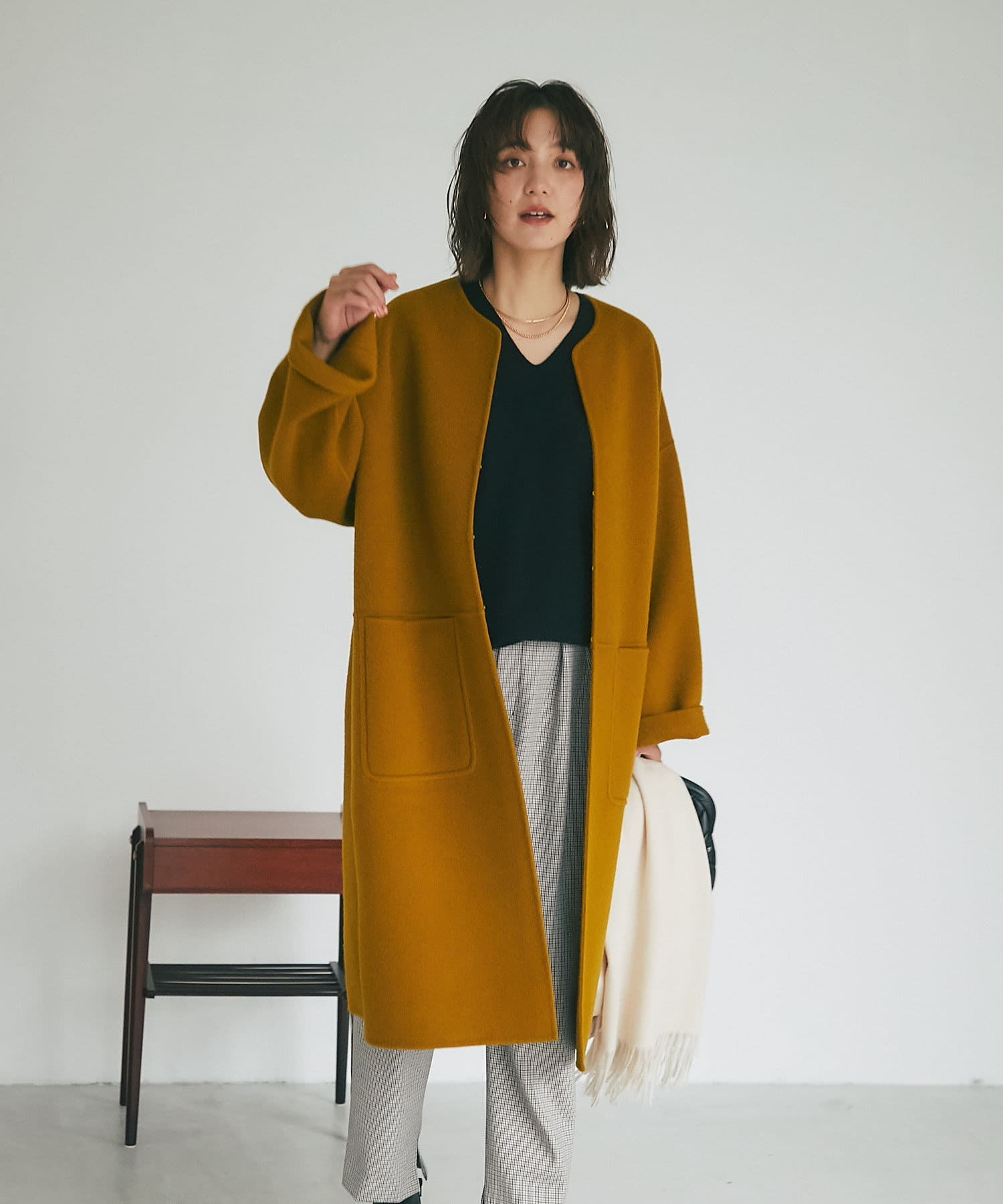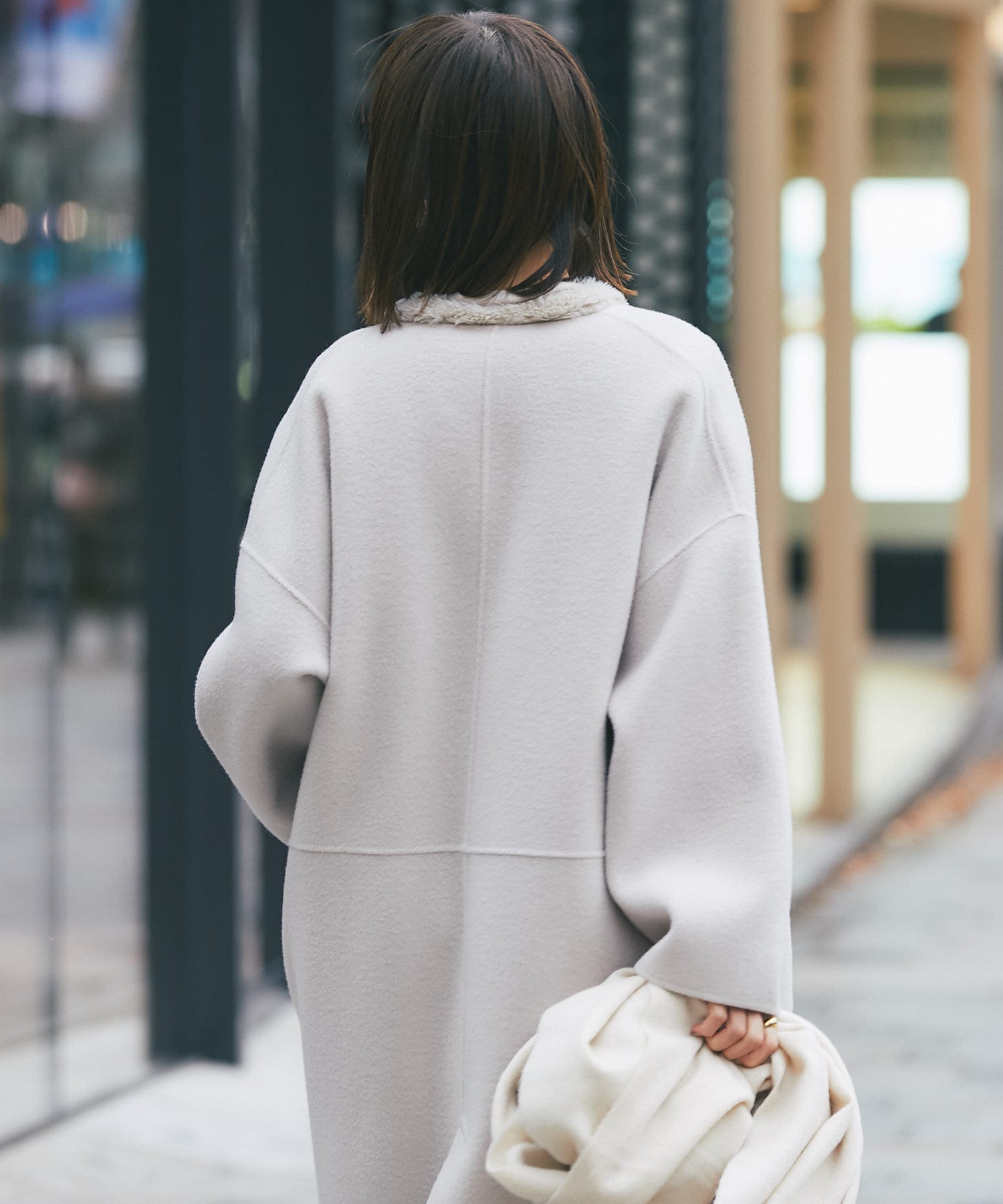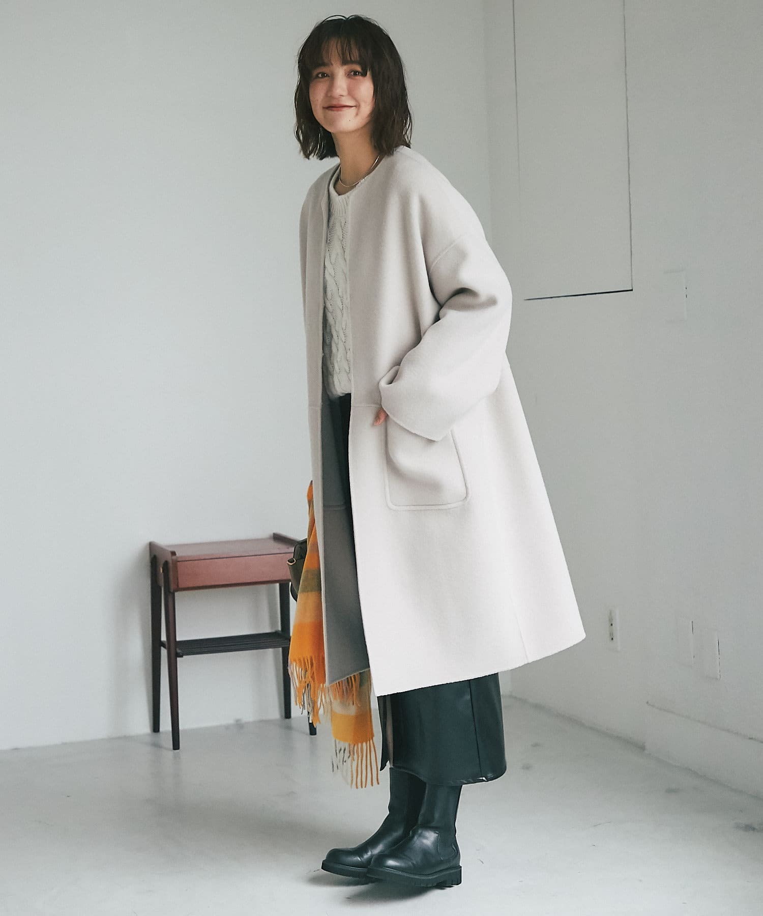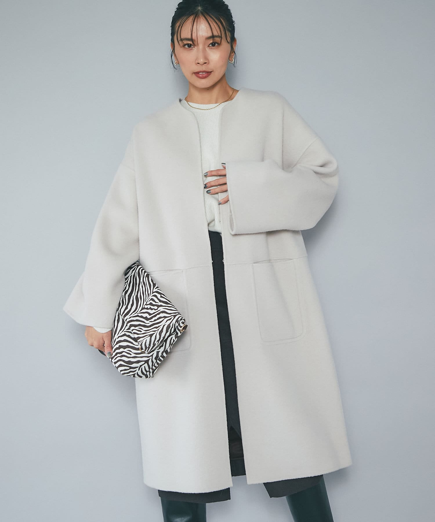 たっぷりした身幅は厚手のニットやインナーダウンと重ねても着膨れしにくく、シーズンを通してマルチに活用していただけます。                                                                      スタンダードなノーカラーデザインはインナーを選ばず、小物アレンジで印象を変えて着用できるところもポイント。                                                                             キレイめからカジュアルまで幅広く着用していただけます。