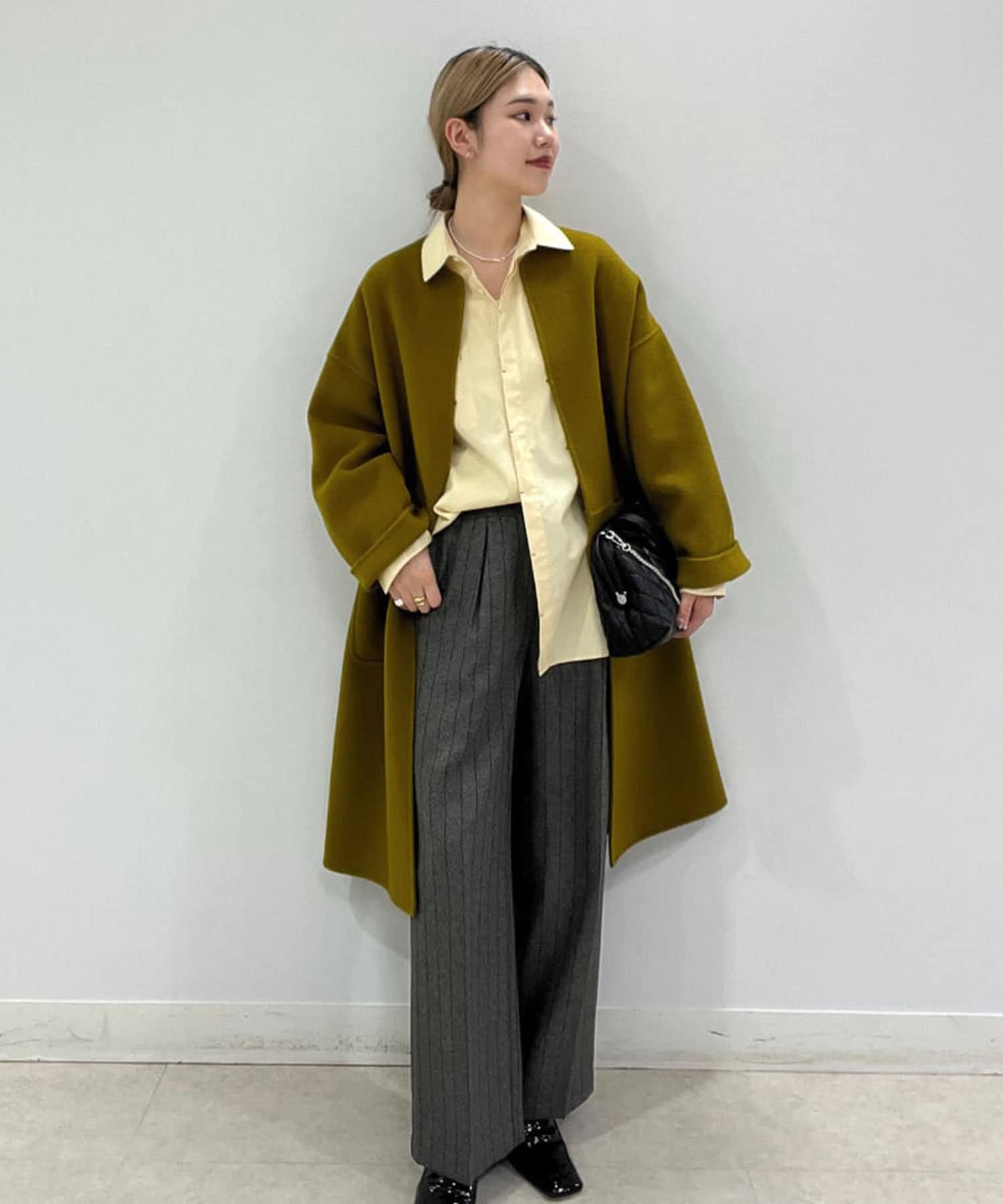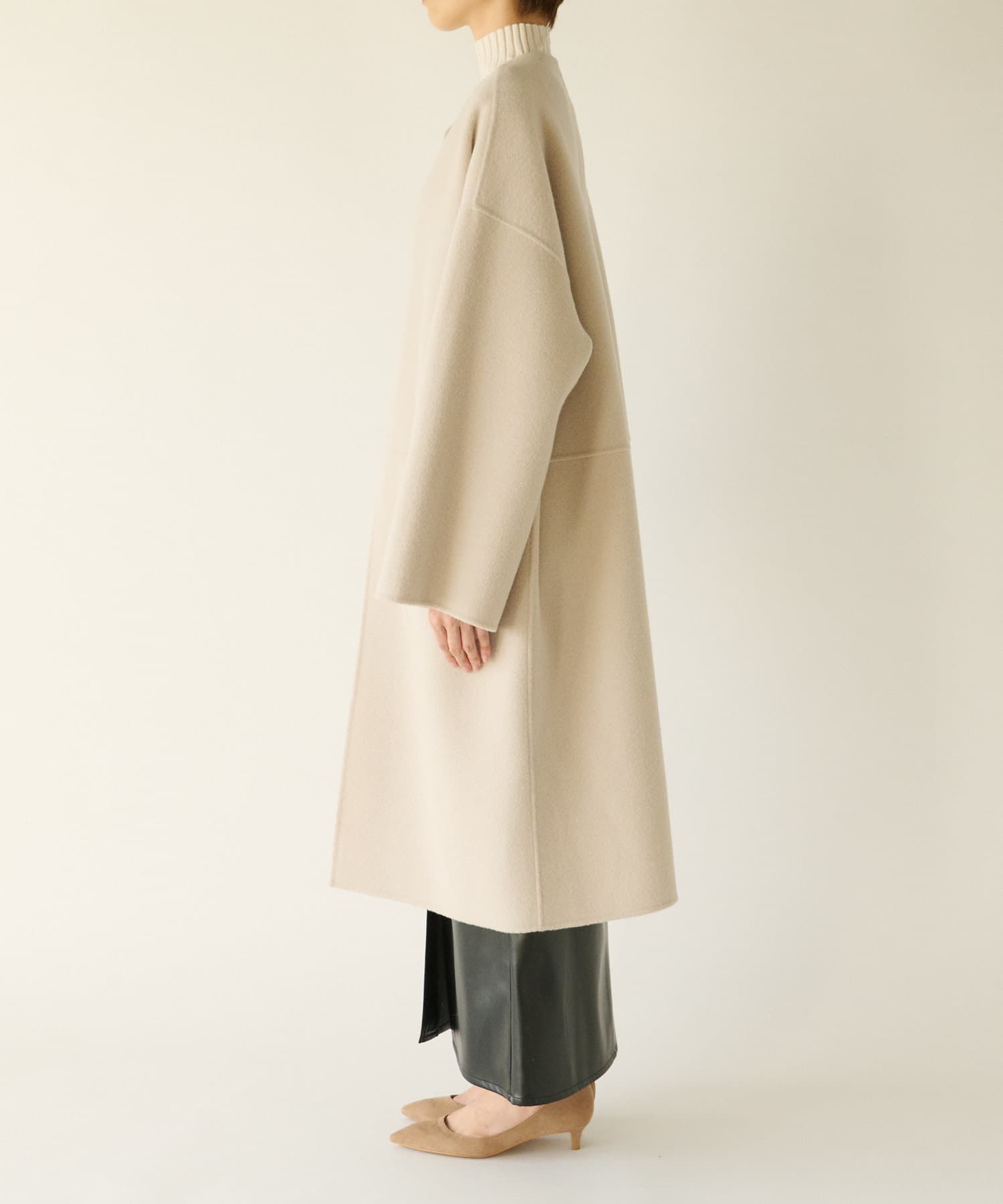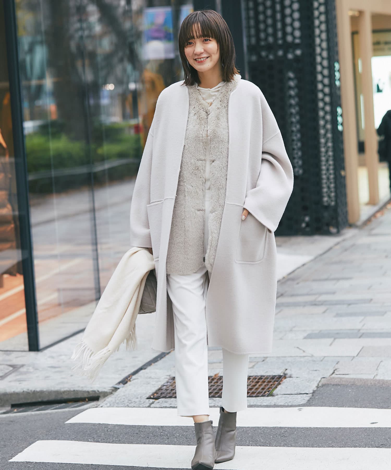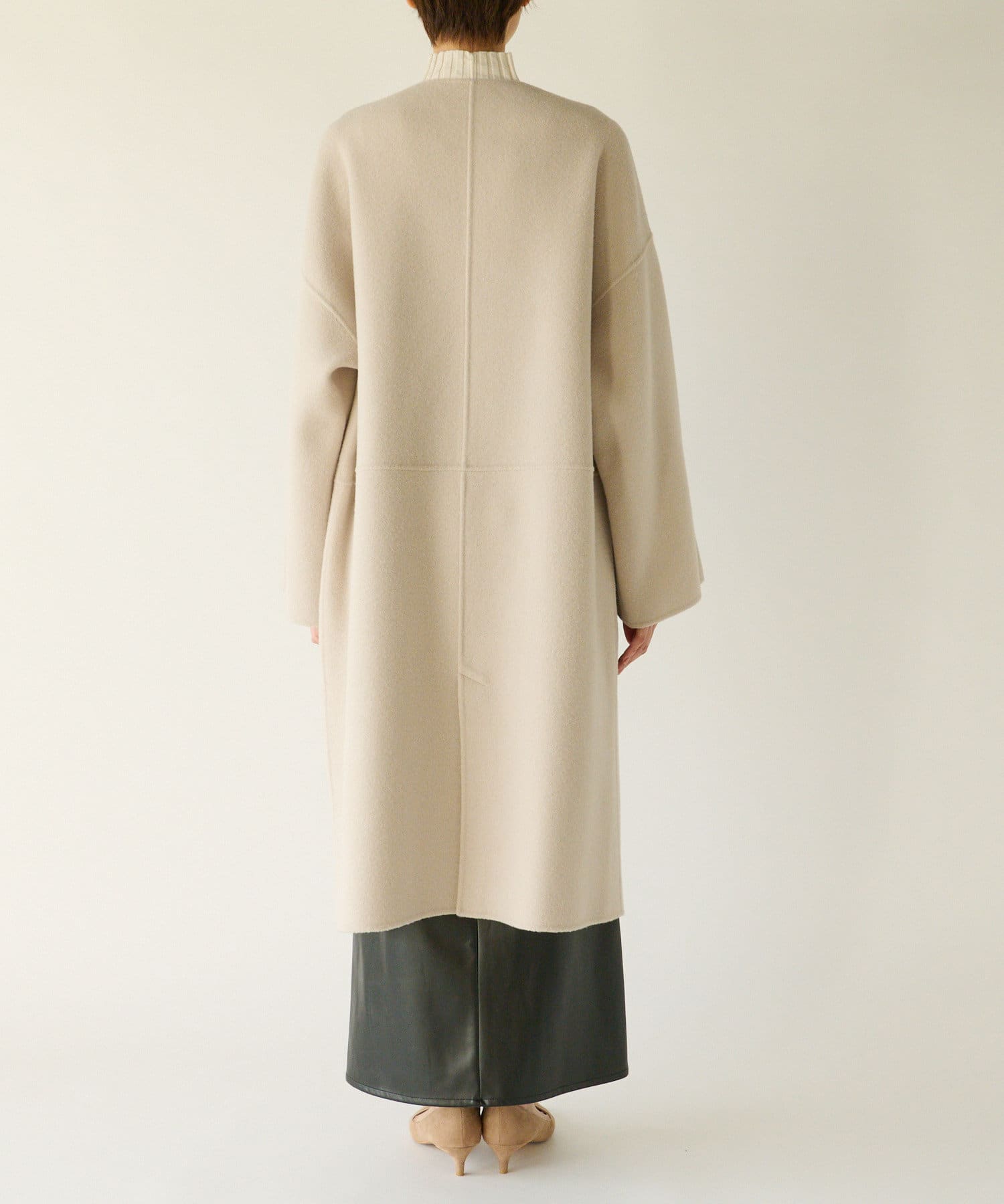 たっぷりした身幅は厚手のニットやインナーダウンと重ねても着膨れしにくく、シーズンを通してマルチに活用していただけます。                                                                      スタンダードなノーカラーデザインはインナーを選ばず、小物アレンジで印象を変えて着用できるところもポイント。                                                                             キレイめからカジュアルまで幅広く着用していただけます。