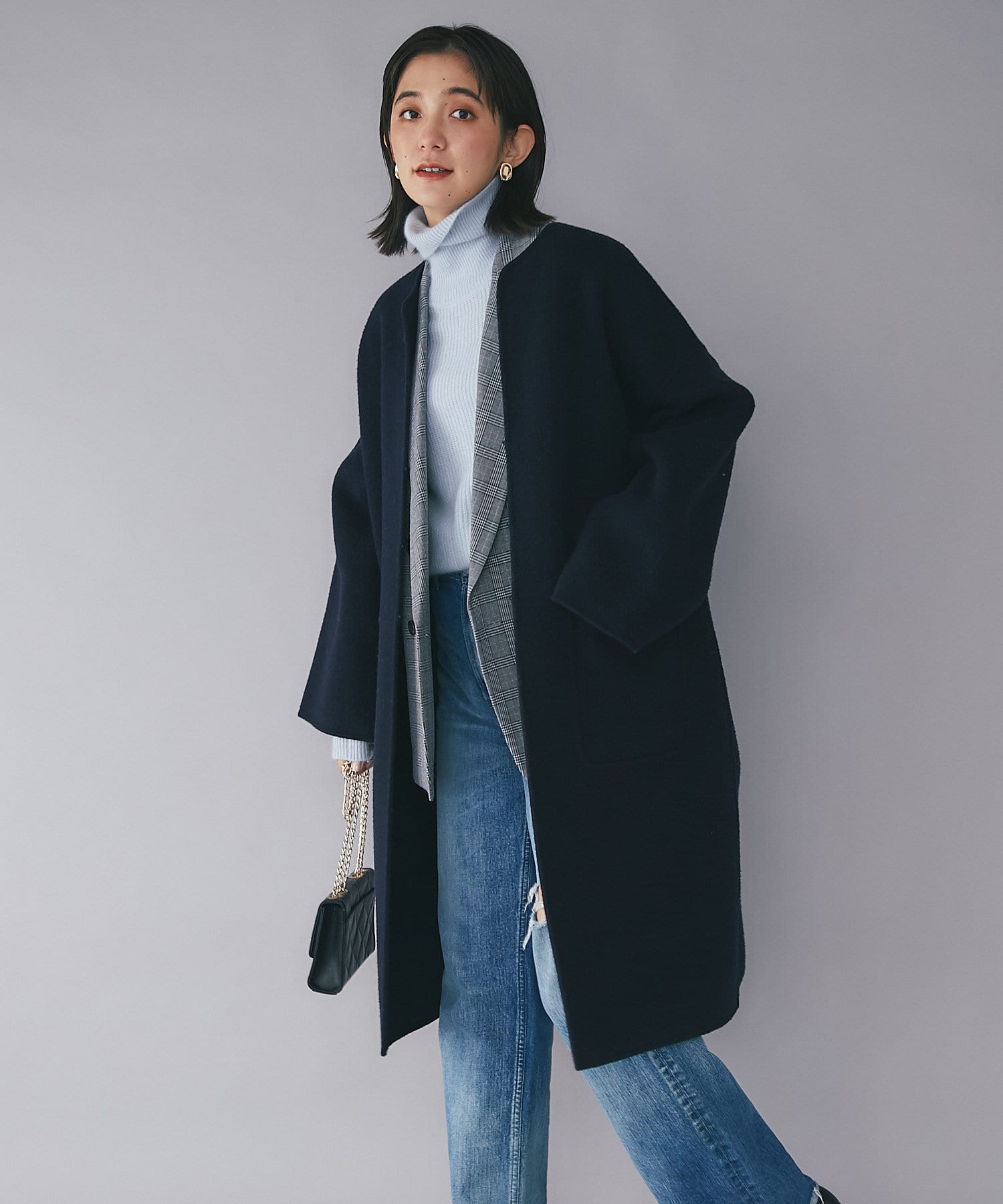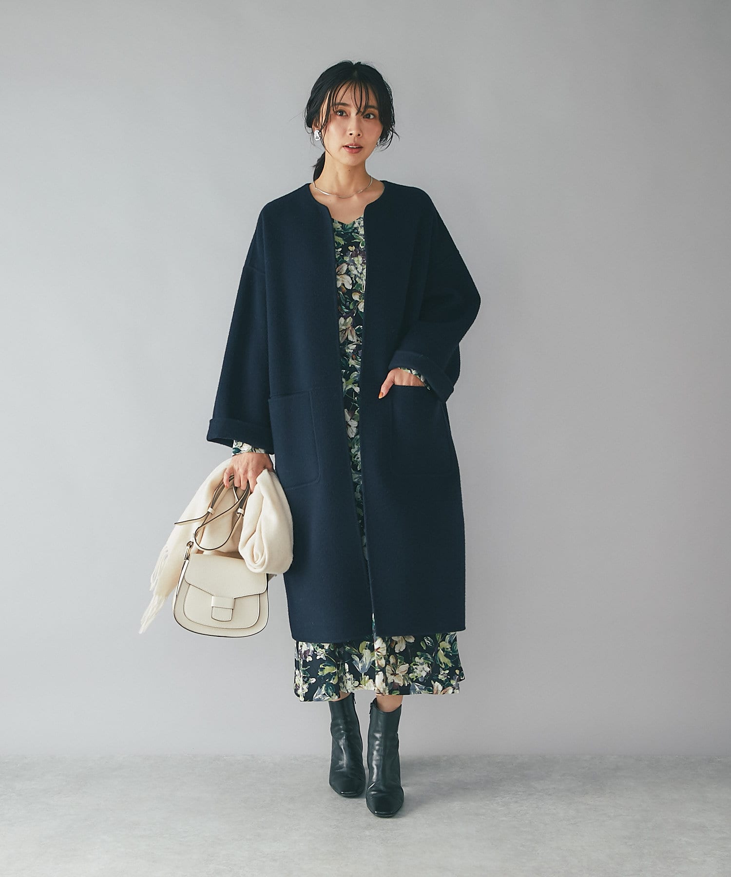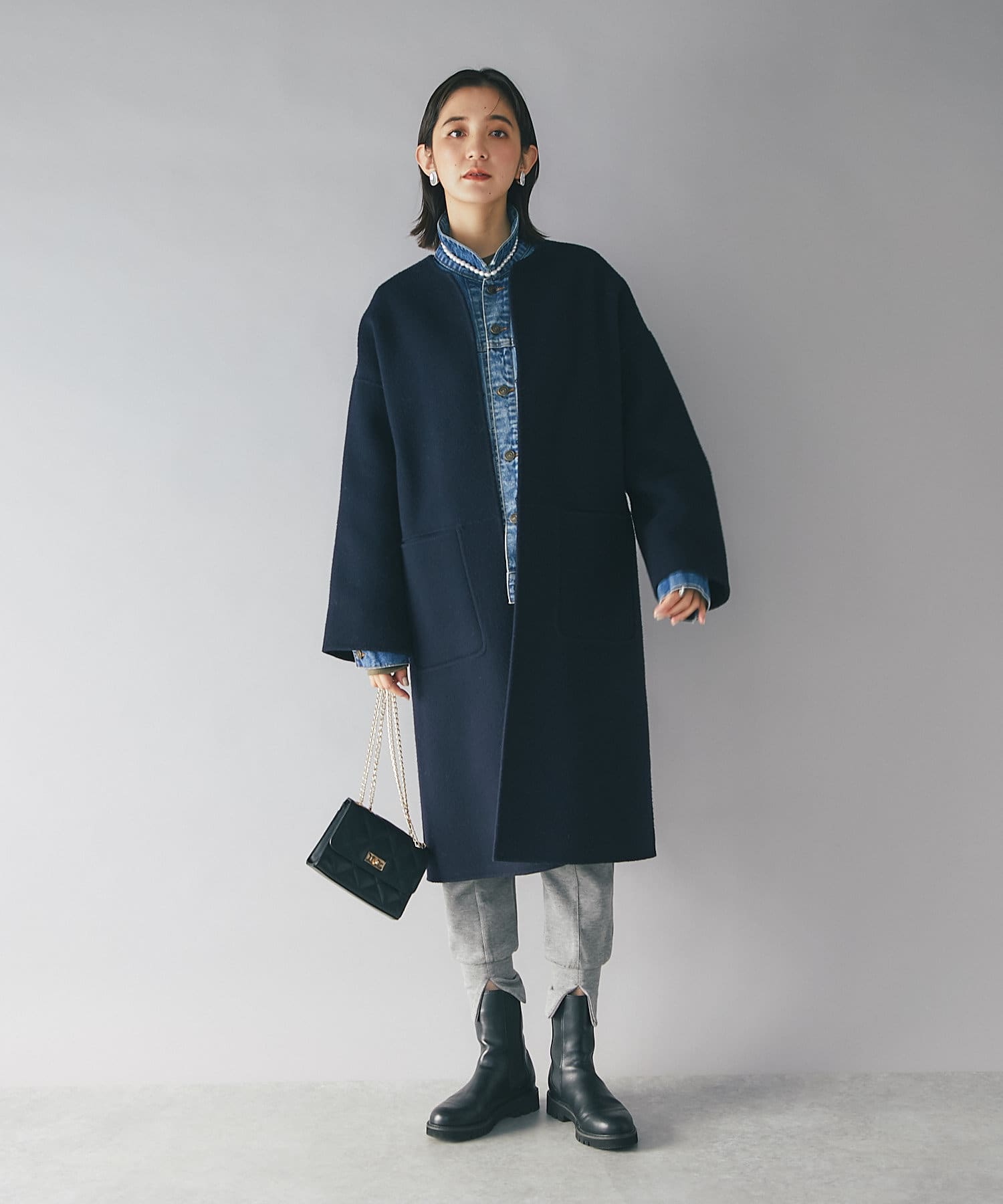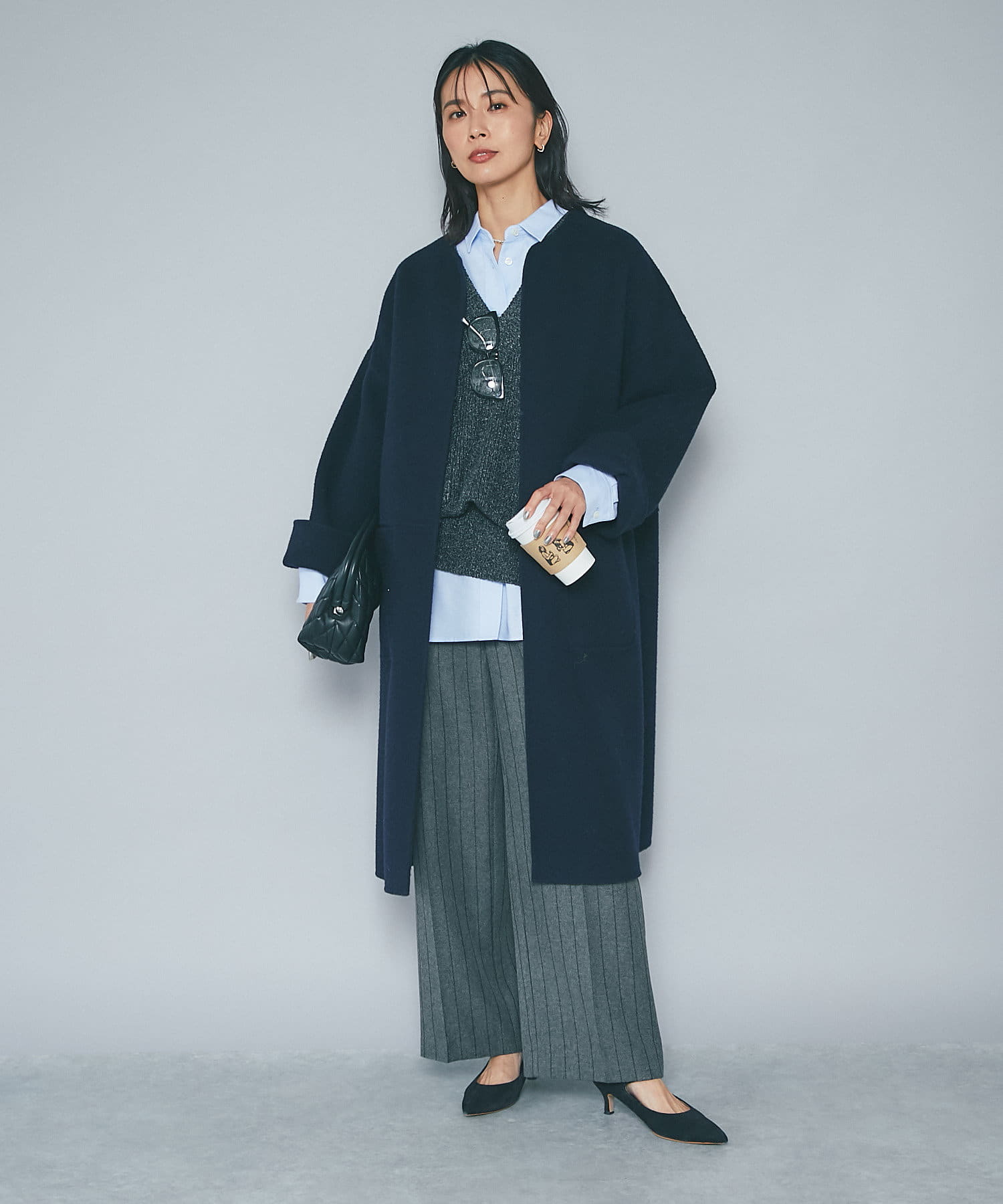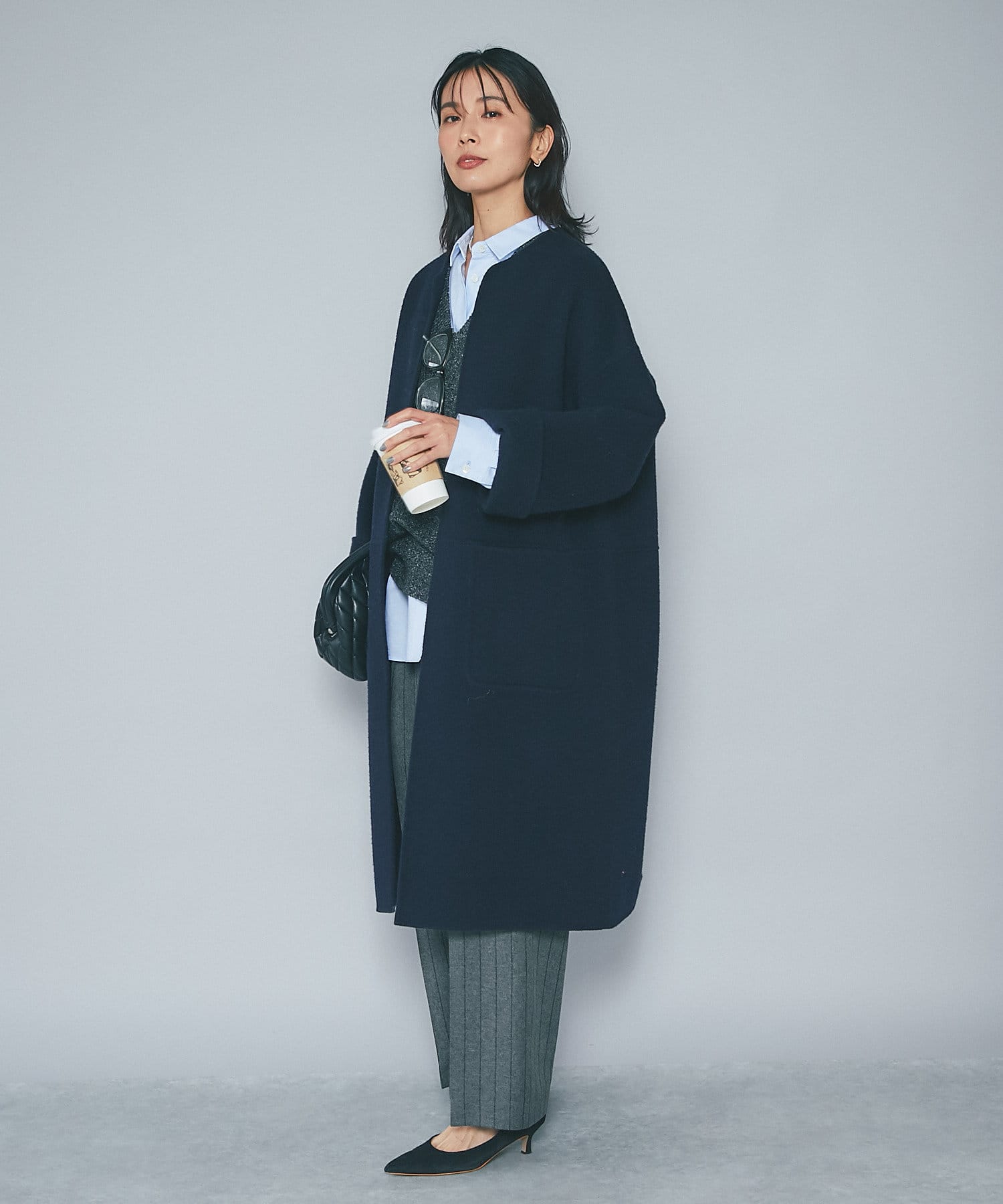 ⇒ノーカラーできれい見えするコートのため、オフィススタイルとの相性も抜群です。特にベーシックカラーのネイビー/ベージュは合わせやすくオンオフ問わず様々なシーンで着ていただけます。