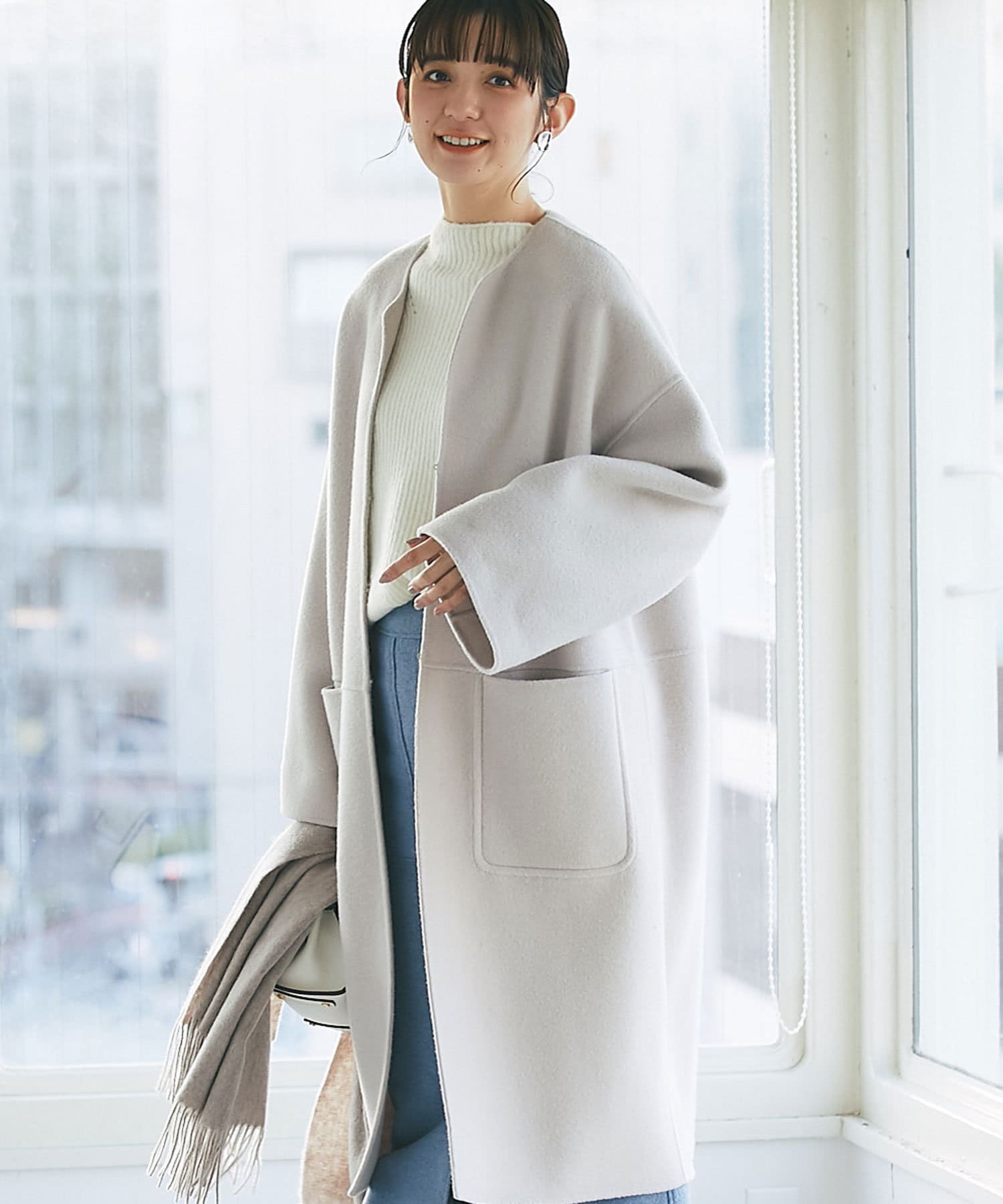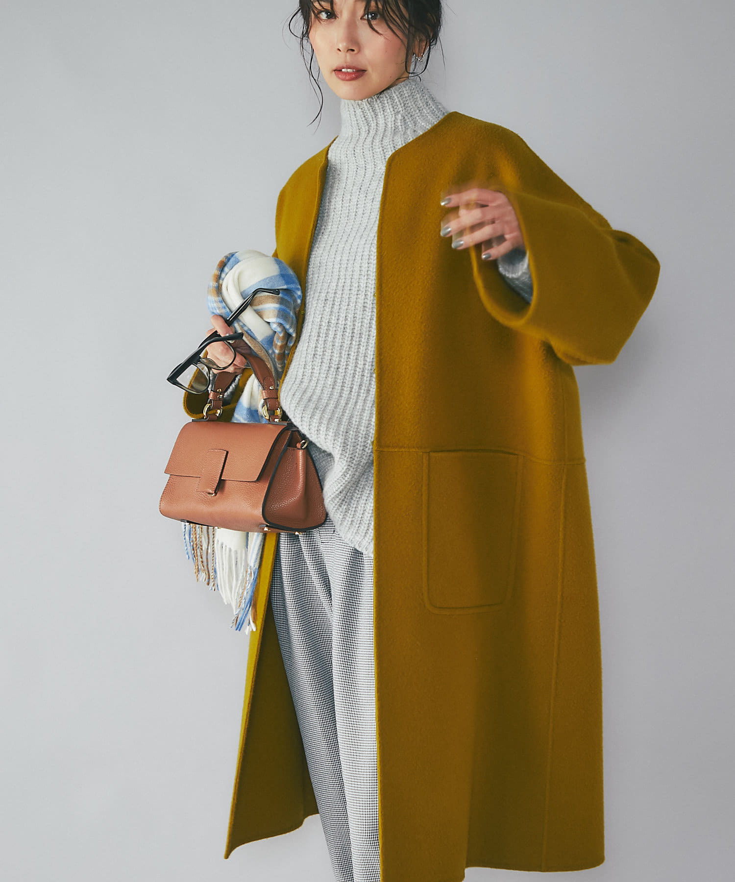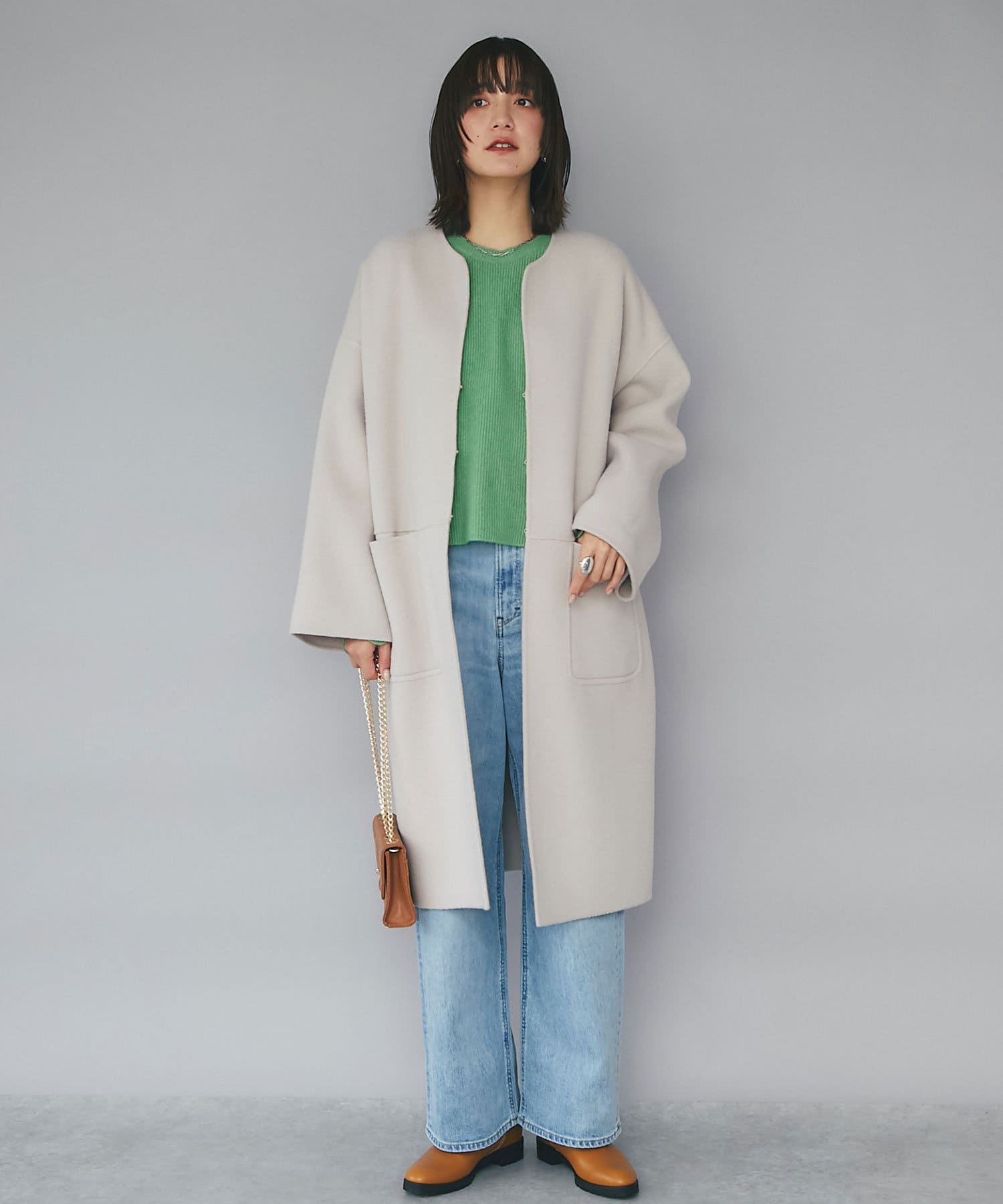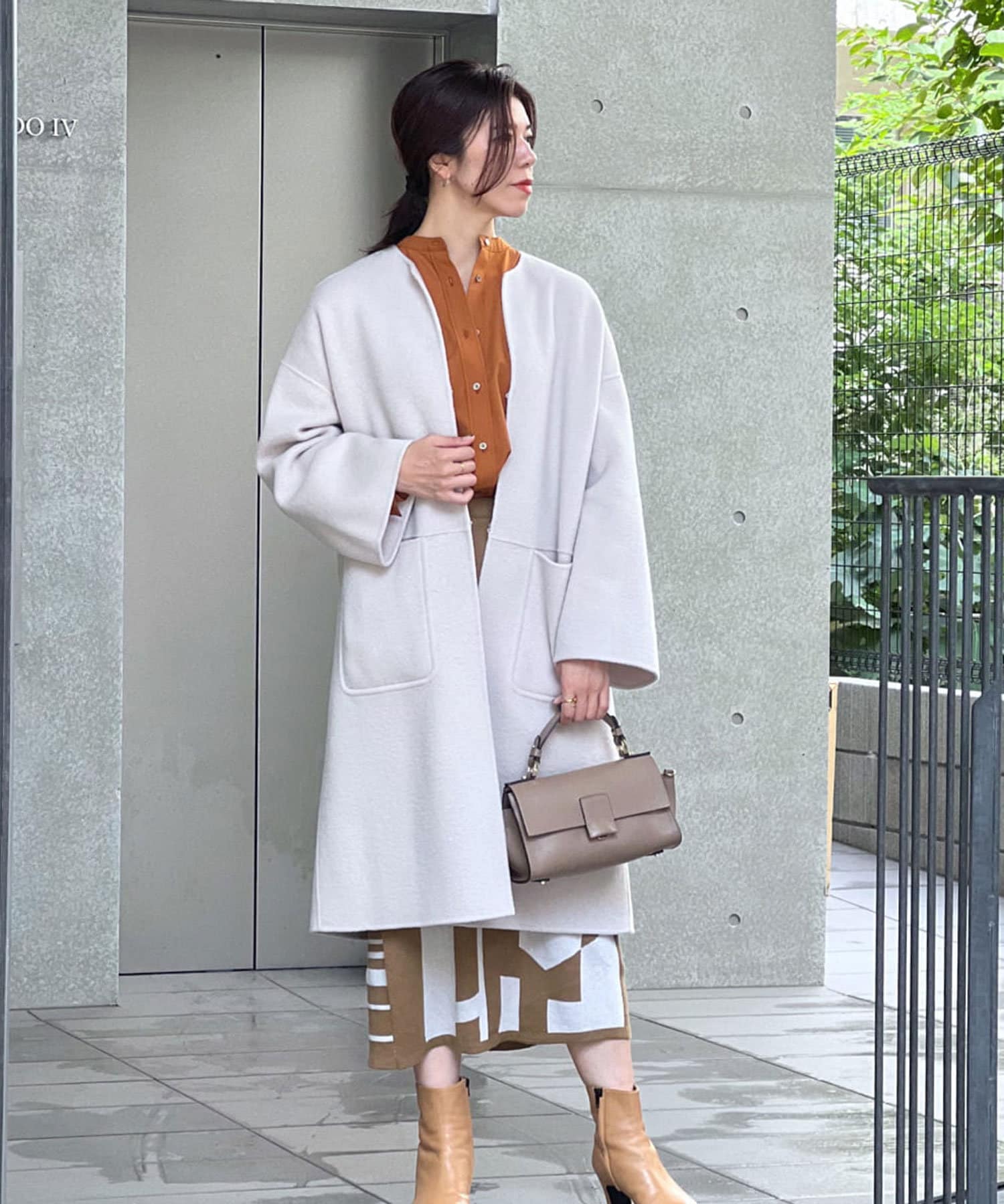 ⇒ノーカラーできれい見えするコートのため、オフィススタイルとの相性も抜群です。特にベーシックカラーのネイビー/ベージュは合わせやすくオンオフ問わず様々なシーンで着ていただけます。