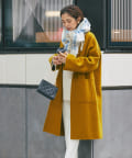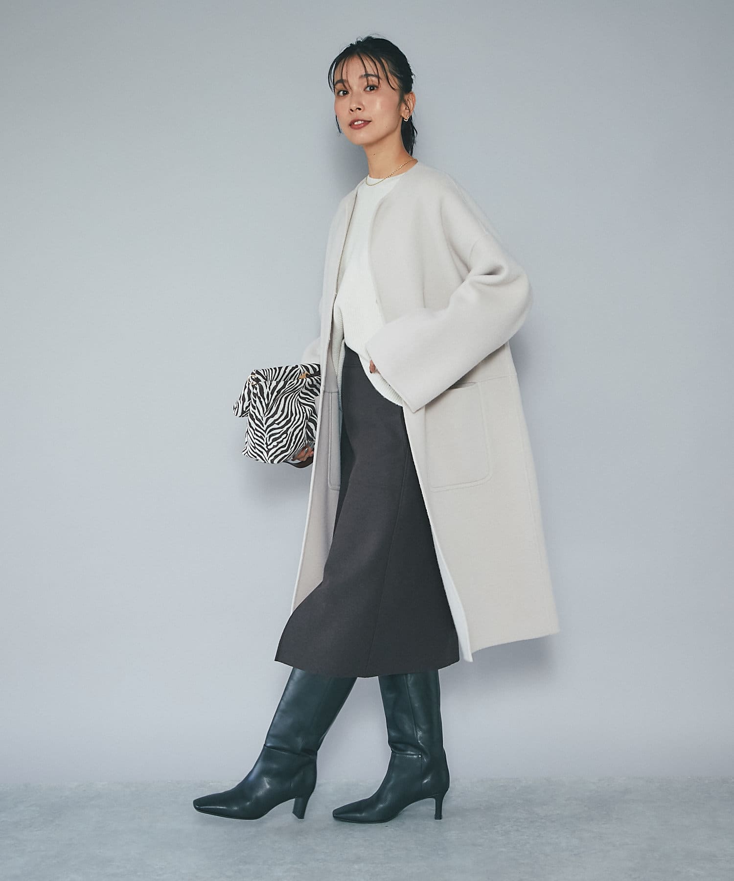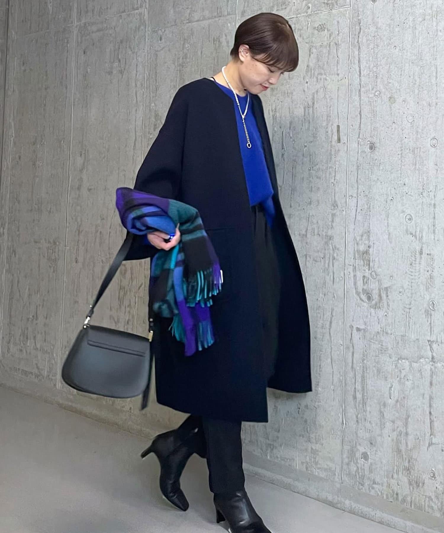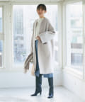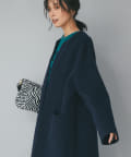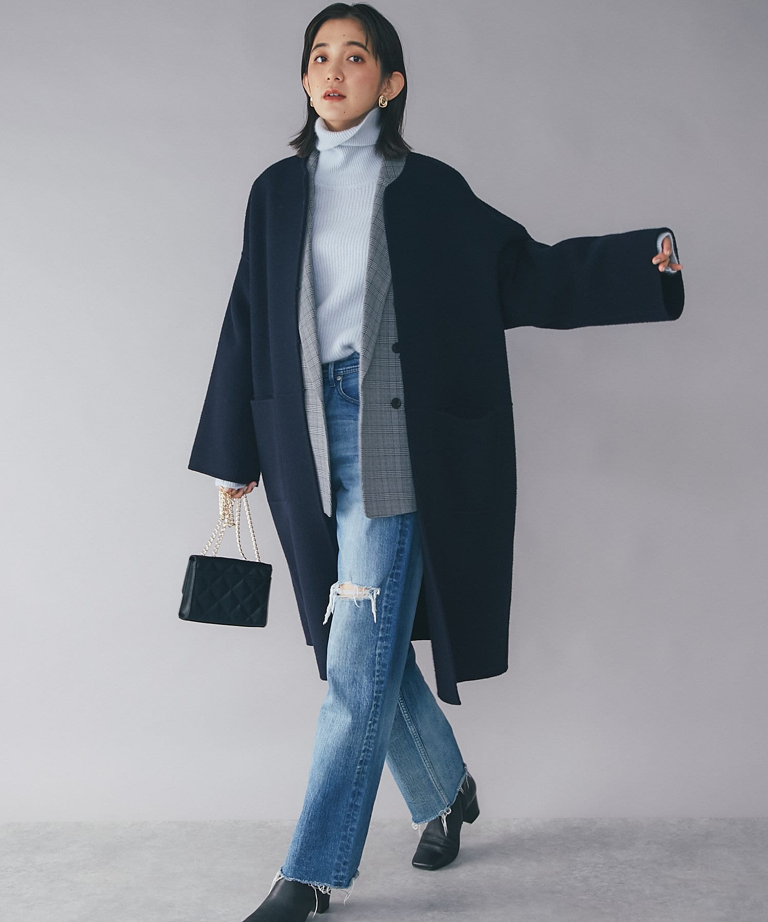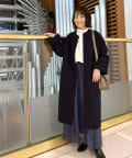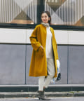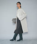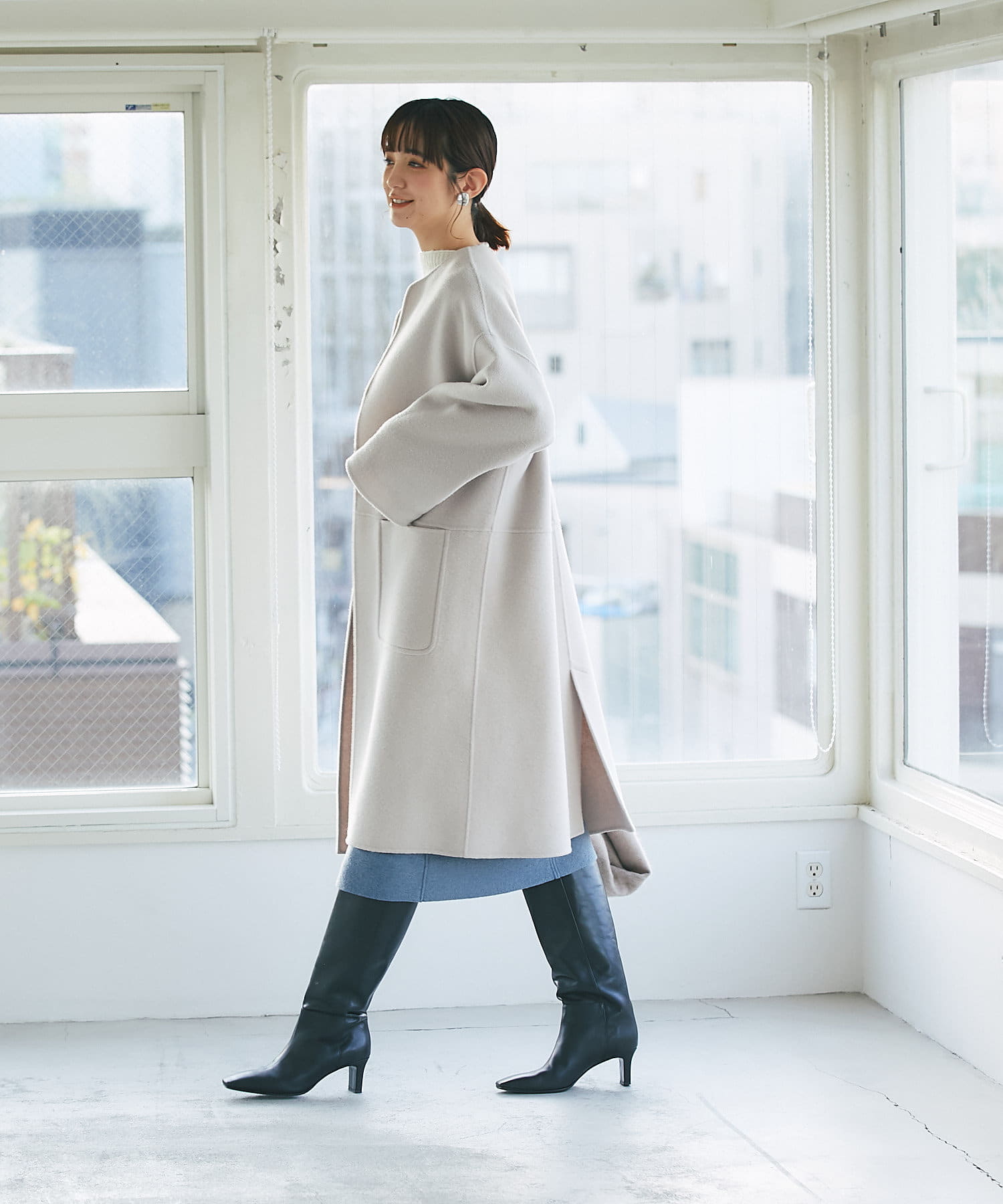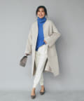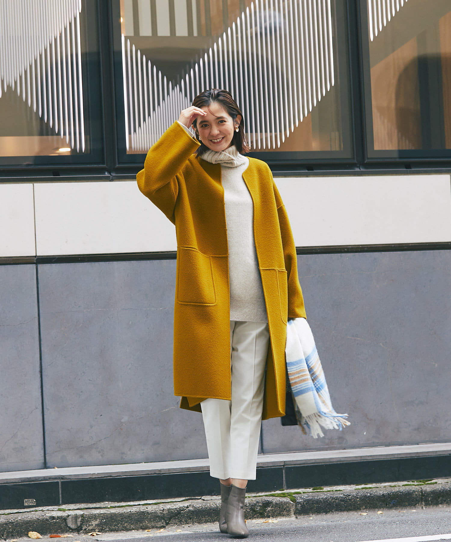 ⇒ノーカラーできれい見えするコートのため、オフィススタイルとの相性も抜群です。特にベーシックカラーのネイビー/ベージュは合わせやすくオンオフ問わず様々なシーンで着ていただけます。
