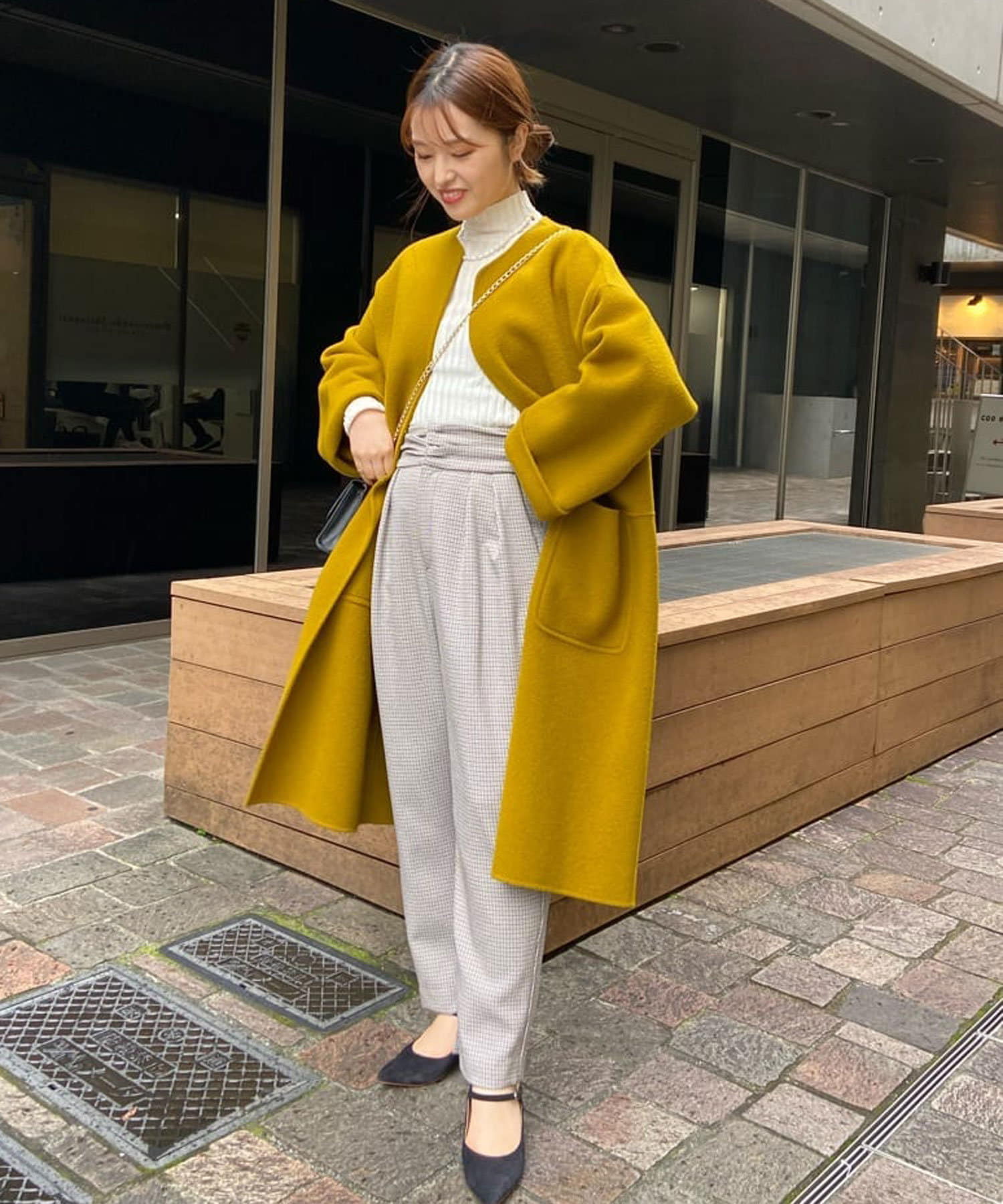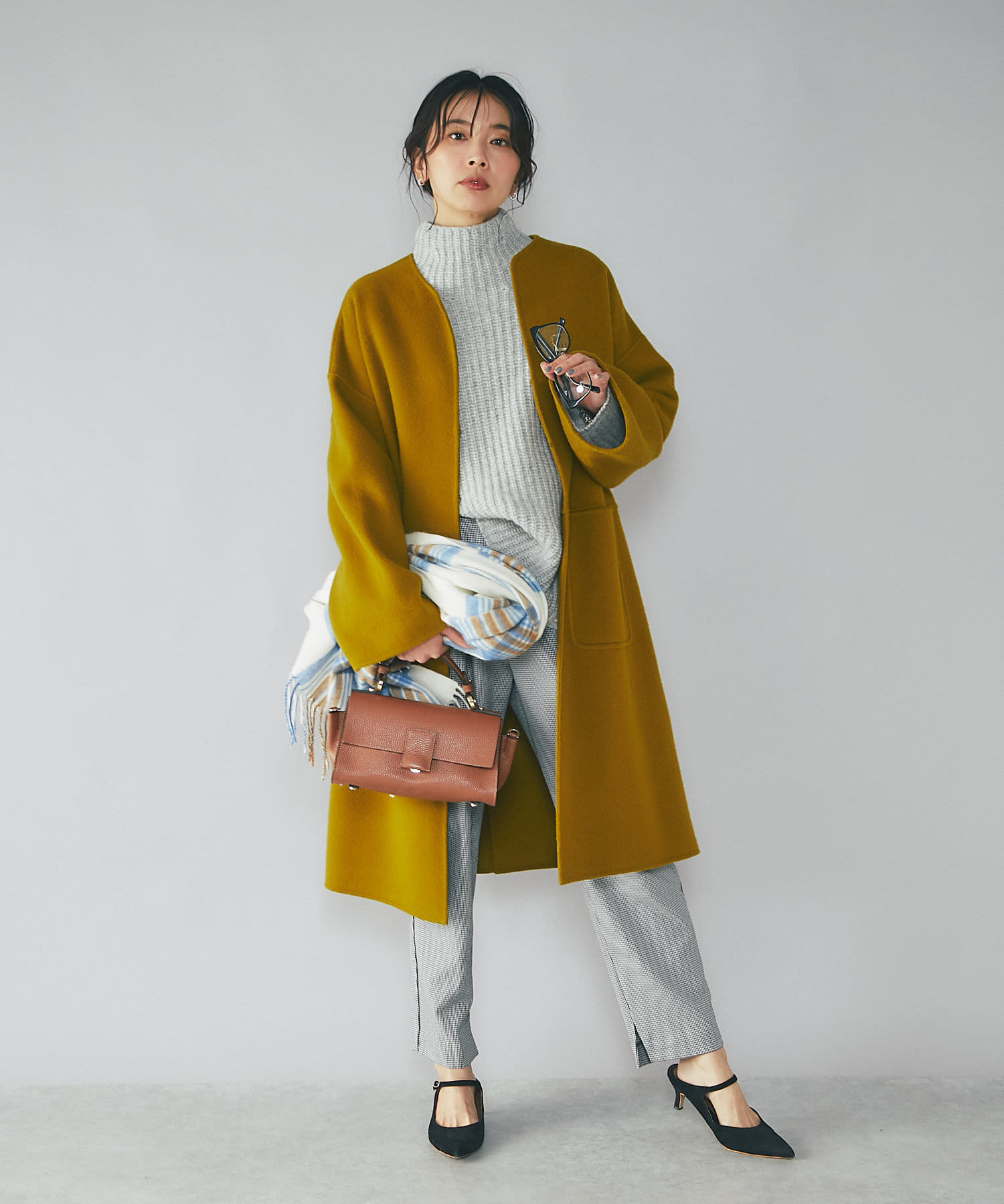 また、冬のコーディネートに映えるピスタチオはベーシックカラーやデニムなどのインナーをチョイスし、こなれ感をプラスすると素敵に着こなして頂けます。