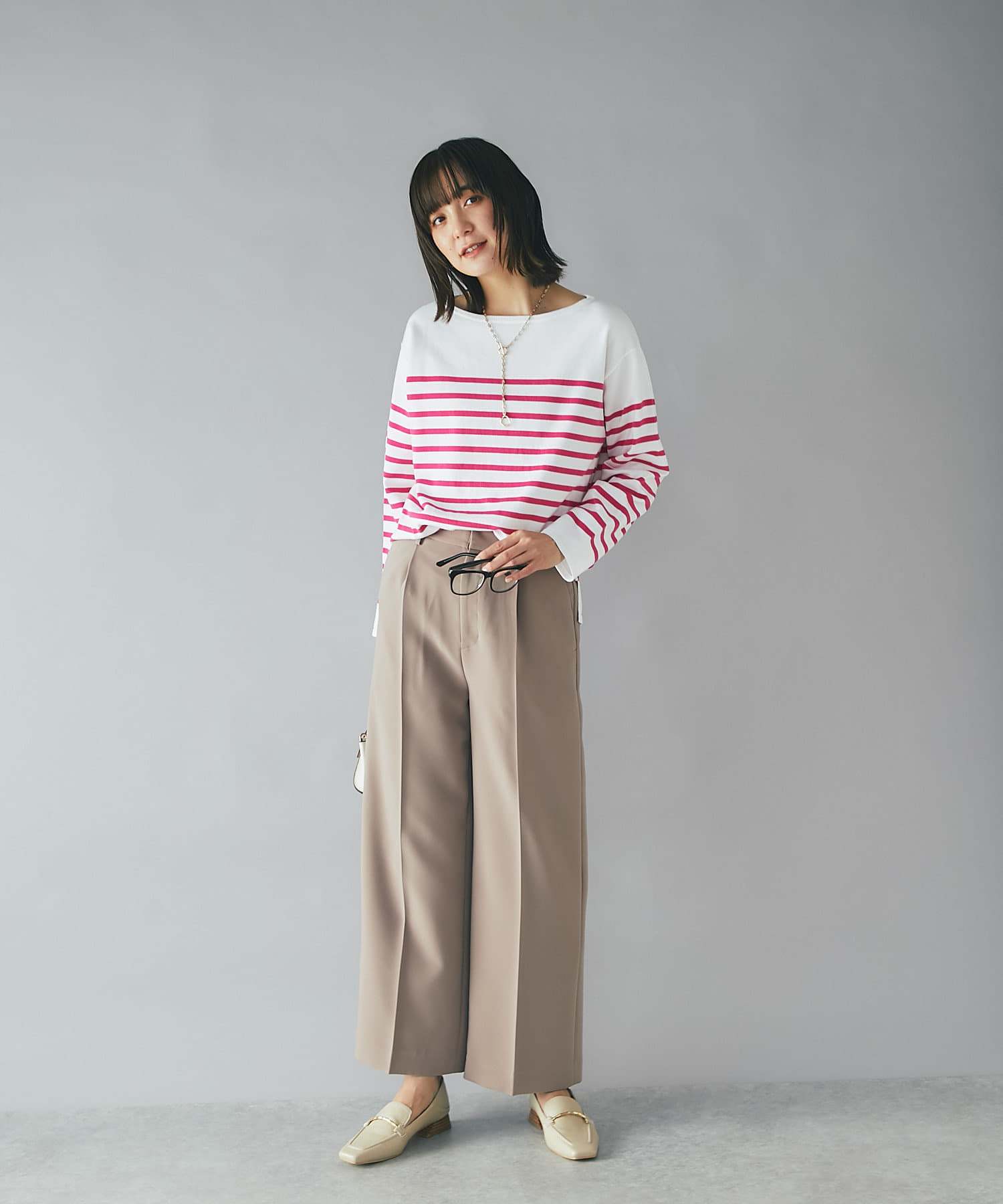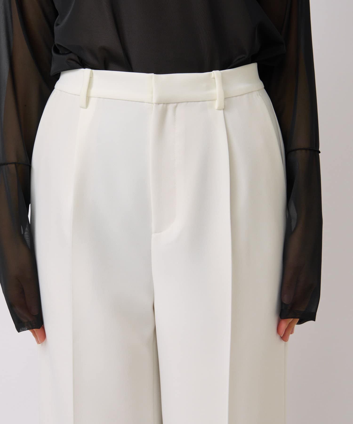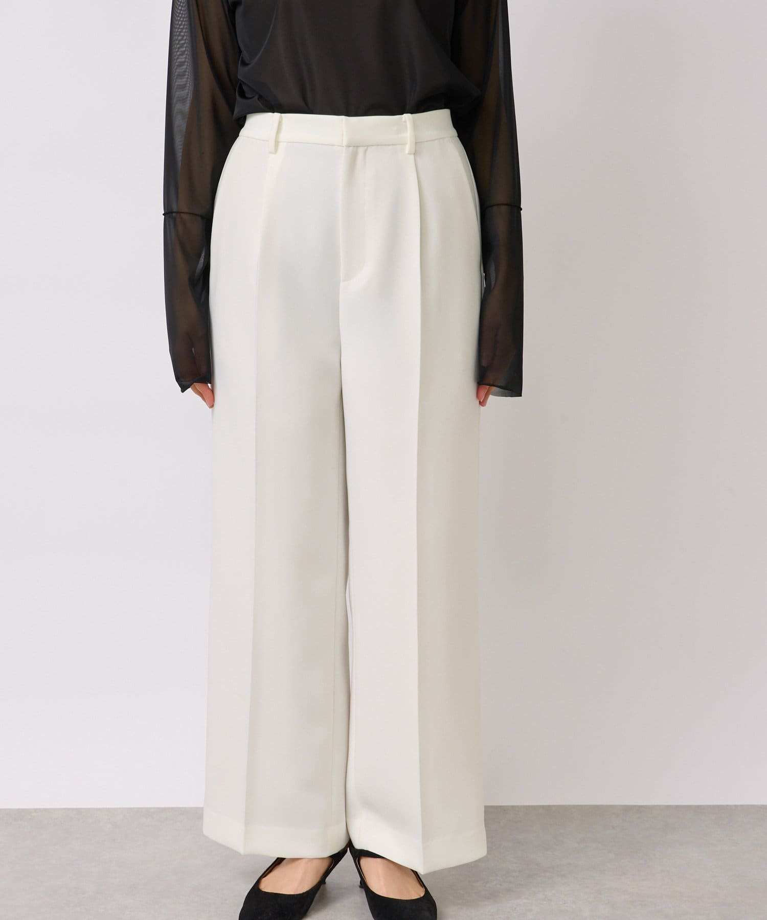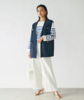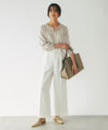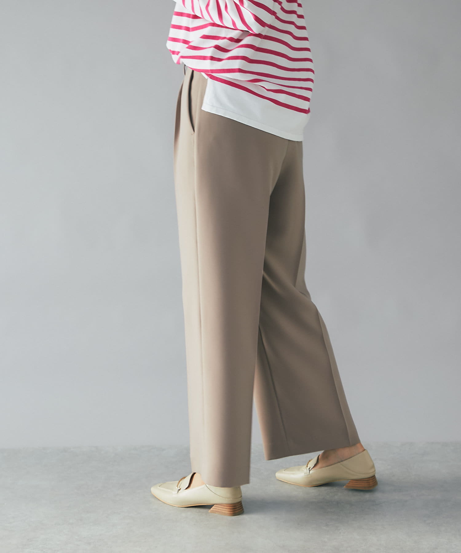 センタープレスを施し、ボリュームを抑えたすっきりしたワイドパンツで、トップスはコンパクトなものからオーバーサイズなものまで選ばず合わせられるので着回しが効くのも嬉しいポイント。