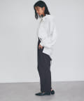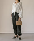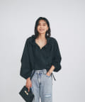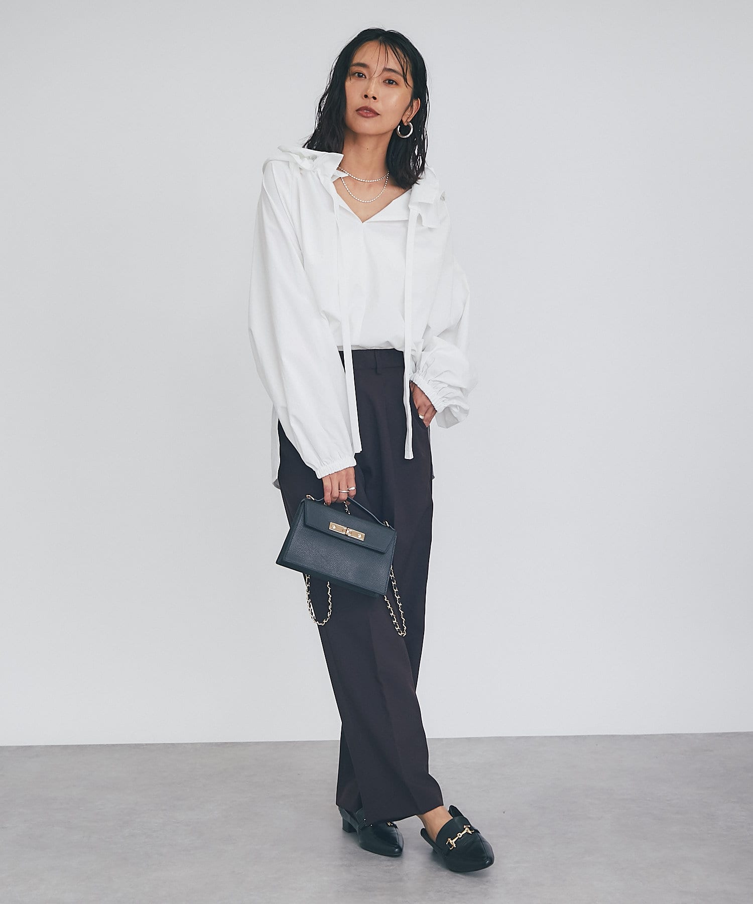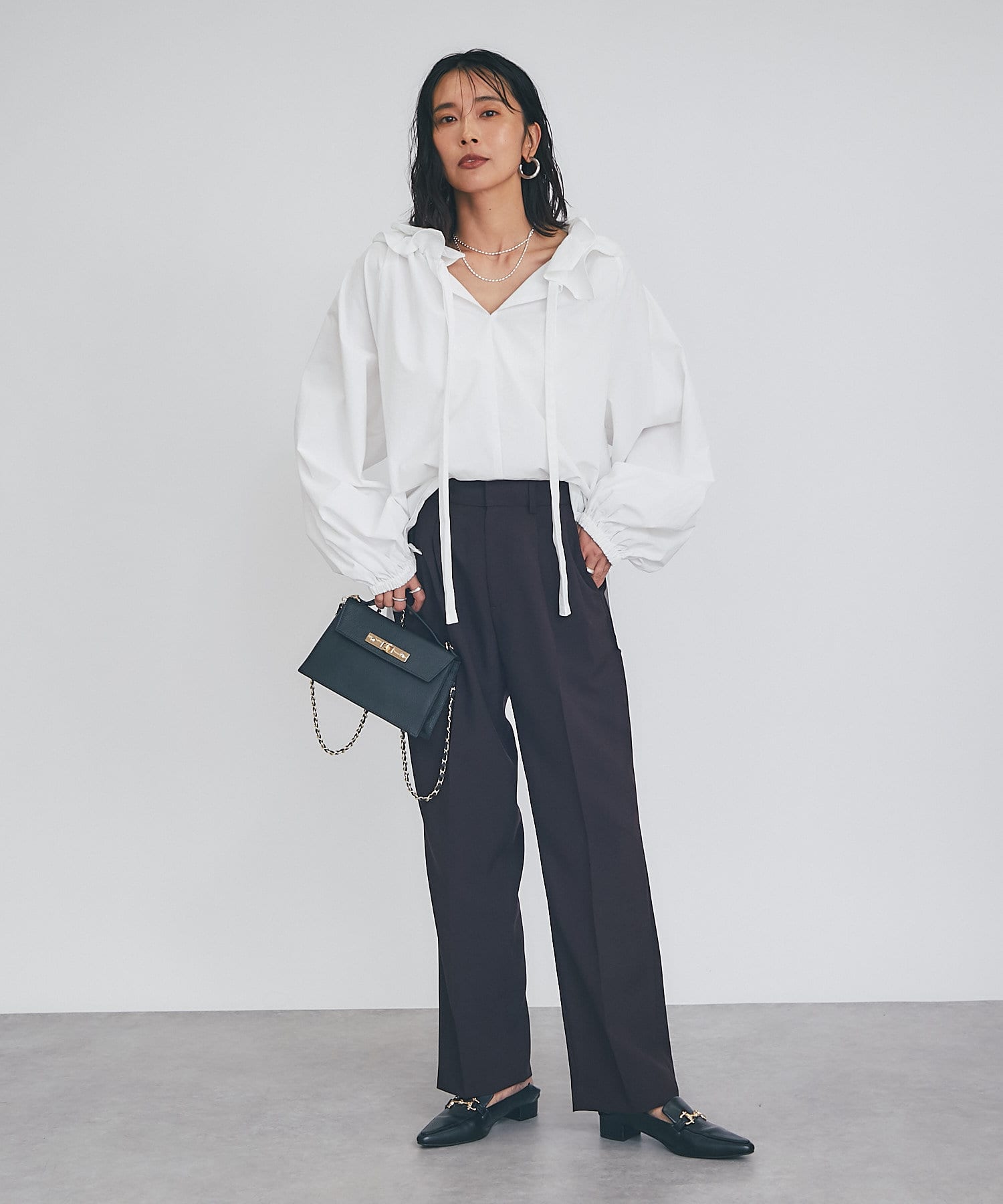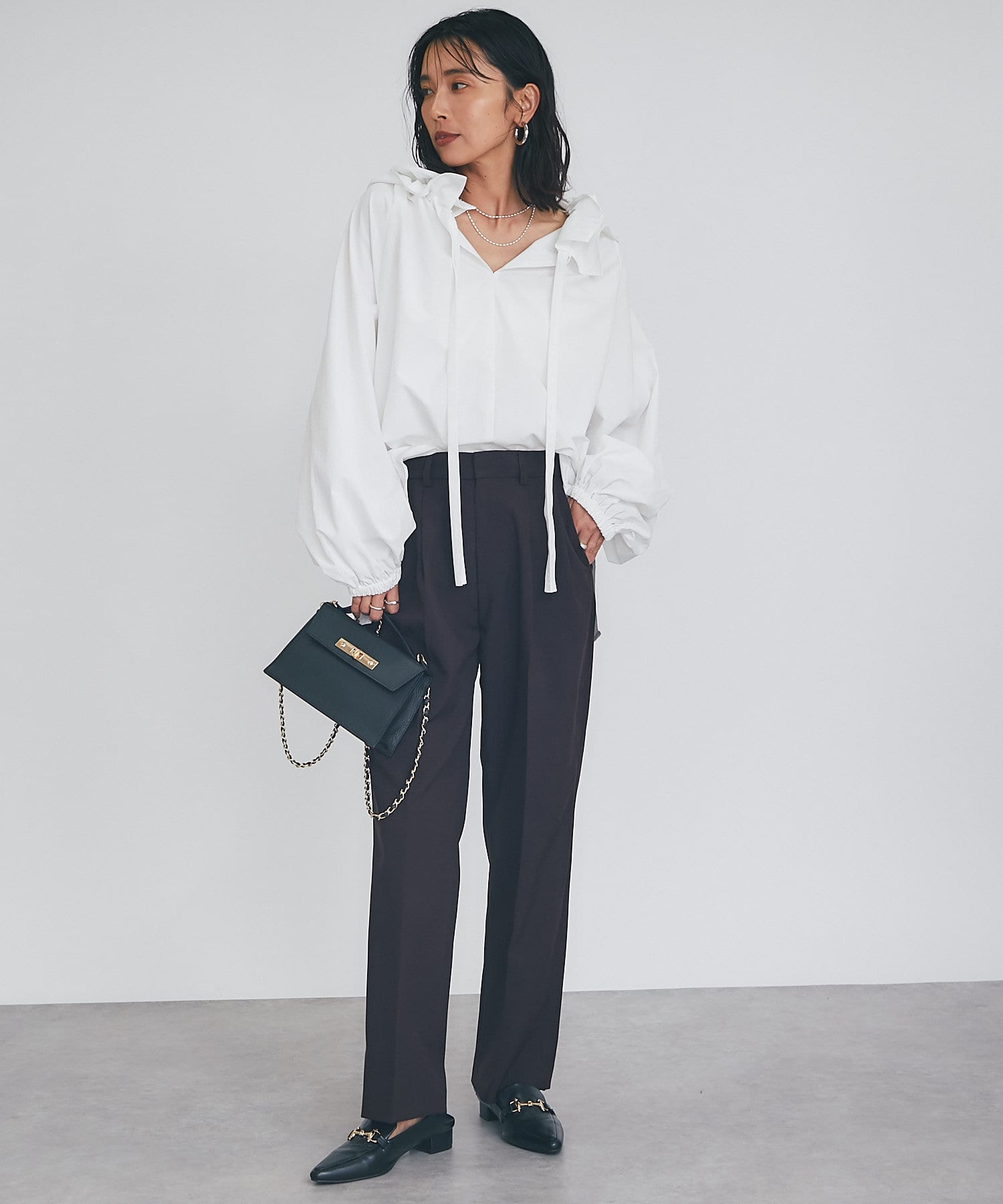 ⇒襟元のギャザーが特徴的なこちらのブラウス。ノーカラーのジャケットやカーディガンと合わせていただくと、もたつきにくく首元が華やかになって素敵です。パーカーや襟付きのアウターは首元にボリューム感が出すぎてしまう可能性があります。