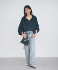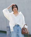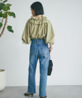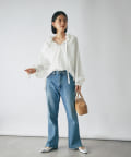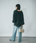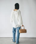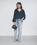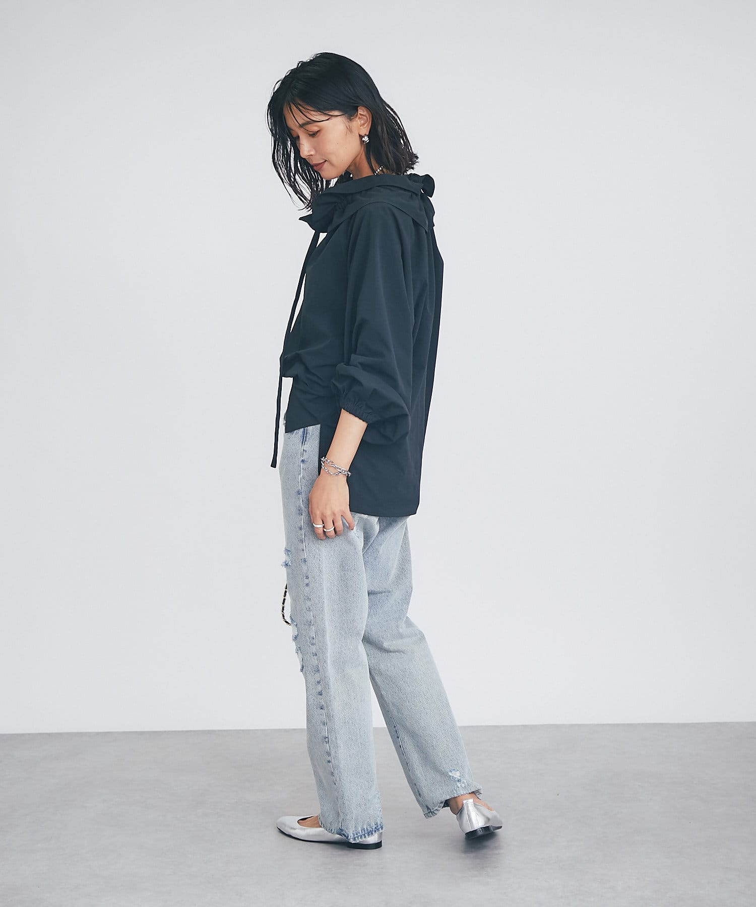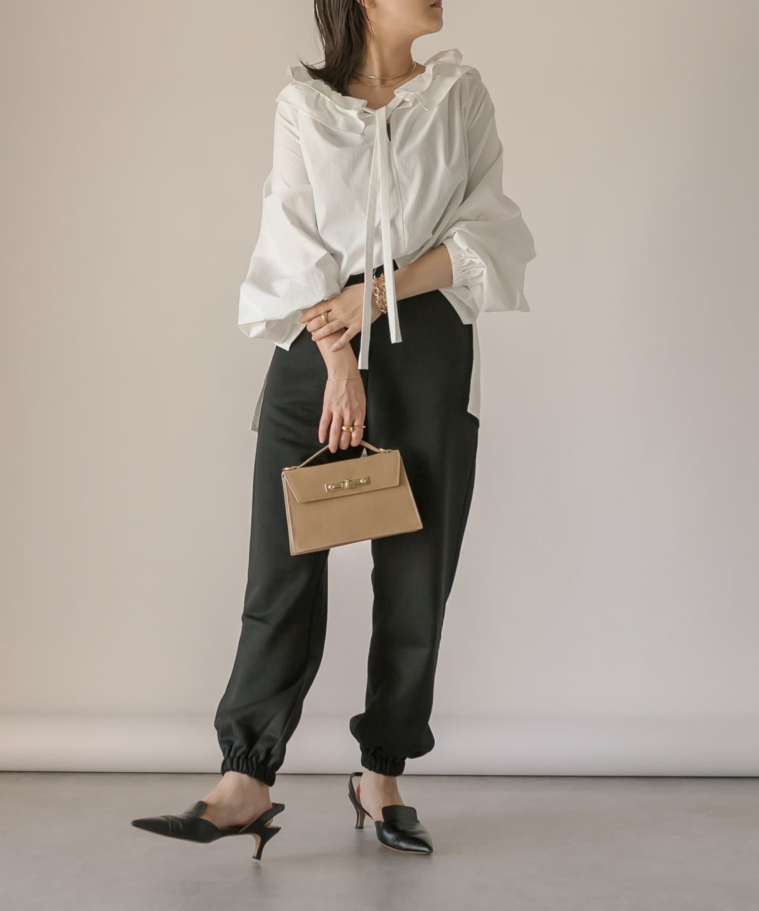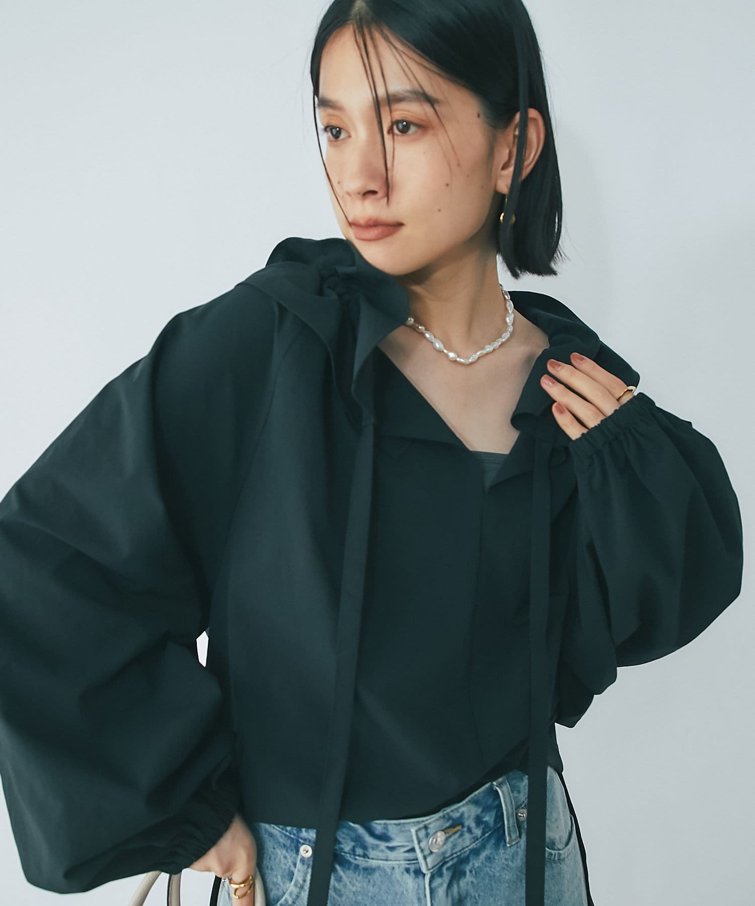 ⇒襟元のギャザーが特徴的なこちらのブラウス。ノーカラーのジャケットやカーディガンと合わせていただくと、もたつきにくく首元が華やかになって素敵です。パーカーや襟付きのアウターは首元にボリューム感が出すぎてしまう可能性があります。