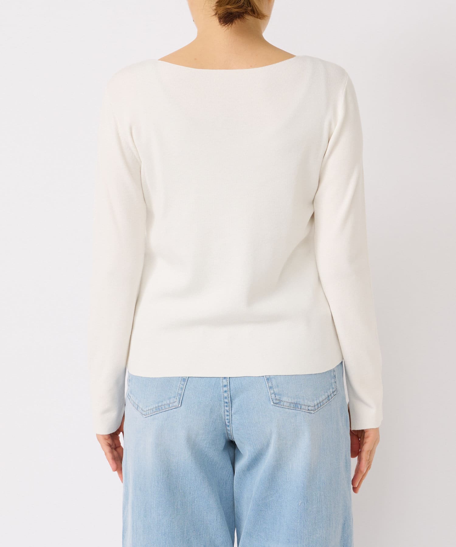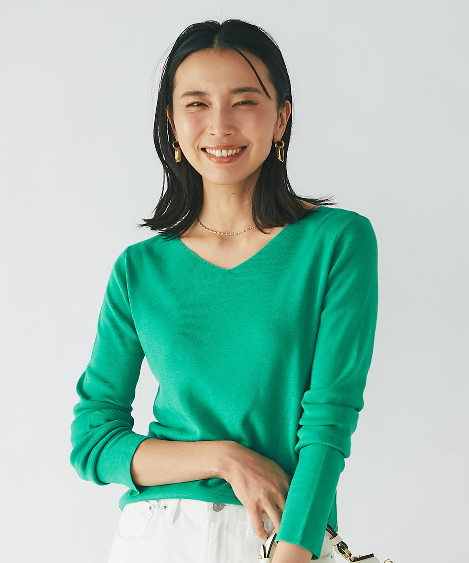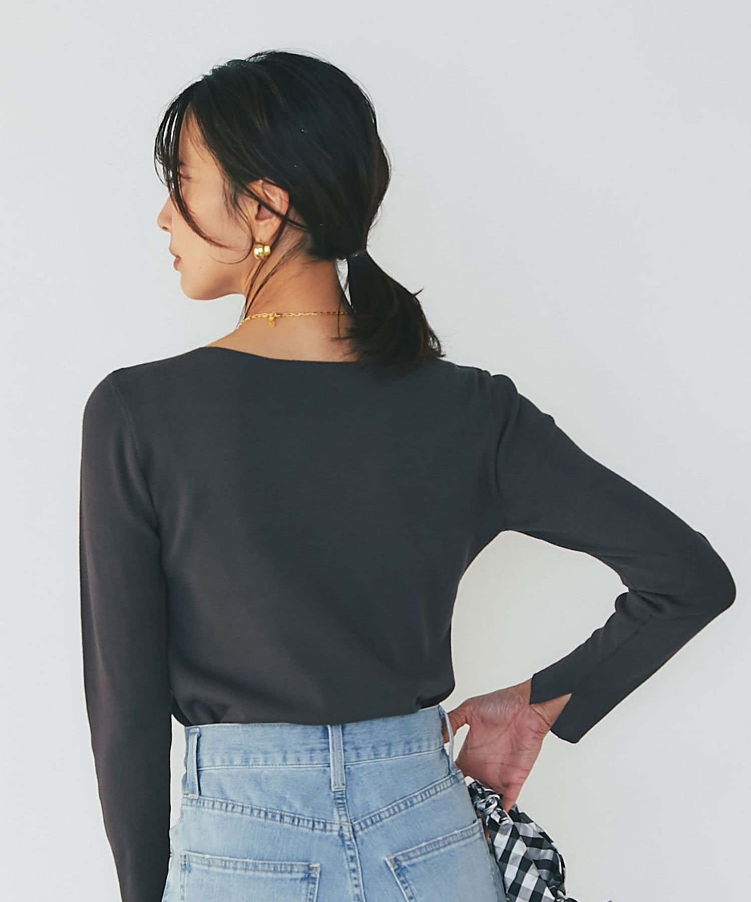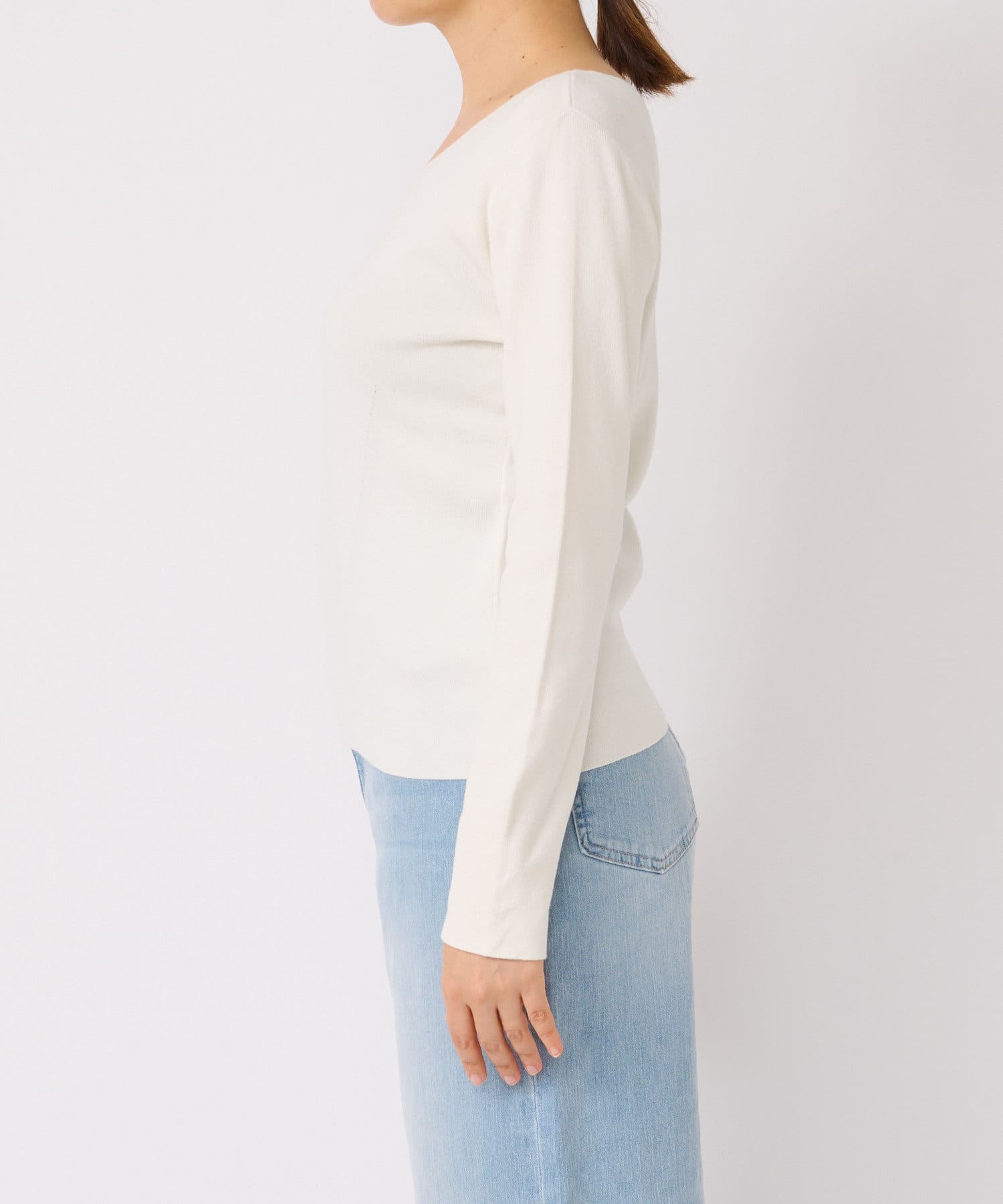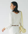 春に活躍するデニムと合わせても、重ための生地感に対し、Vネックのシルエットが軽やかで程よい抜け感をだしてくれます。