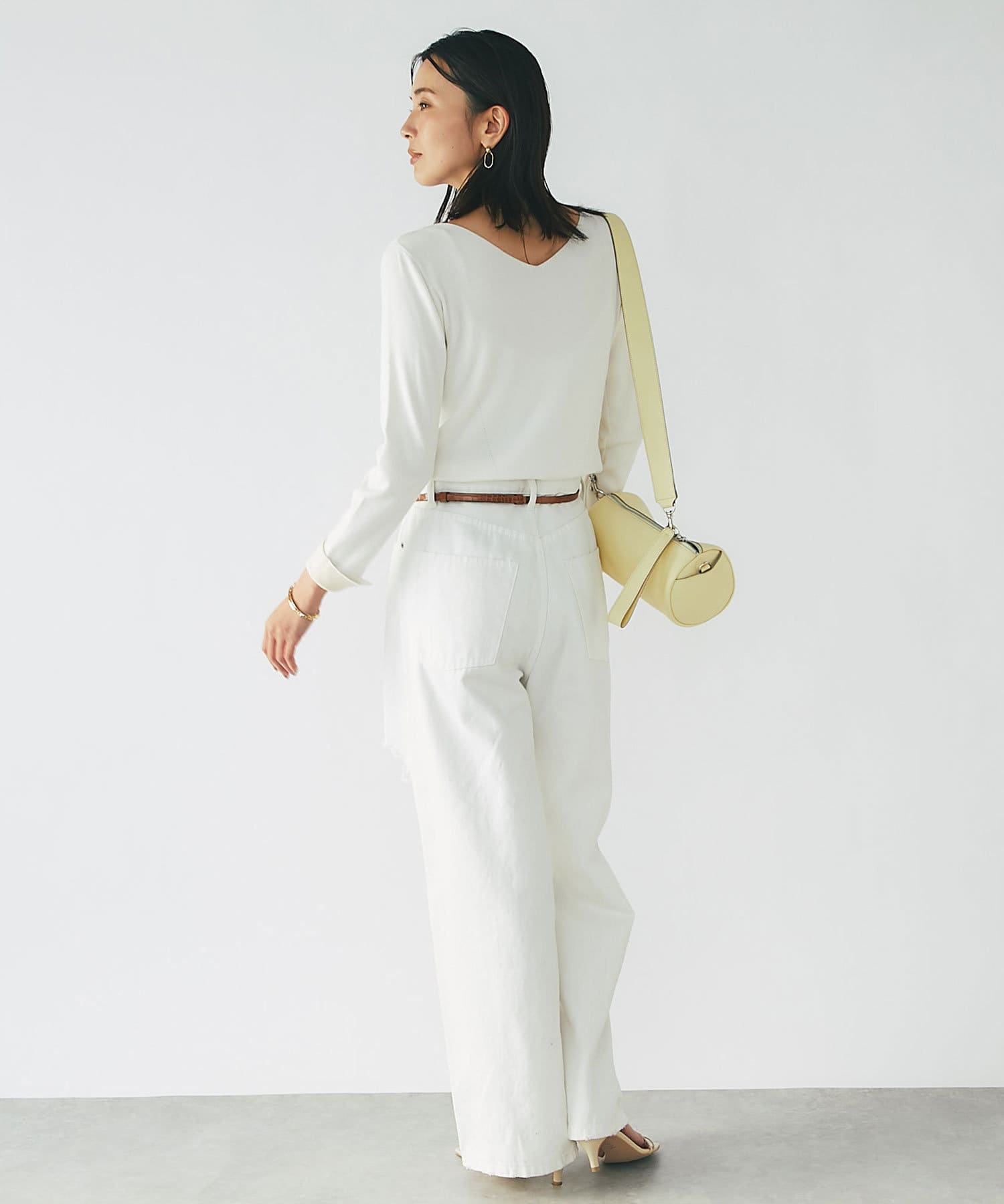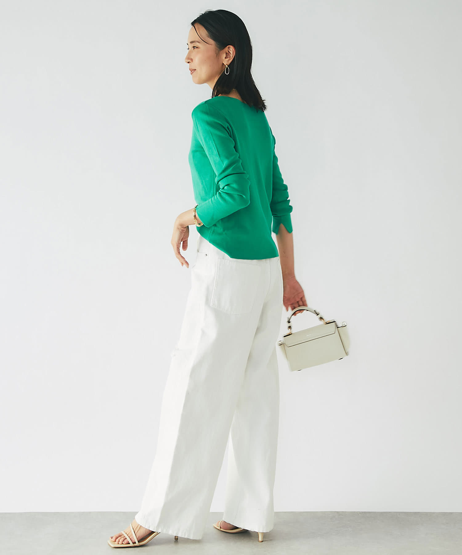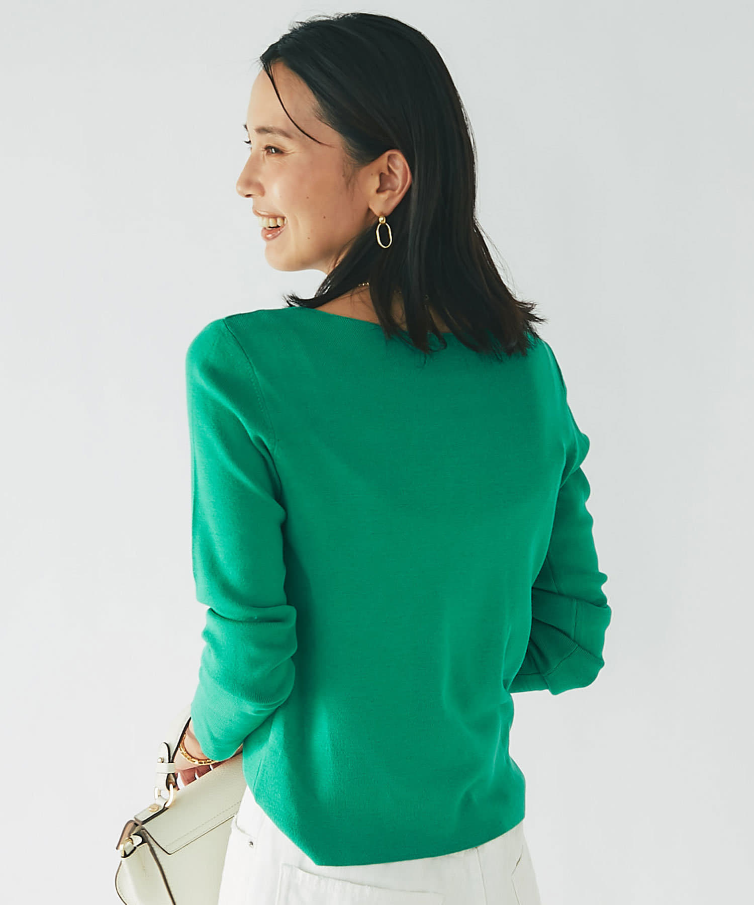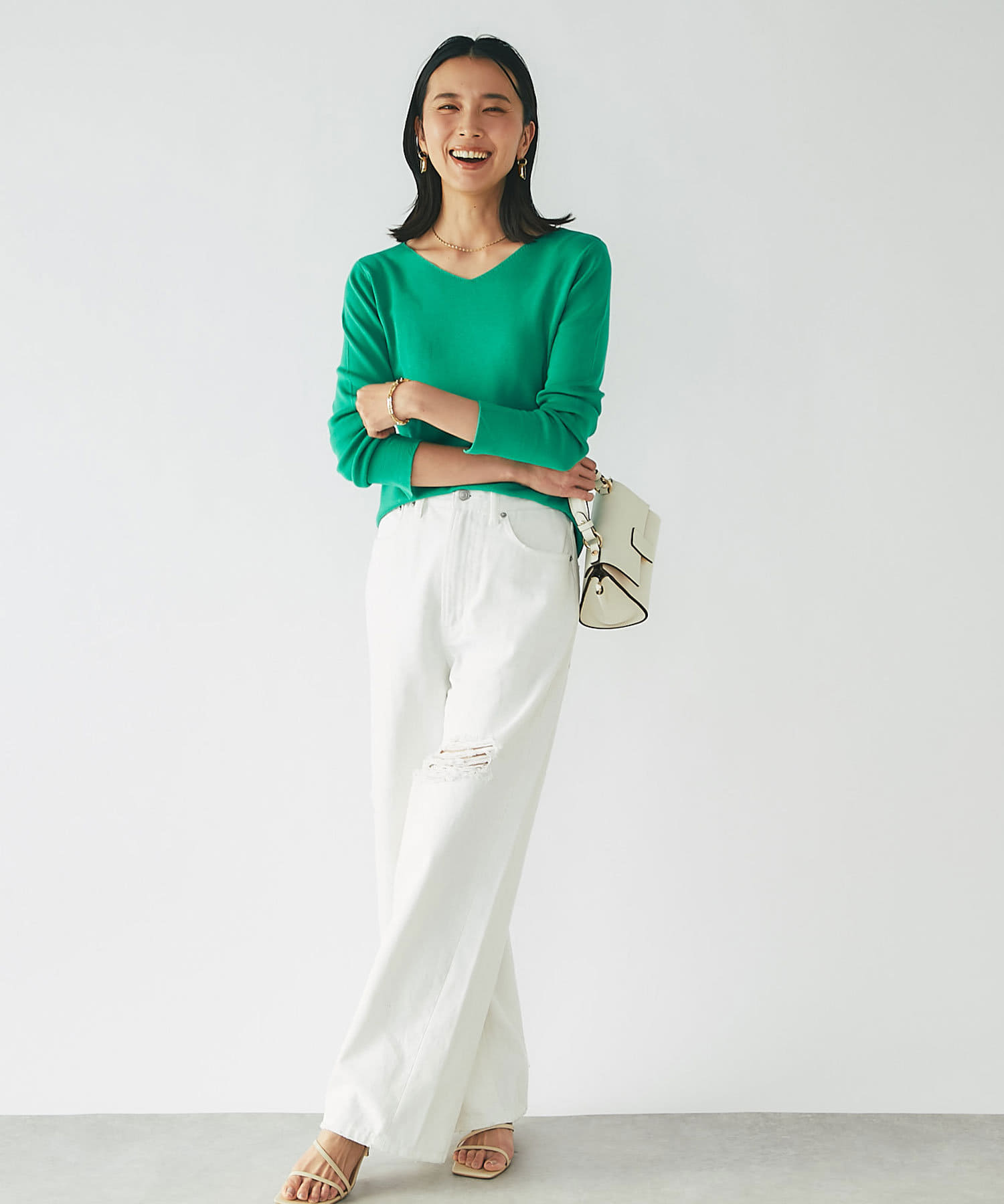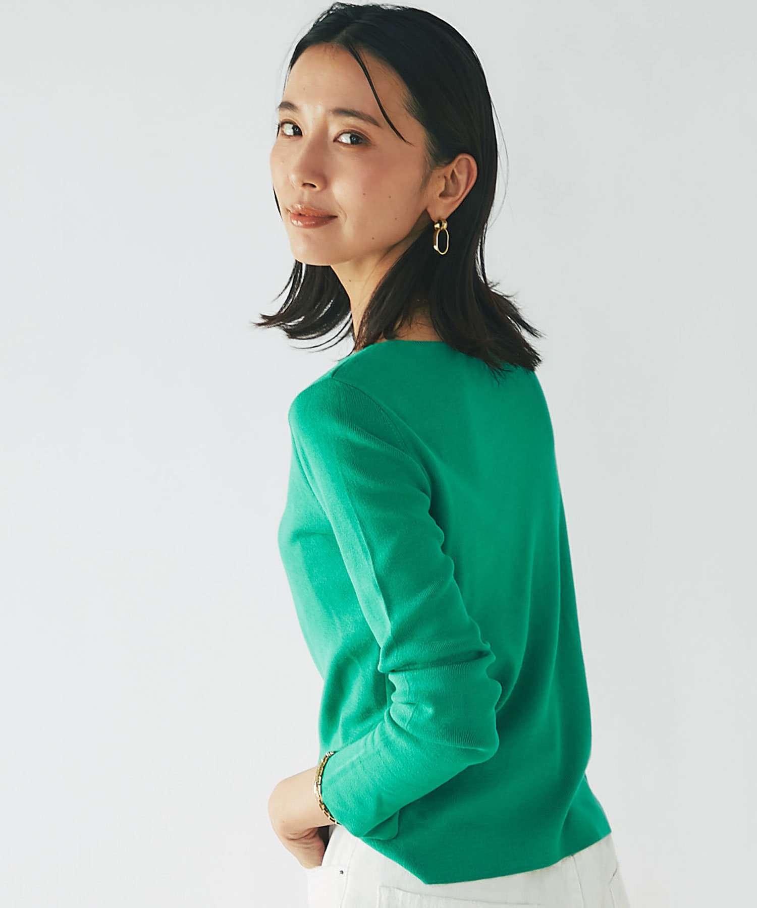 春に活躍するデニムと合わせても、重ための生地感に対し、Vネックのシルエットが軽やかで程よい抜け感をだしてくれます。