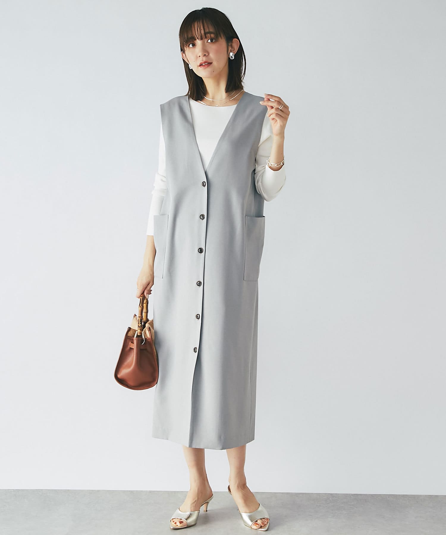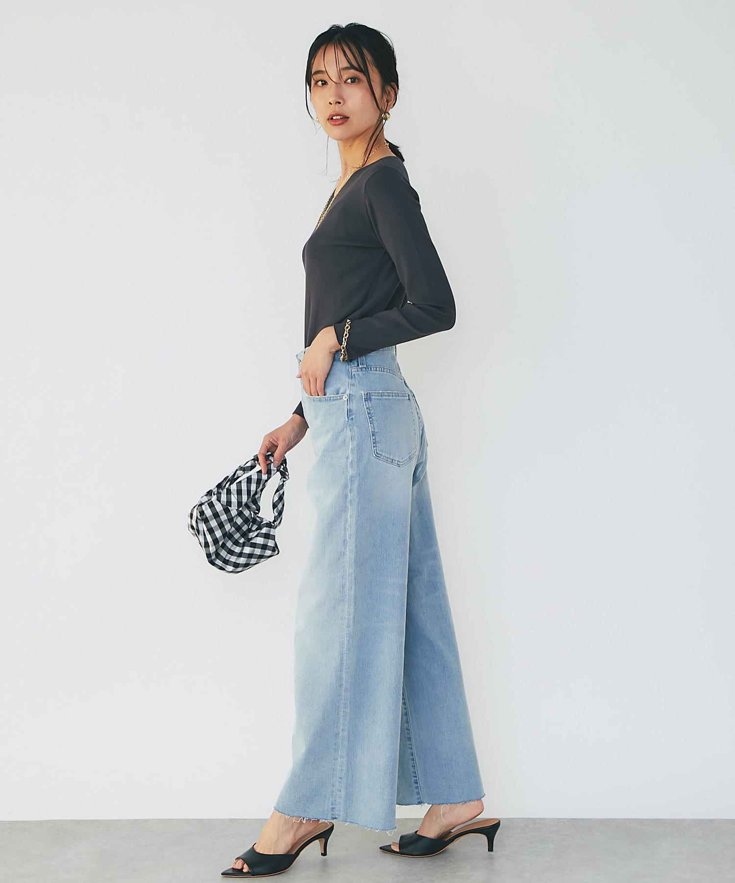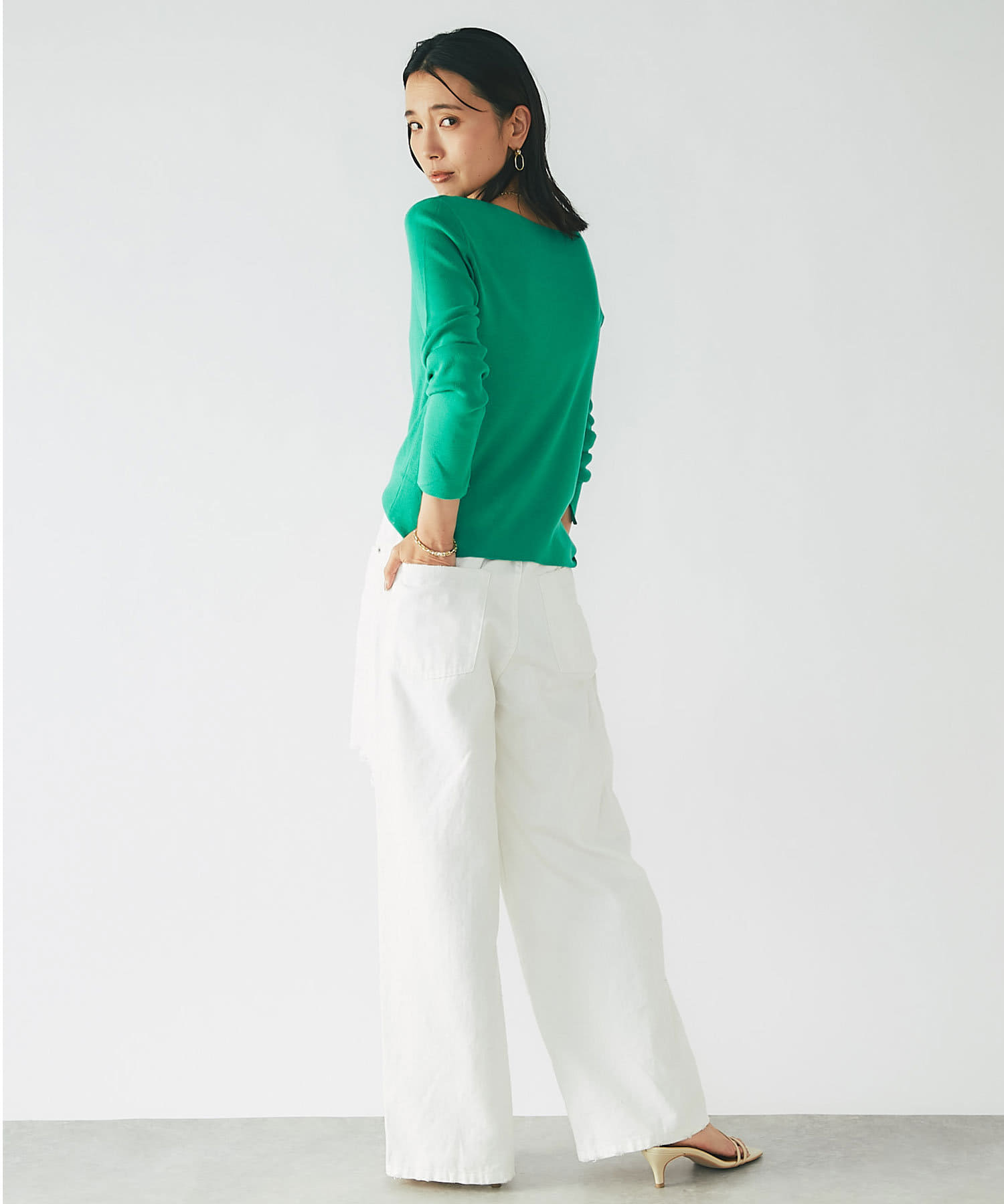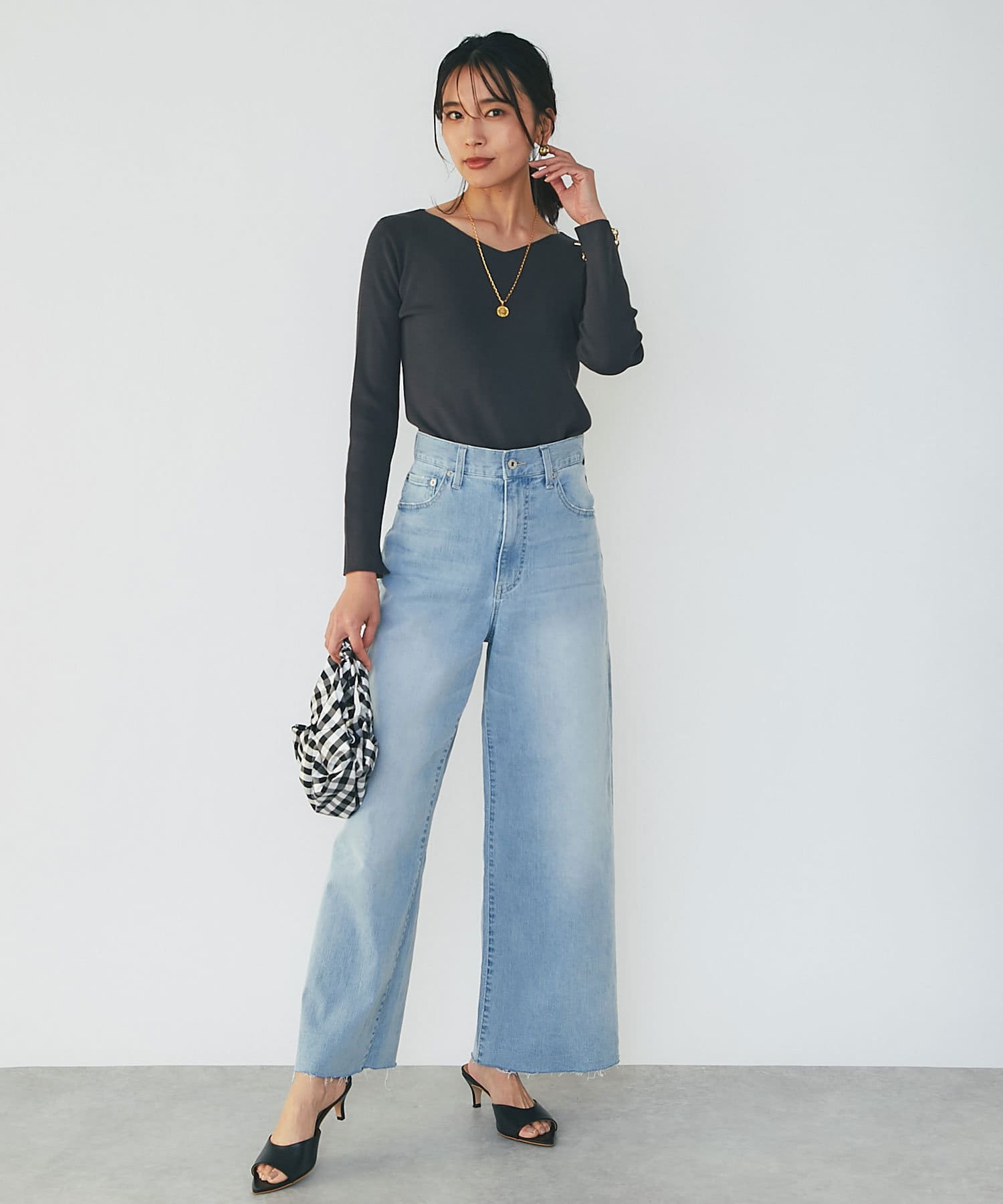 春に活躍するデニムと合わせても、重ための生地感に対し、Vネックのシルエットが軽やかで程よい抜け感をだしてくれます。