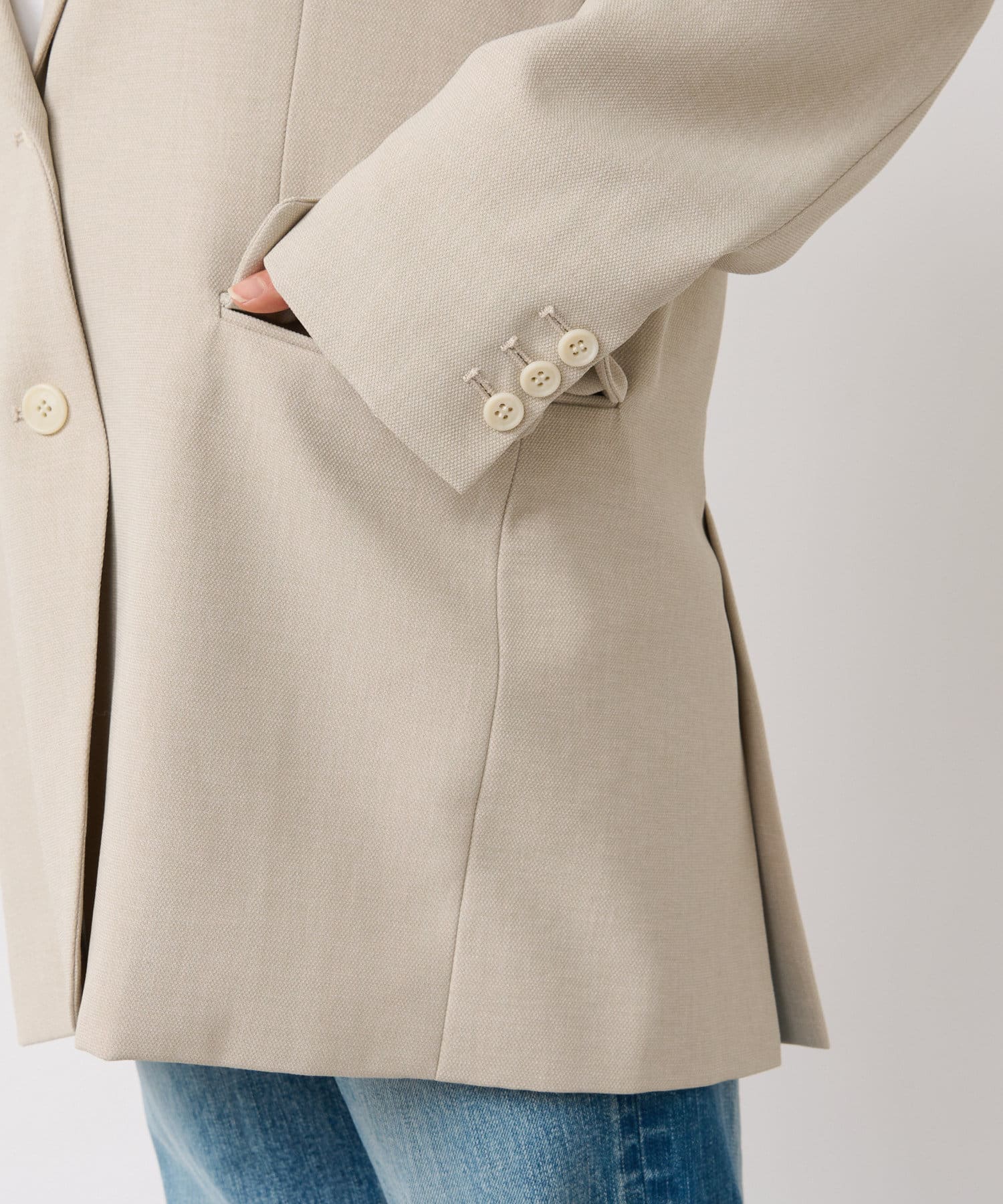 麻ライクなドビー織のざっくりとした表情もマスキュリンでこなれたなムードを演出。