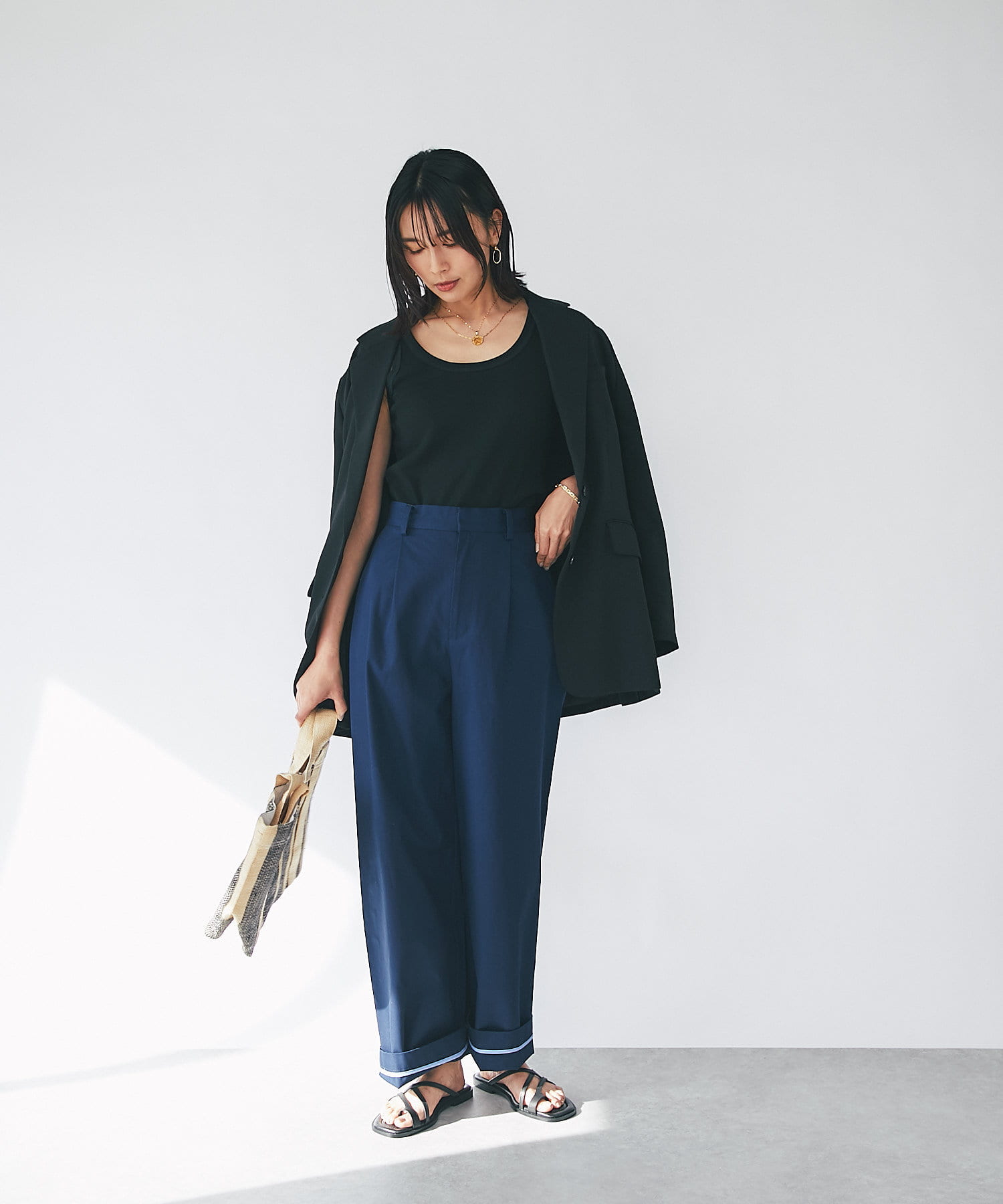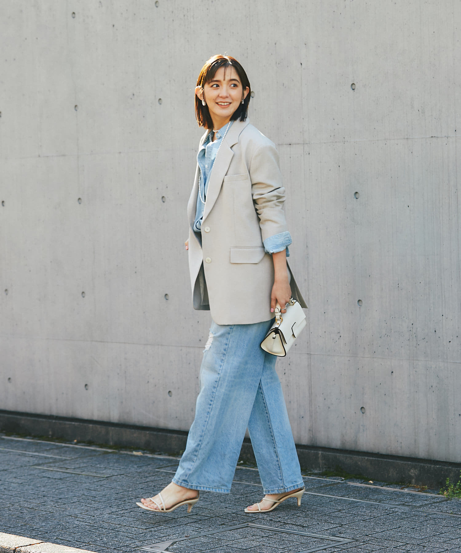 カジュアルなスタイルもジャケットを合わせることでこなれた印象になります。
