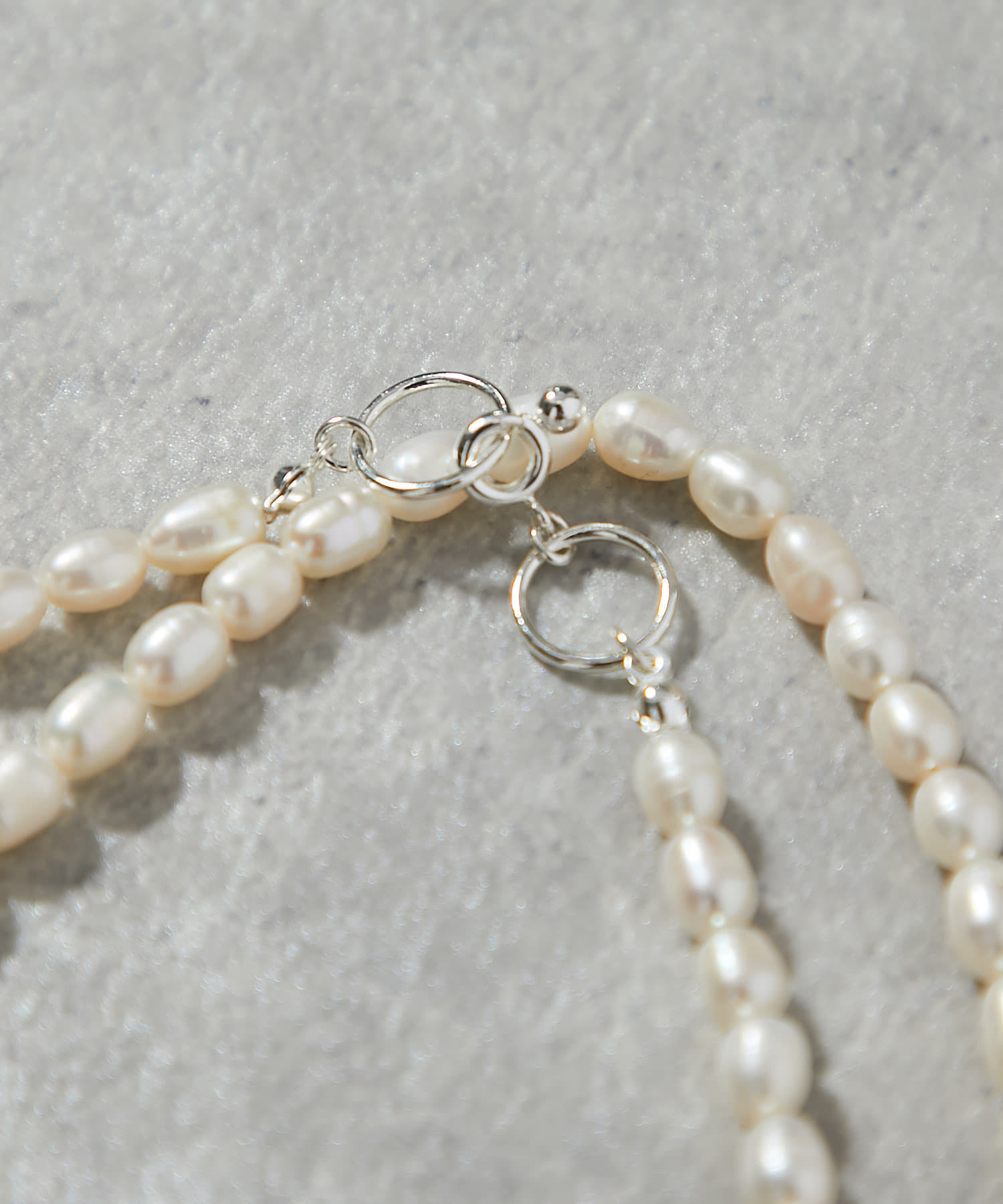 パールが華やかな分、留め具をシルバーにすることでカジュアルなアイテムにも合わせていただきやすいよう工夫しました。